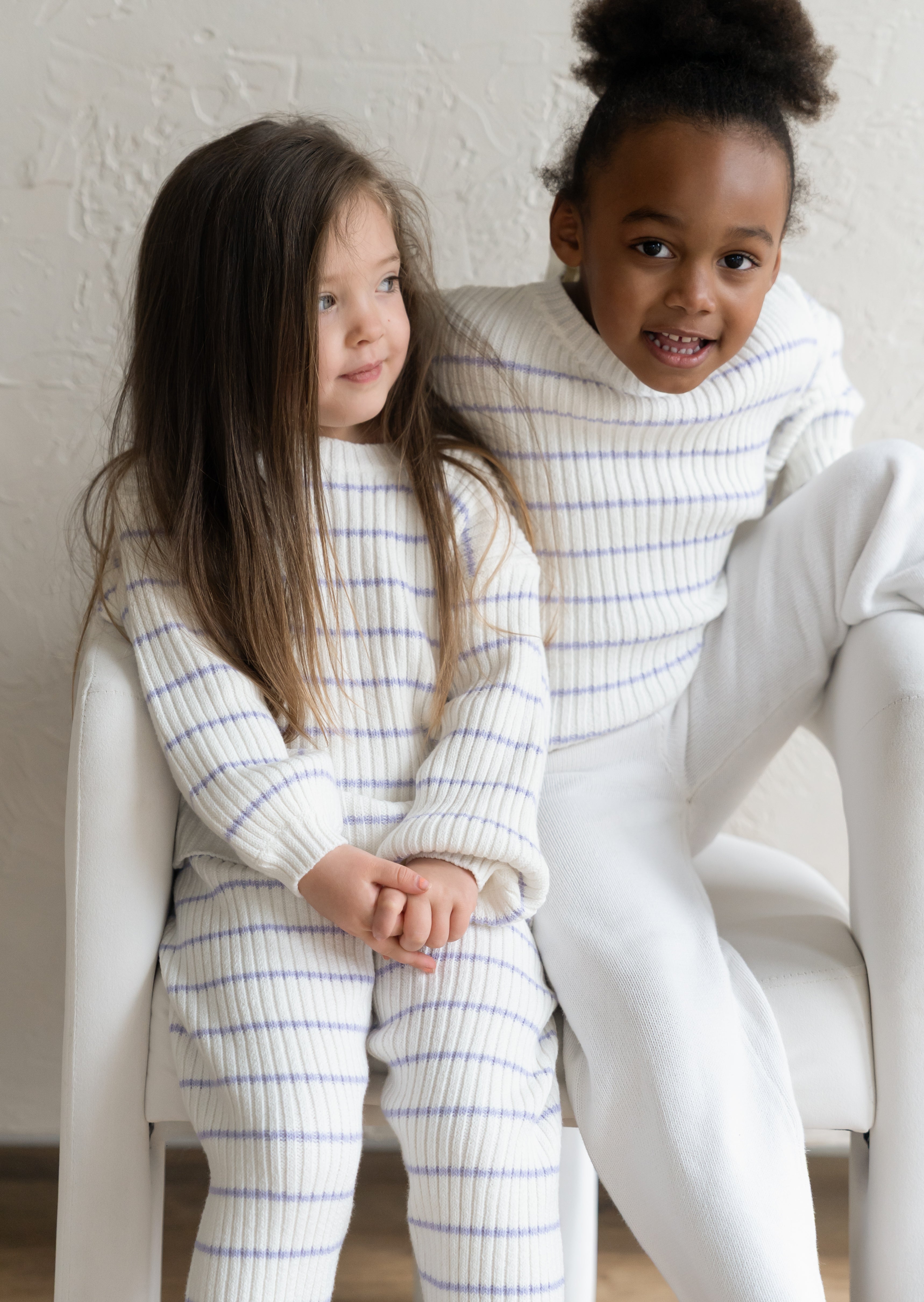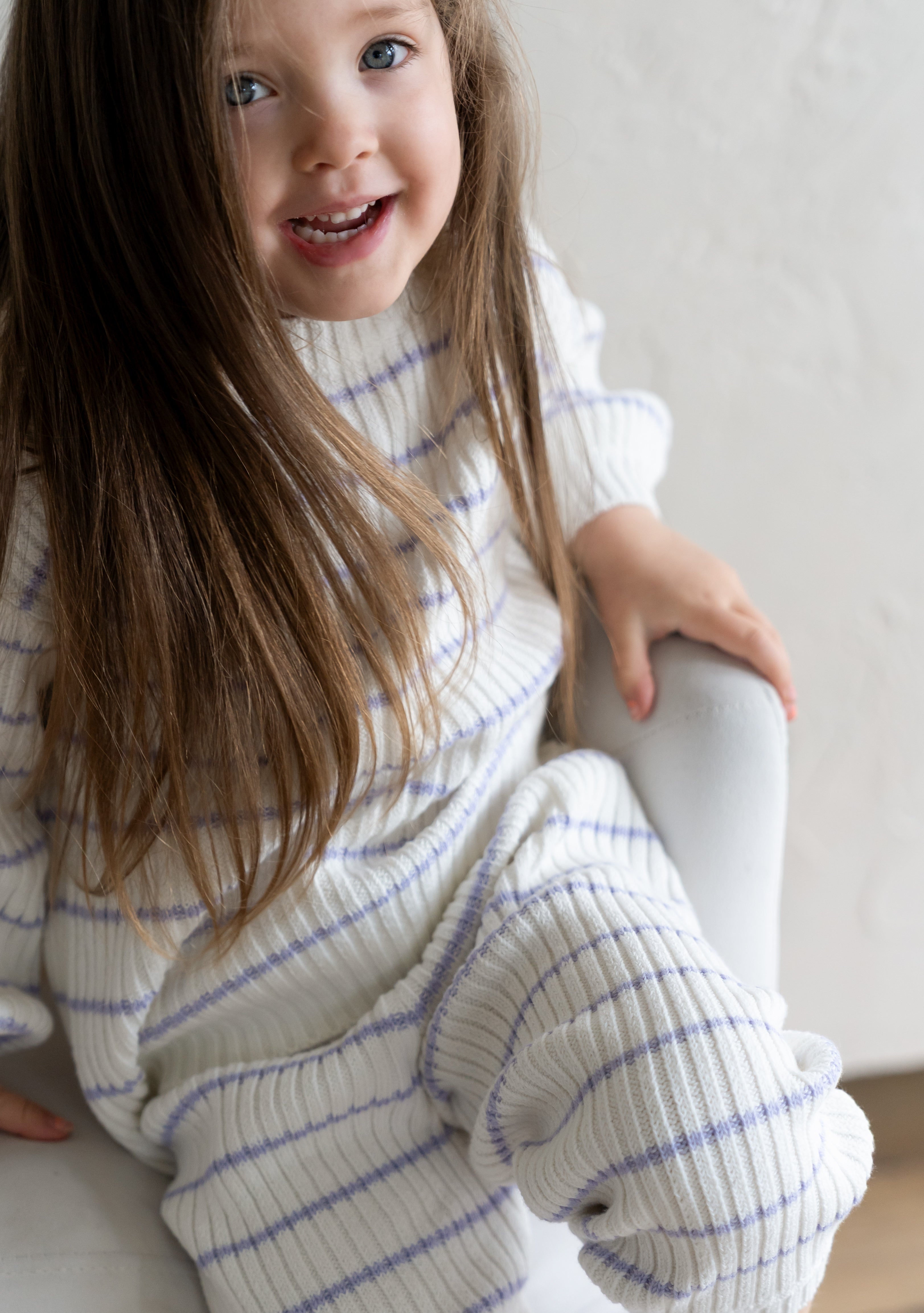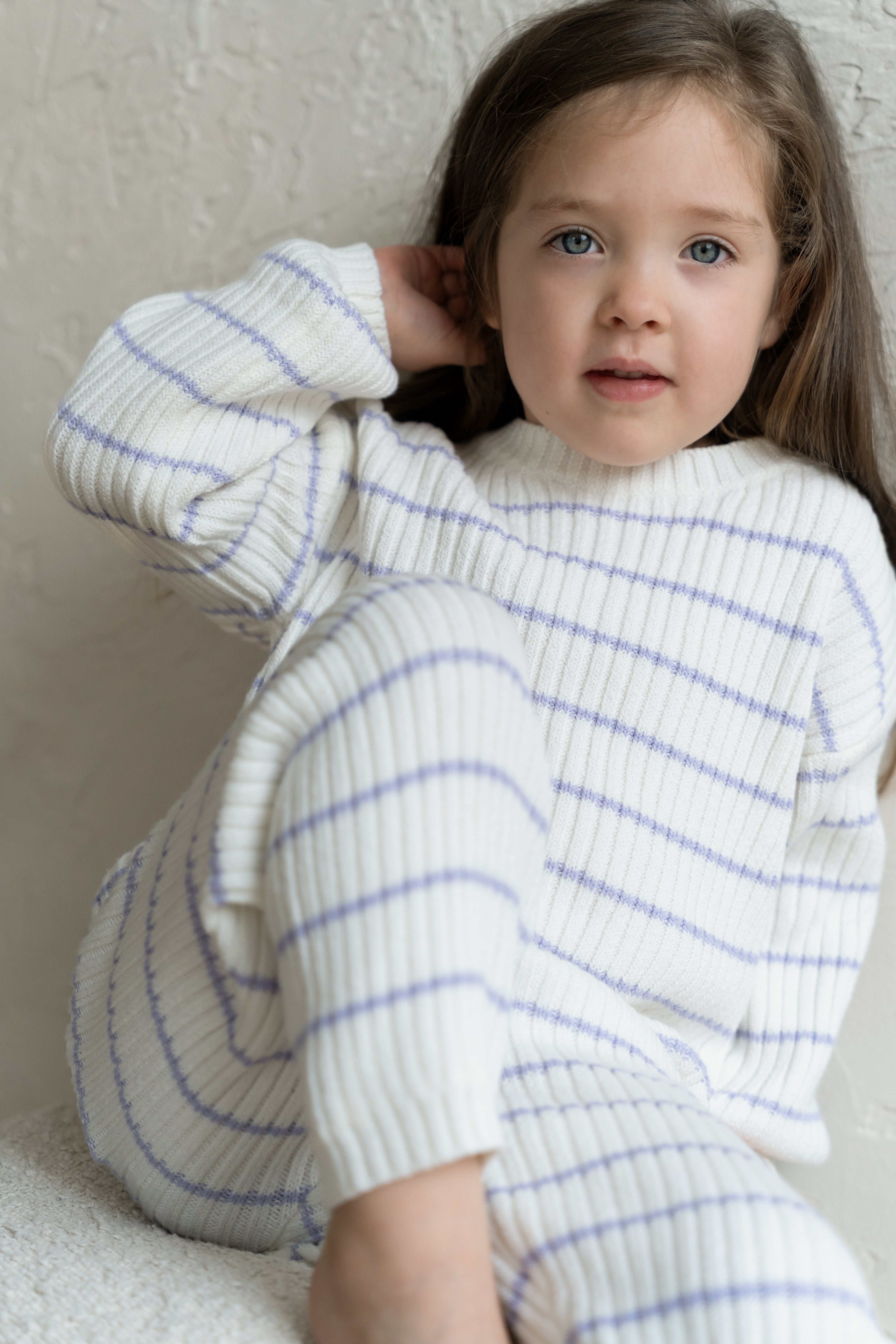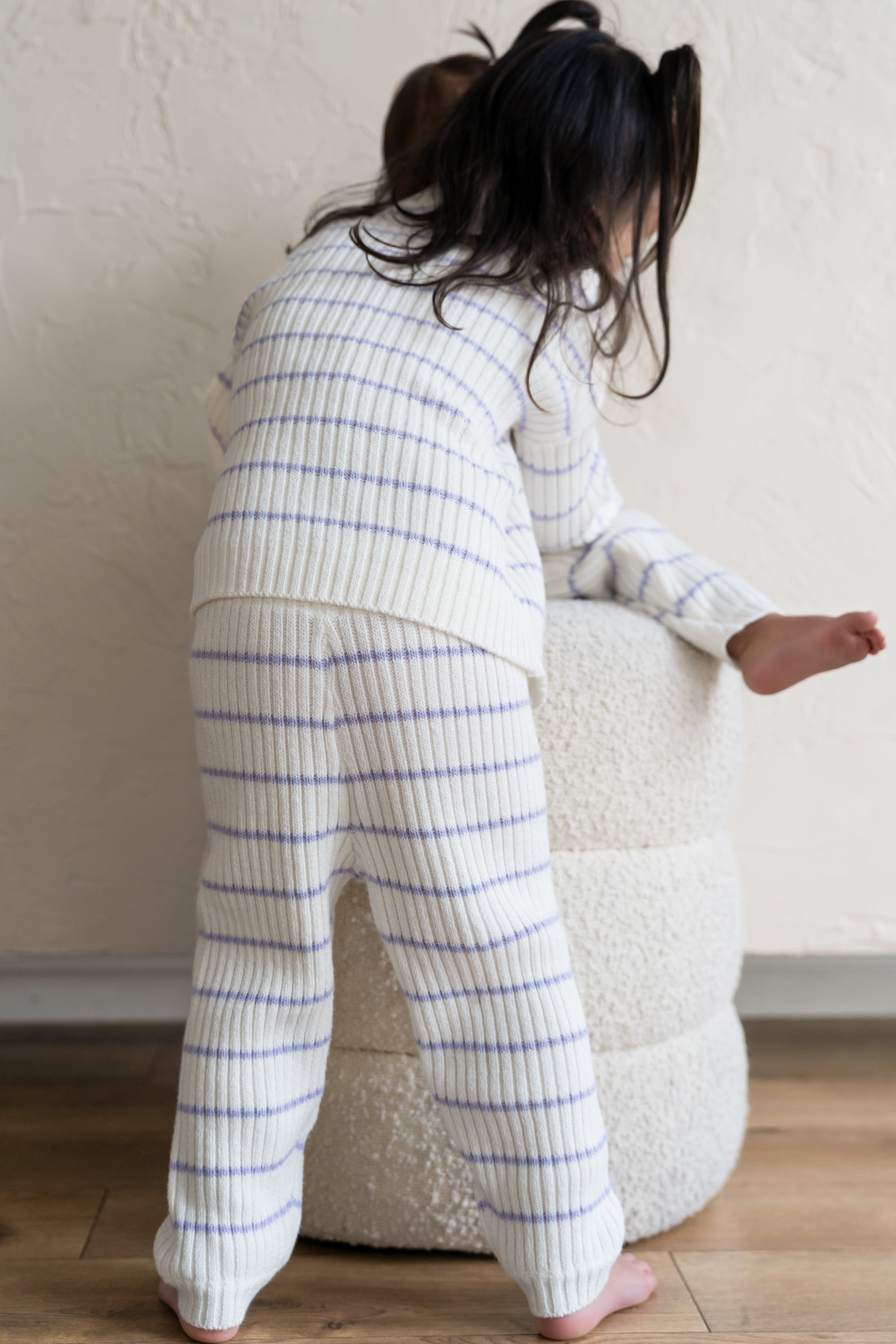 This Light Purple and Off White striped ribbed pant was made with a timeless look and a luxury fit. With a wide elastic waistband and fitted leg cuffs, these pants were made with your child’s comfort in mind. Pair with their favorite sweater or the matching striped ribbed sweater for the complete knit set. Style meets durability with these minimalistic ribbed pants.