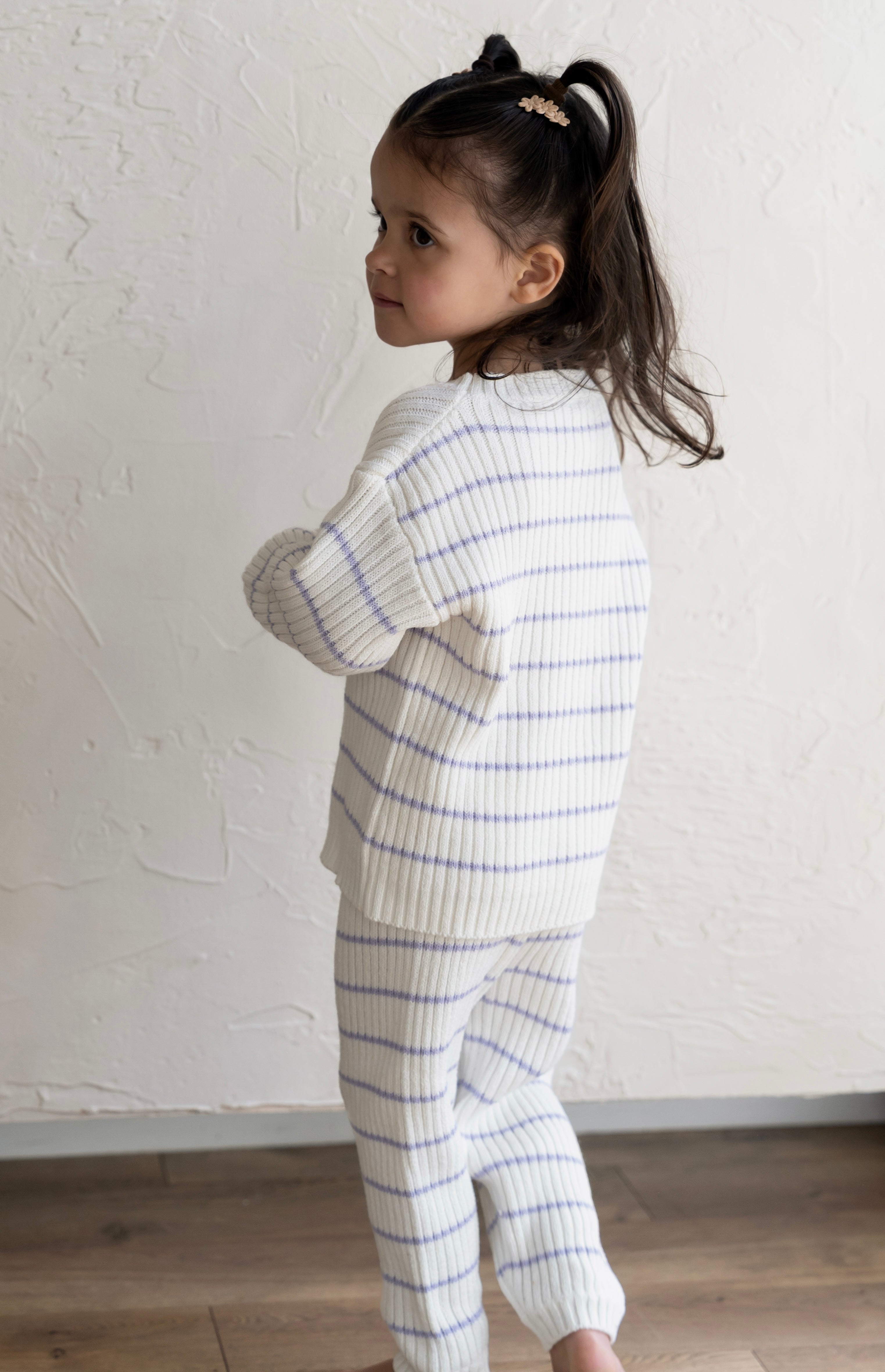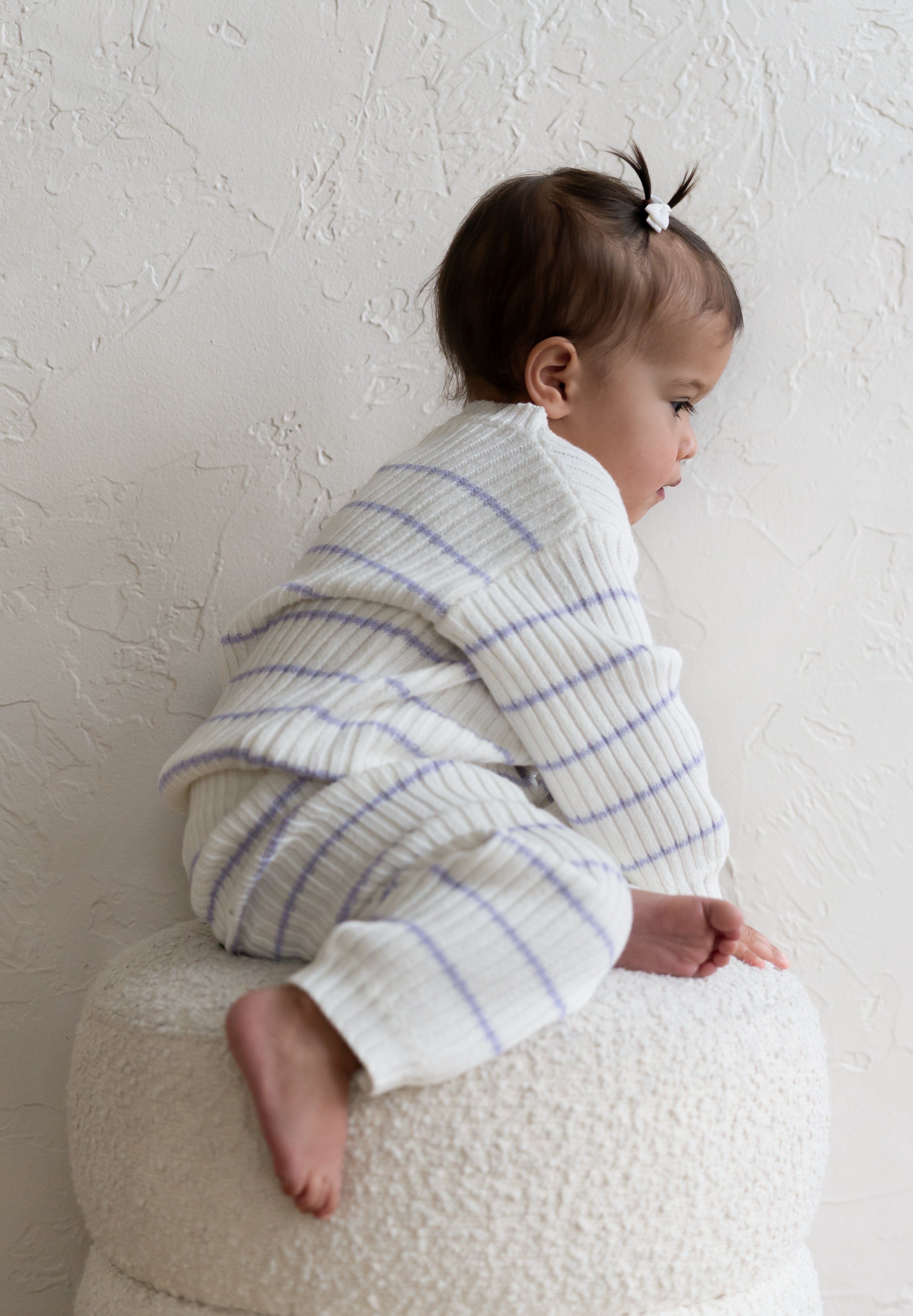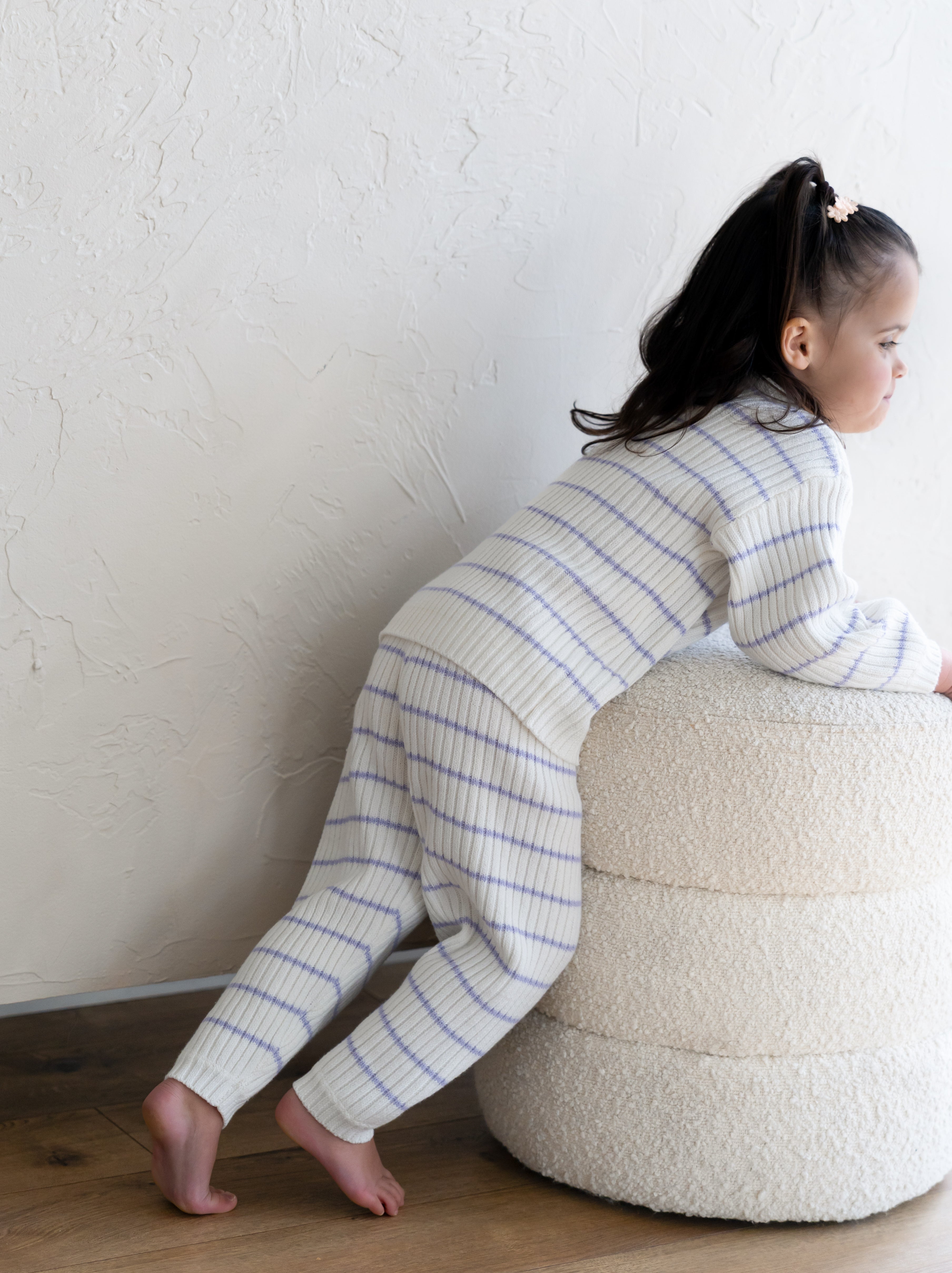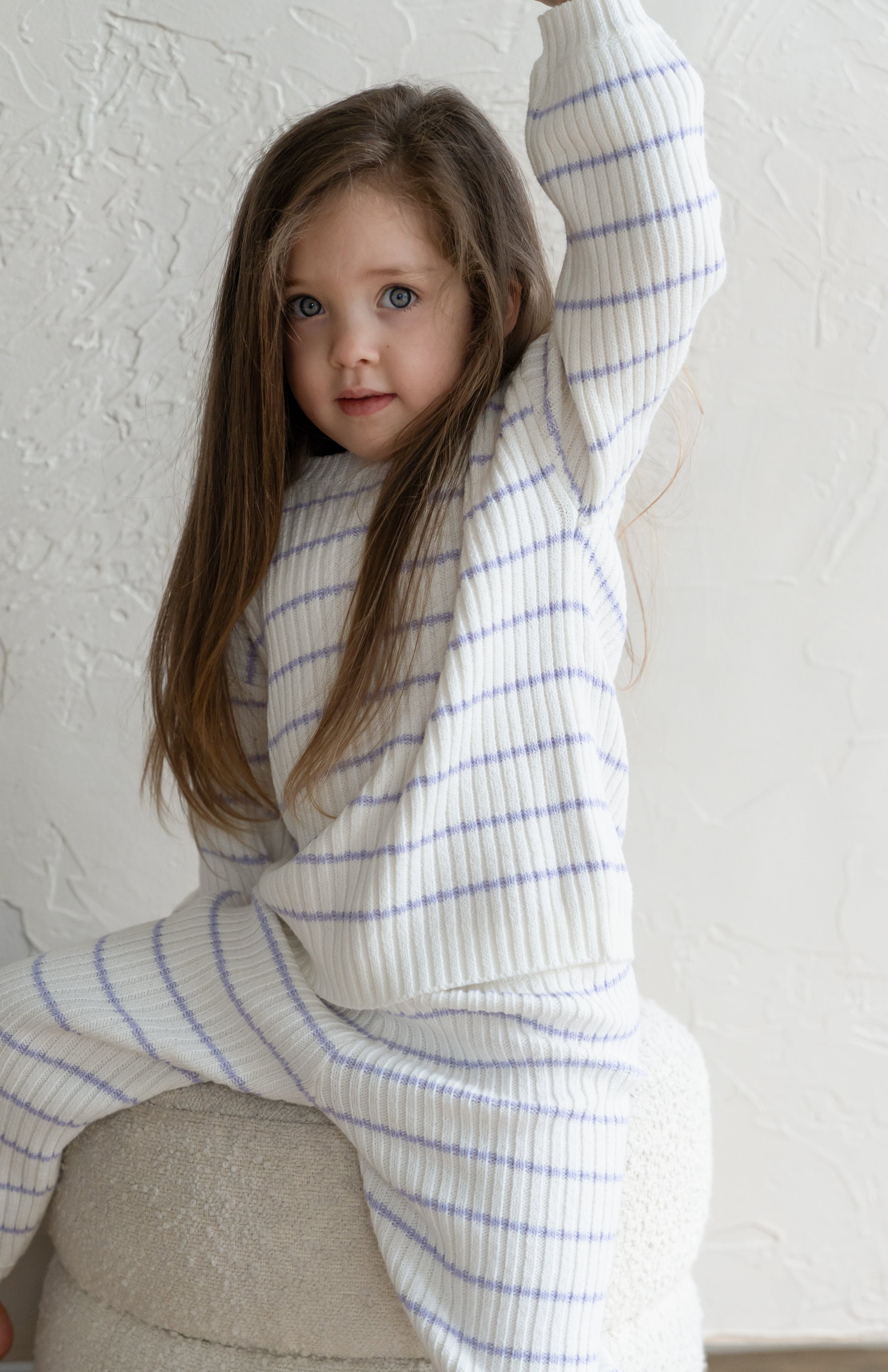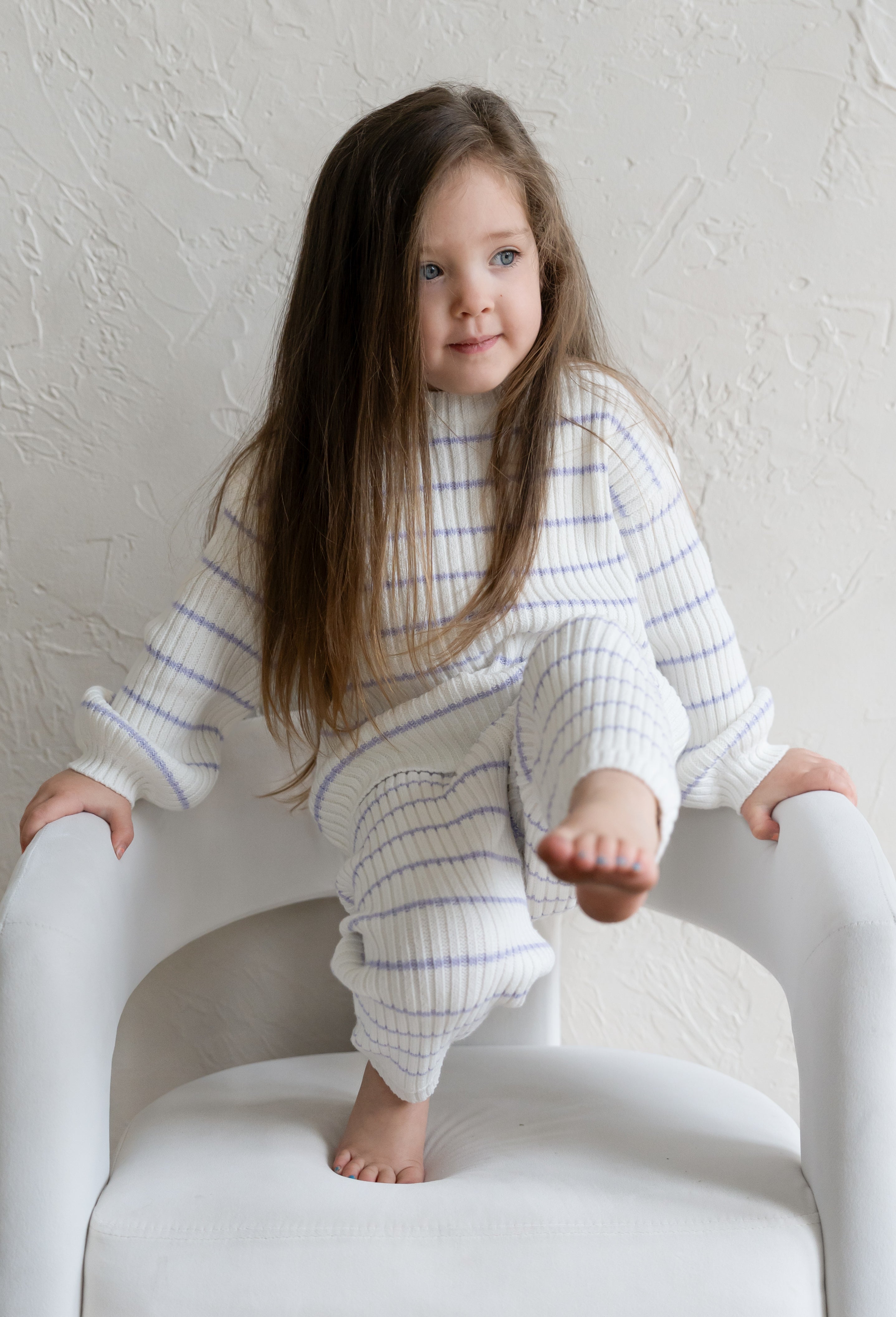 This Light Purple and Off White striped ribbed pant was made with a timeless look and a luxury fit. With a wide elastic waistband and fitted leg cuffs, these pants were made with your child’s comfort in mind. Pair with their favorite sweater or the matching striped ribbed sweater for the complete knit set. Style meets durability with these minimalistic ribbed pants.