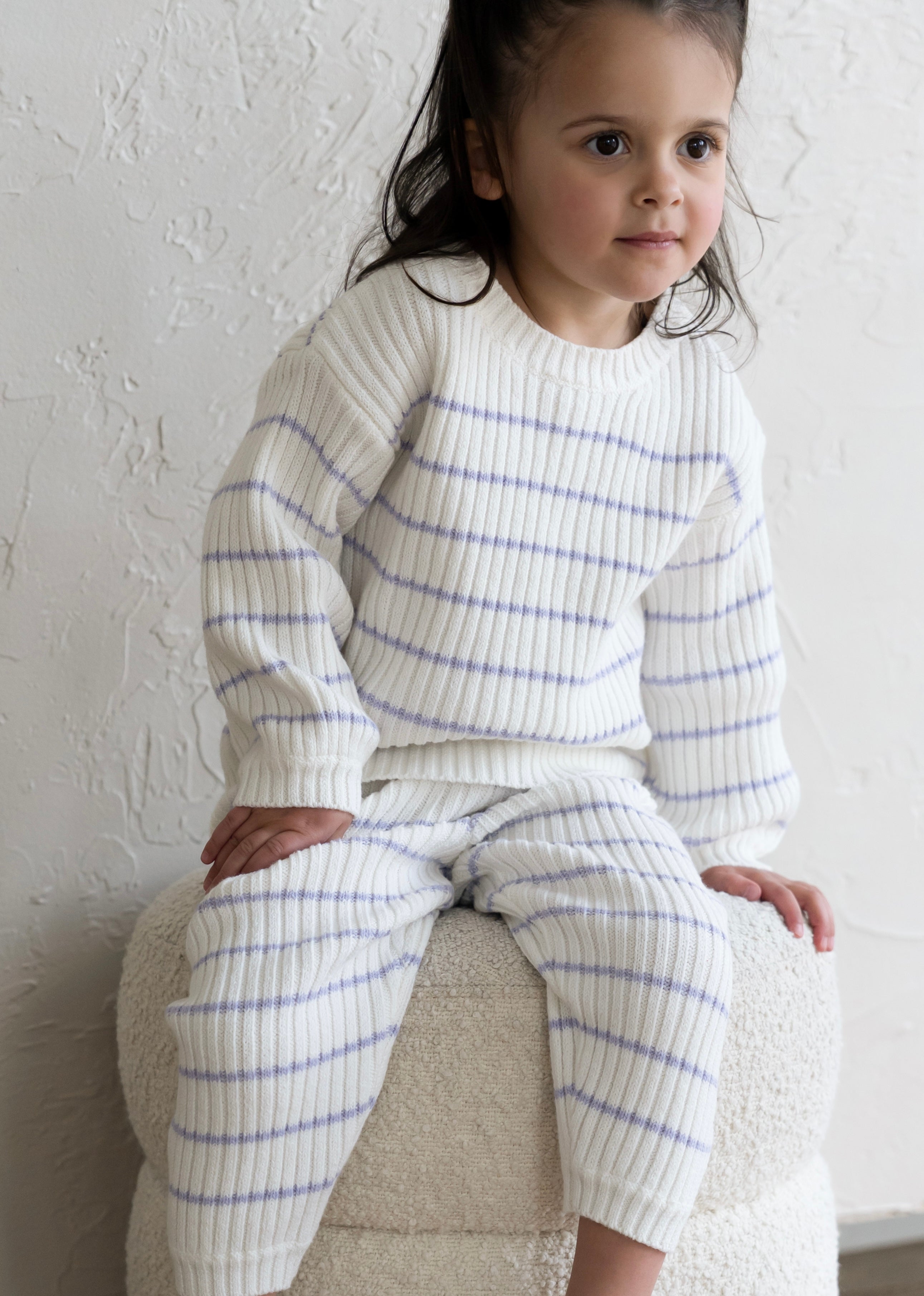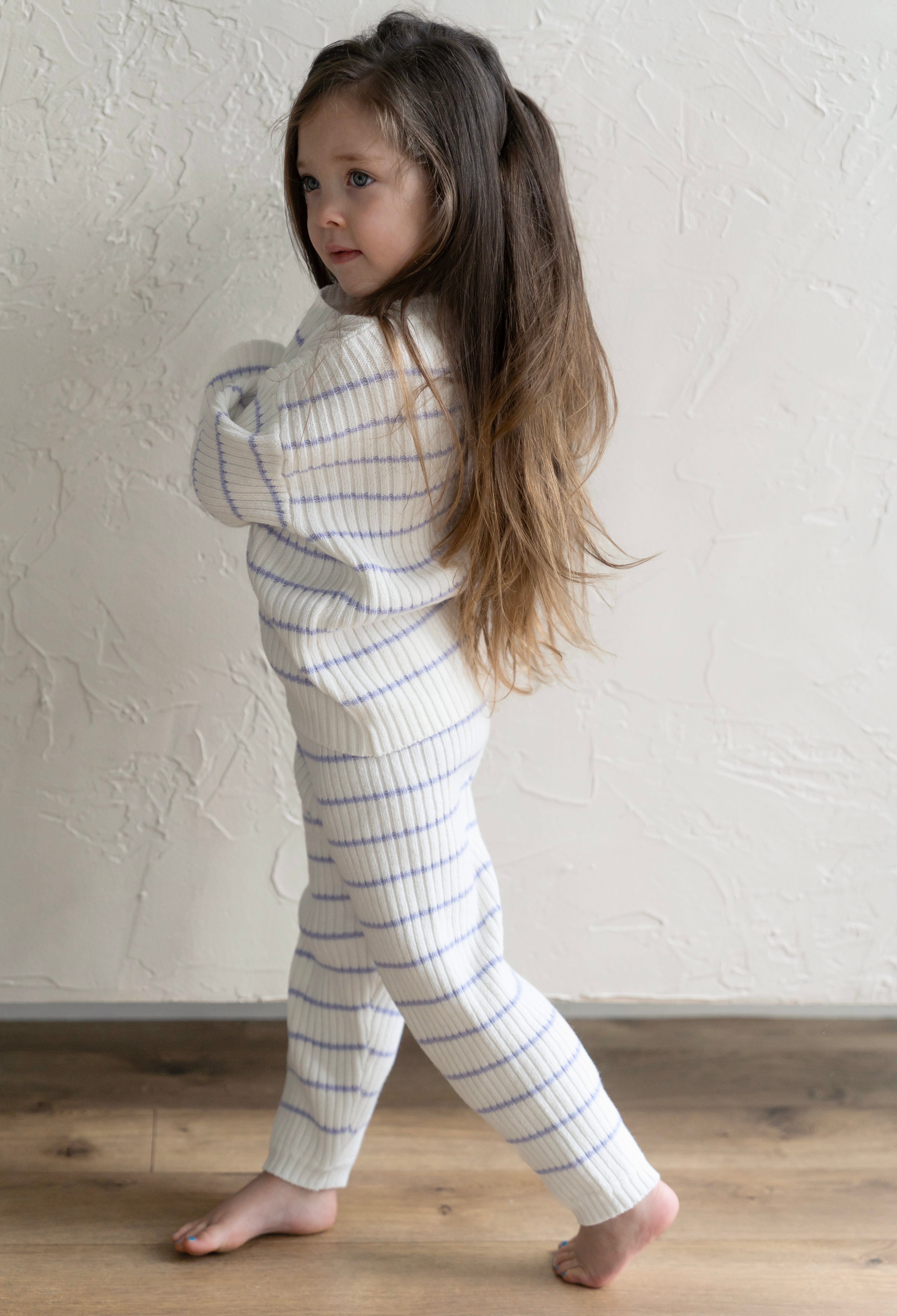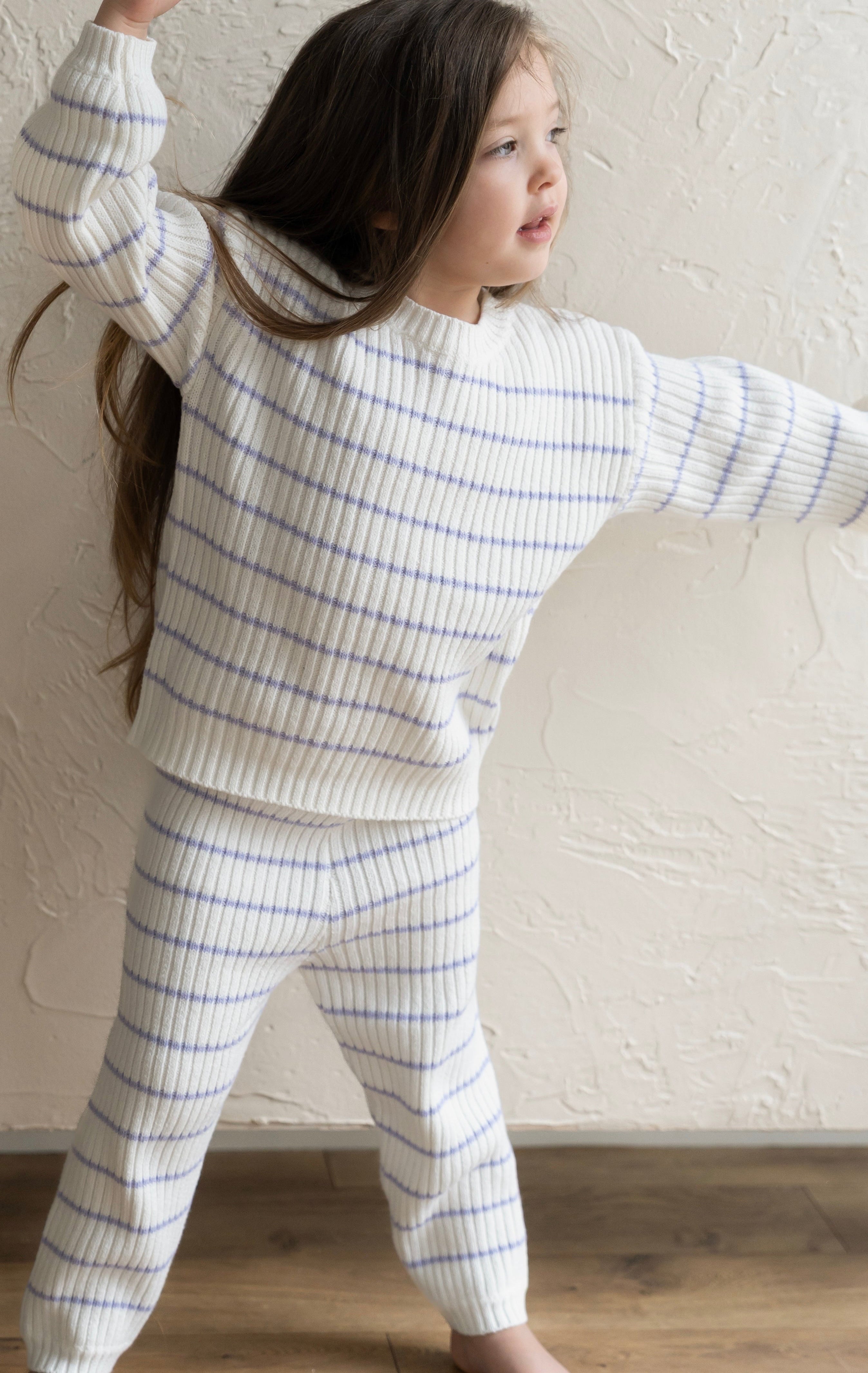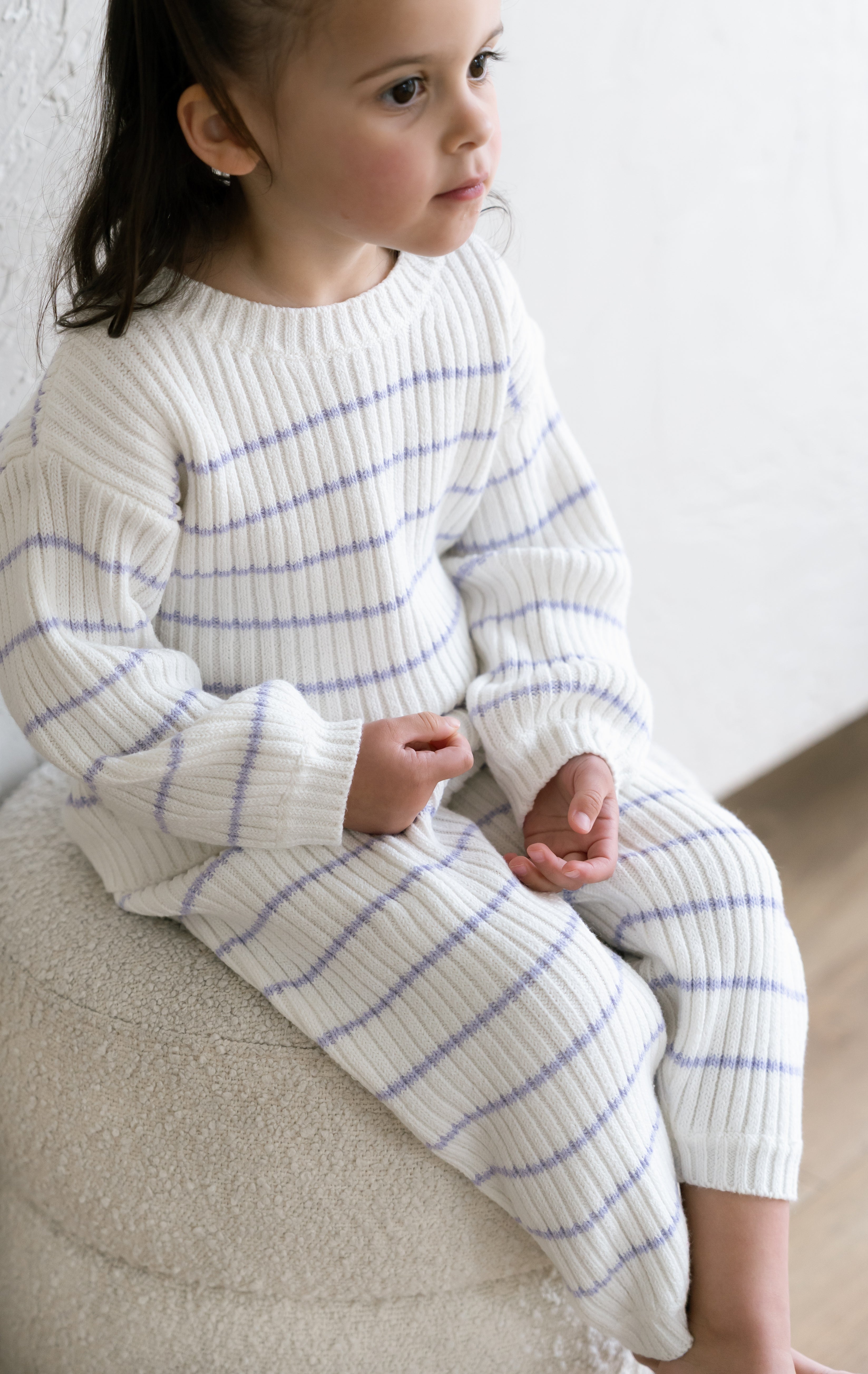 This Light Purple and Off White striped ribbed pant was made with a timeless look and a luxury fit. With a wide elastic waistband and fitted leg cuffs, these pants were made with your child’s comfort in mind. Pair with their favorite sweater or the matching striped ribbed sweater for the complete knit set. Style meets durability with these minimalistic ribbed pants.