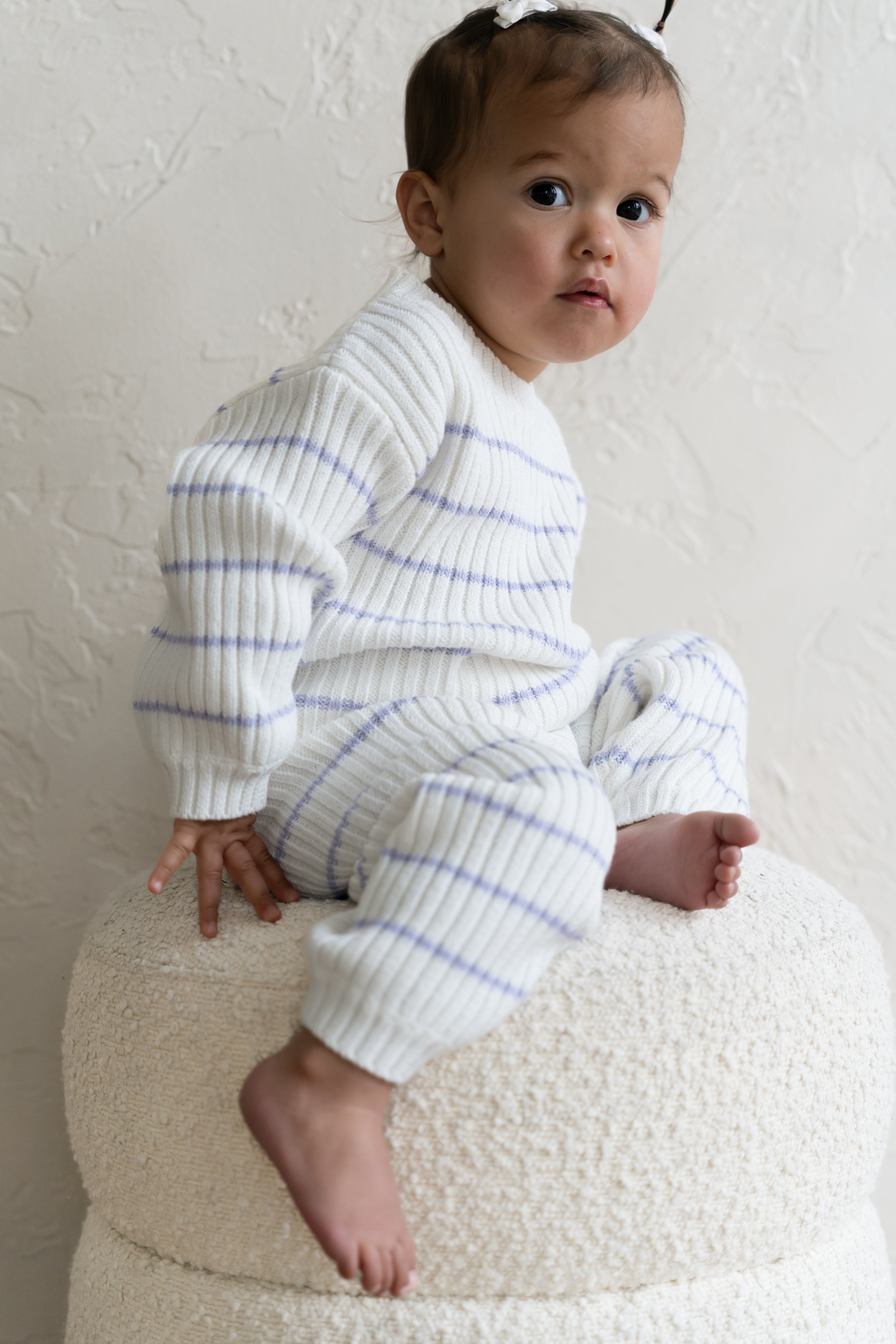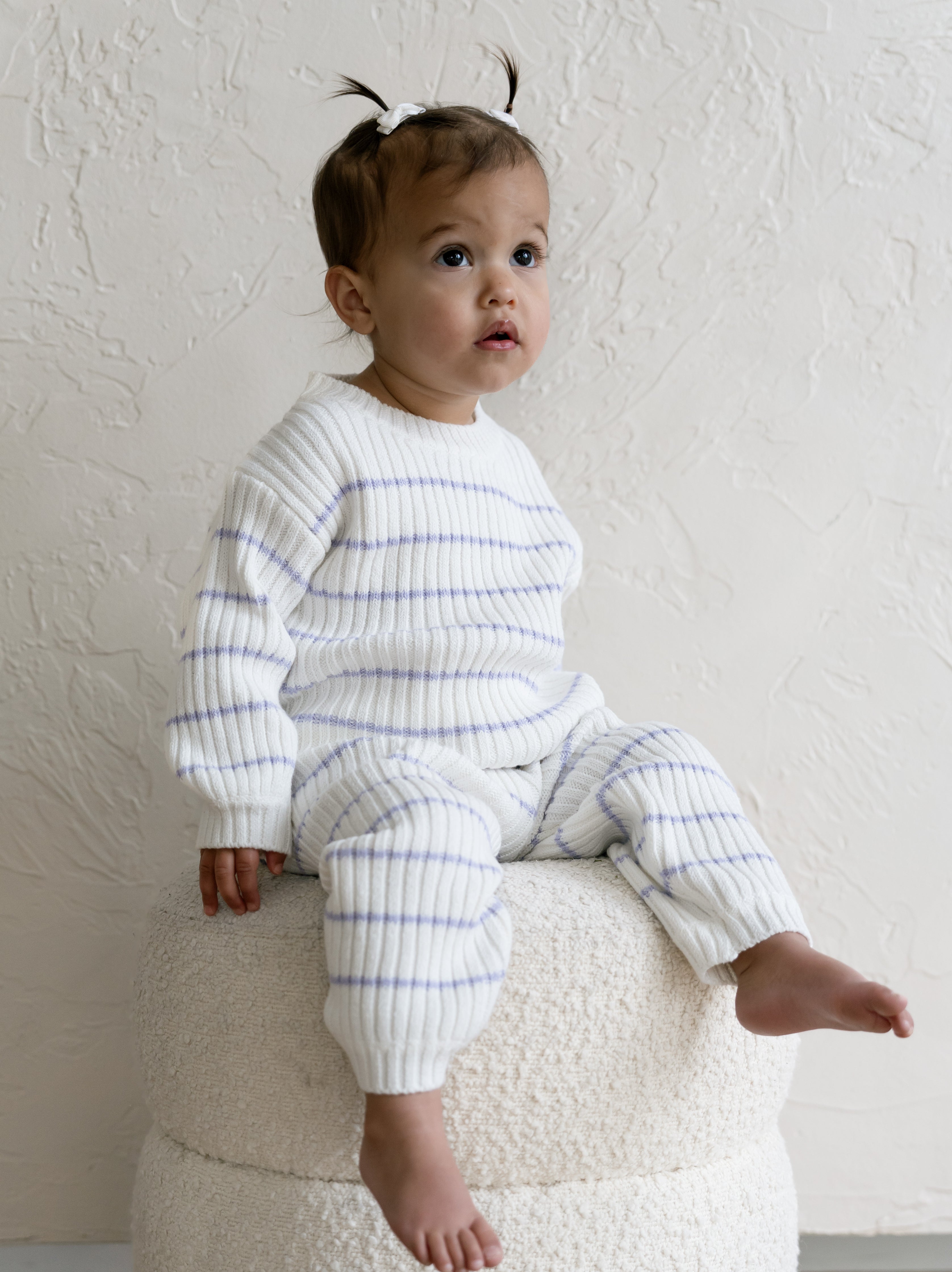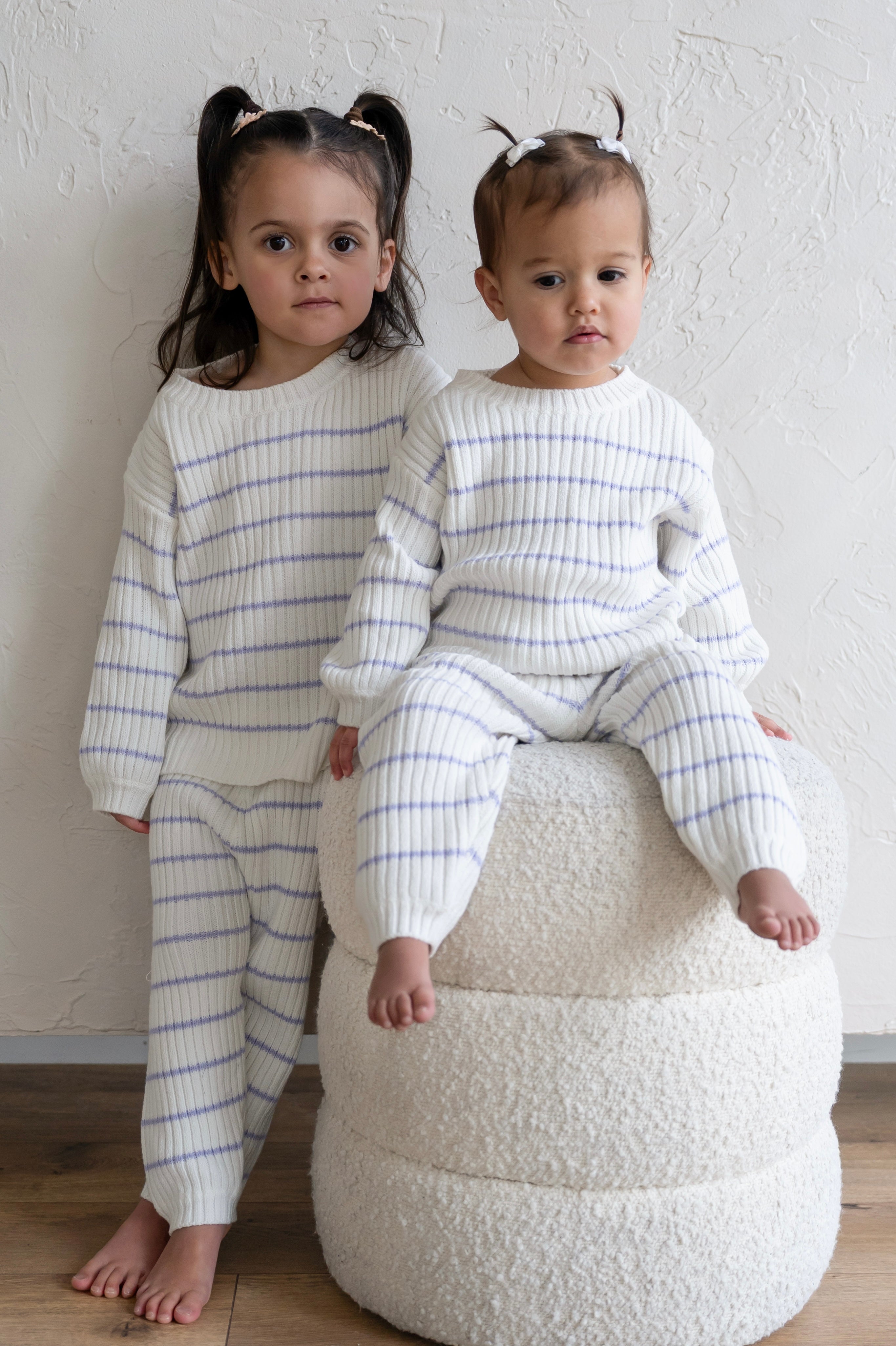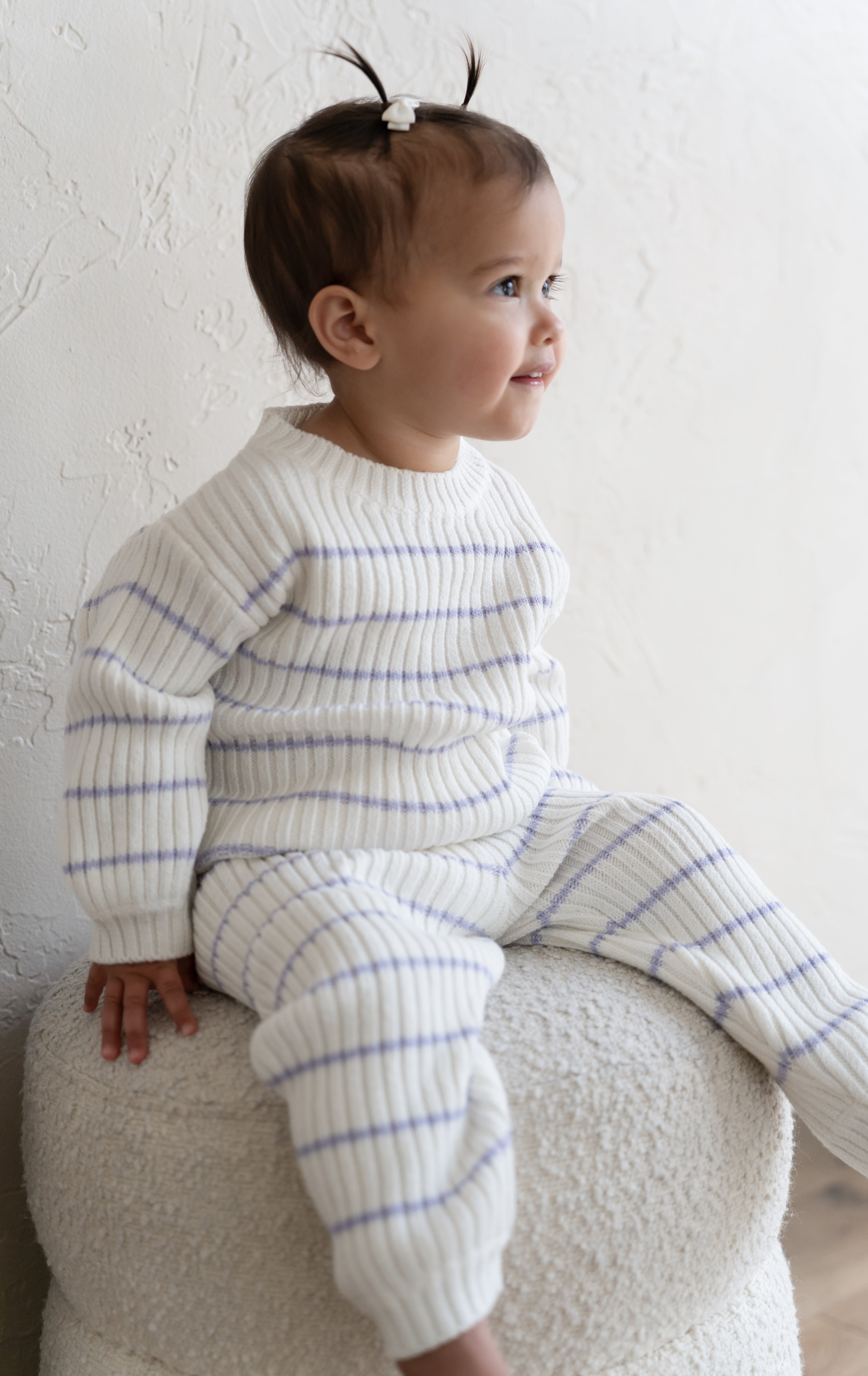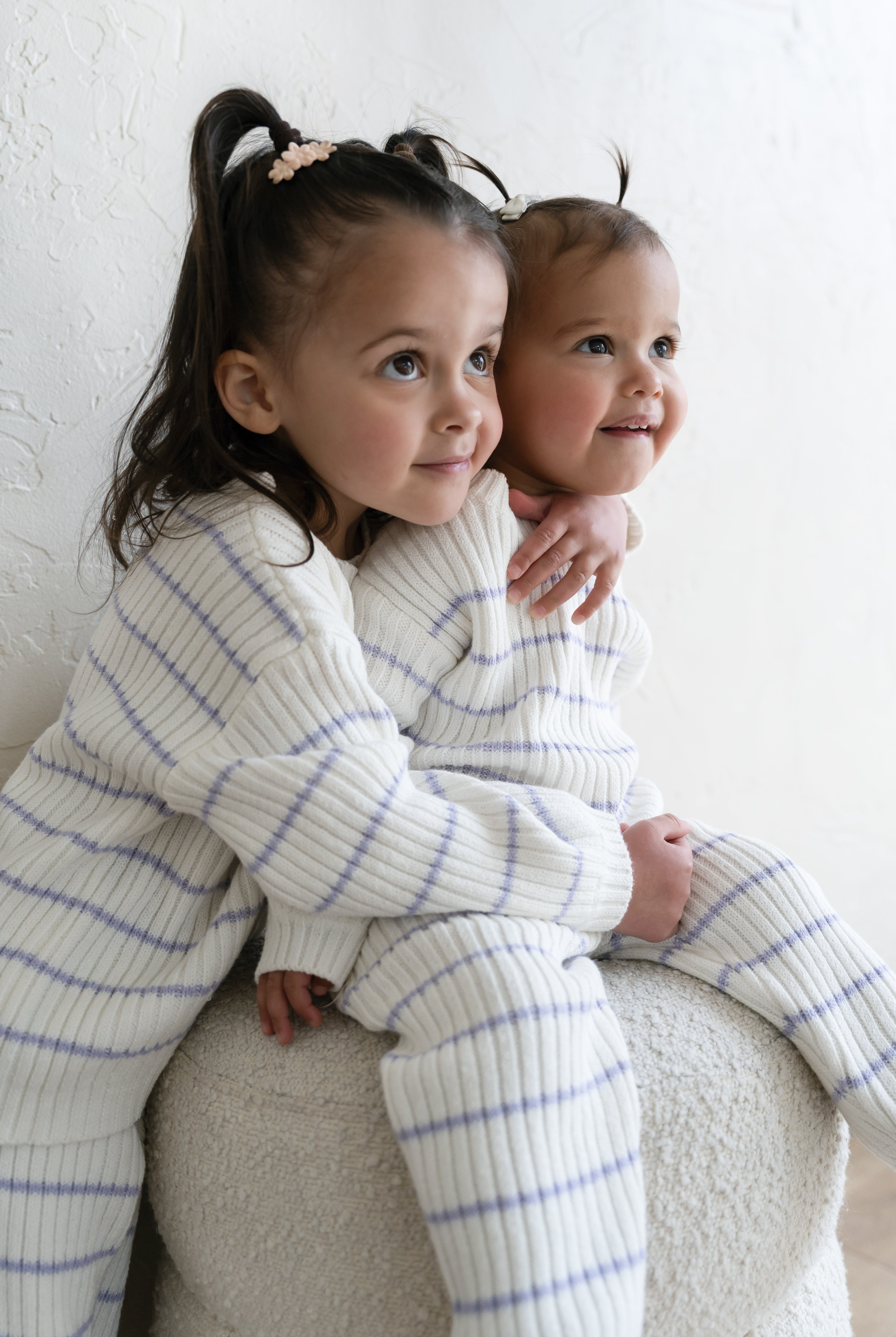 This Light Purple and Off White striped ribbed pant was made with a timeless look and a luxury fit. With a wide elastic waistband and fitted leg cuffs, these pants were made with your child’s comfort in mind. Pair with their favorite sweater or the matching striped ribbed sweater for the complete knit set. Style meets durability with these minimalistic ribbed pants.