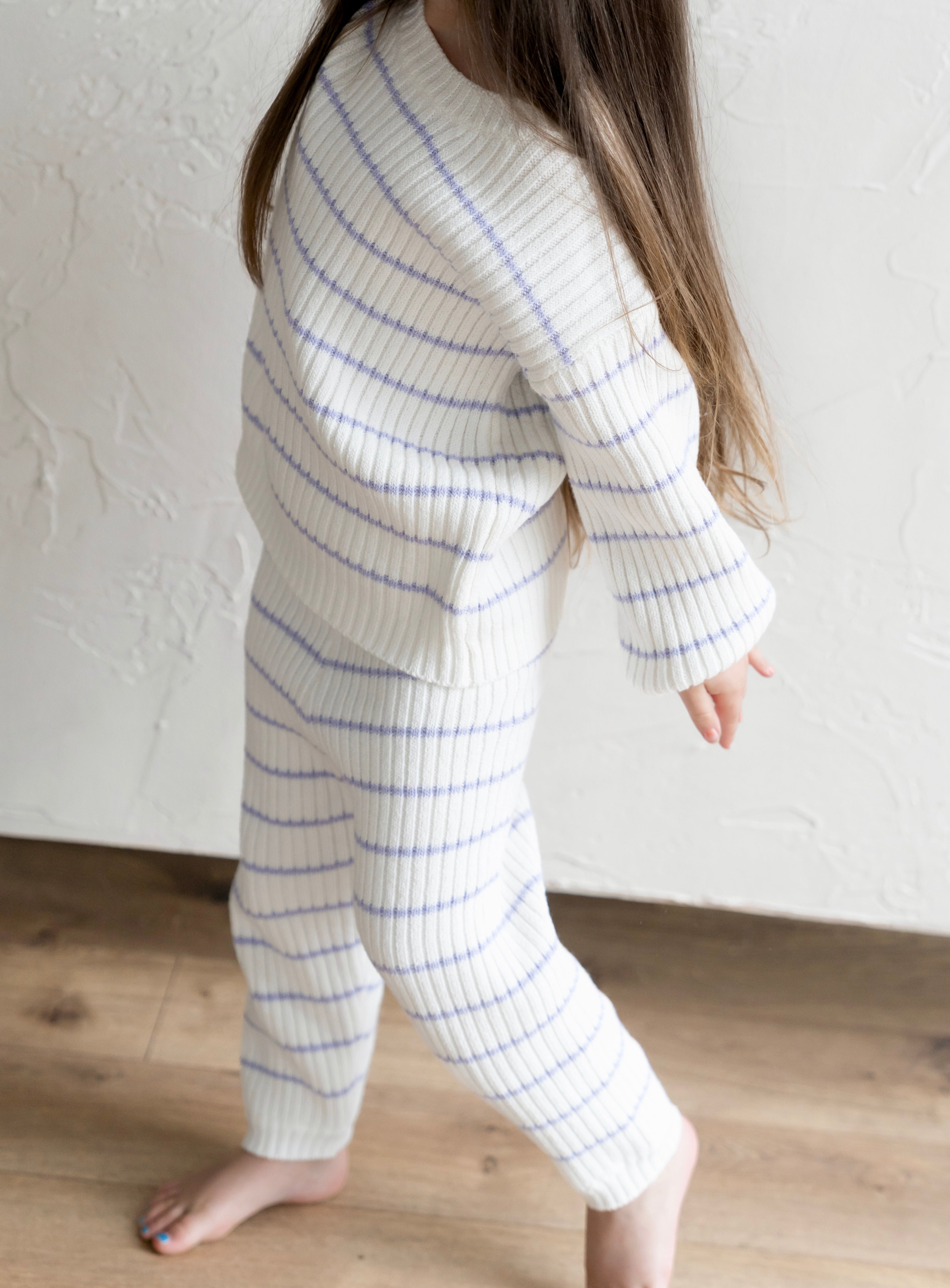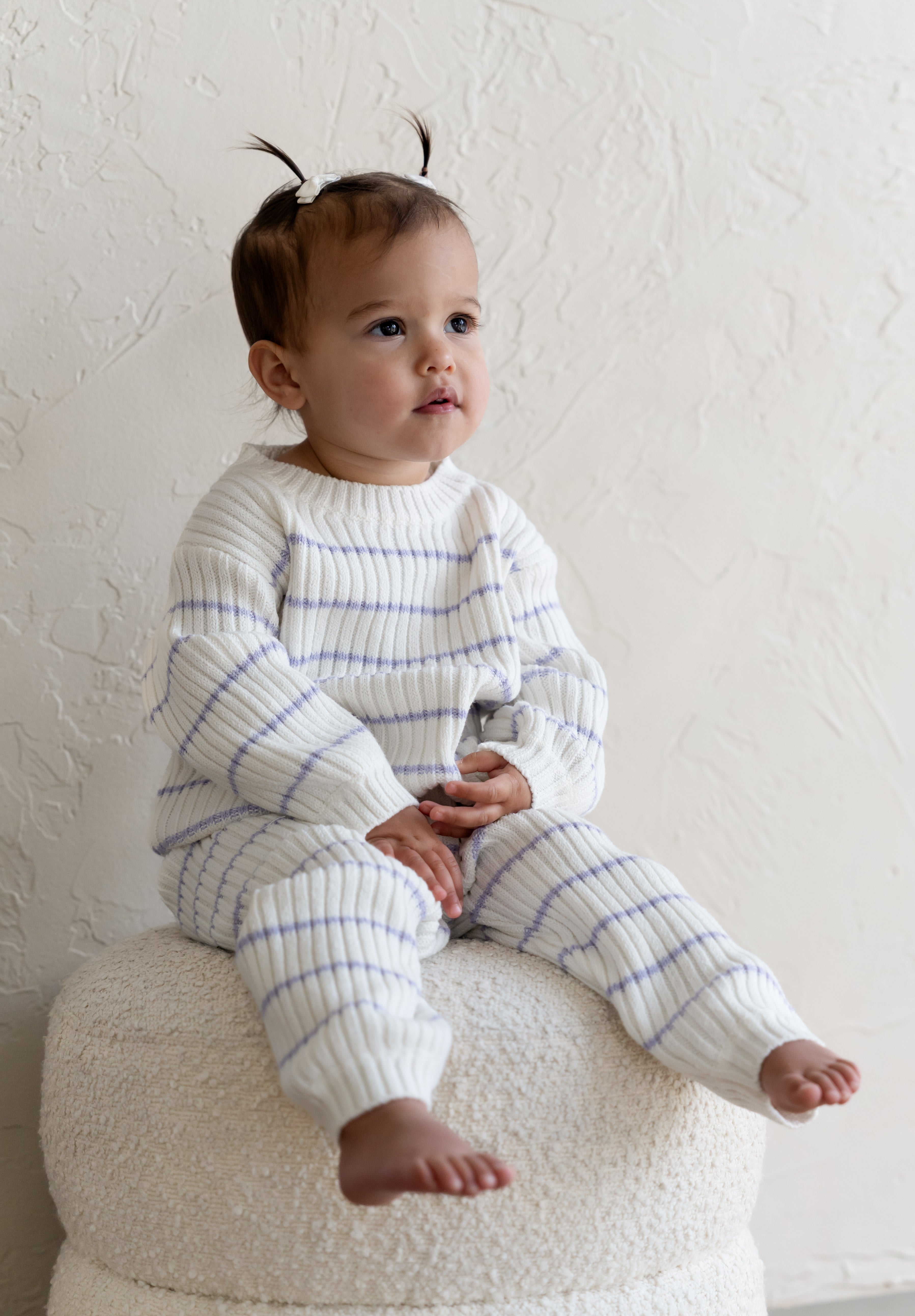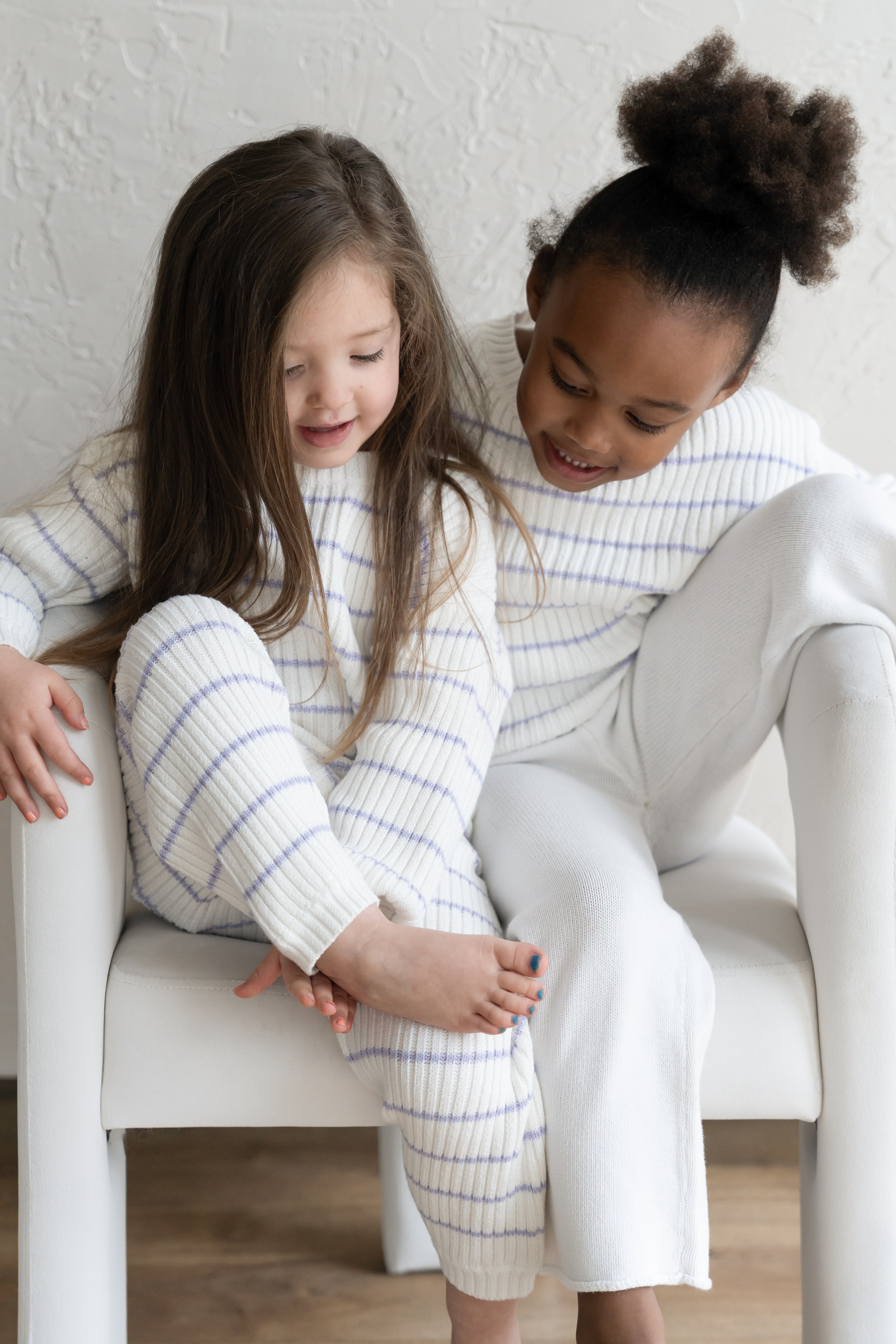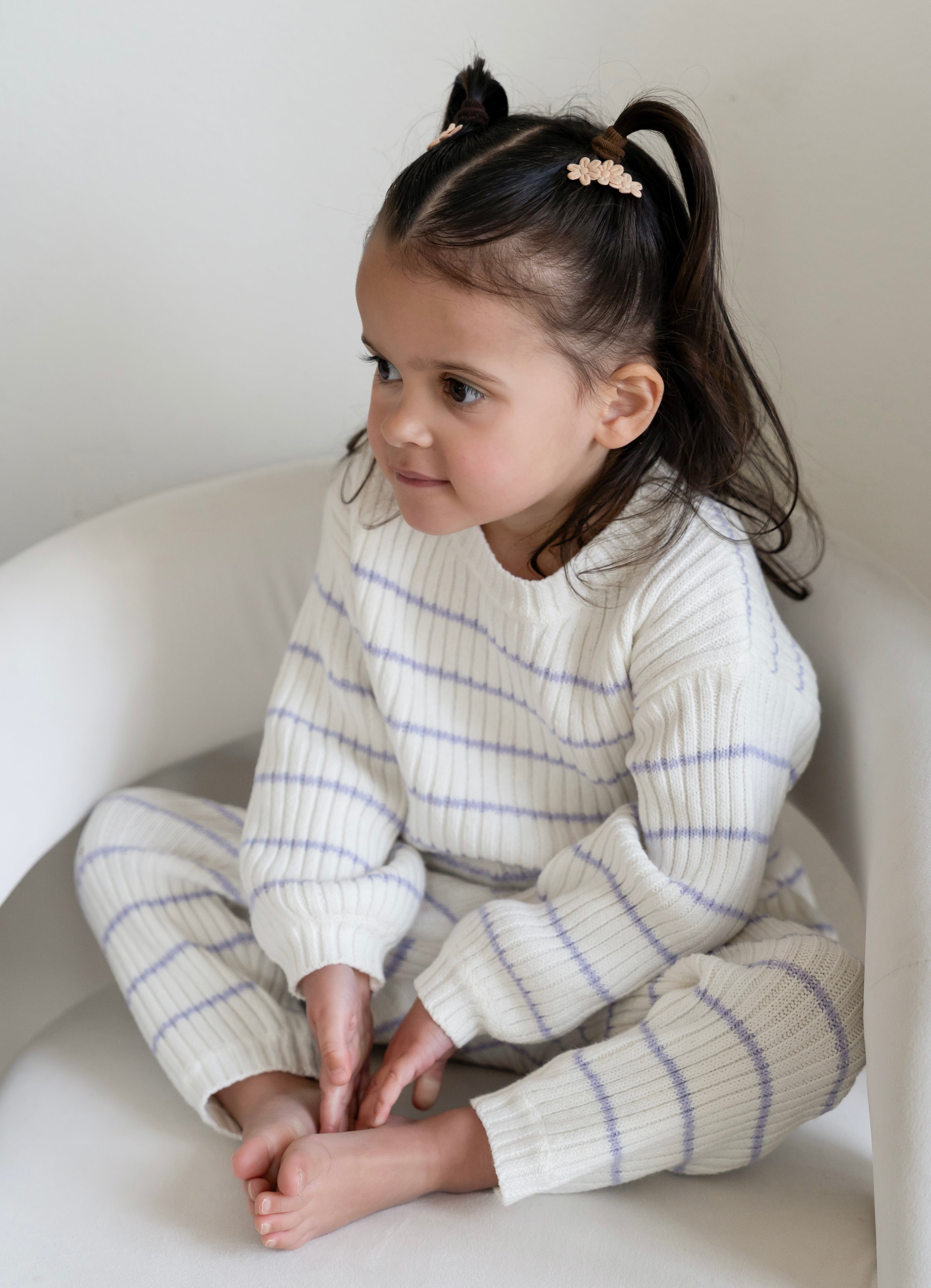 This Light Purple and Off White striped ribbed pant was made with a timeless look and a luxury fit. With a wide elastic waistband and fitted leg cuffs, these pants were made with your child’s comfort in mind. Pair with their favorite sweater or the matching striped ribbed sweater for the complete knit set. Style meets durability with these minimalistic ribbed pants.