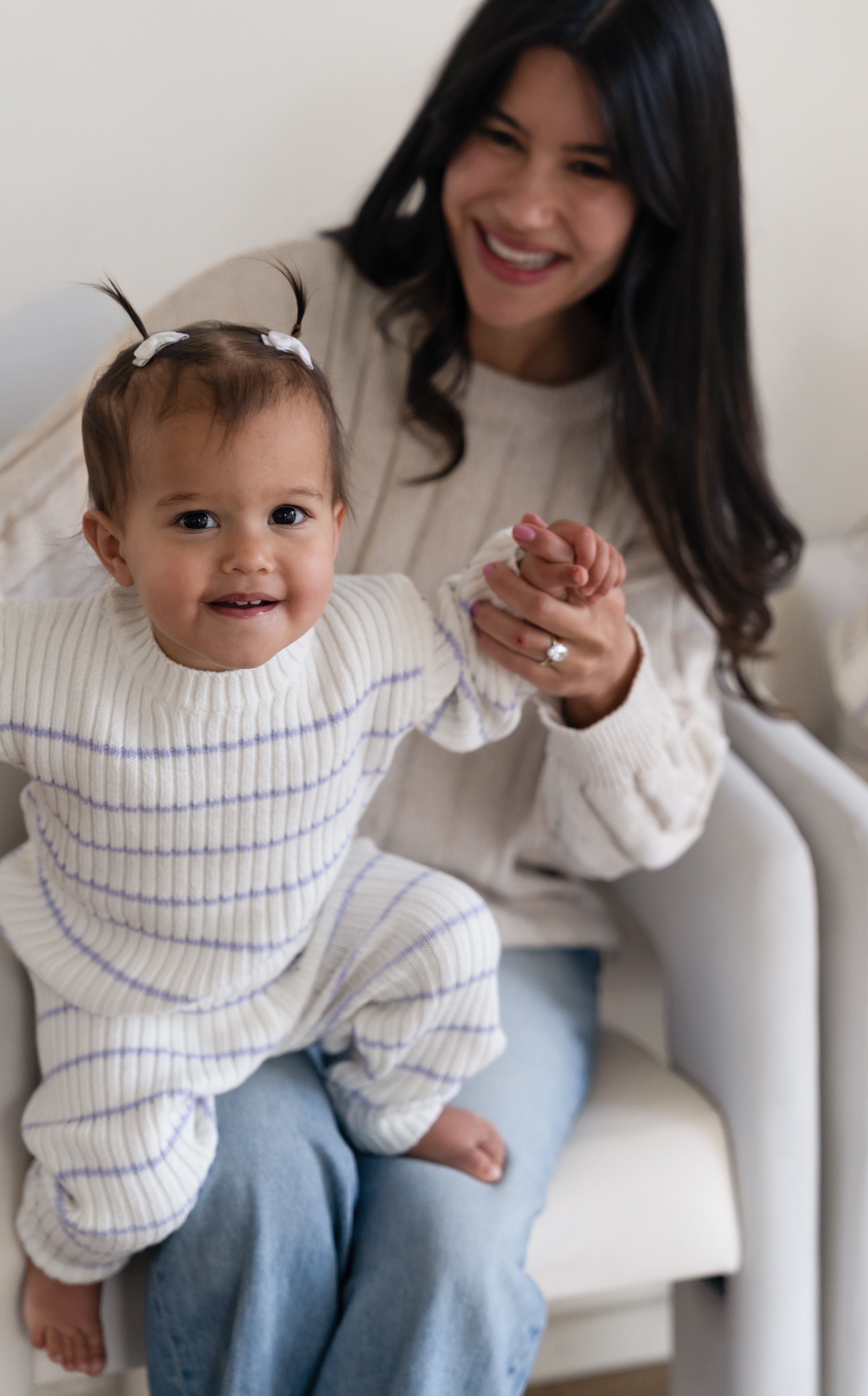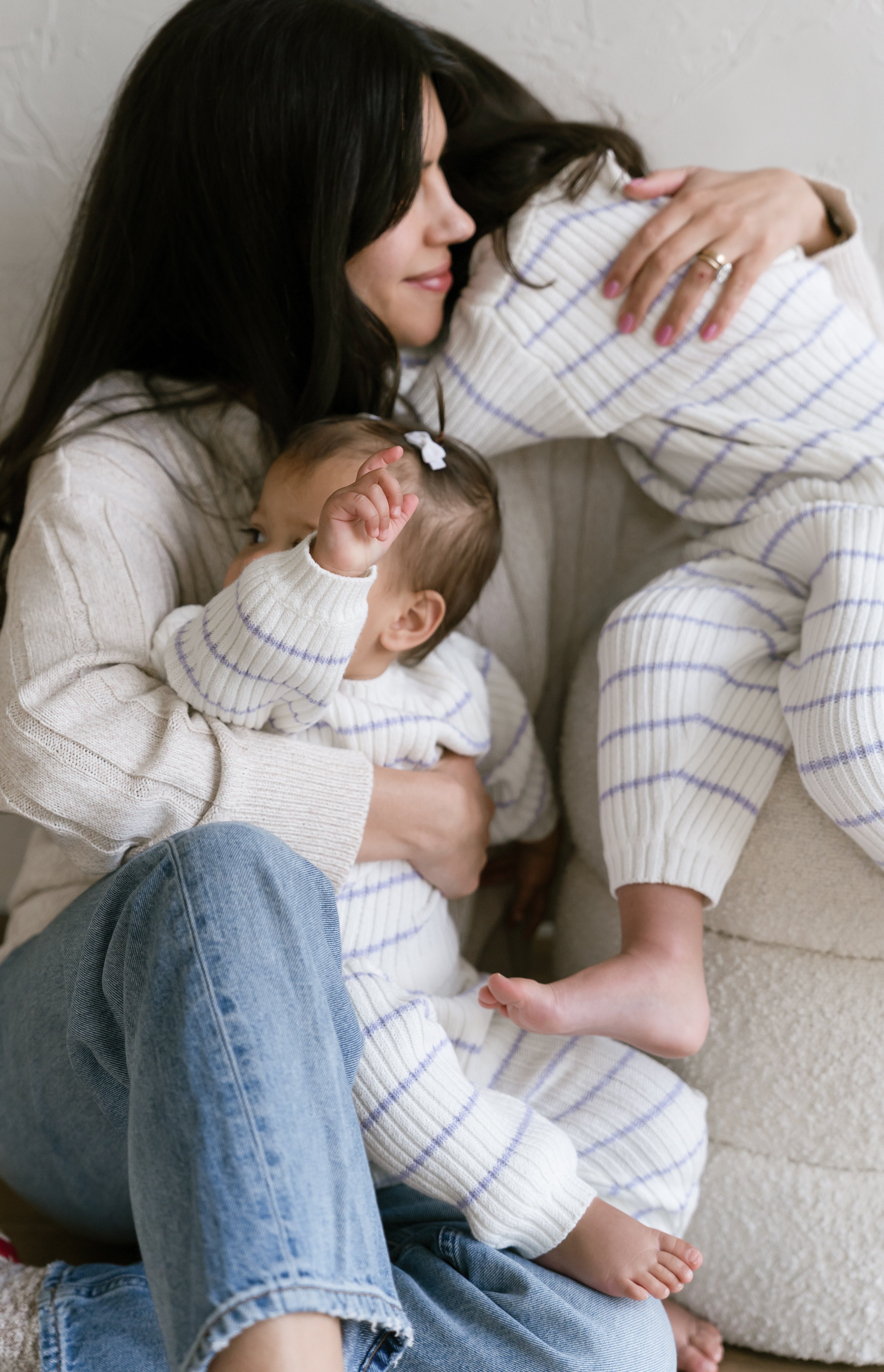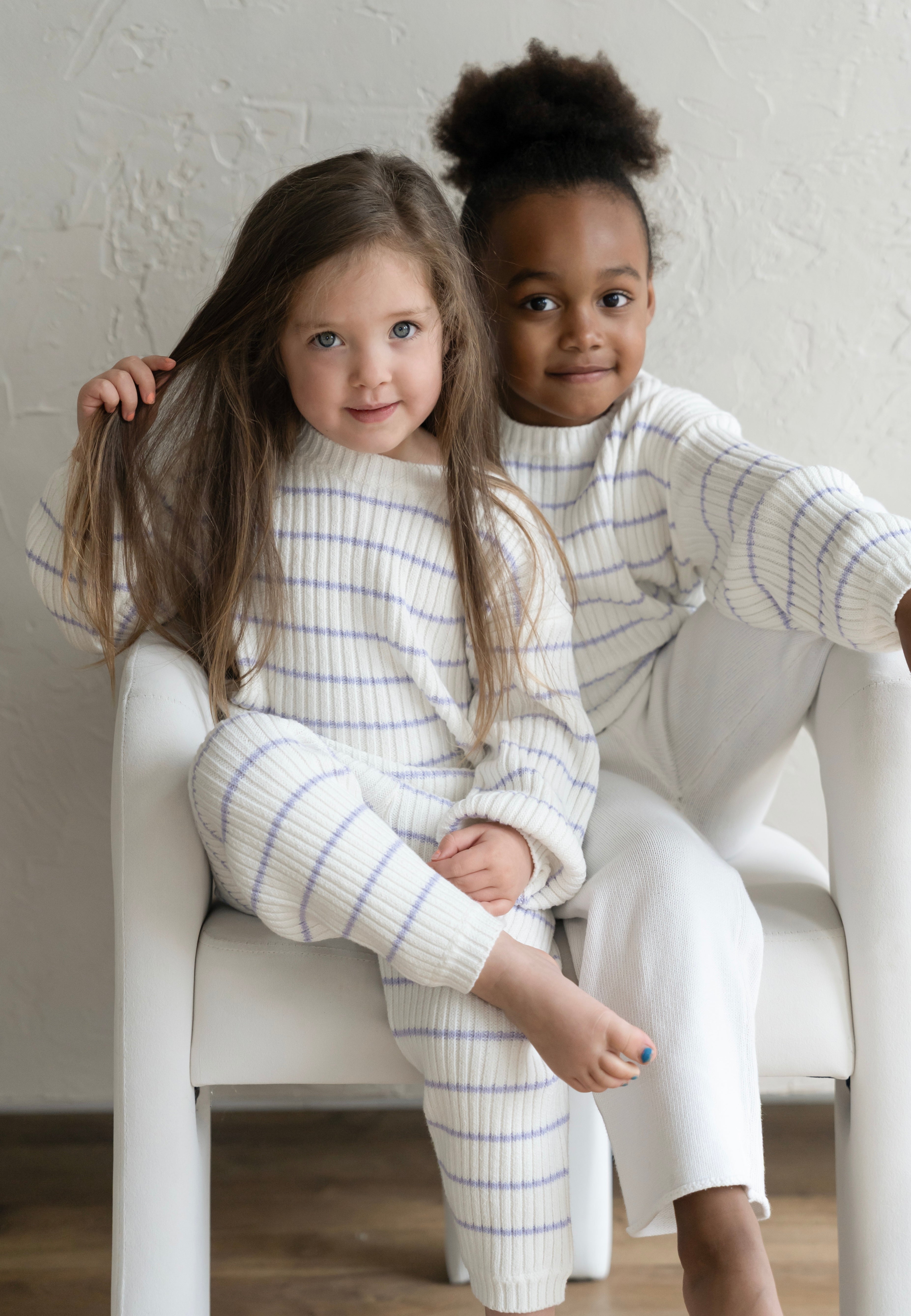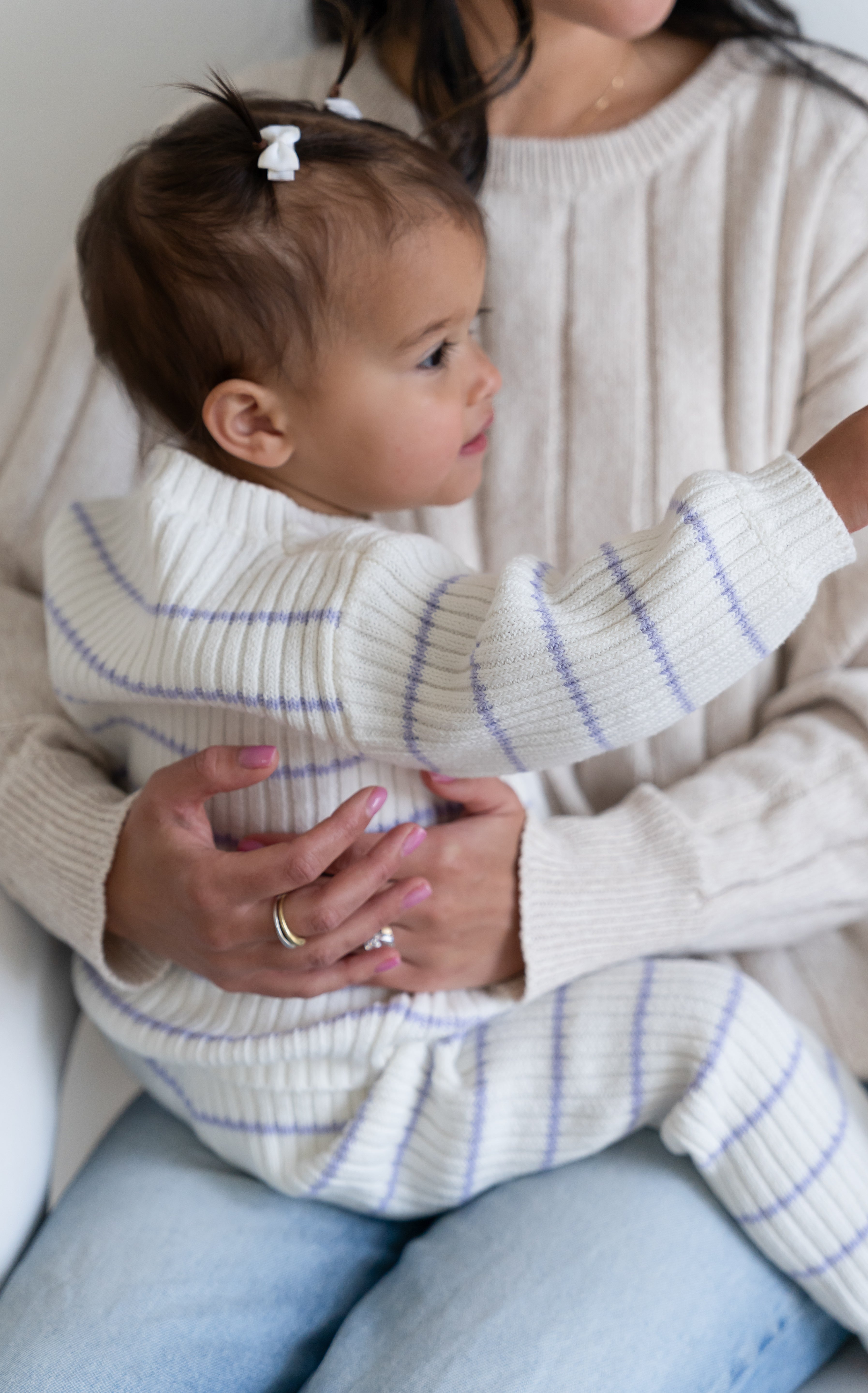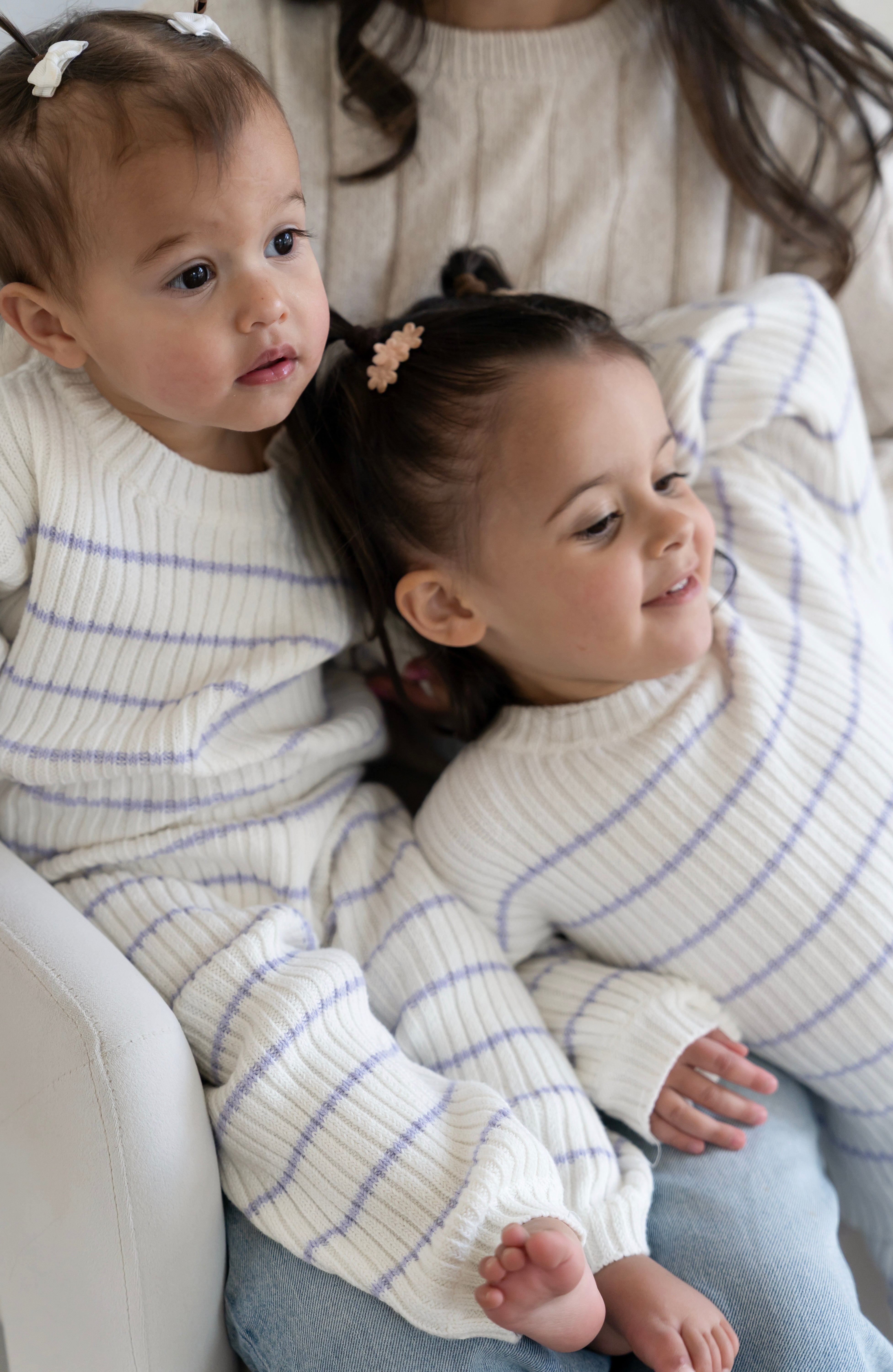 This Light Purple and Off White striped ribbed pant was made with a timeless look and a luxury fit. With a wide elastic waistband and fitted leg cuffs, these pants were made with your child’s comfort in mind. Pair with their favorite sweater or the matching striped ribbed sweater for the complete knit set. Style meets durability with these minimalistic ribbed pants.