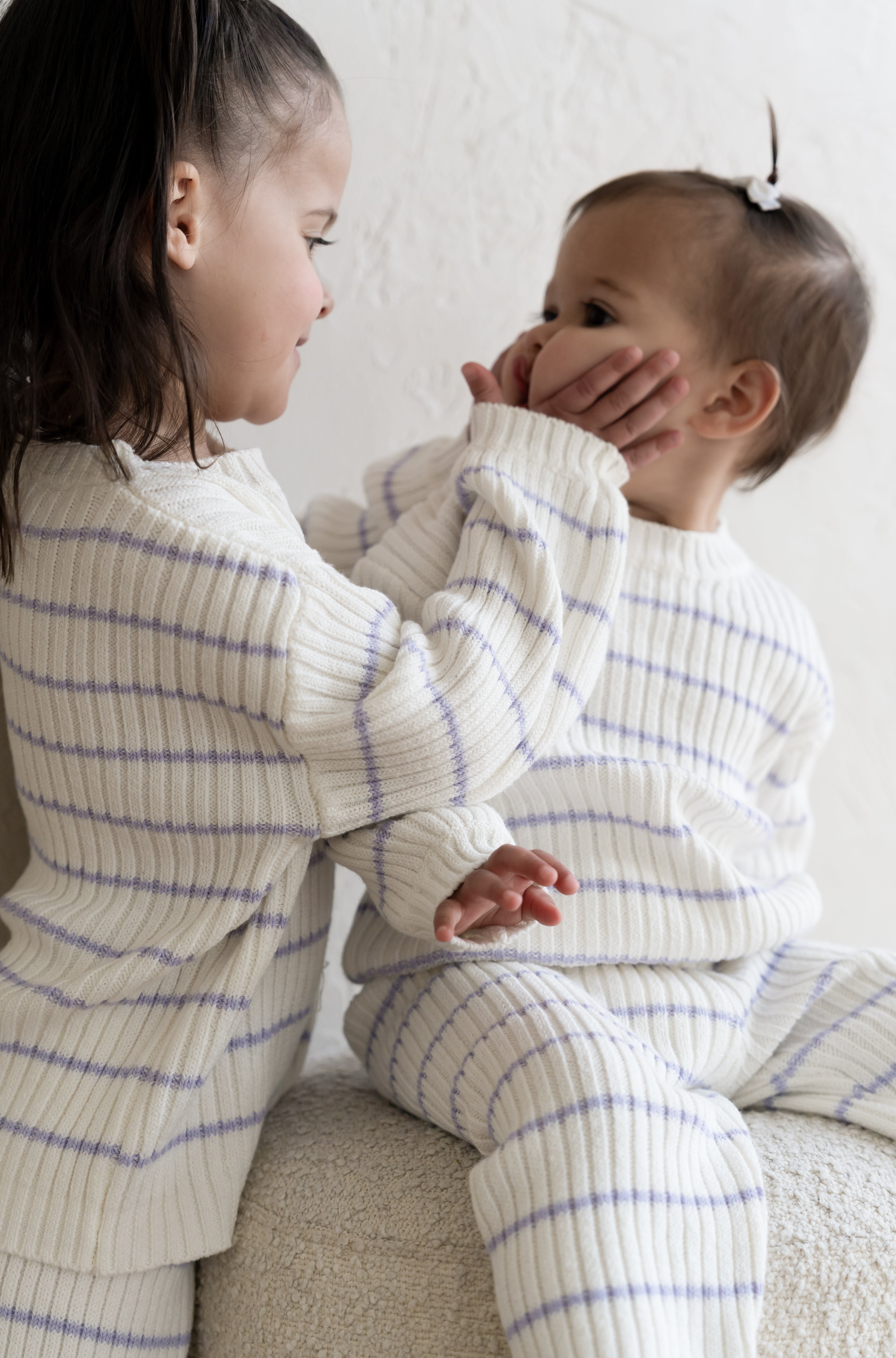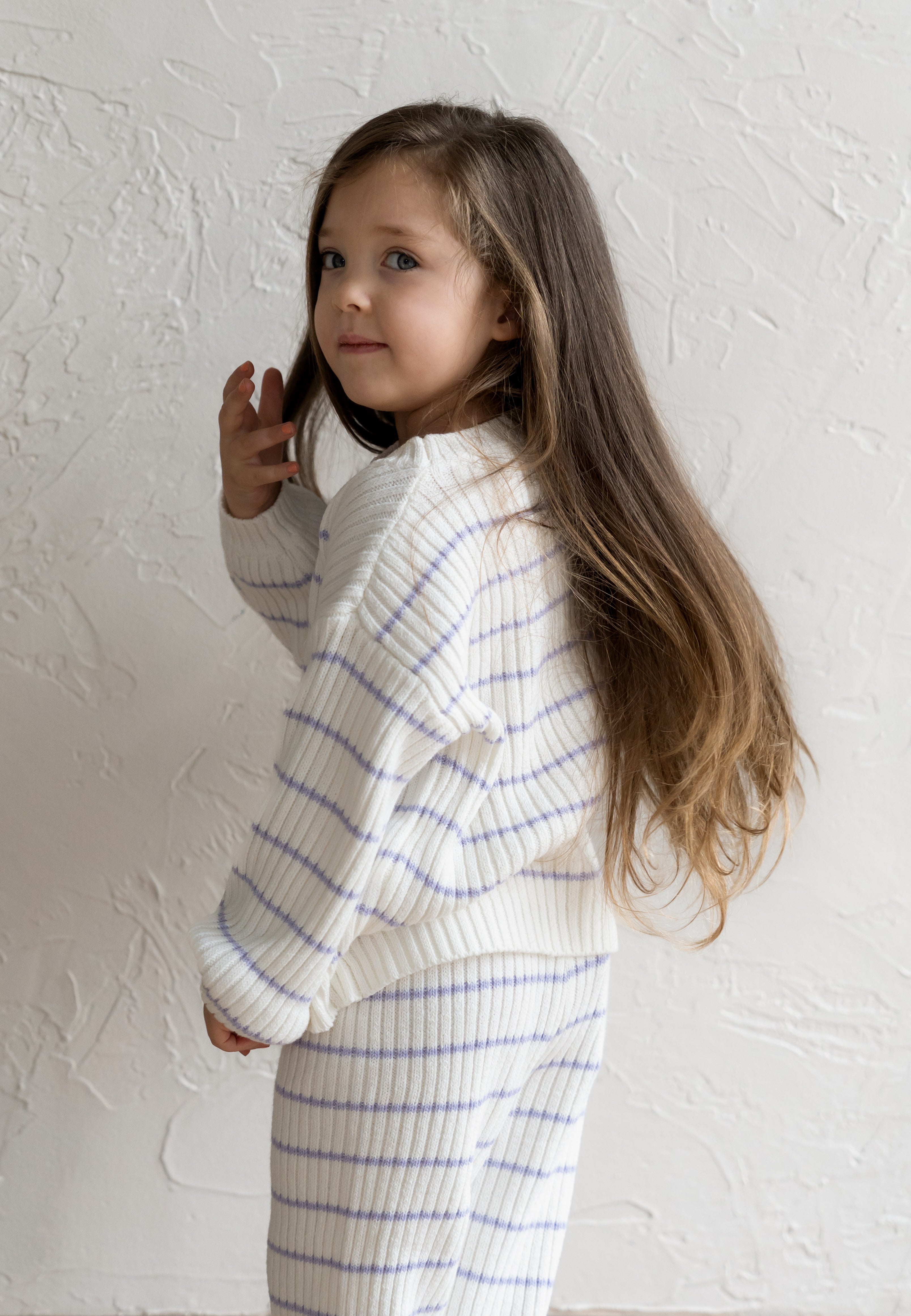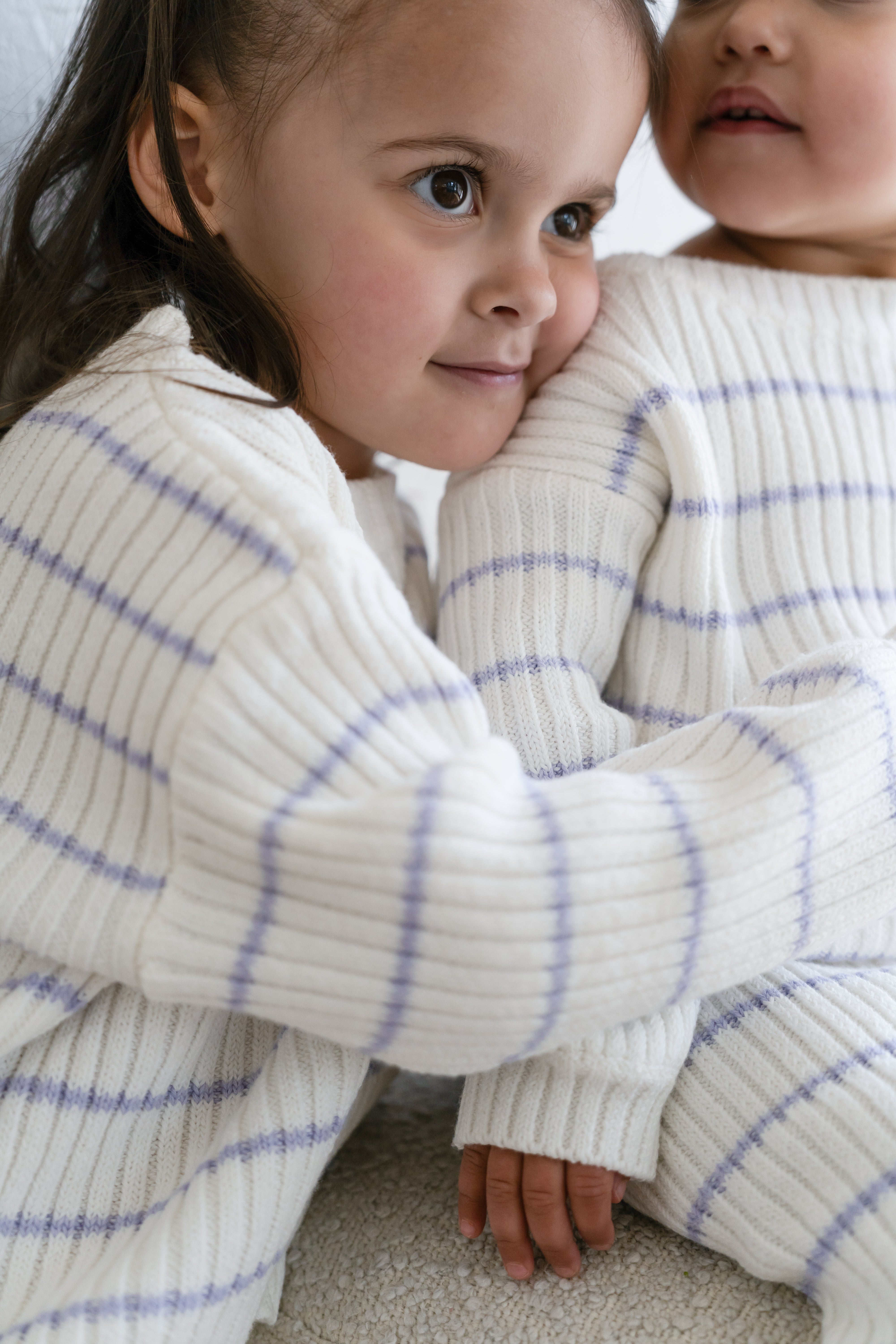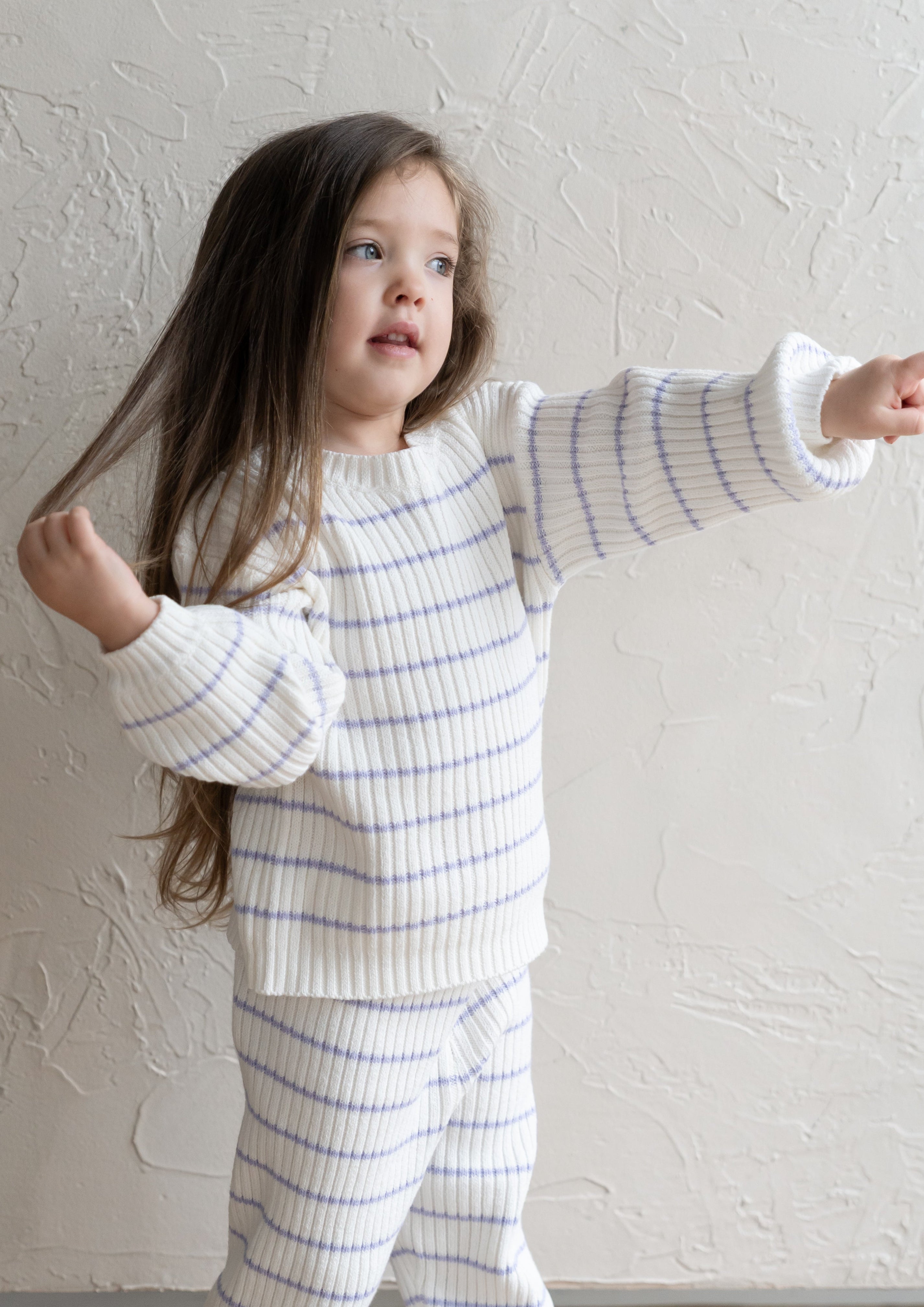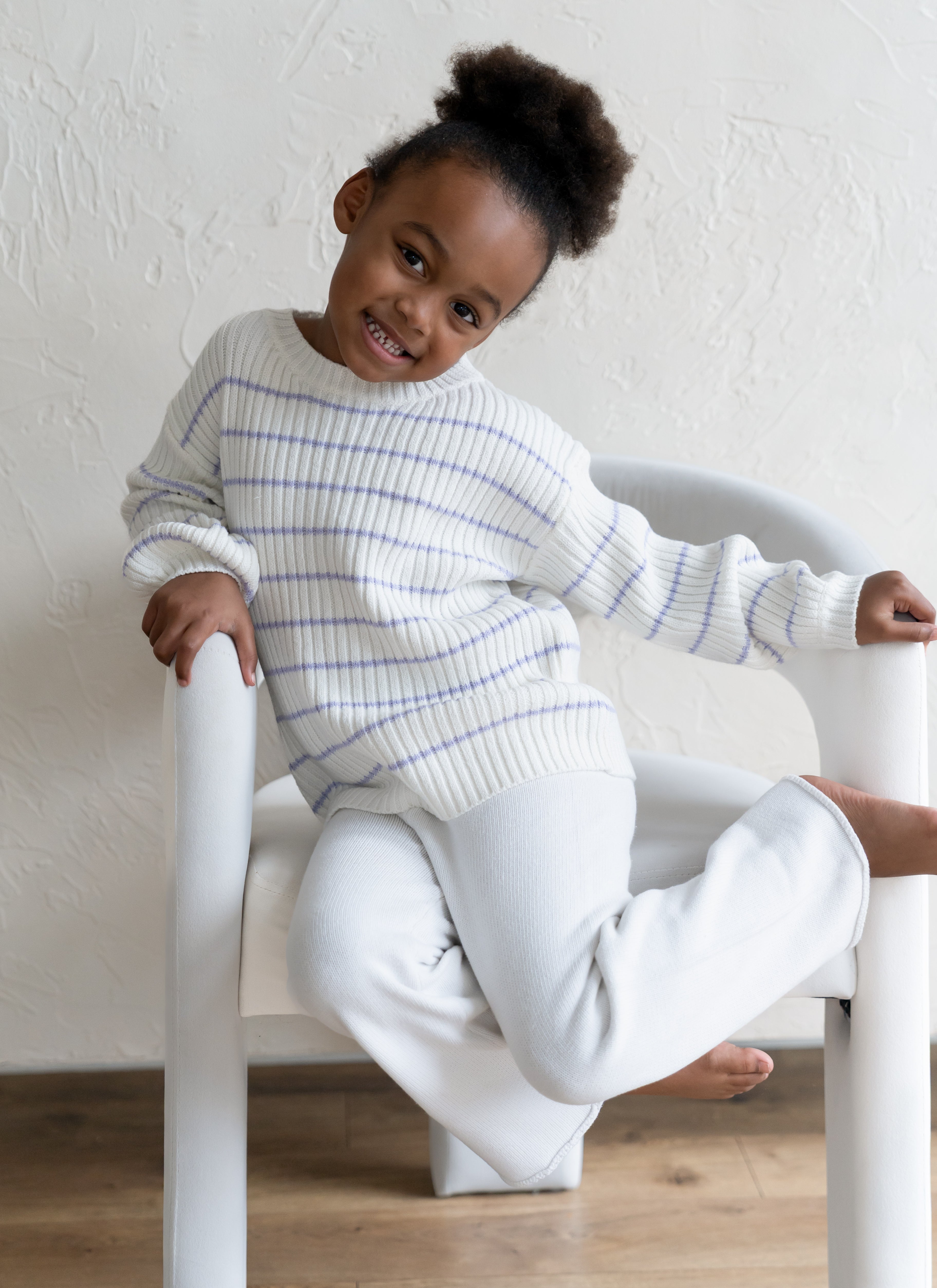 This Light Purple and Off White striped ribbed sweater was made with a timeless look and a luxury fit. Wide arms and fitted cuffs give it an elegant look that goes well with any outfit. Pair with their favorite bottoms or the matching striped ribbed pants for the full knit set. Style meets durability with this minimalistic ribbed sweater.