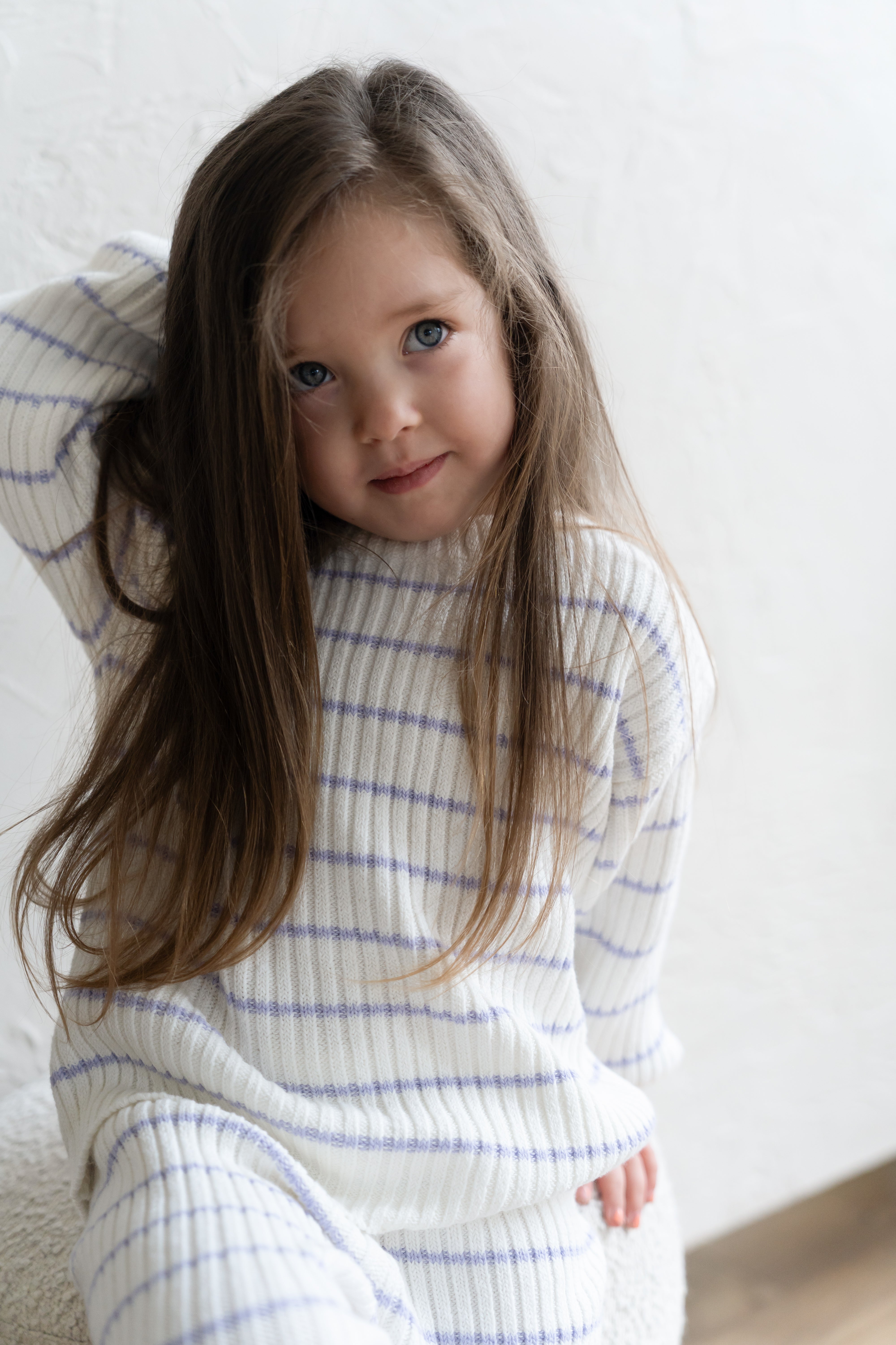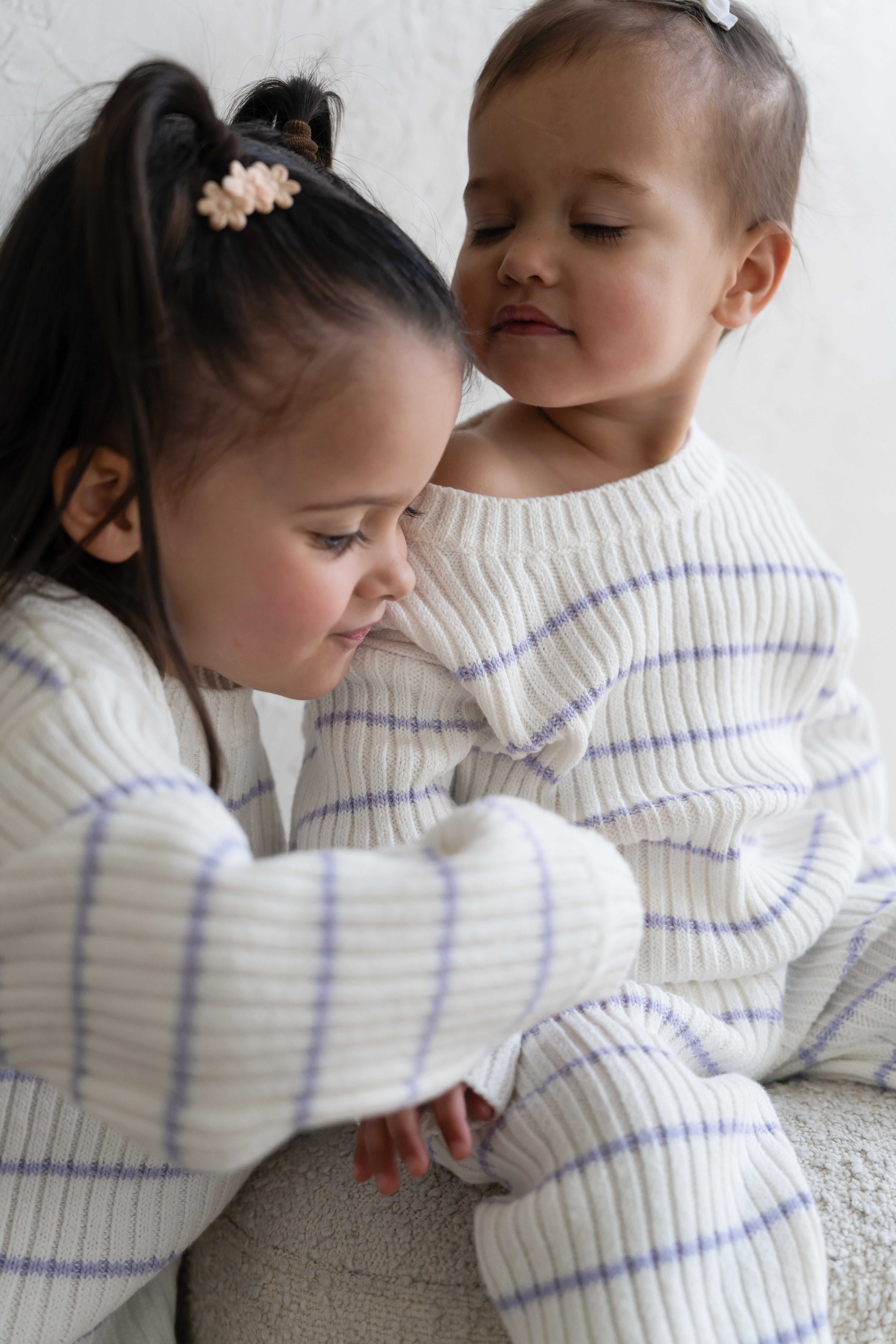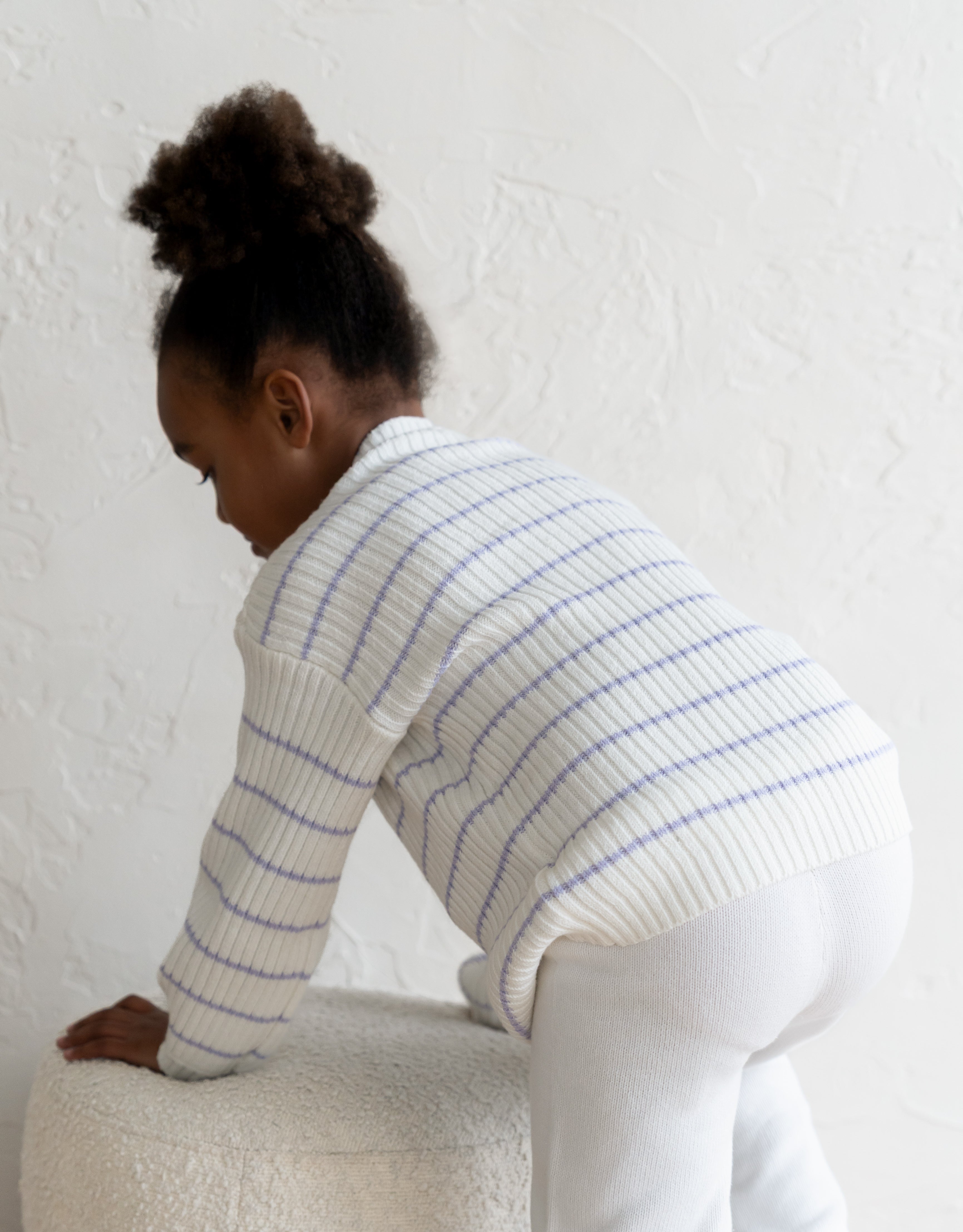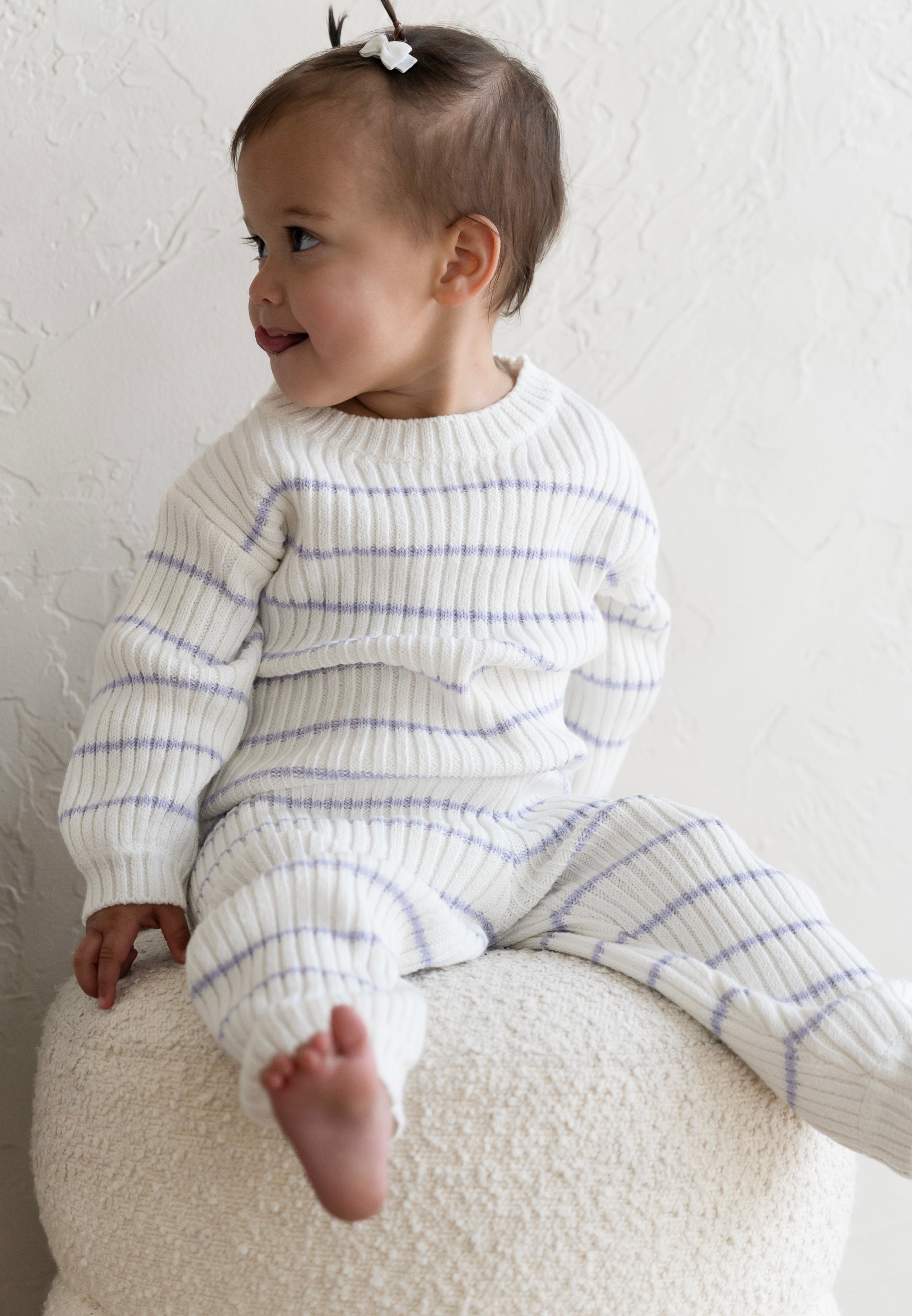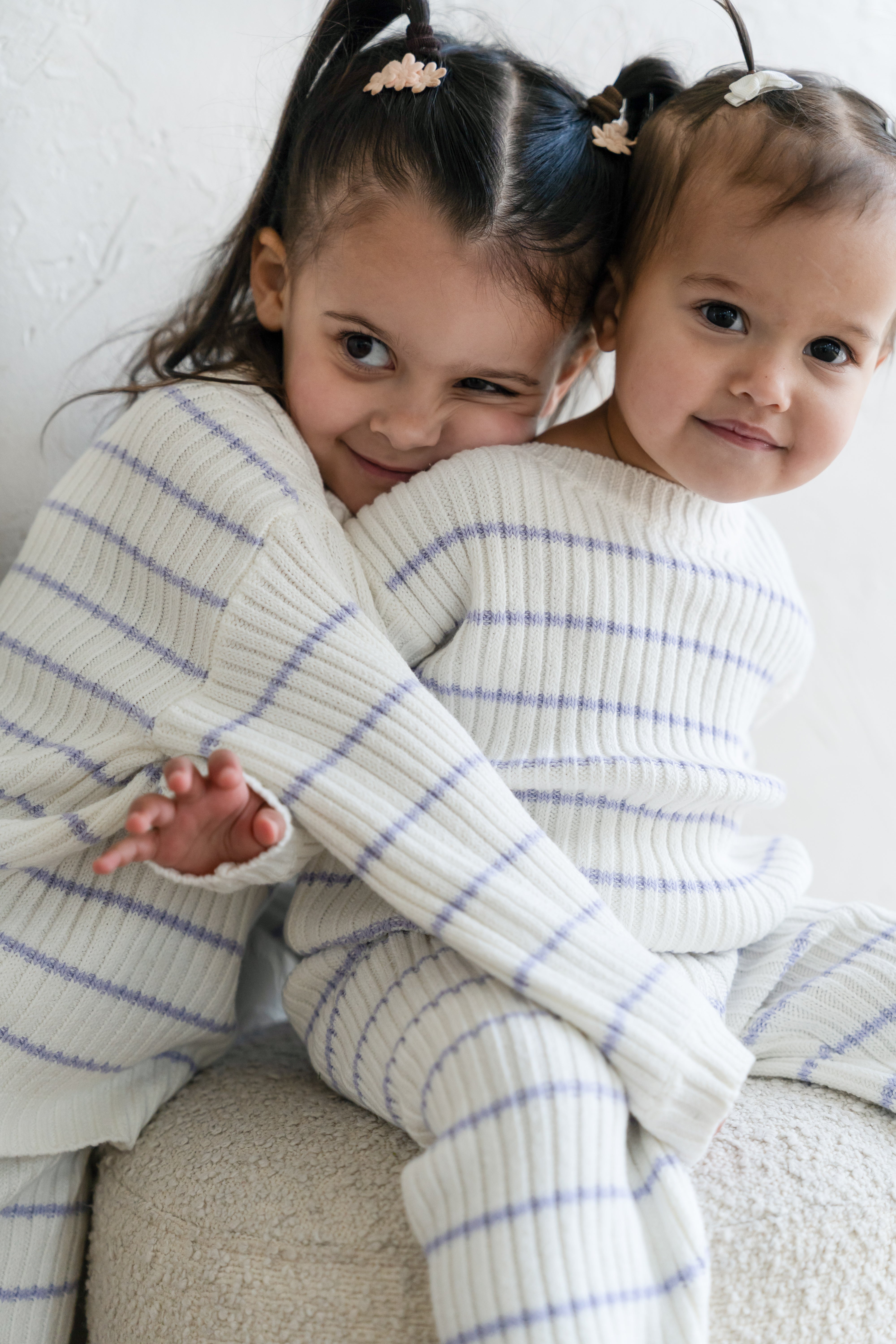 This Light Purple and Off White striped ribbed sweater was made with a timeless look and a luxury fit. Wide arms and fitted cuffs give it an elegant look that goes well with any outfit. Pair with their favorite bottoms or the matching striped ribbed pants for the full knit set. Style meets durability with this minimalistic ribbed sweater.