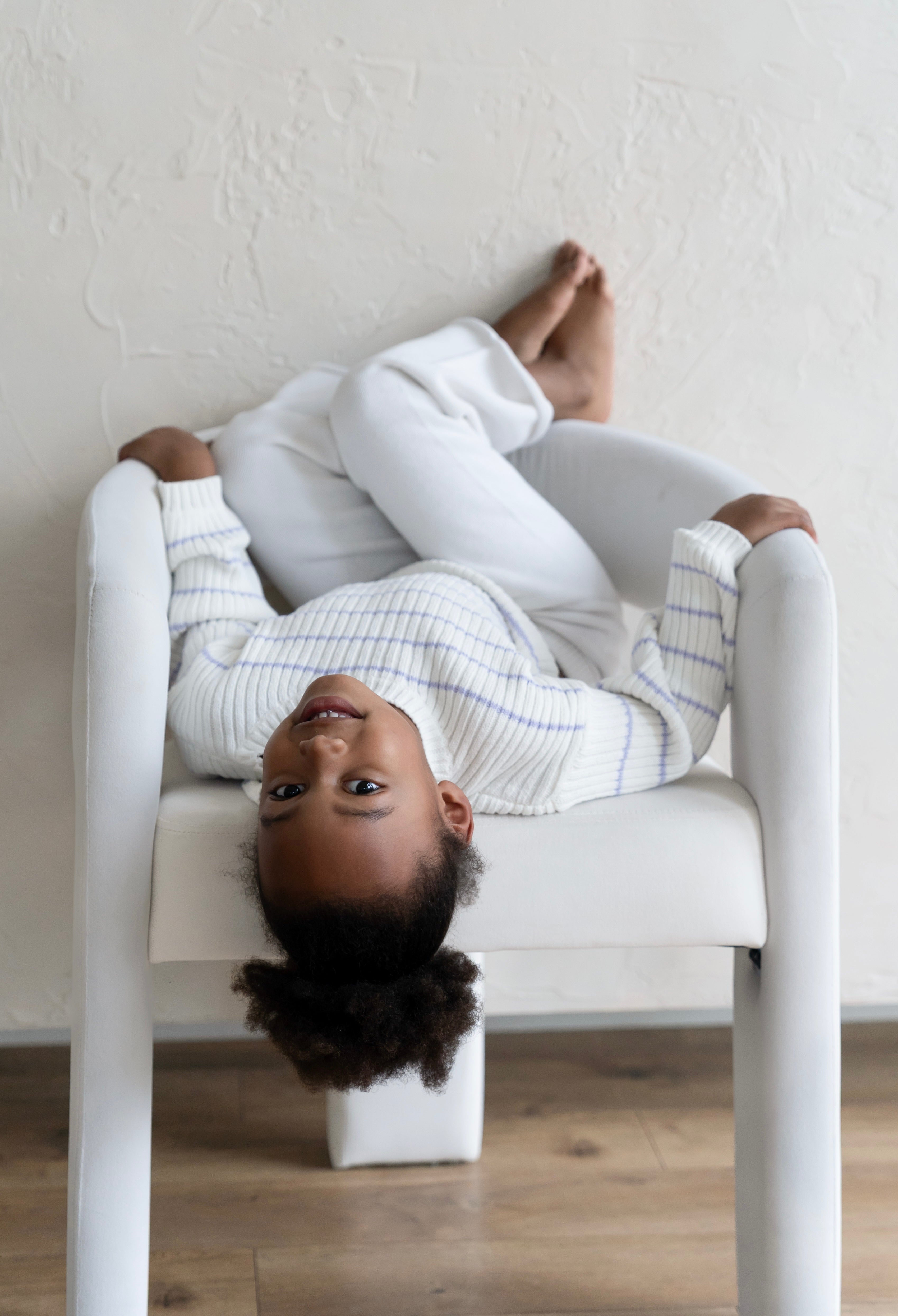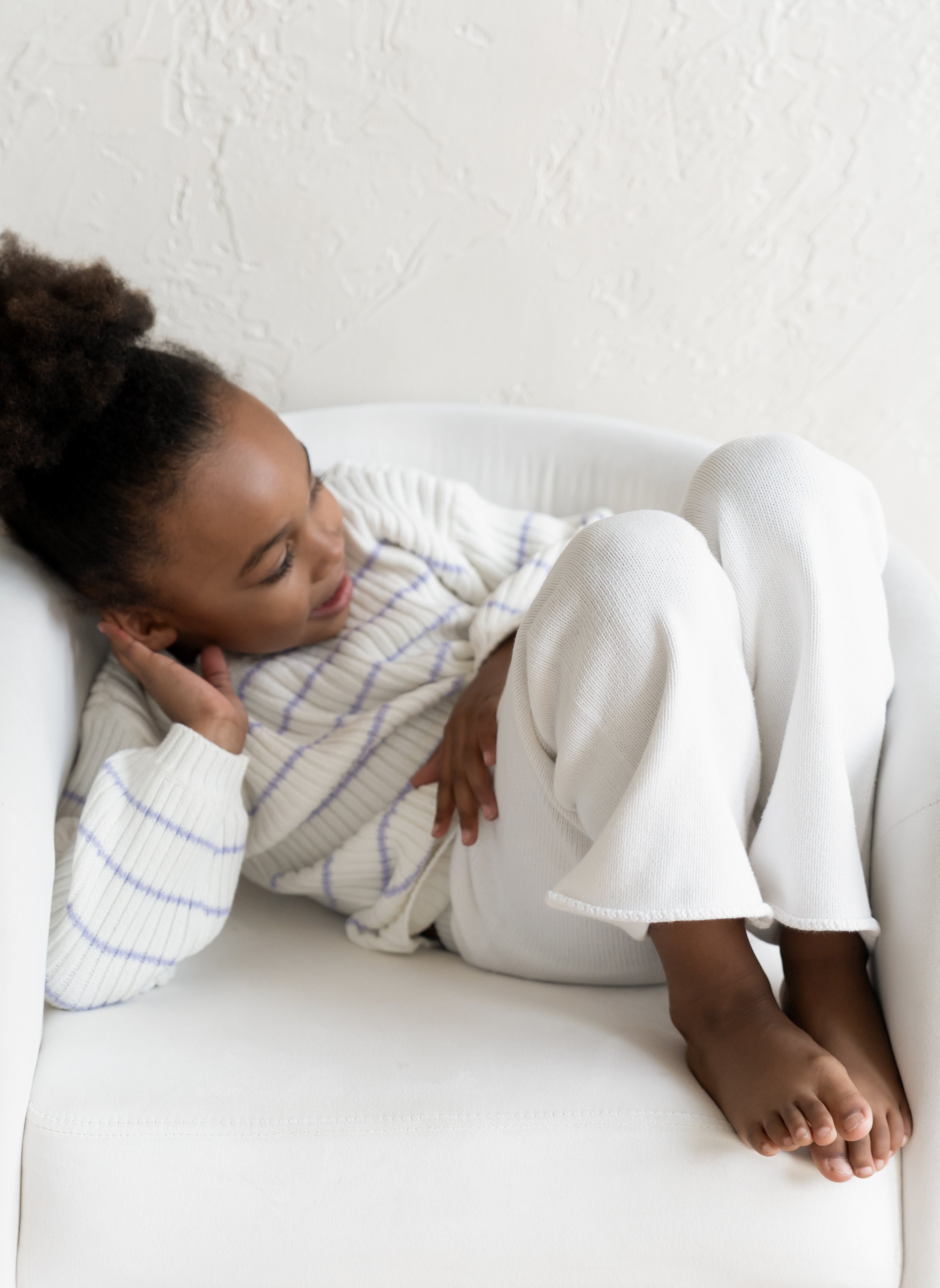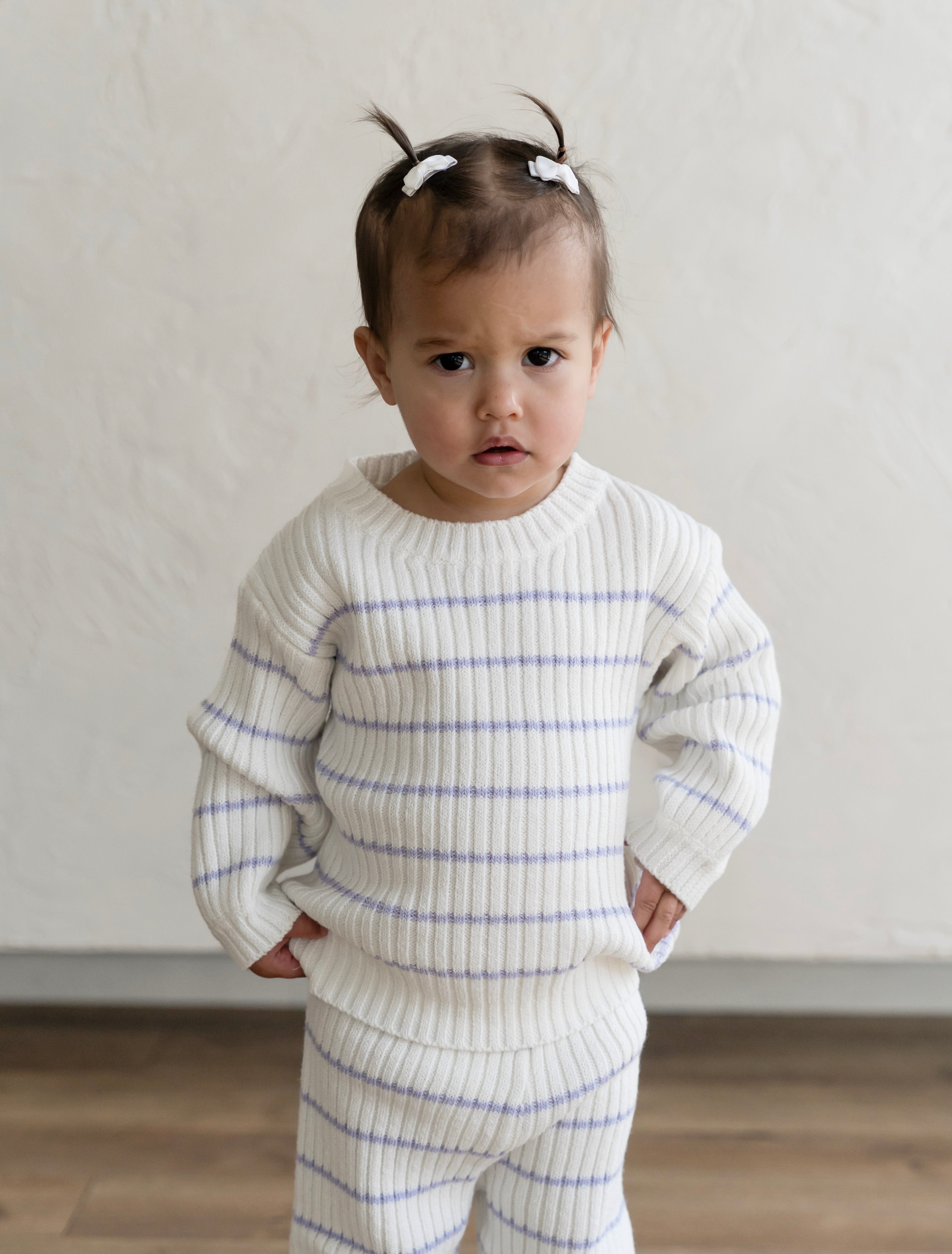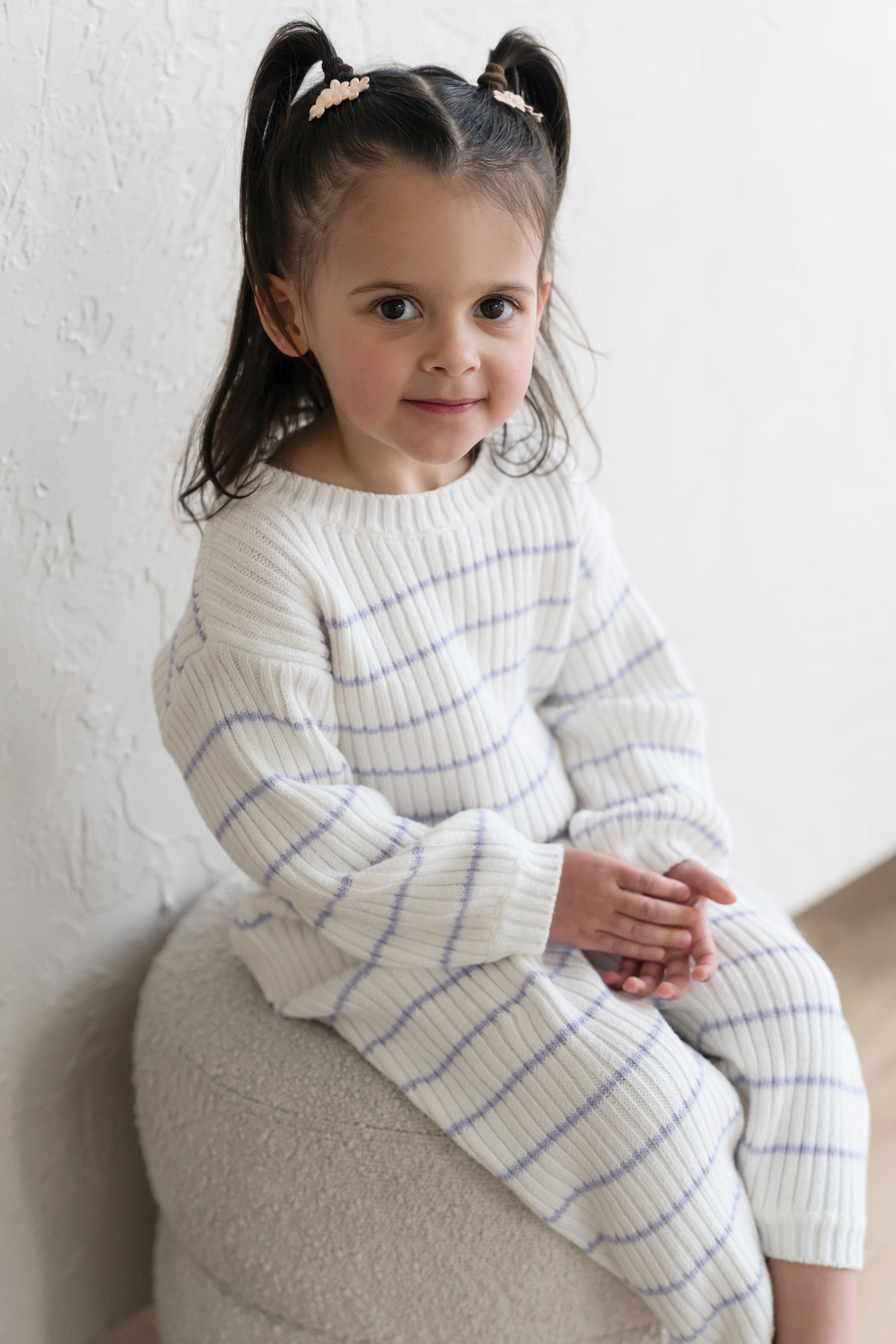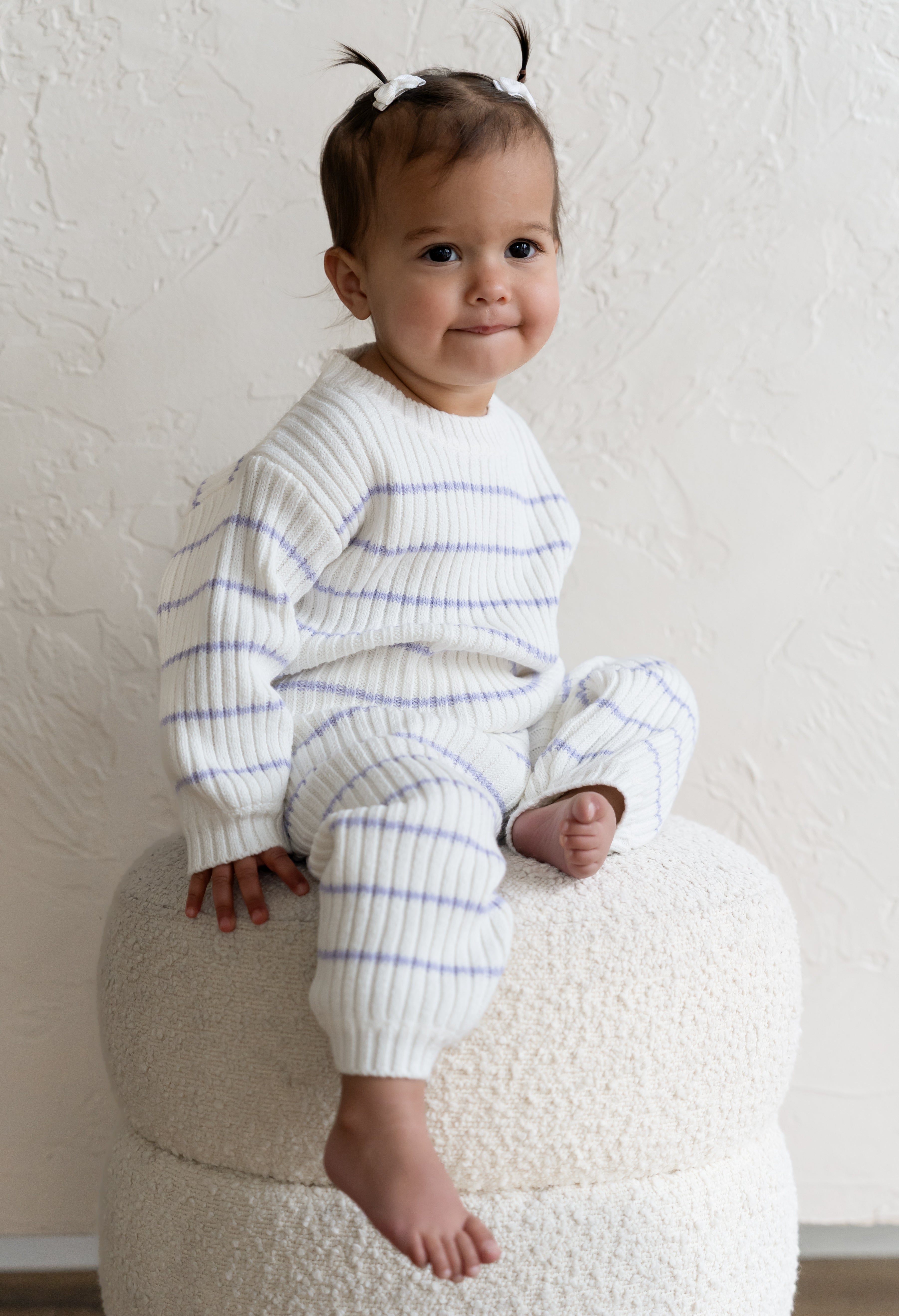 This Light Purple and Off White striped ribbed sweater was made with a timeless look and a luxury fit. Wide arms and fitted cuffs give it an elegant look that goes well with any outfit. Pair with their favorite bottoms or the matching striped ribbed pants for the full knit set. Style meets durability with this minimalistic ribbed sweater.