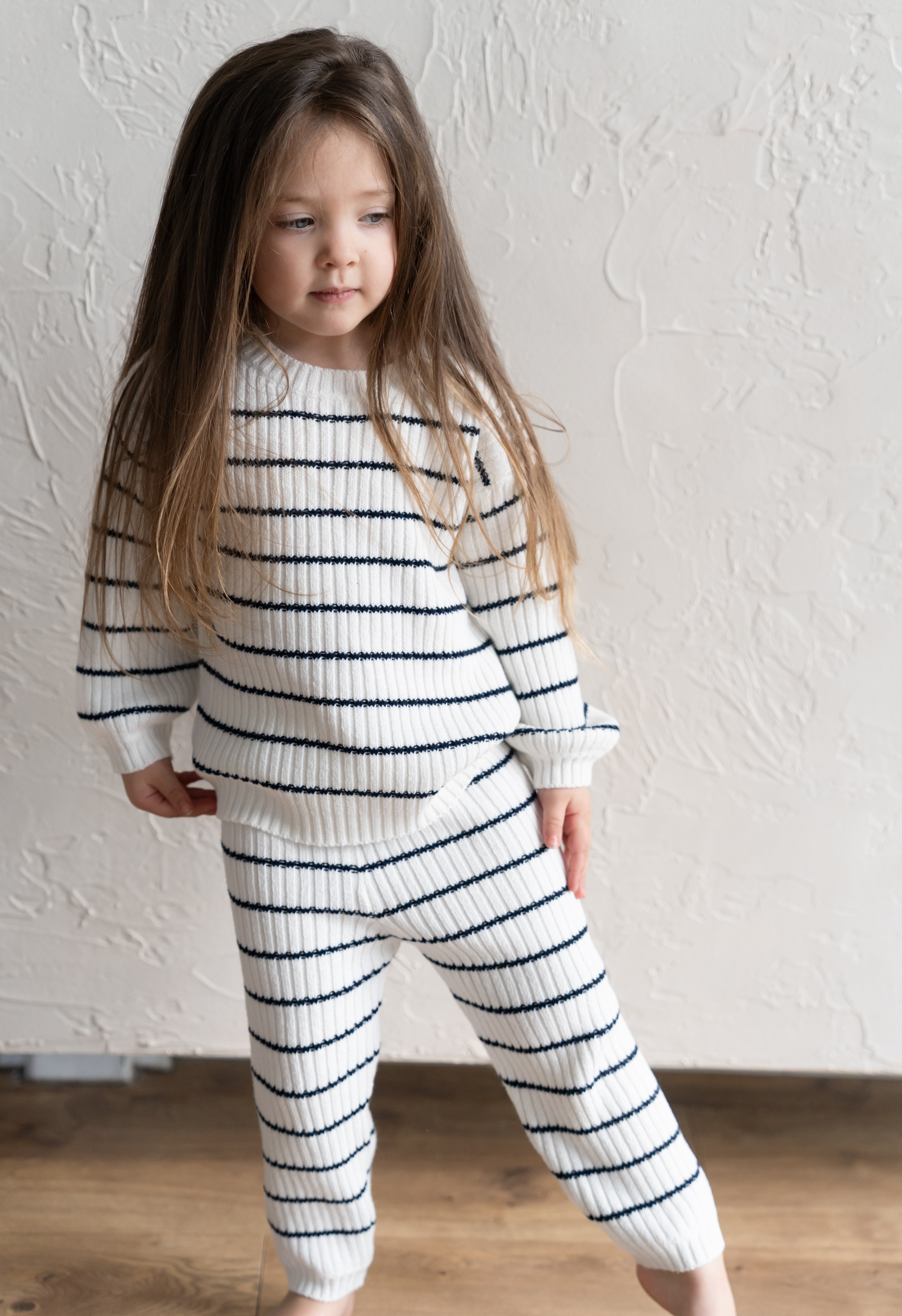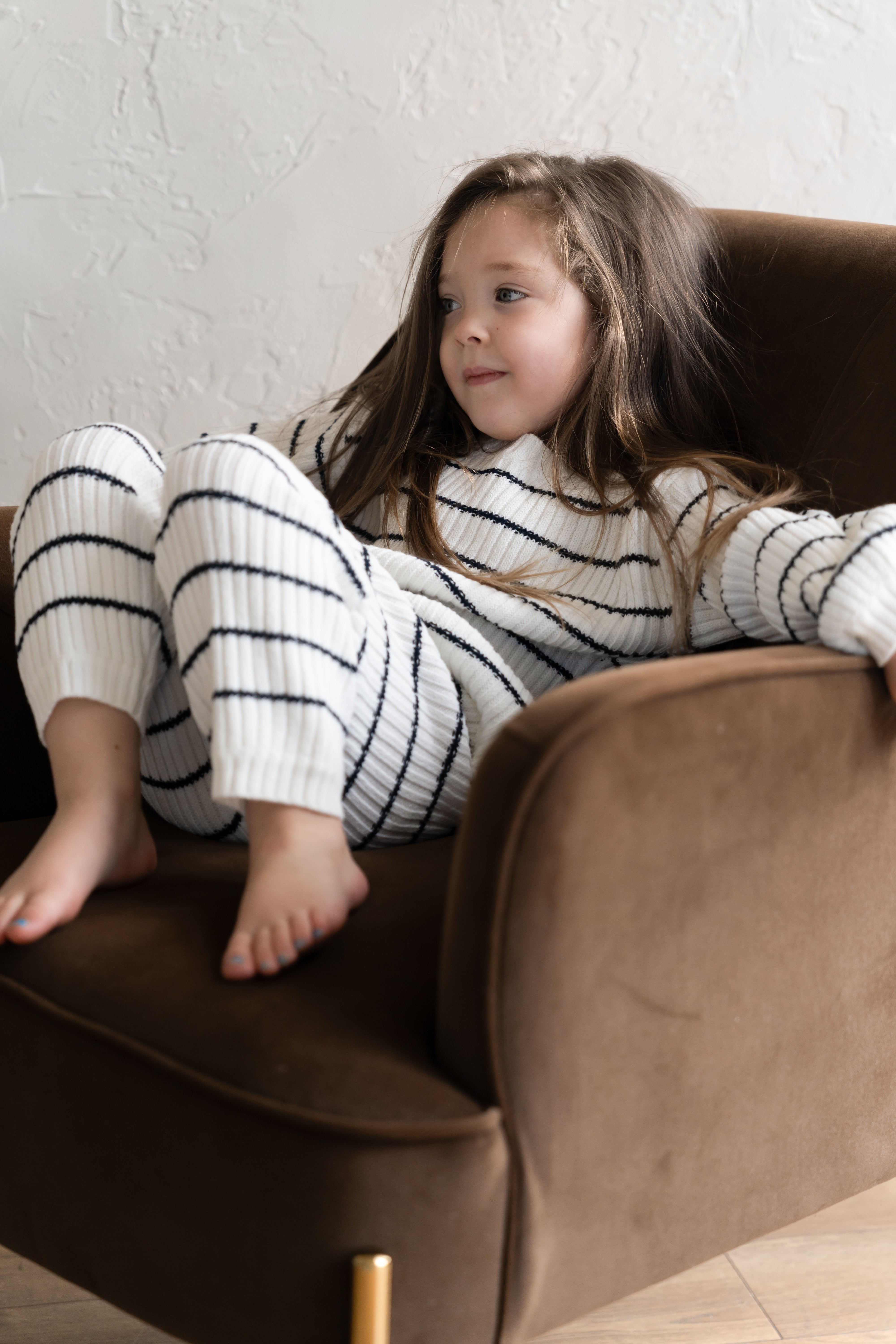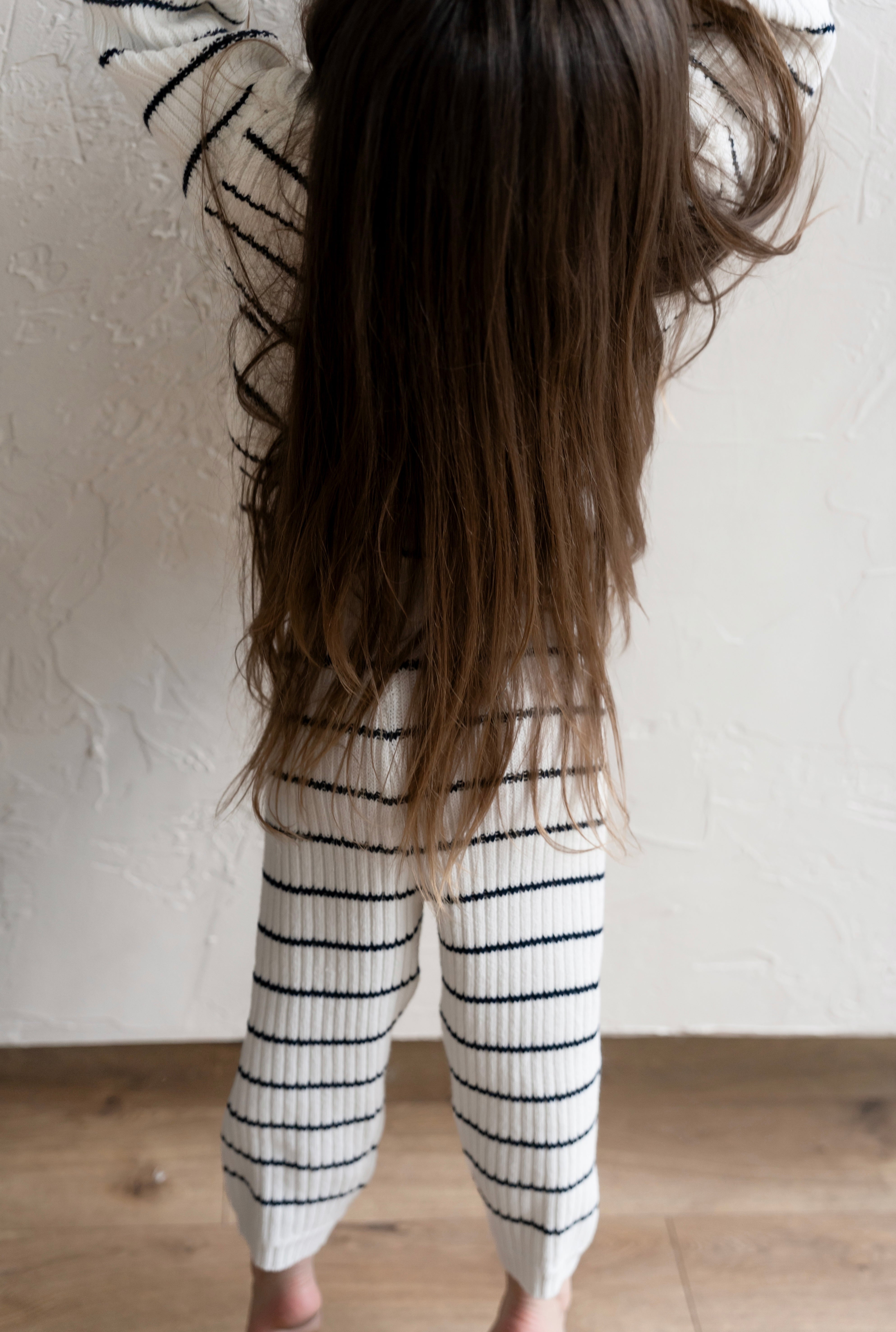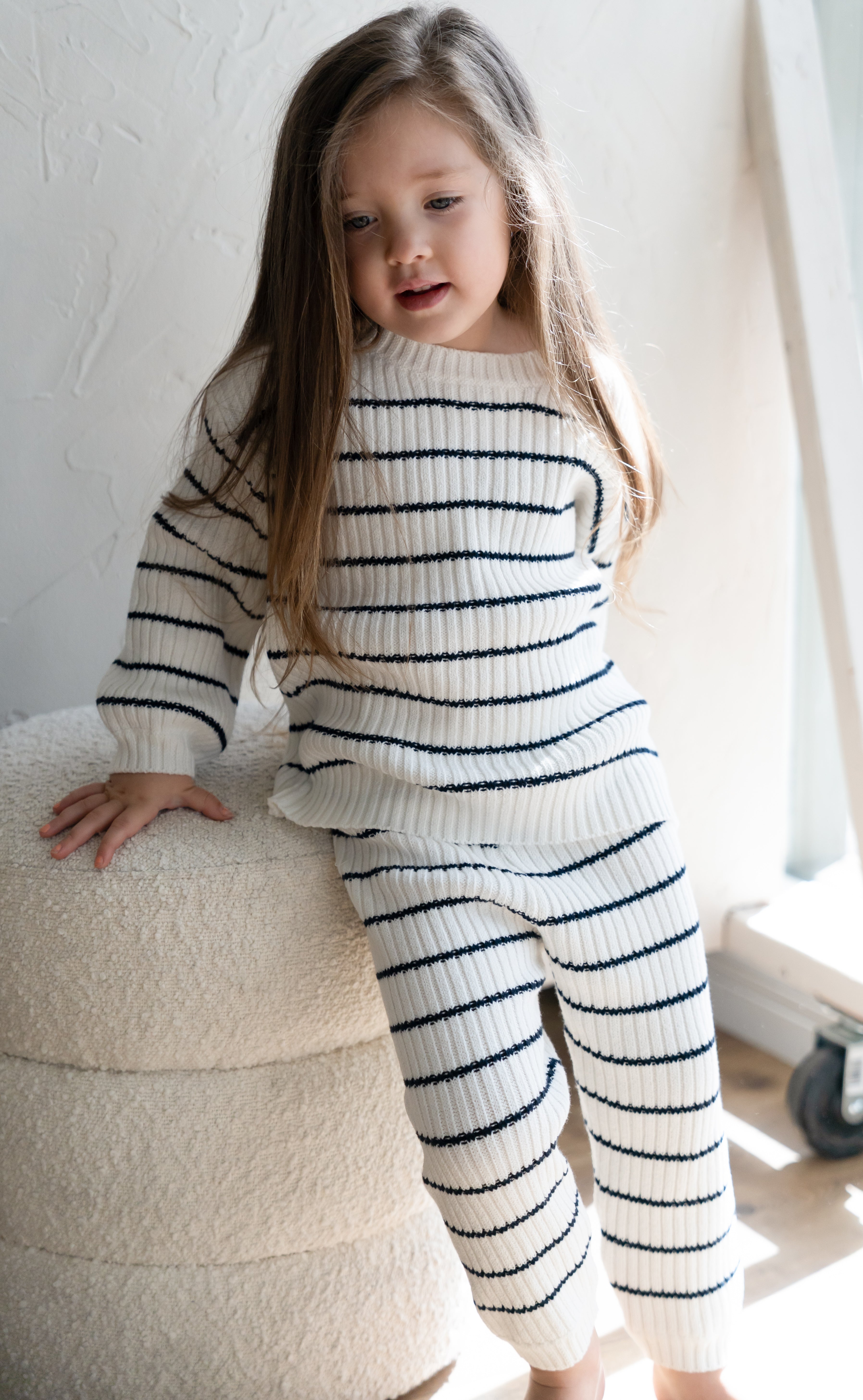 This deep Navy Blue and Off White striped ribbed pant was made with a timeless look and a luxury fit. With a wide elastic waistband and fitted leg cuffs, these pants were made with your child’s comfort in mind. Pair with their favorite sweater or the matching striped ribbed sweater for the complete knit set. Style meets durability with these minimalistic ribbed pants.