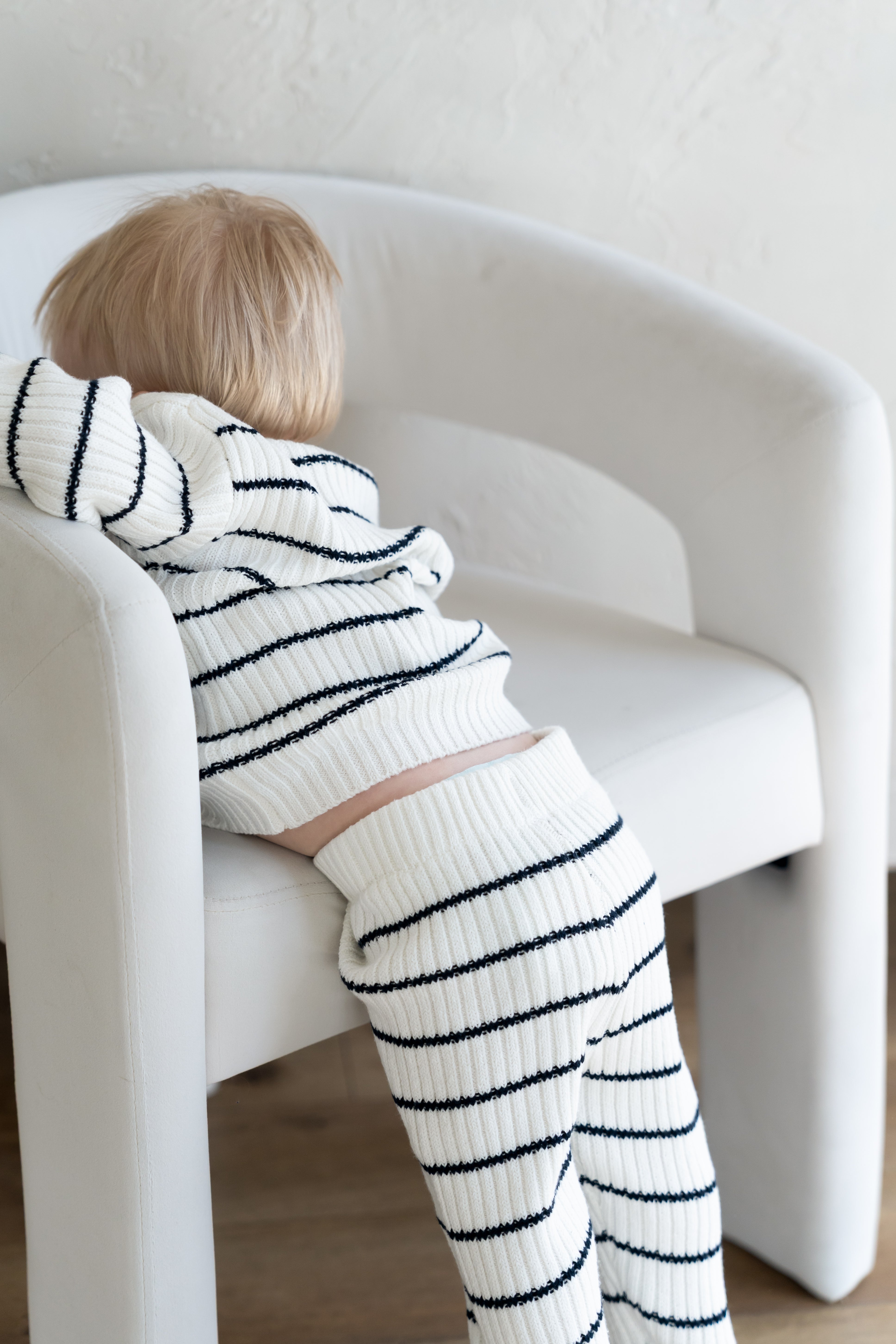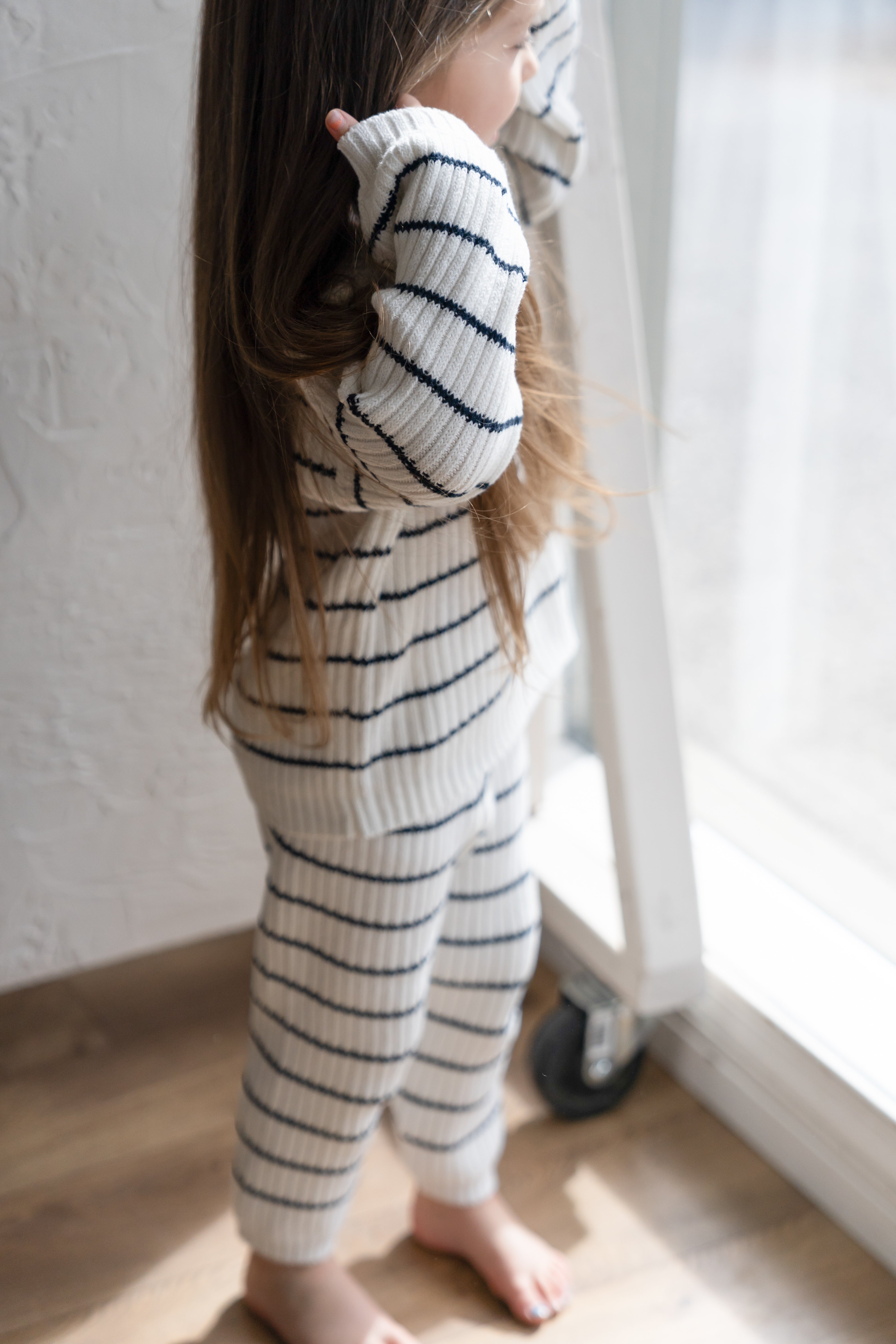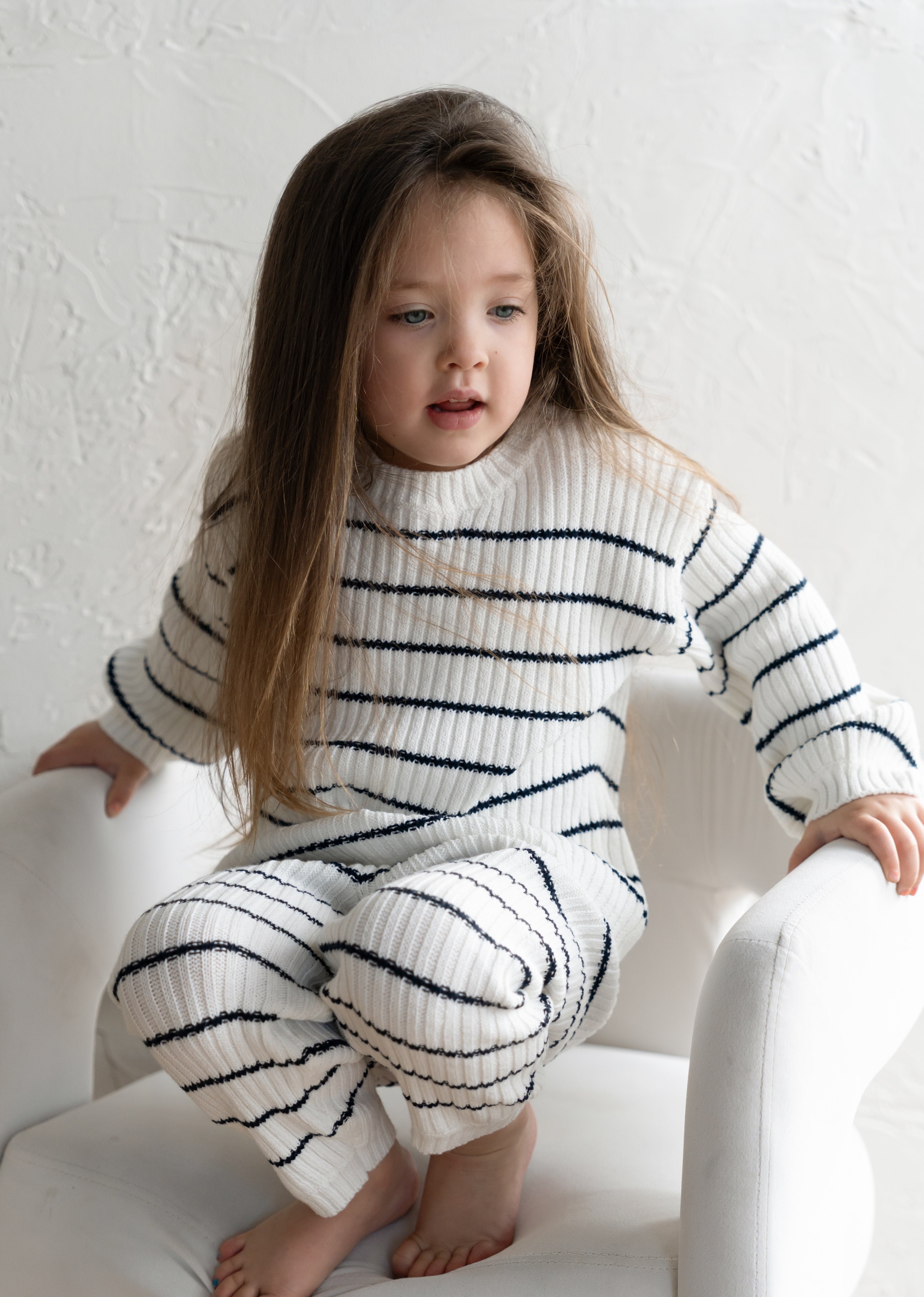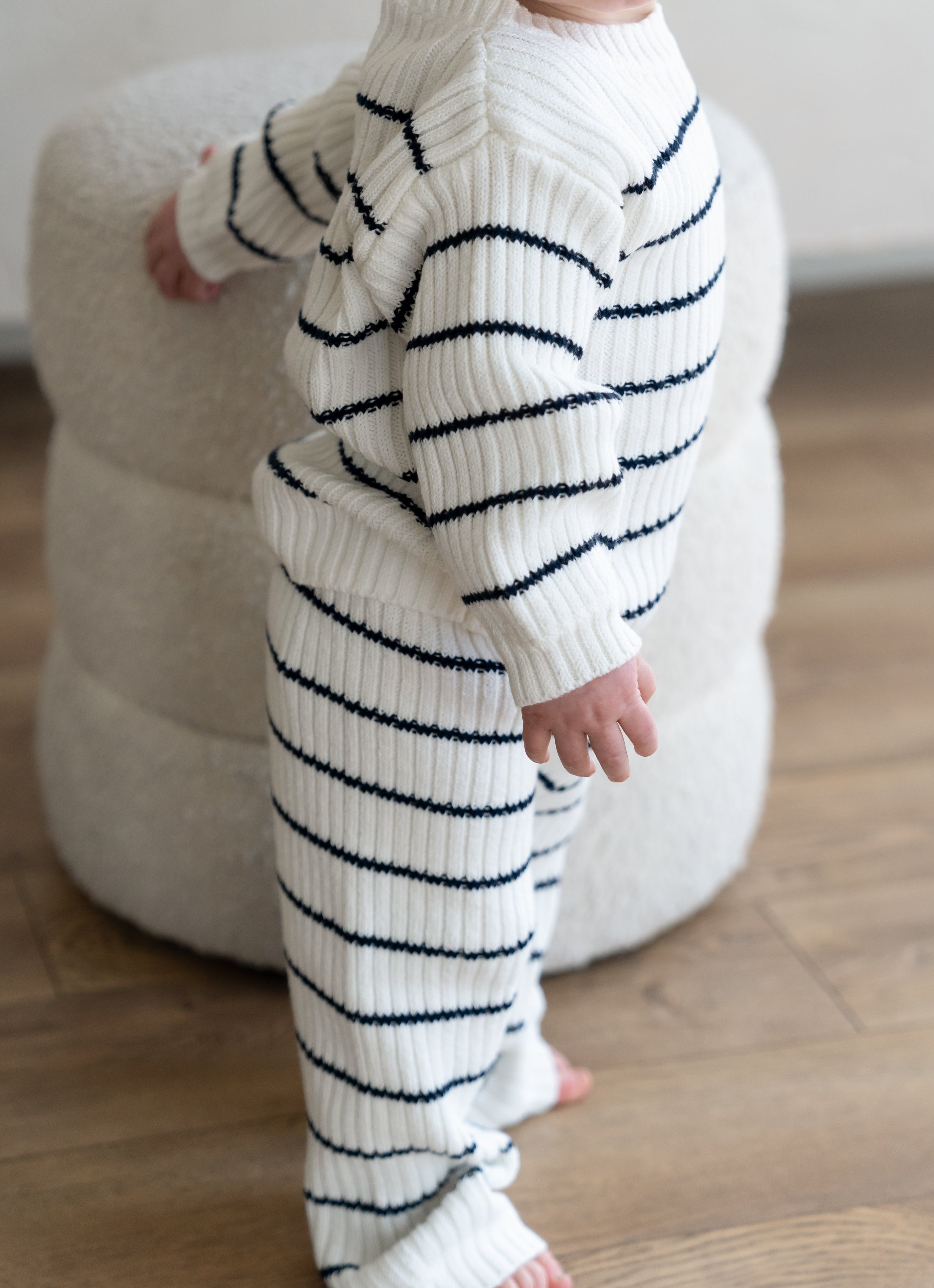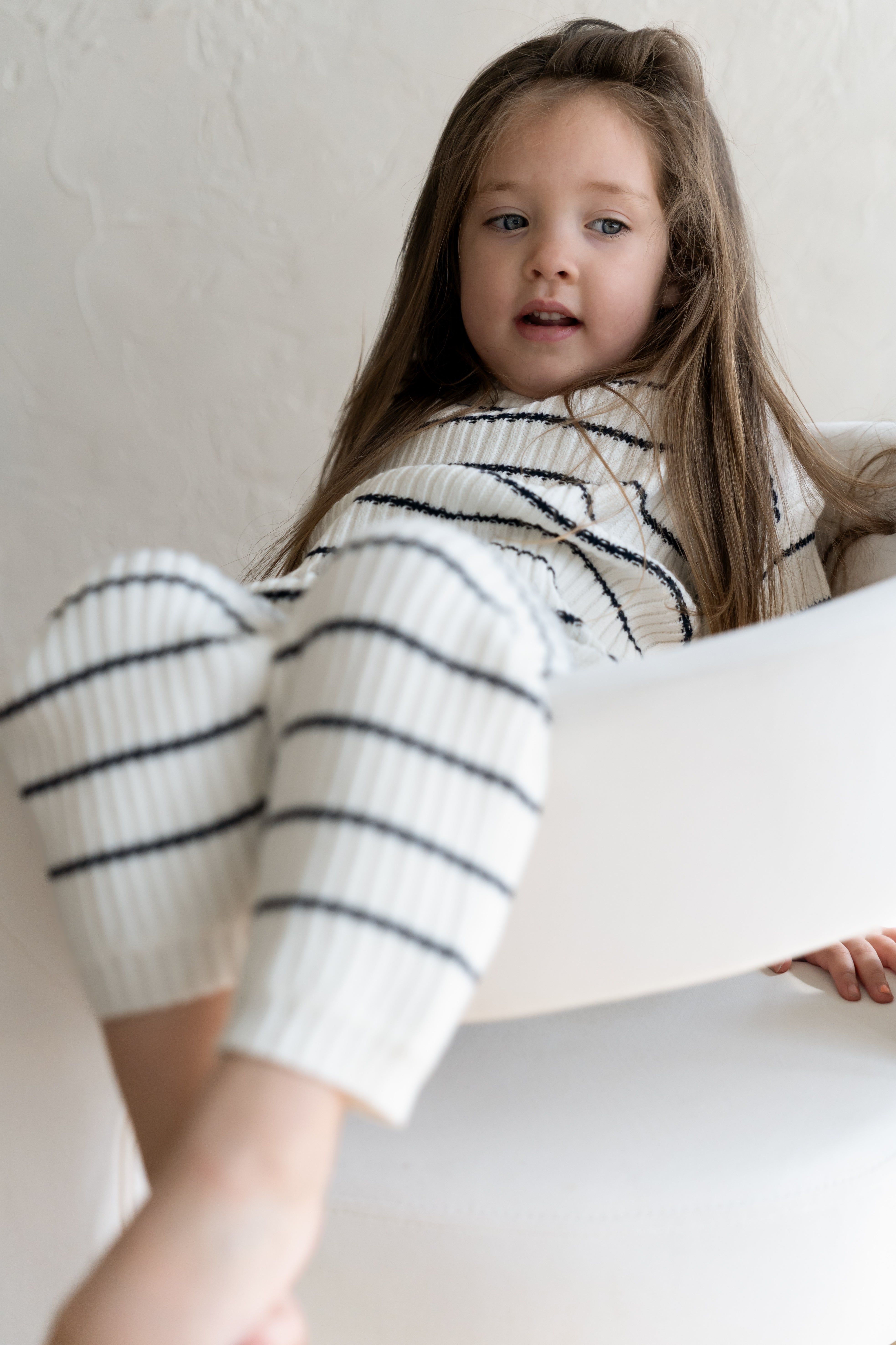 This deep Navy Blue and Off White striped ribbed pant was made with a timeless look and a luxury fit. With a wide elastic waistband and fitted leg cuffs, these pants were made with your child’s comfort in mind. Pair with their favorite sweater or the matching striped ribbed sweater for the complete knit set. Style meets durability with these minimalistic ribbed pants.