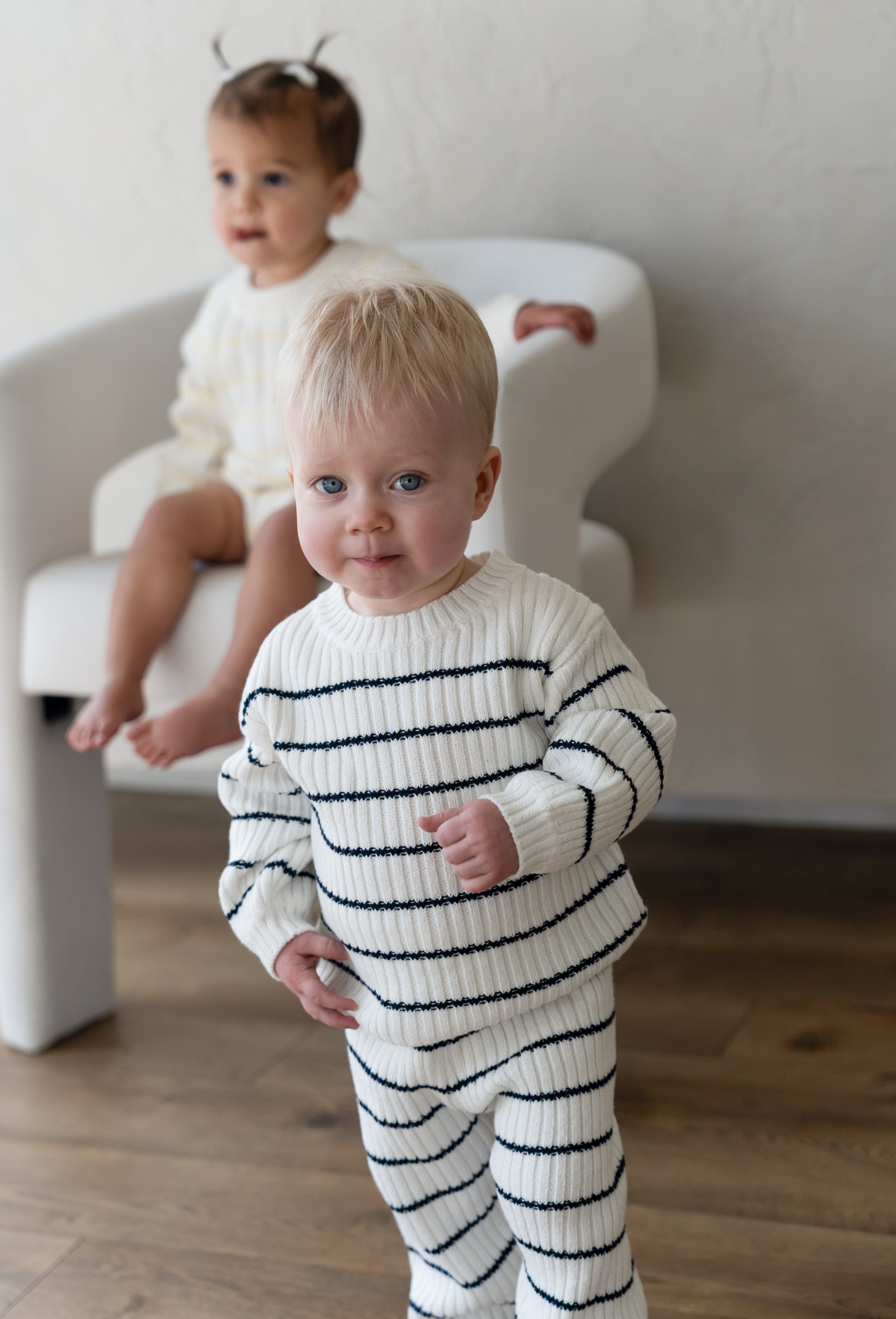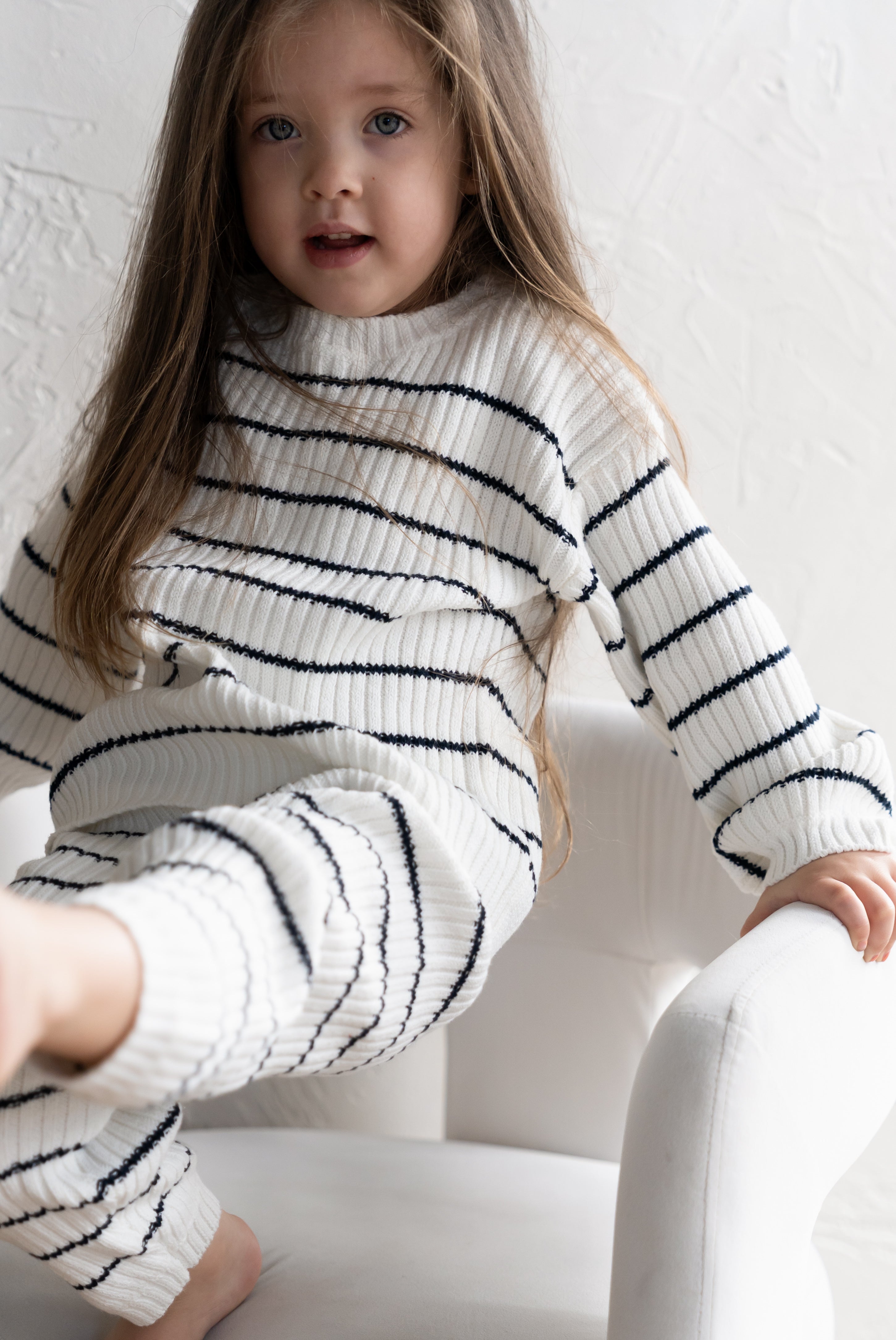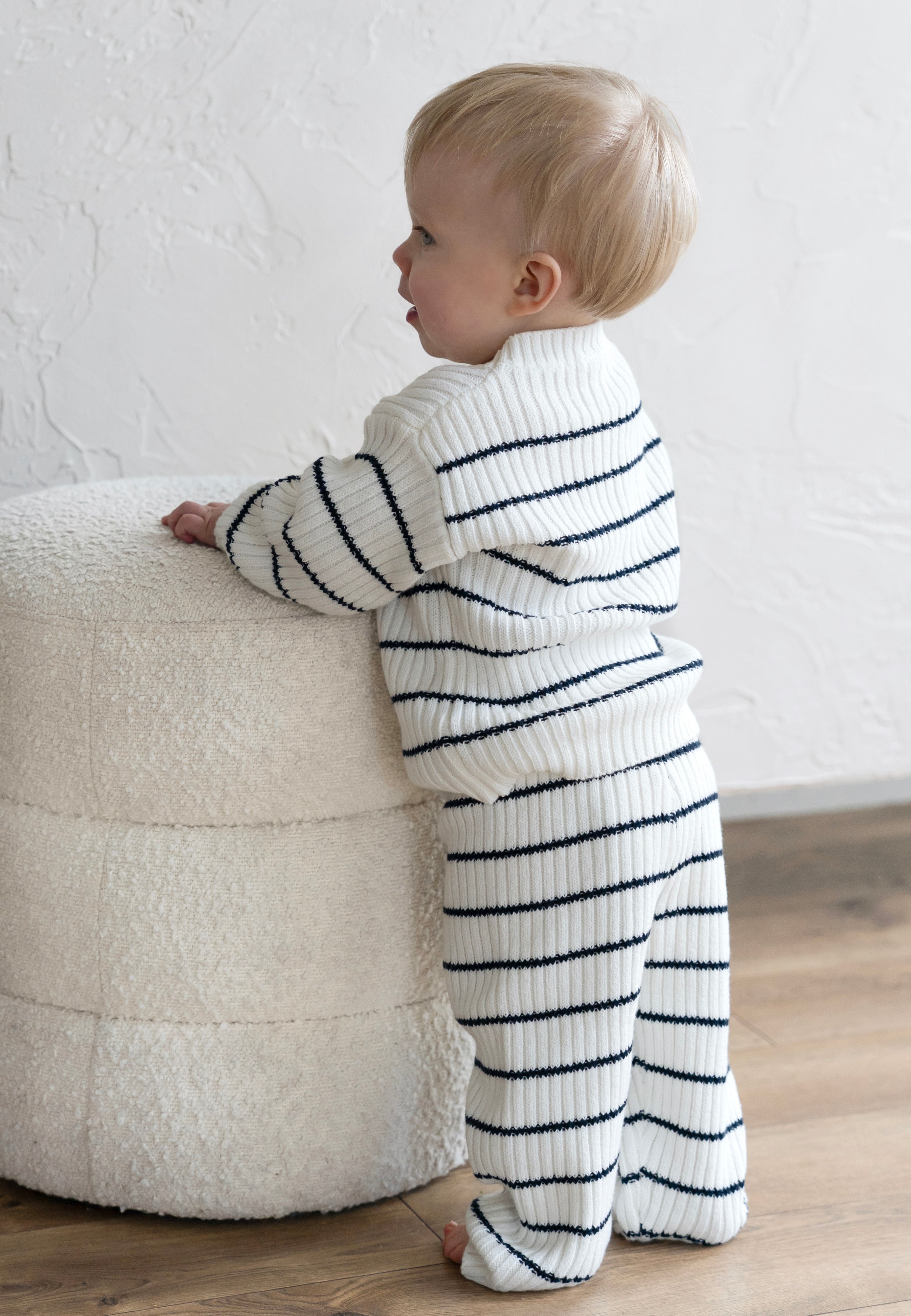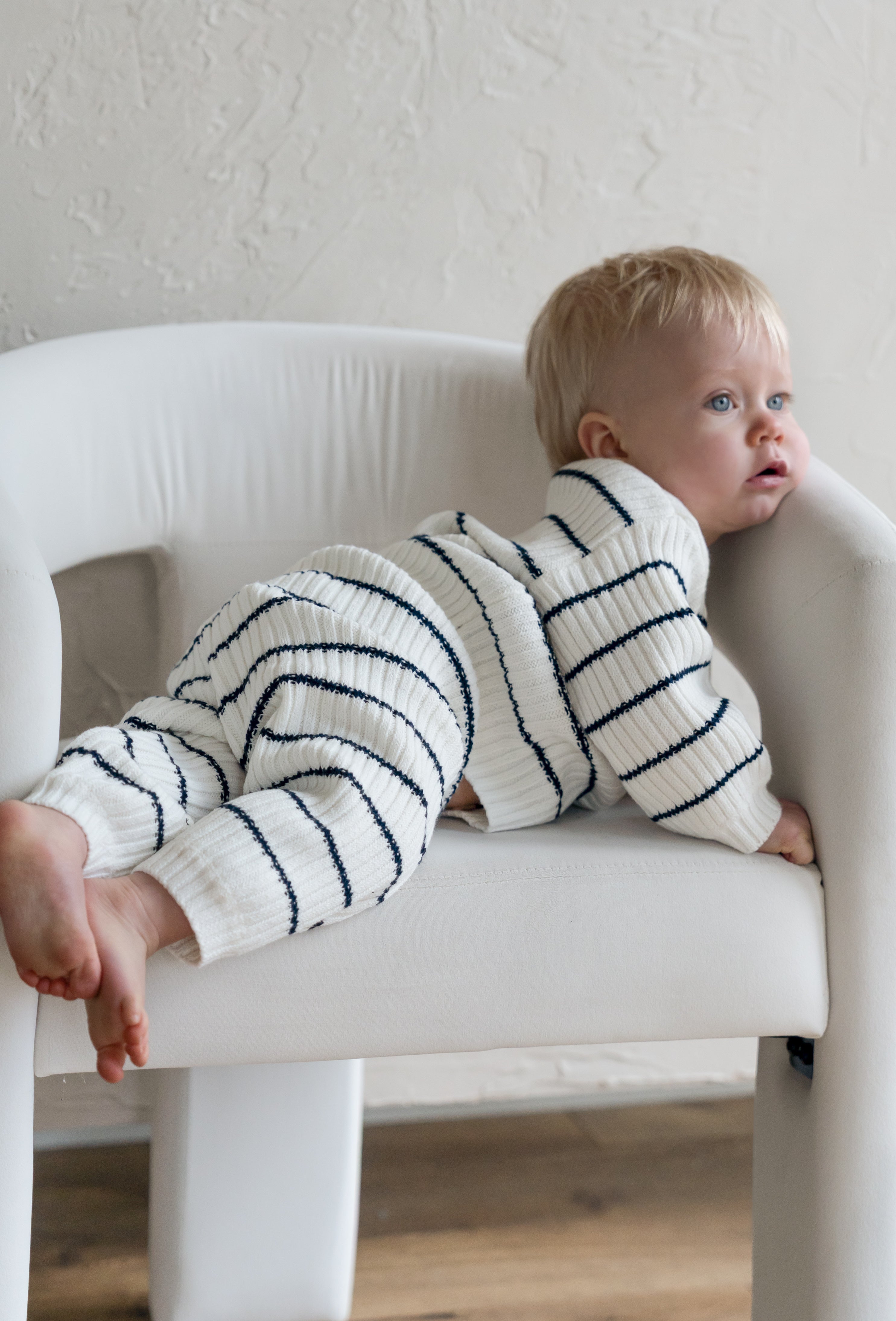 This deep Navy Blue and Off White striped ribbed pant was made with a timeless look and a luxury fit. With a wide elastic waistband and fitted leg cuffs, these pants were made with your child’s comfort in mind. Pair with their favorite sweater or the matching striped ribbed sweater for the complete knit set. Style meets durability with these minimalistic ribbed pants.