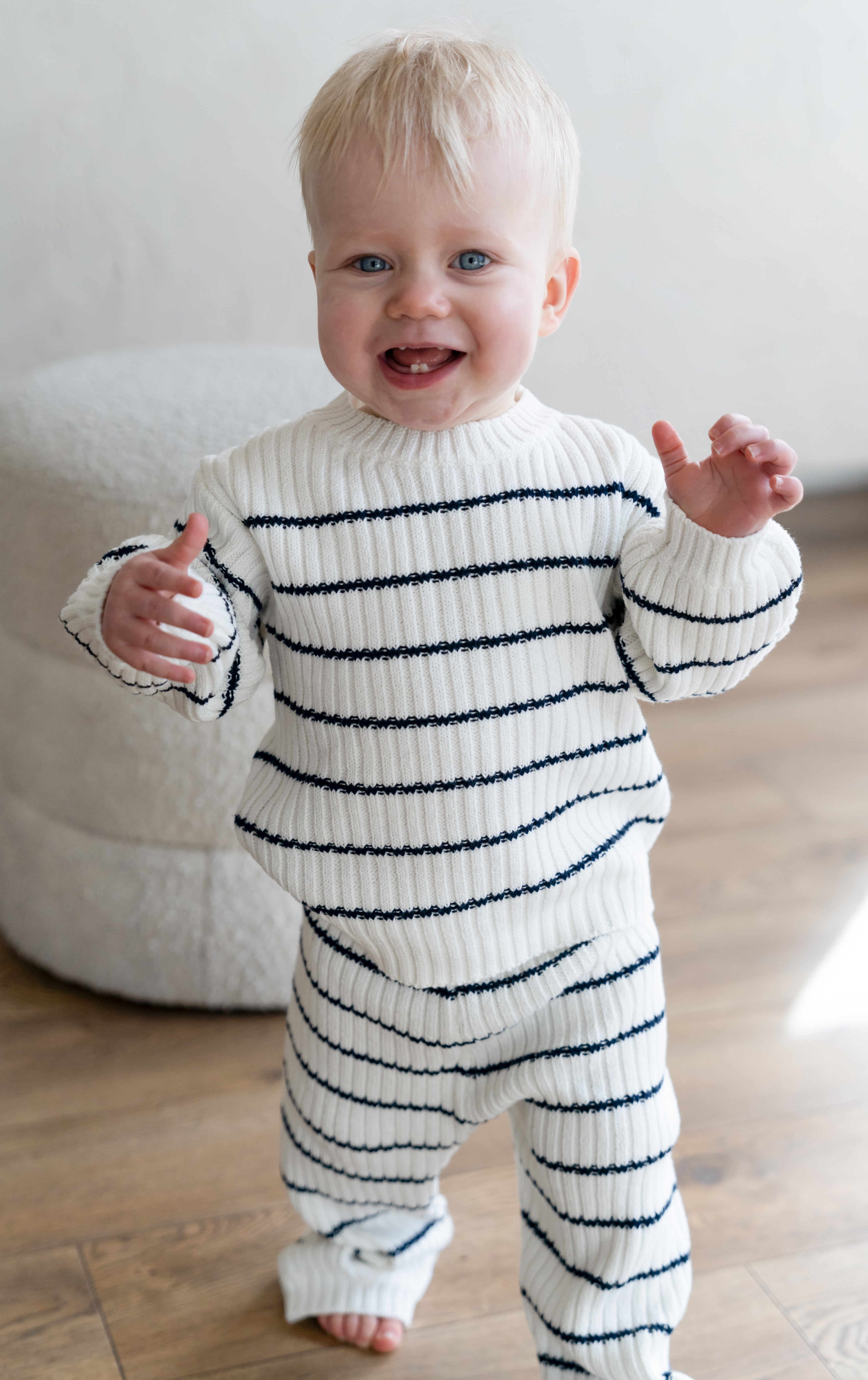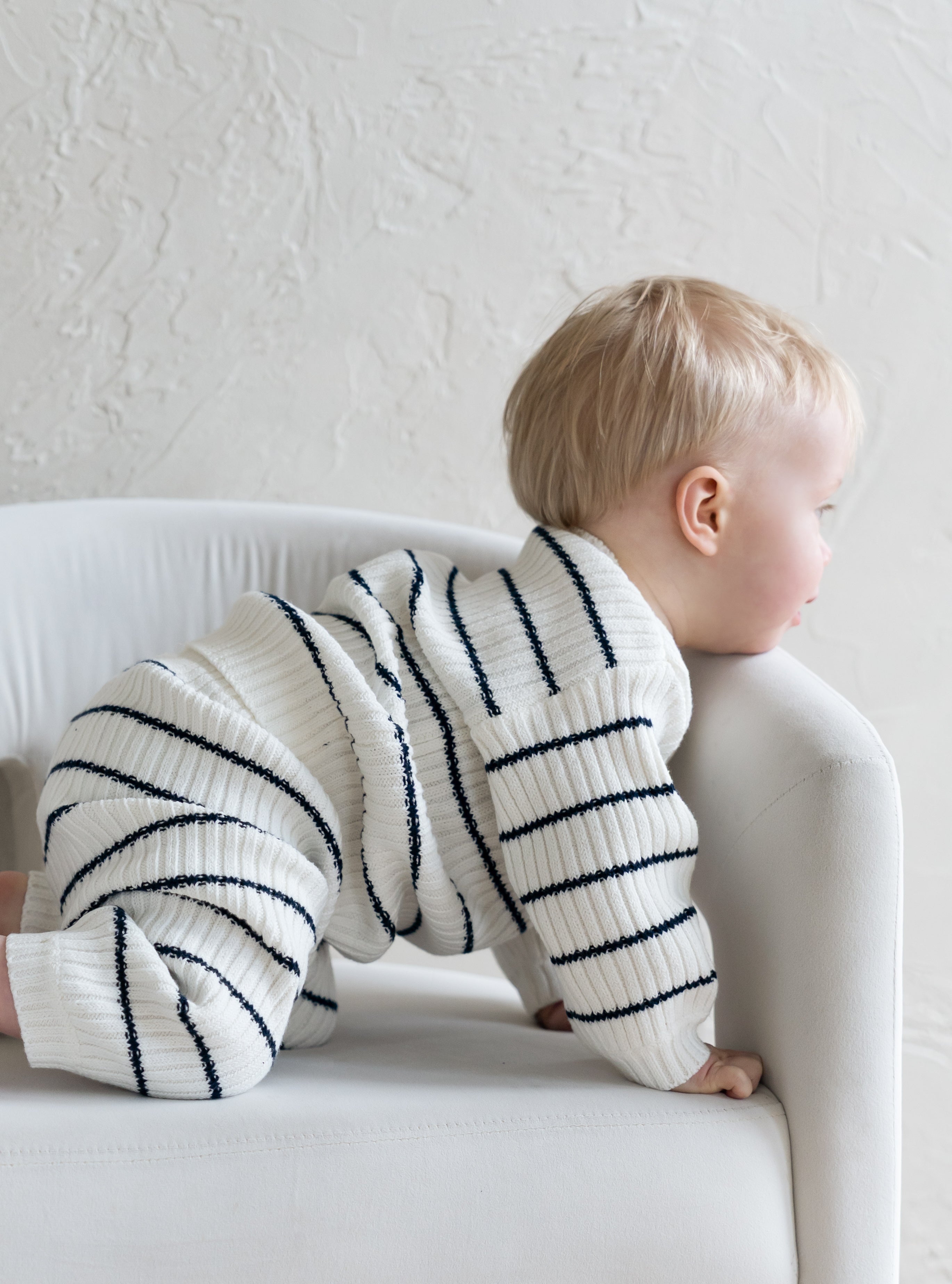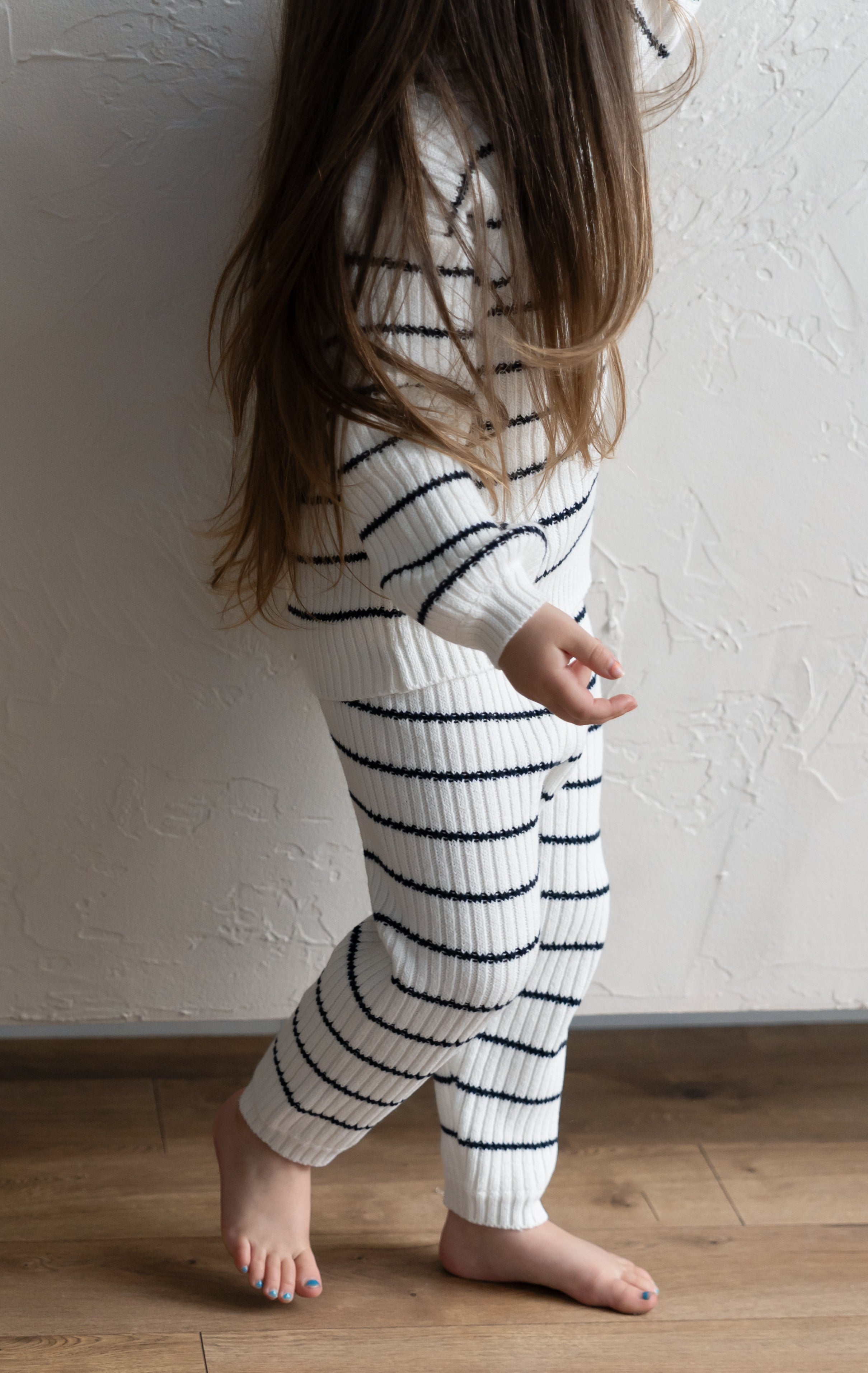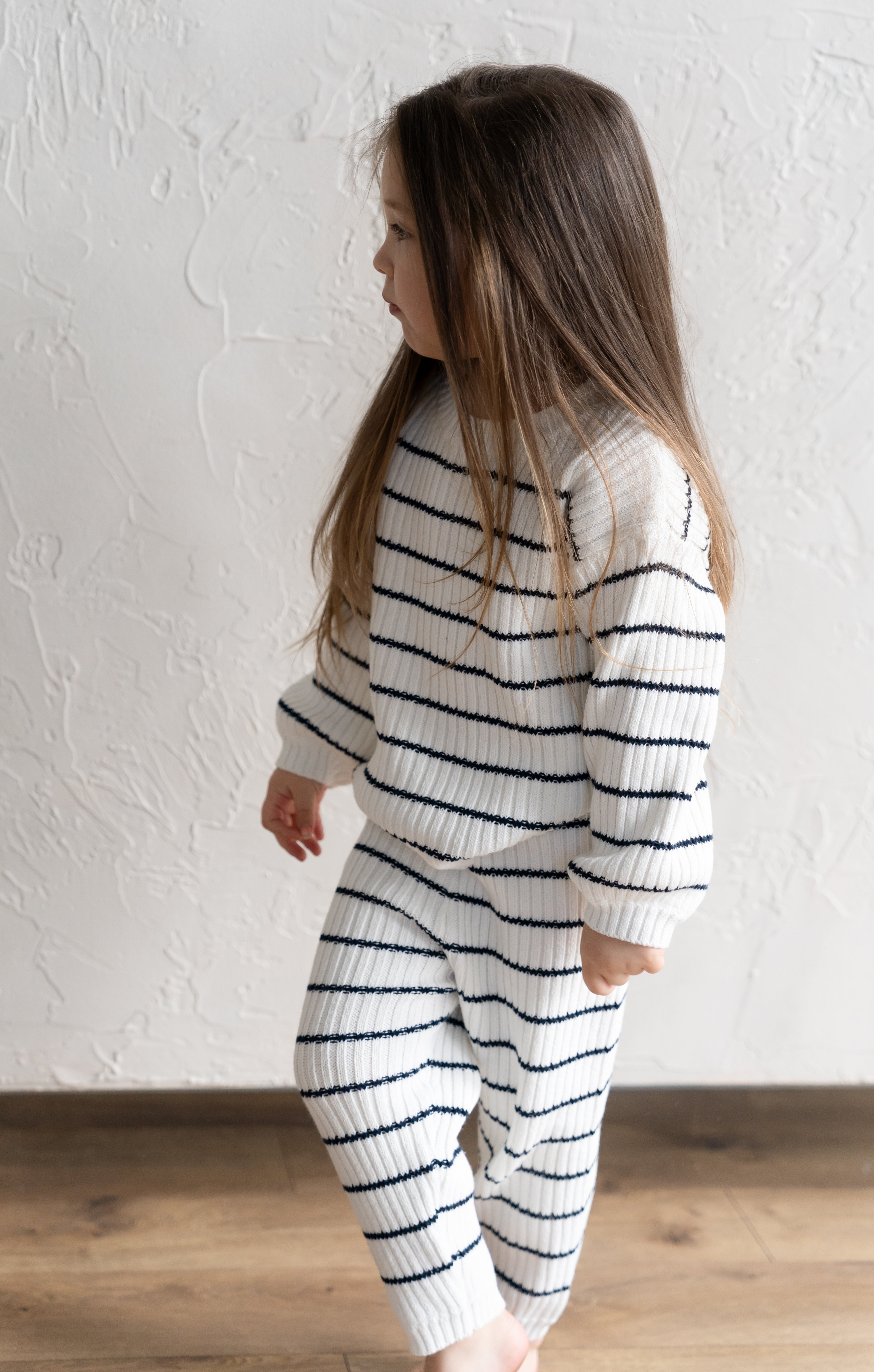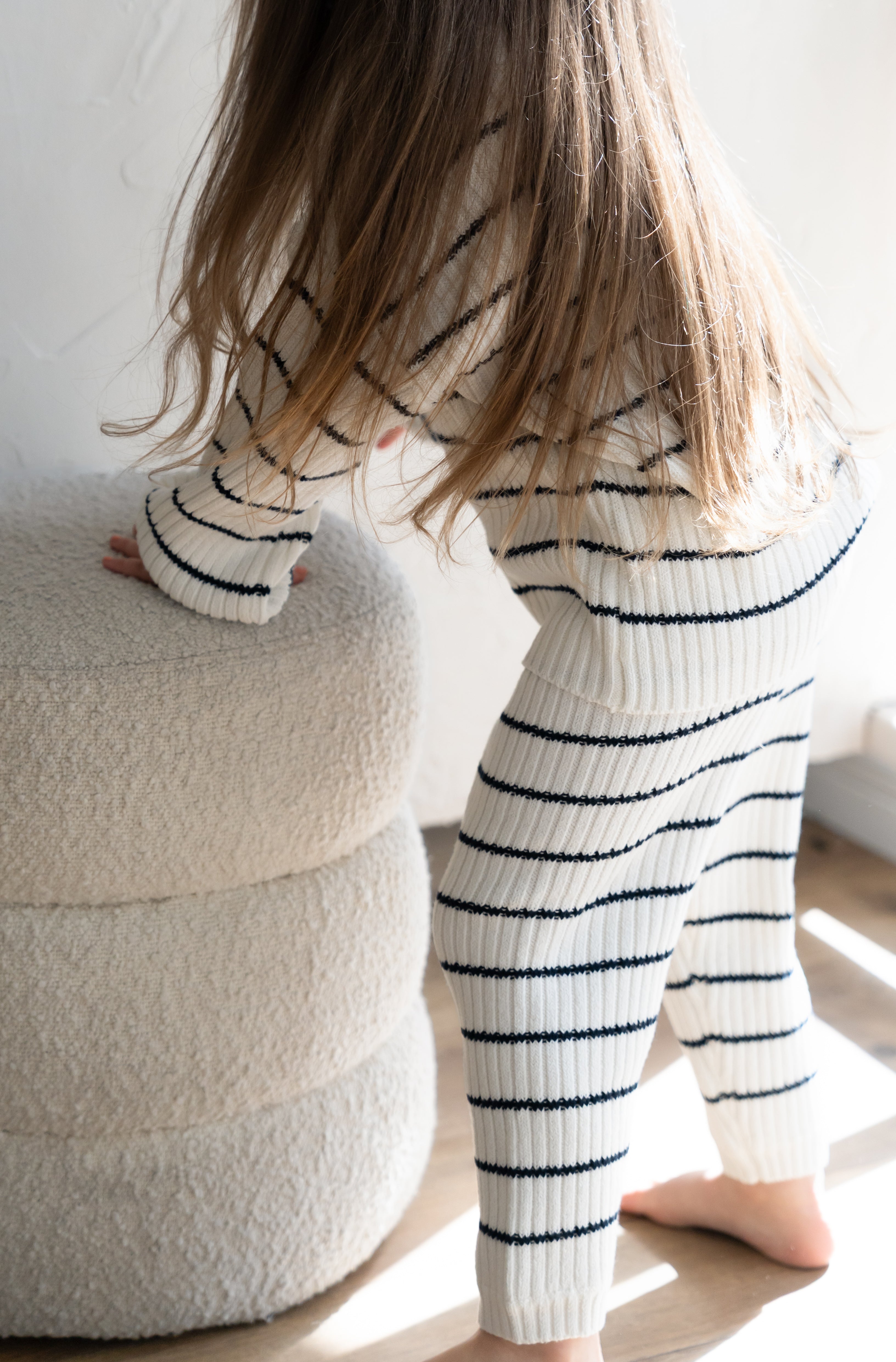 This deep Navy Blue and Off White striped ribbed pant was made with a timeless look and a luxury fit. With a wide elastic waistband and fitted leg cuffs, these pants were made with your child’s comfort in mind. Pair with their favorite sweater or the matching striped ribbed sweater for the complete knit set. Style meets durability with these minimalistic ribbed pants.