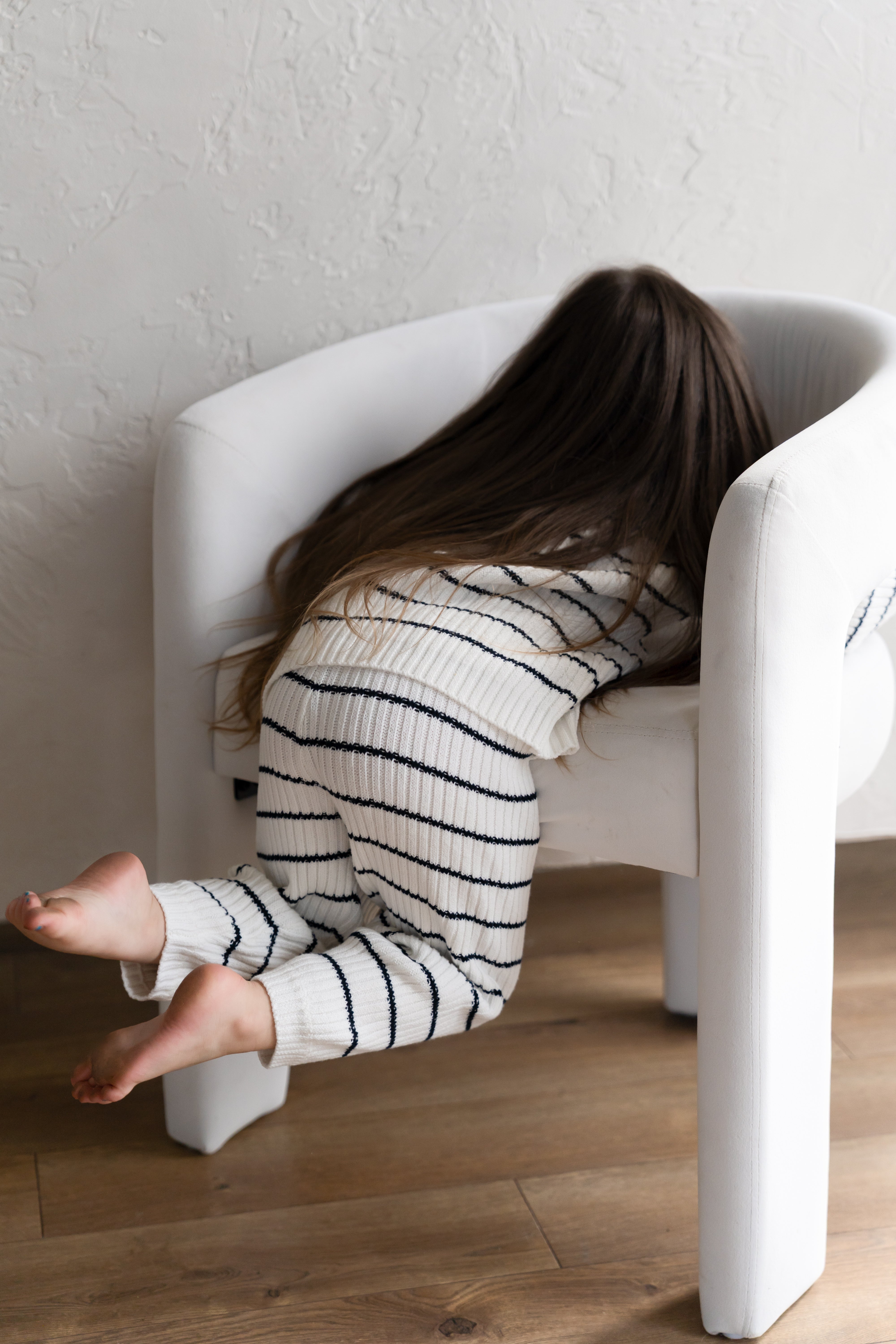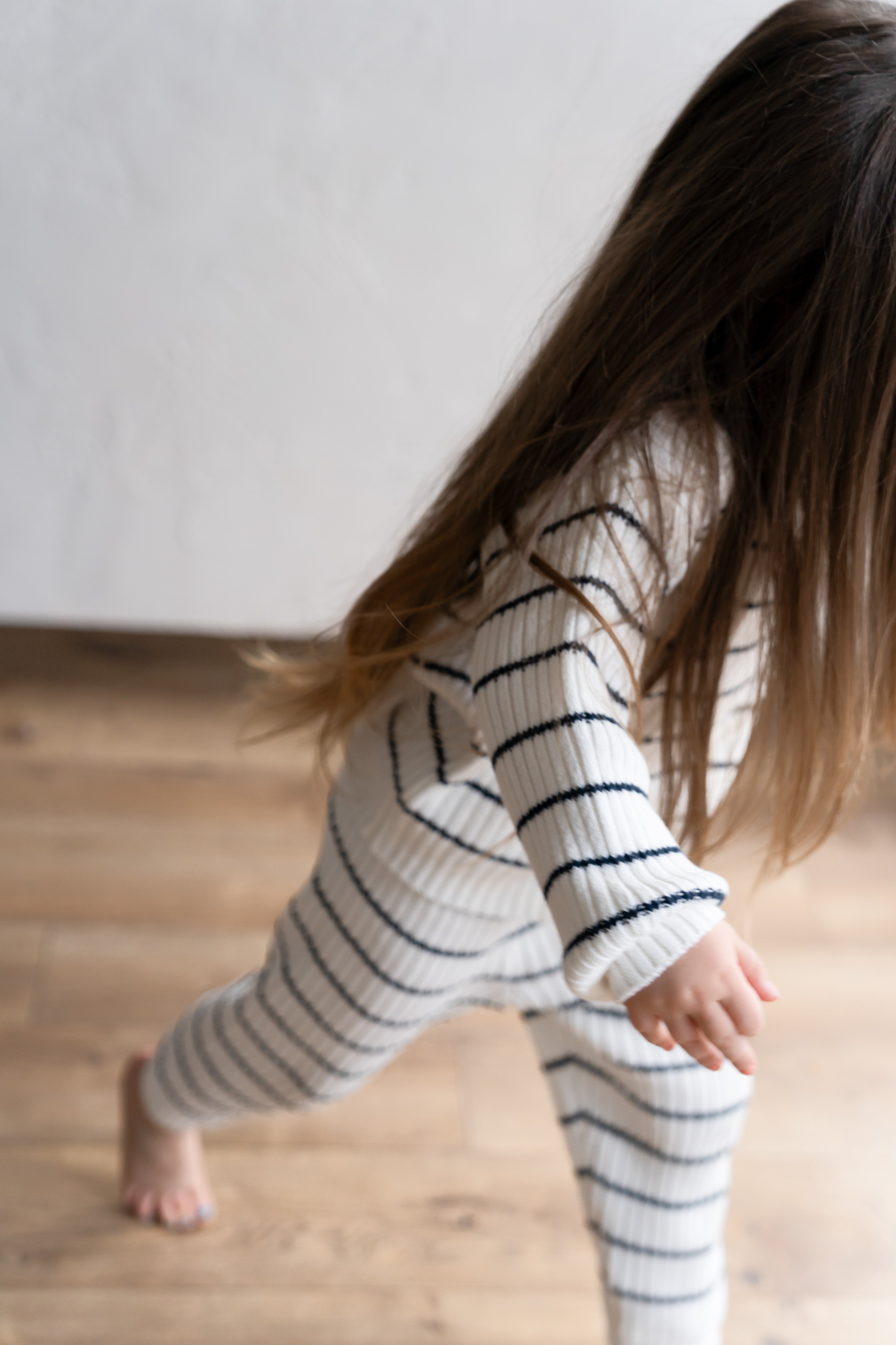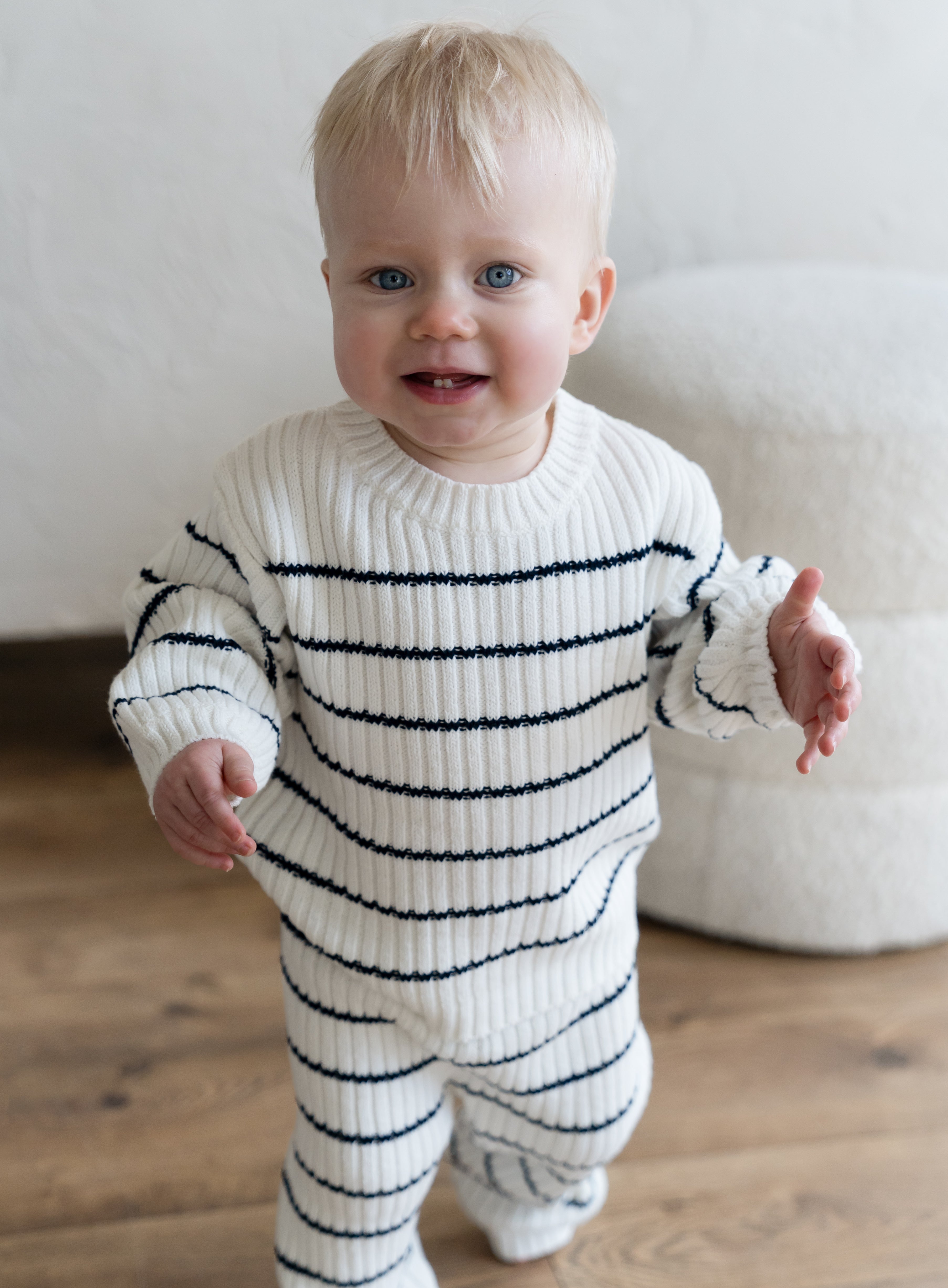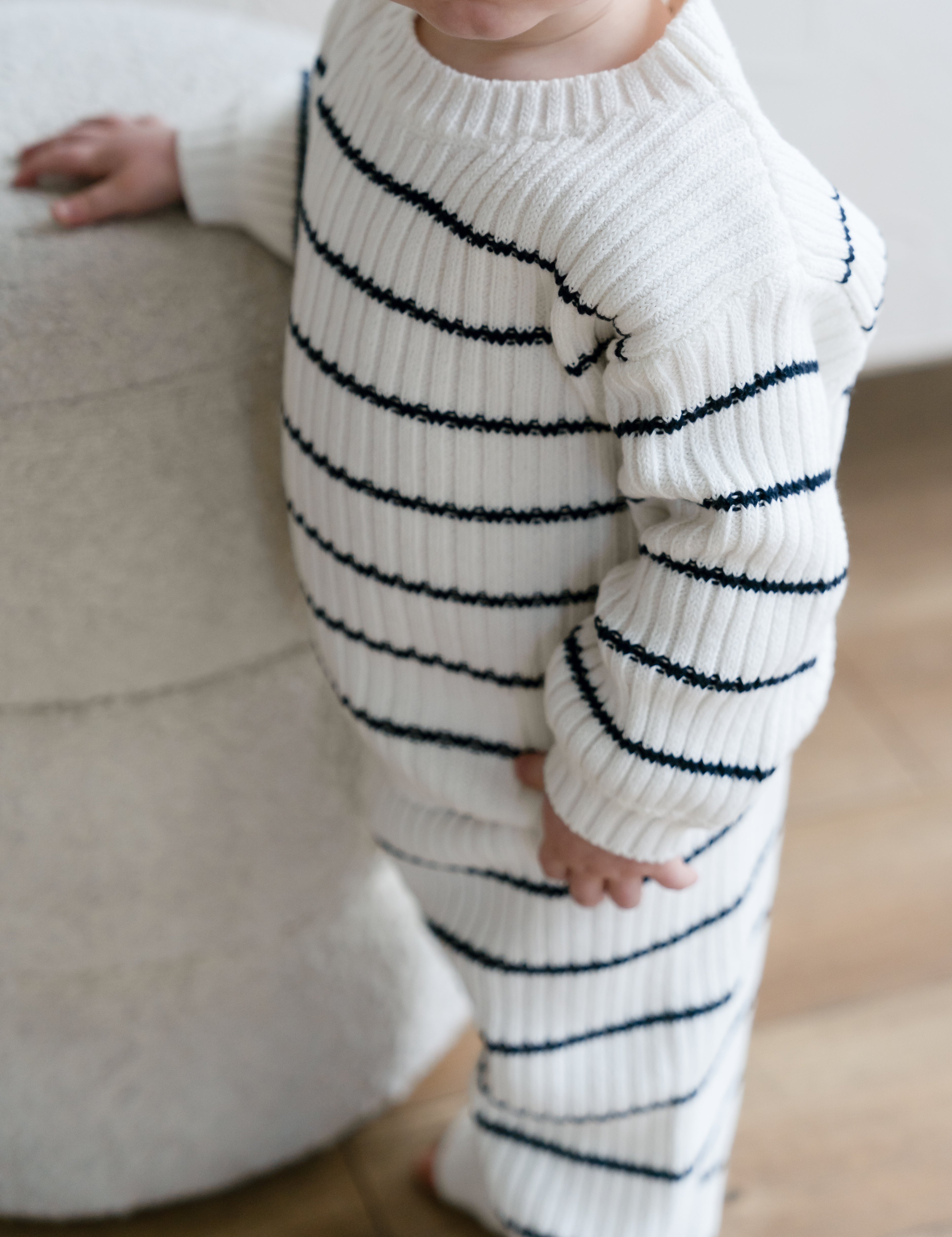 This deep Navy Blue and Off White striped ribbed pant was made with a timeless look and a luxury fit. With a wide elastic waistband and fitted leg cuffs, these pants were made with your child’s comfort in mind. Pair with their favorite sweater or the matching striped ribbed sweater for the complete knit set. Style meets durability with these minimalistic ribbed pants.