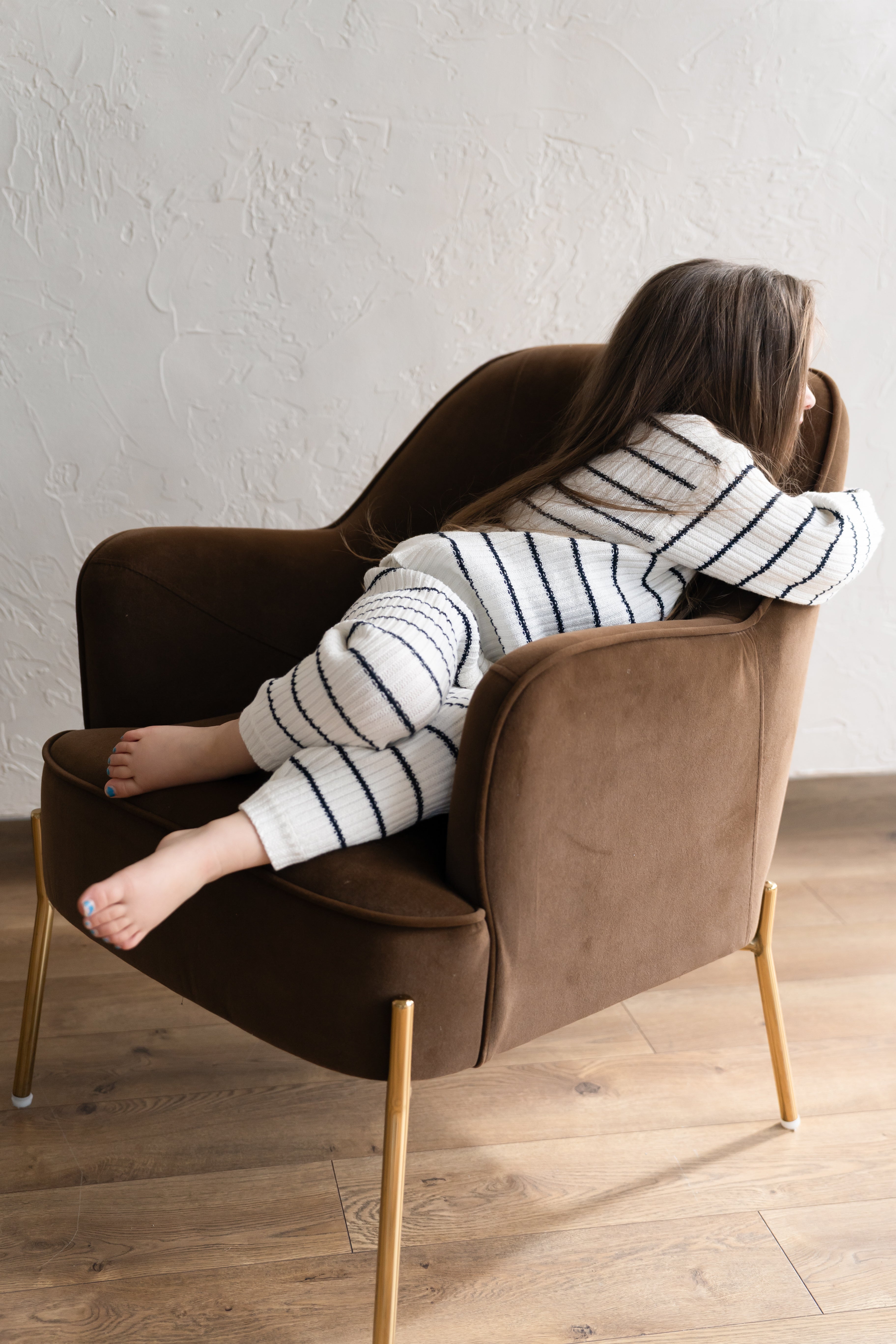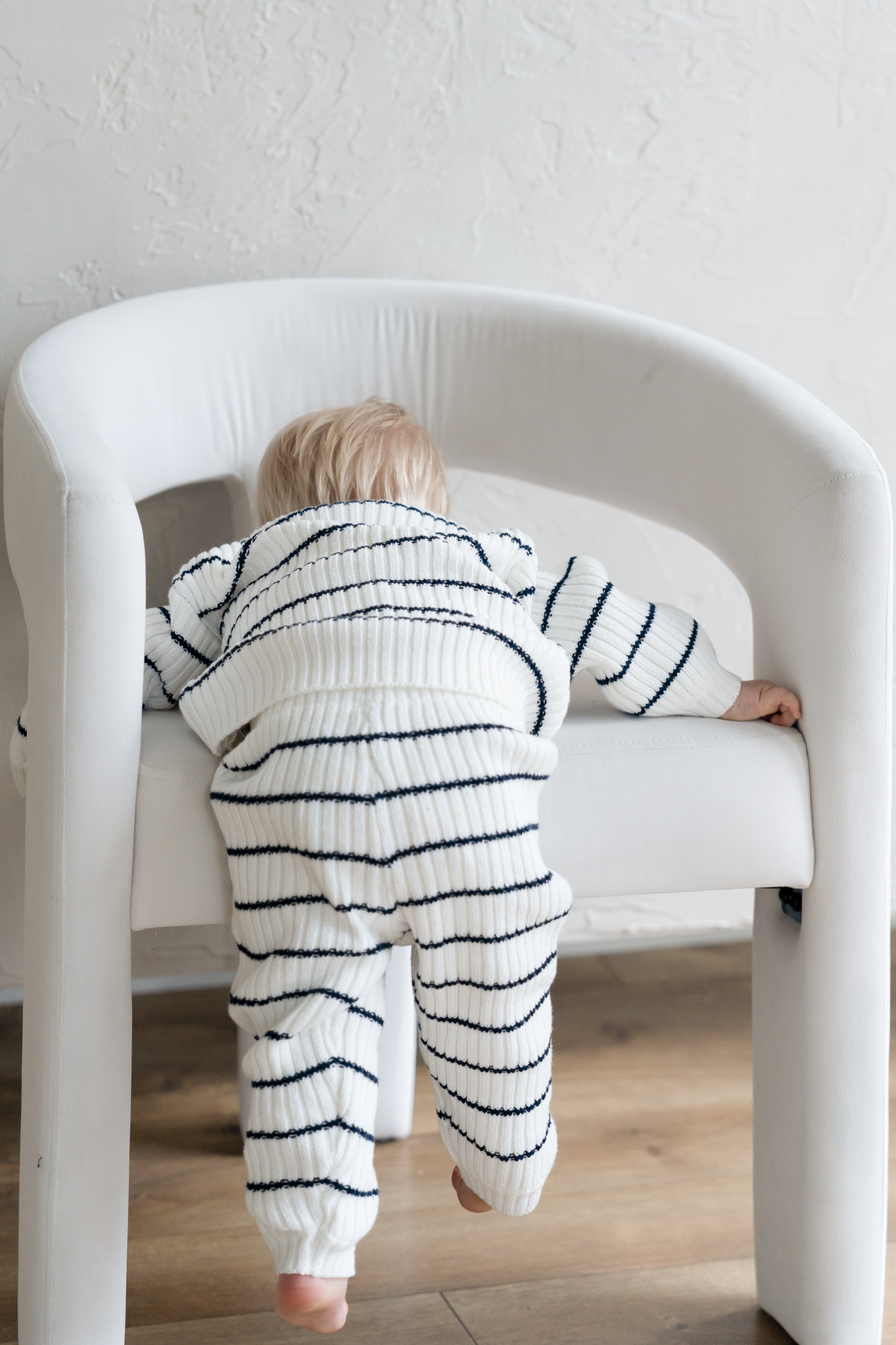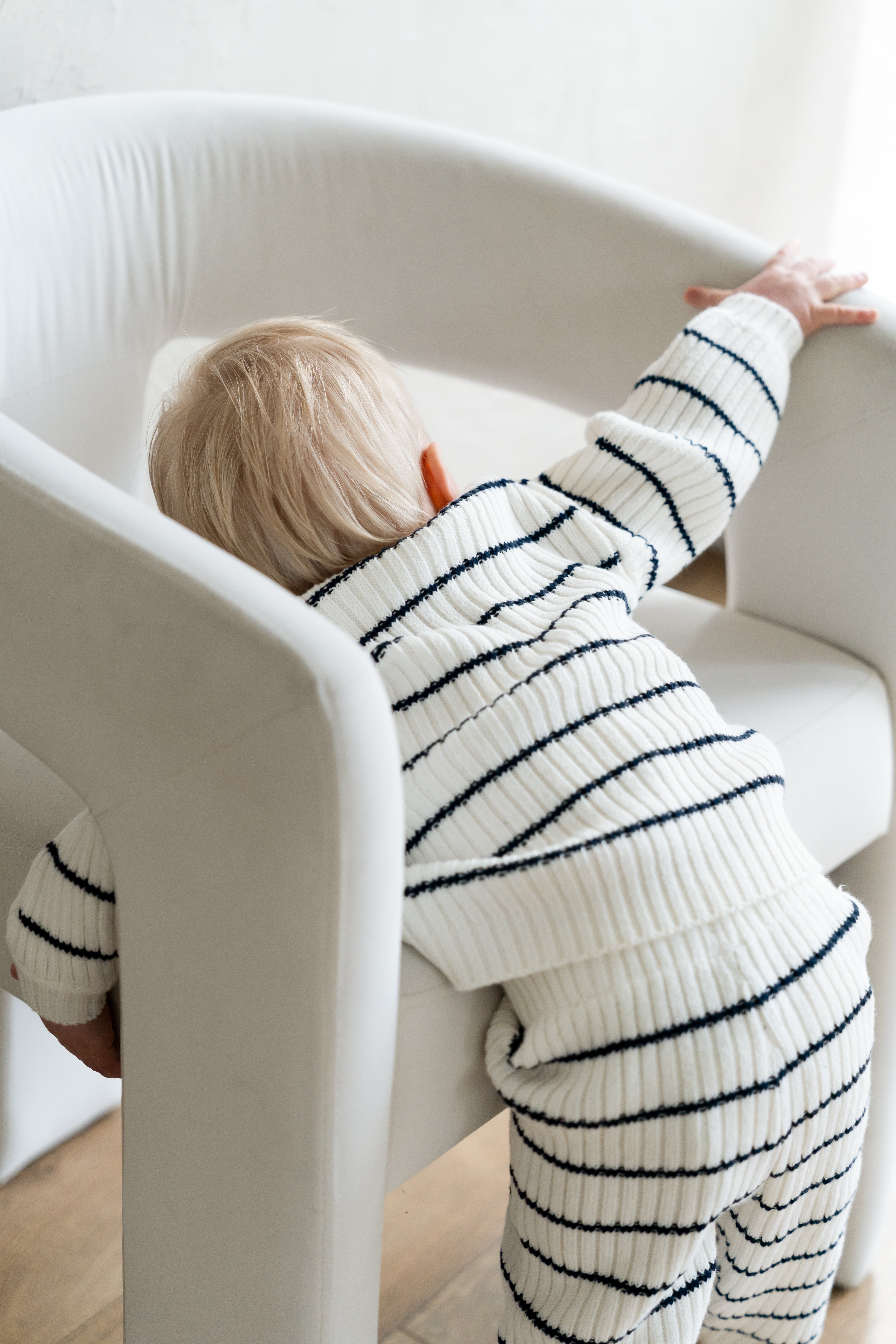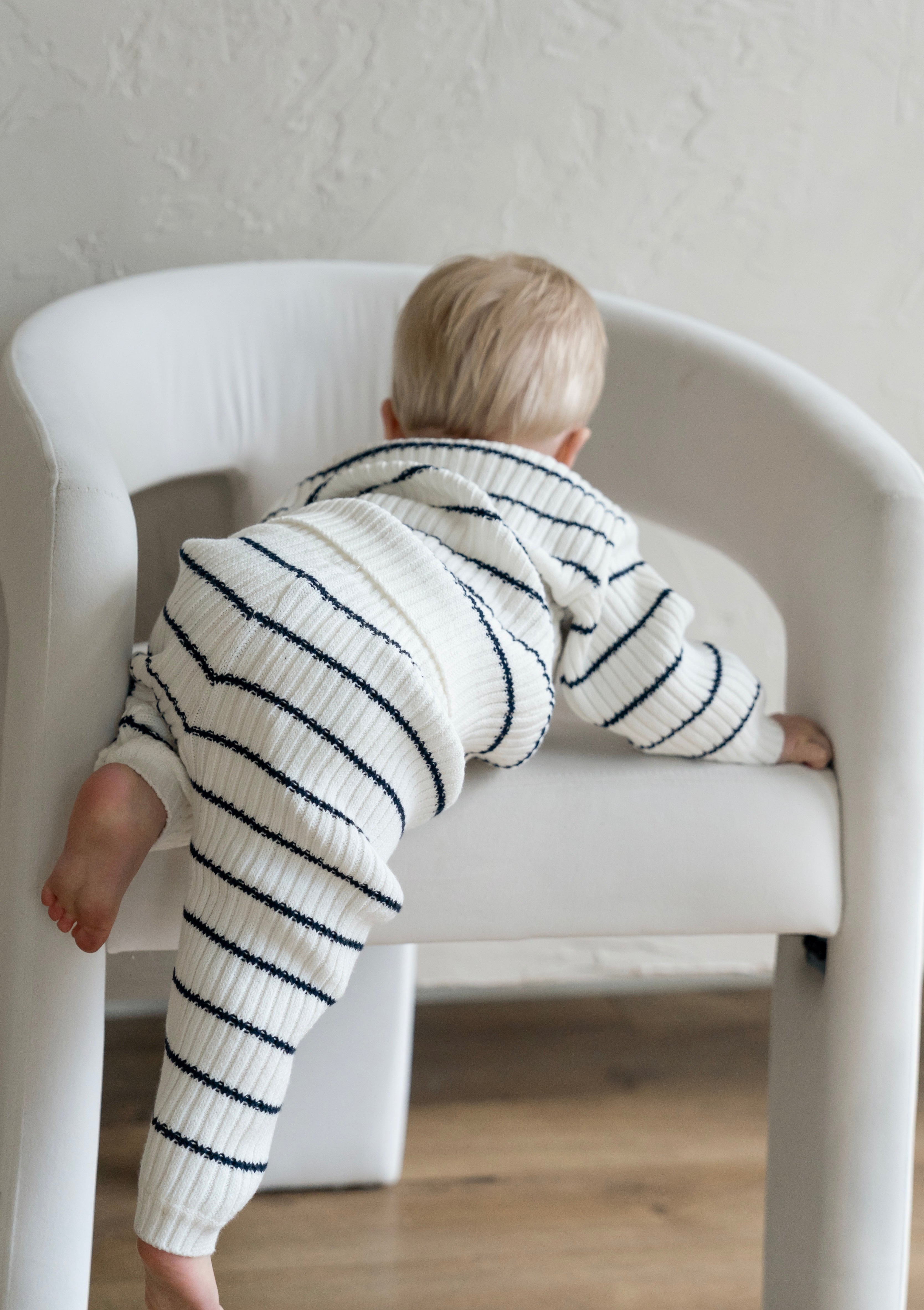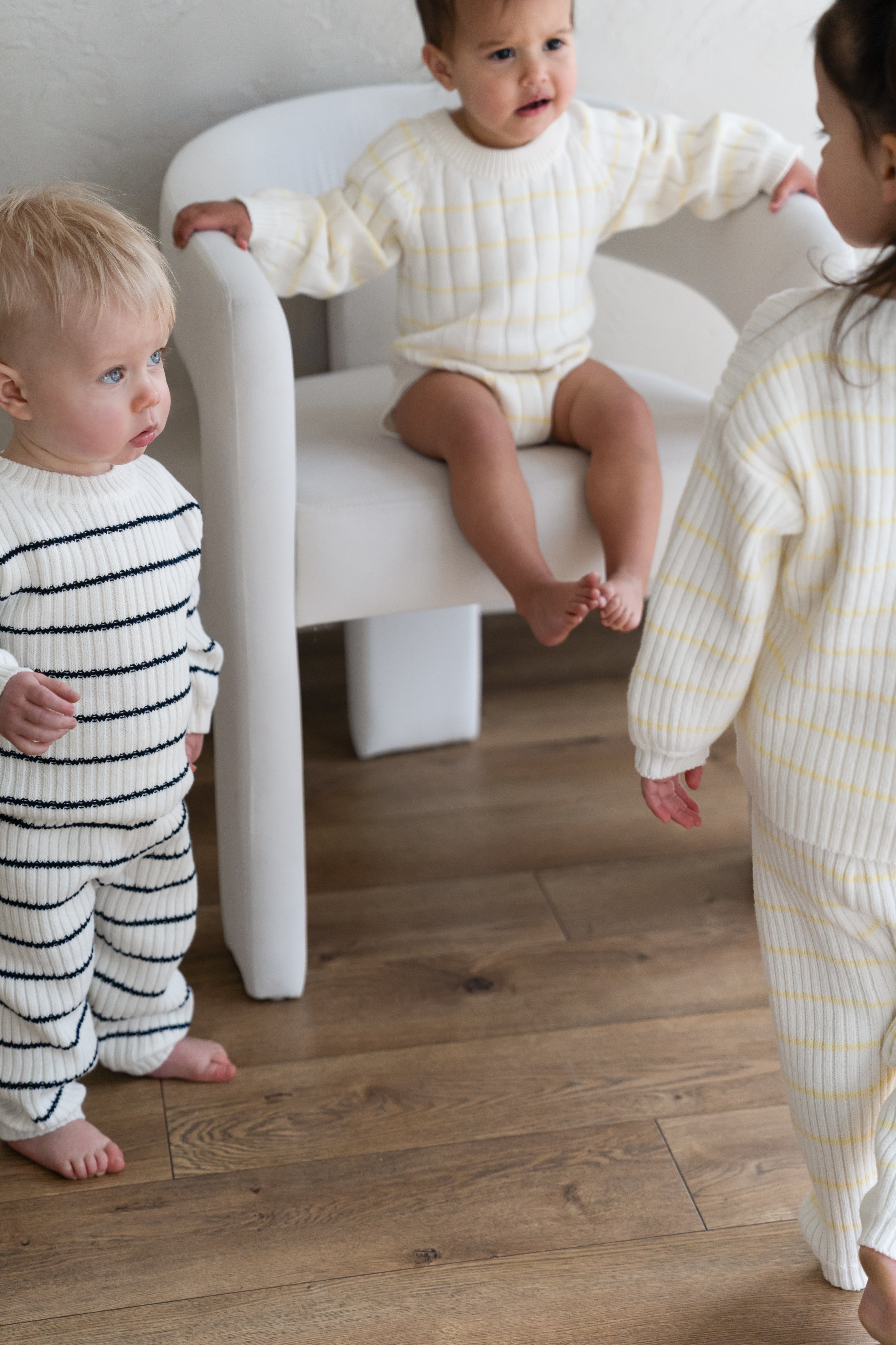 This deep Navy Blue and Off White striped ribbed pant was made with a timeless look and a luxury fit. With a wide elastic waistband and fitted leg cuffs, these pants were made with your child’s comfort in mind. Pair with their favorite sweater or the matching striped ribbed sweater for the complete knit set. Style meets durability with these minimalistic ribbed pants.