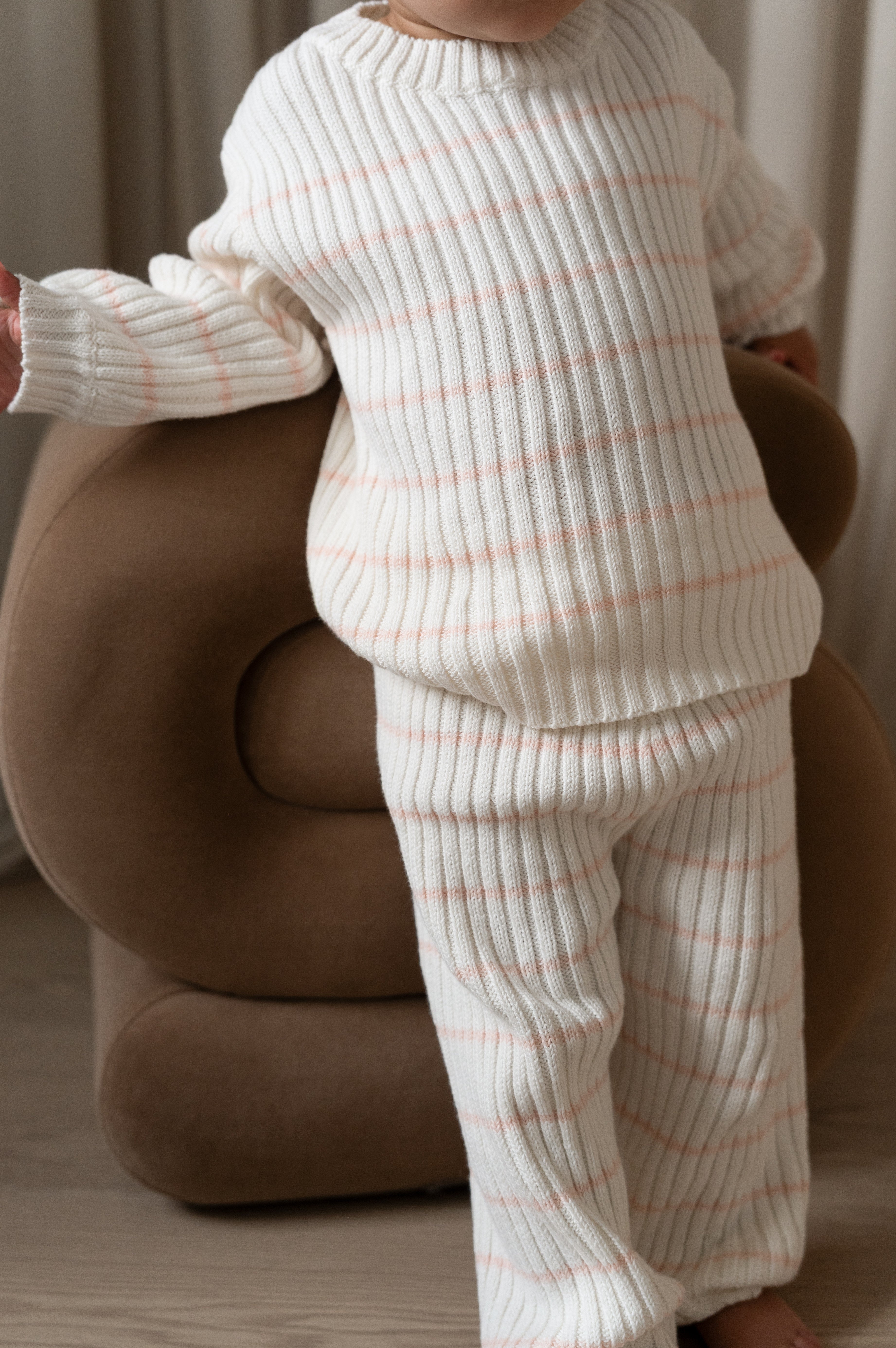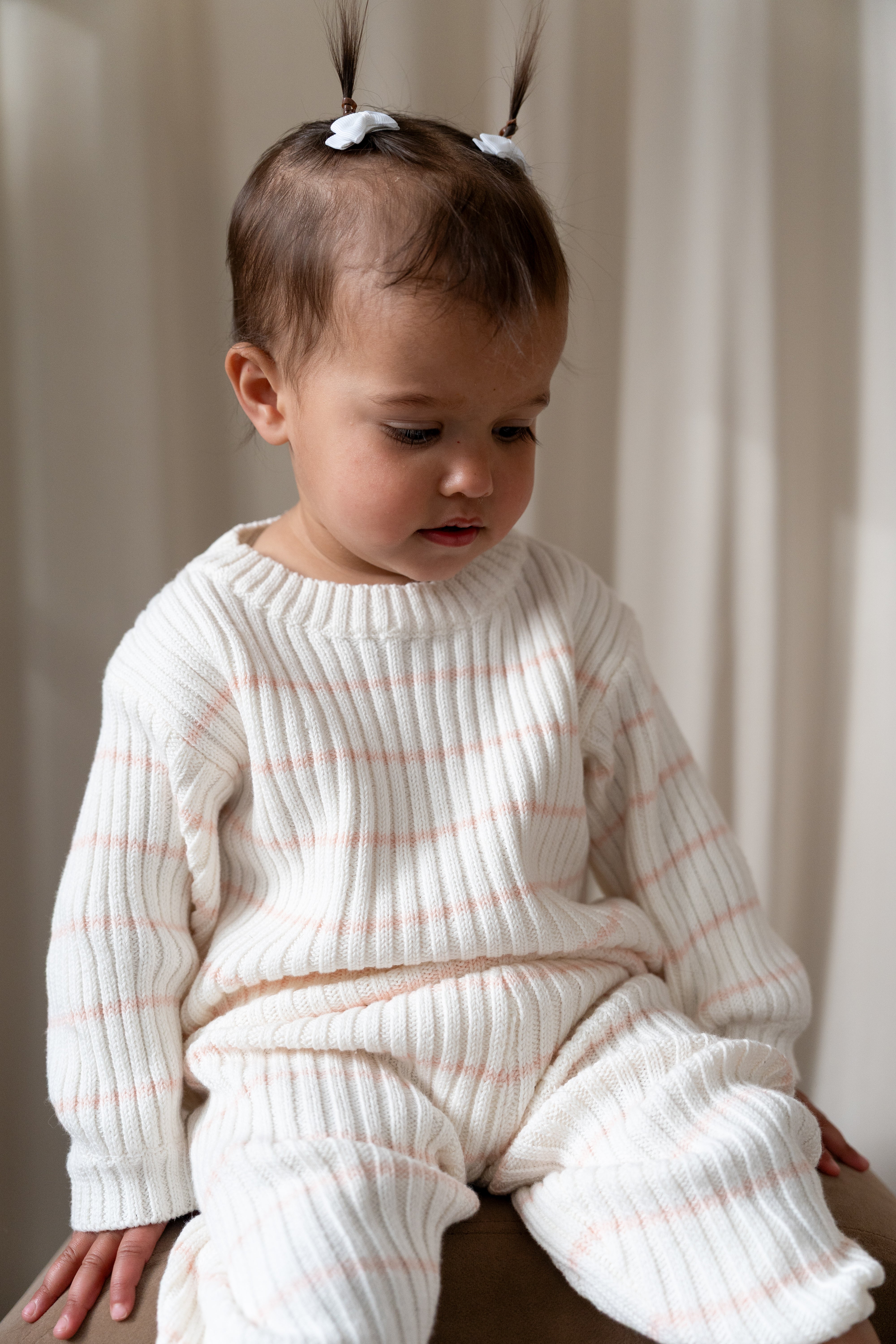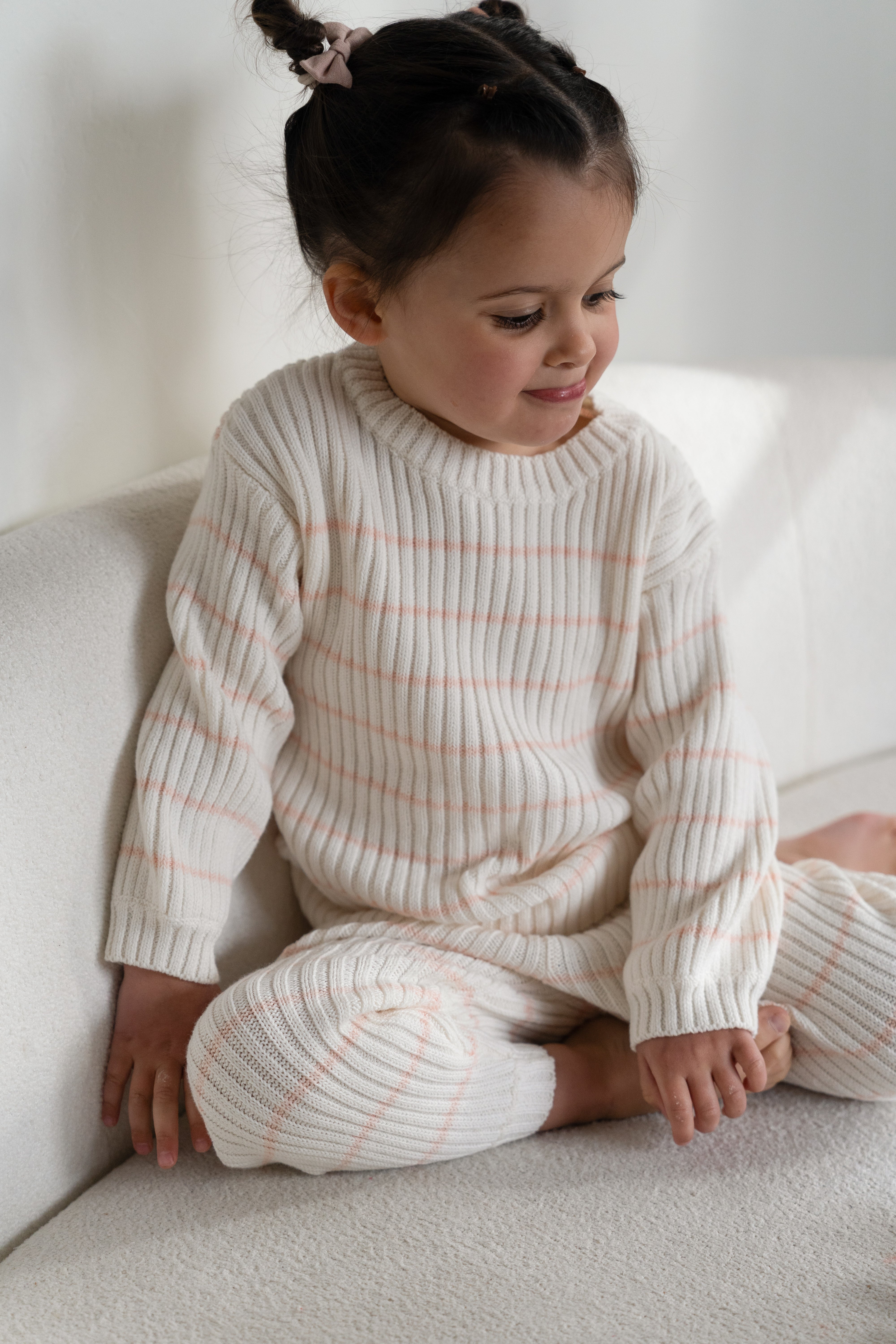 This Pale Pink and Off White striped ribbed pant was made with a timeless look and a luxury fit. With a wide elastic waistband and fitted leg cuffs, these pants were made with your child’s comfort in mind. Pair with their favorite sweater or the matching striped ribbed sweater for the complete knit set. Style meets durability with these minimalistic ribbed pants.