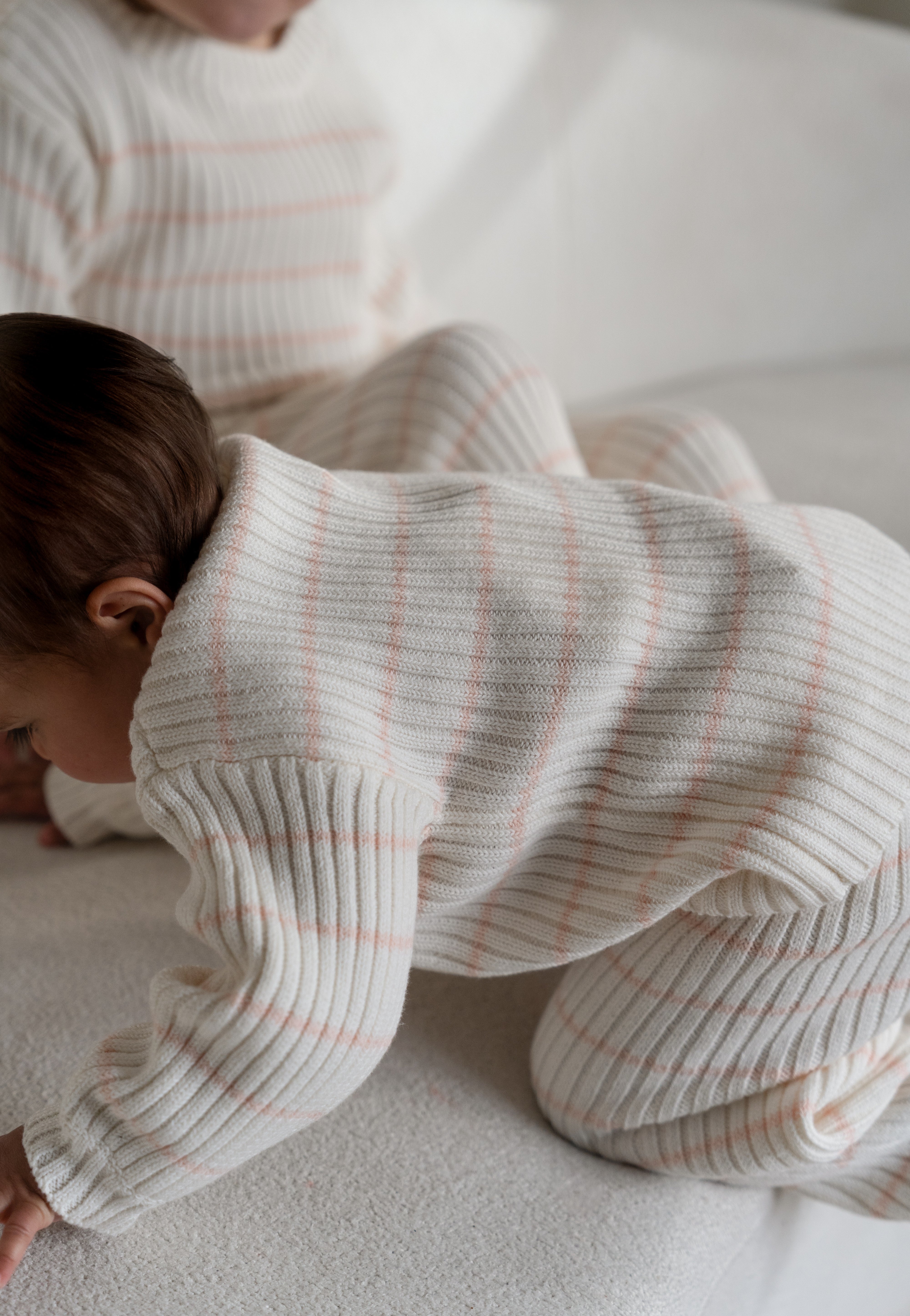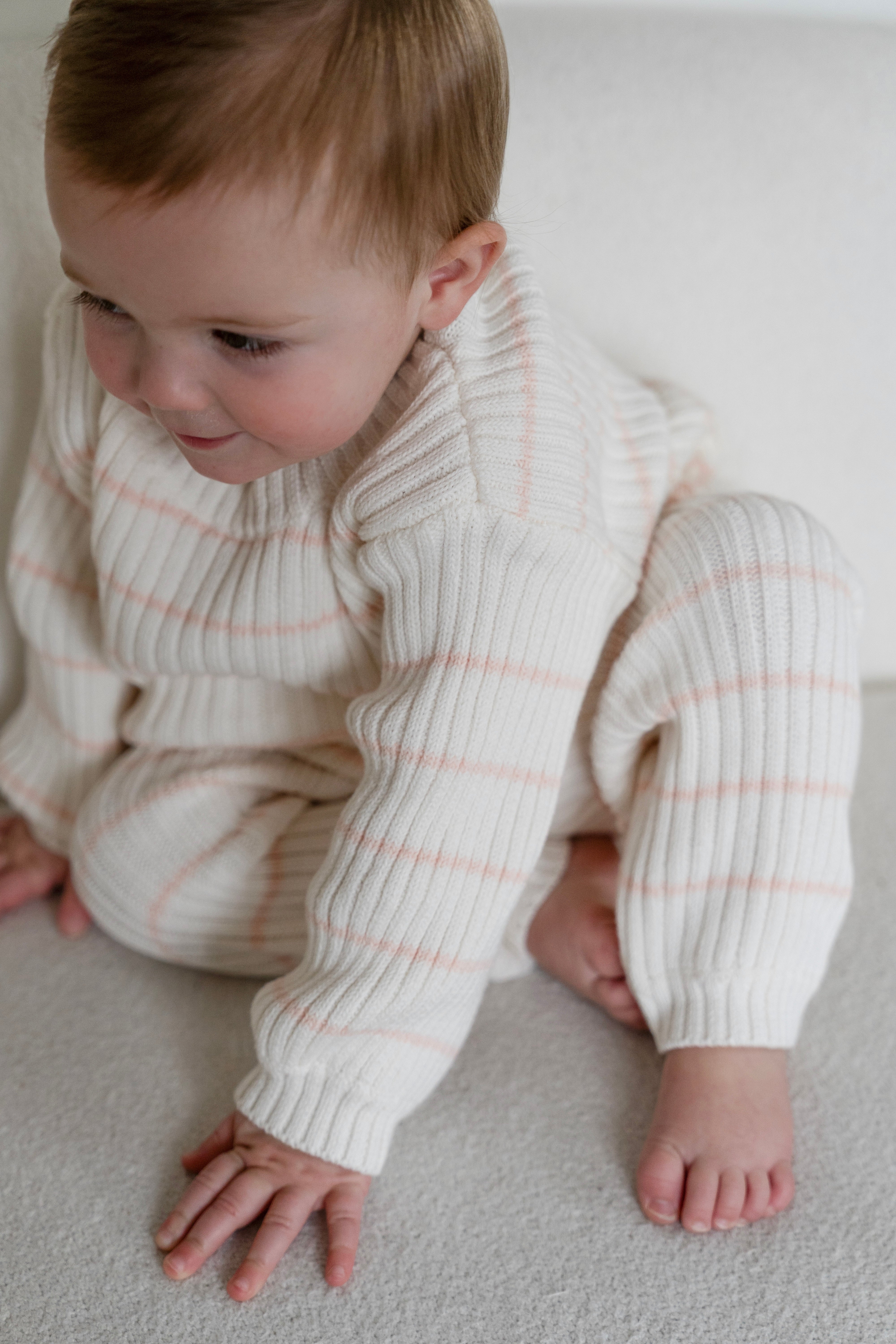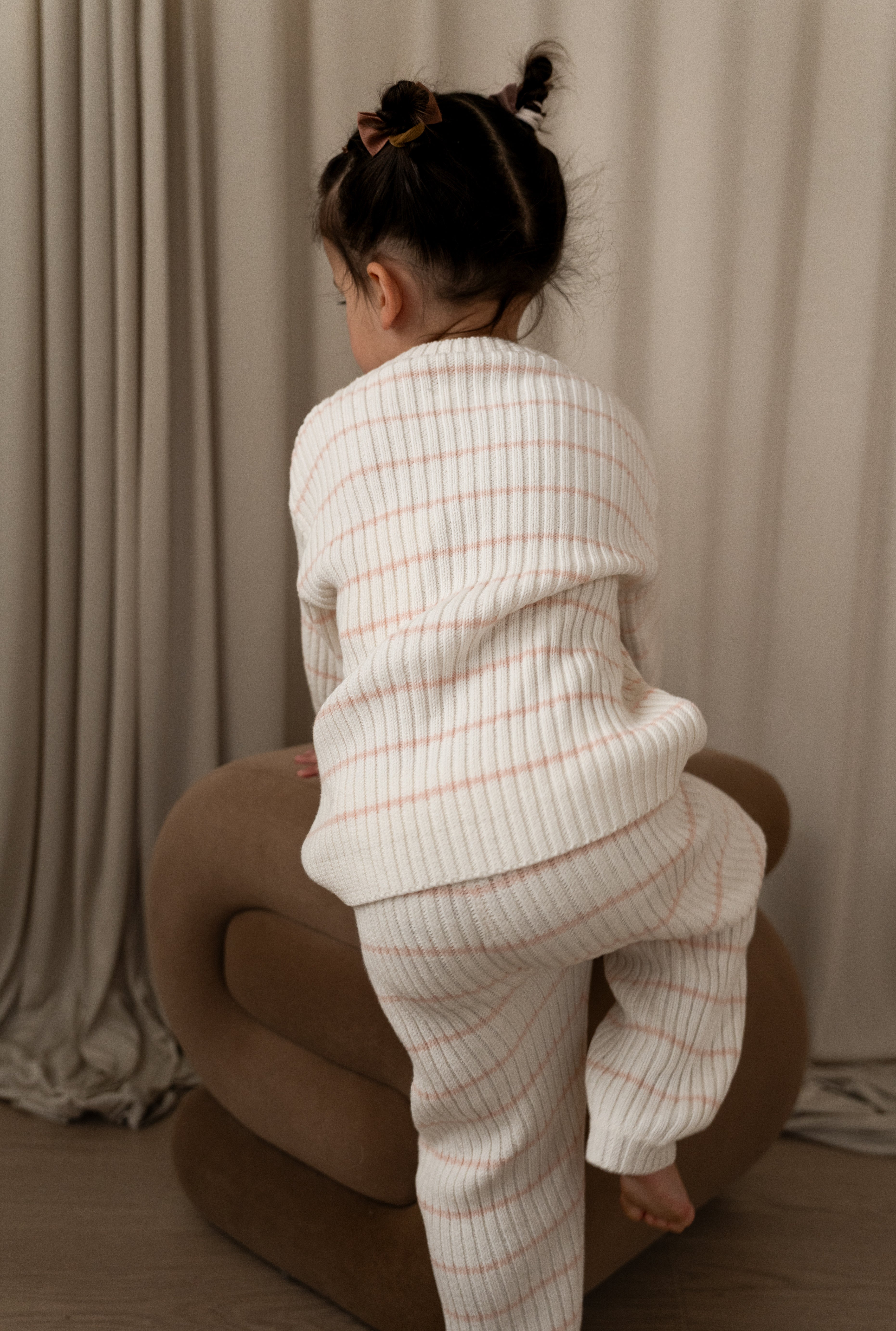 This Pale Pink and Off White striped ribbed pant was made with a timeless look and a luxury fit. With a wide elastic waistband and fitted leg cuffs, these pants were made with your child’s comfort in mind. Pair with their favorite sweater or the matching striped ribbed sweater for the complete knit set. Style meets durability with these minimalistic ribbed pants.
