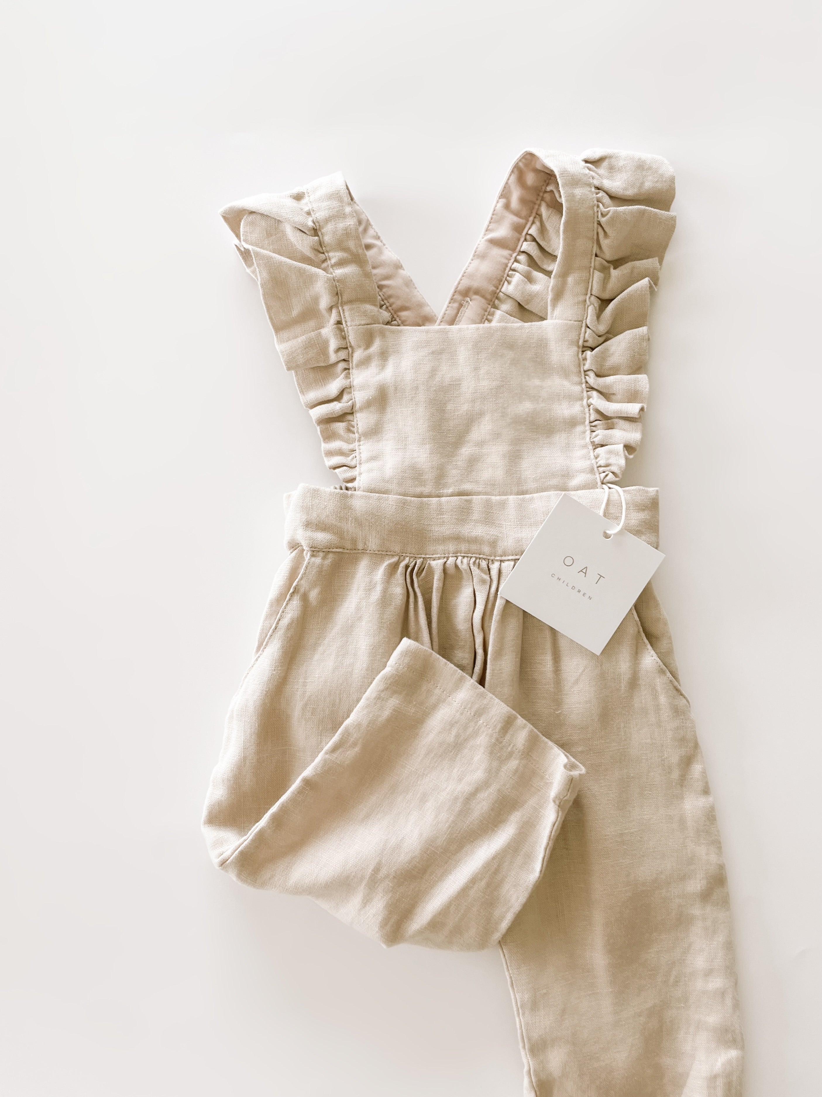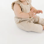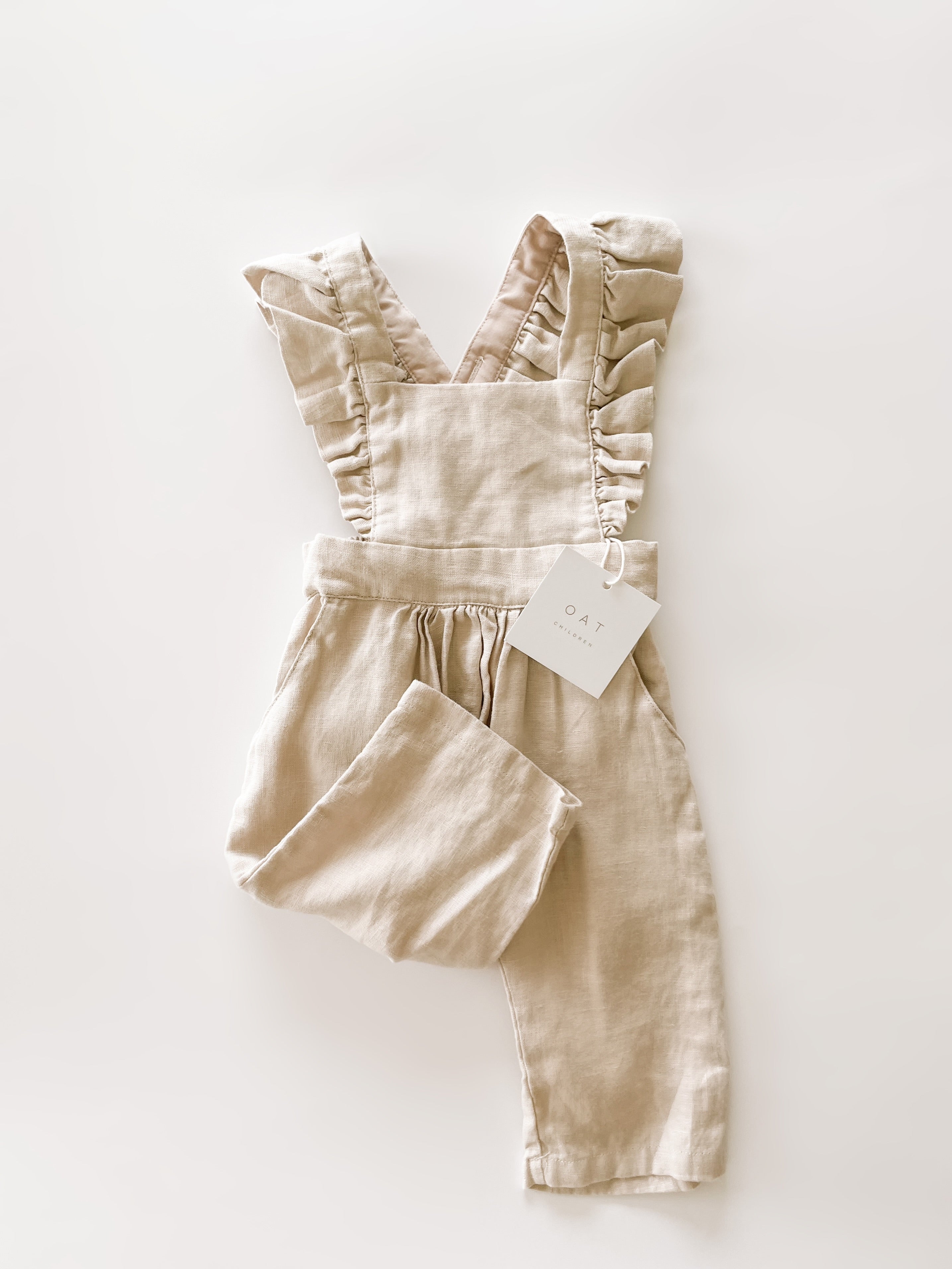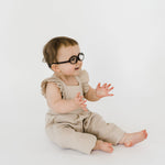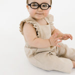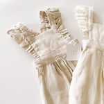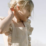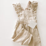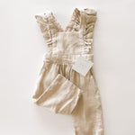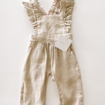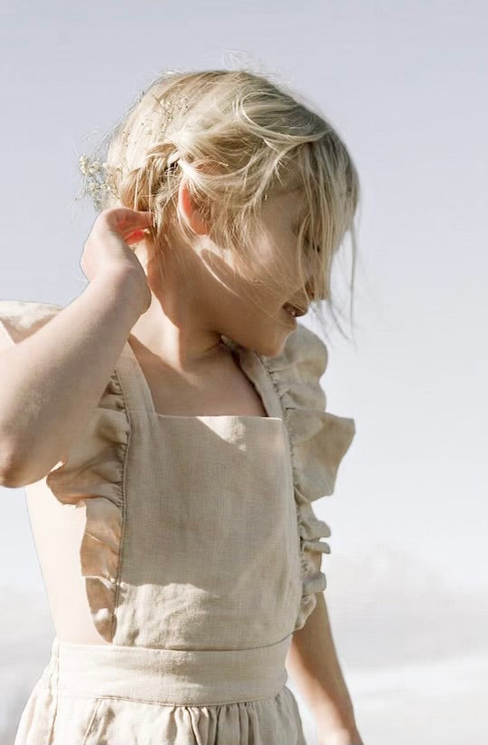 This high quality linen jumpsuit is as strong as it is beautiful. With 4-6 adjustable button straps for the perfect fit this flutter sleeve jumpsuit will leave your little one feeling beautiful and timeless. The embellished straps bring a sense of summer charm to this functional wardrobe staple. It’s an absolutely lovely classic that’s perfect through all warm weather months.