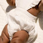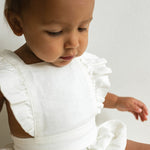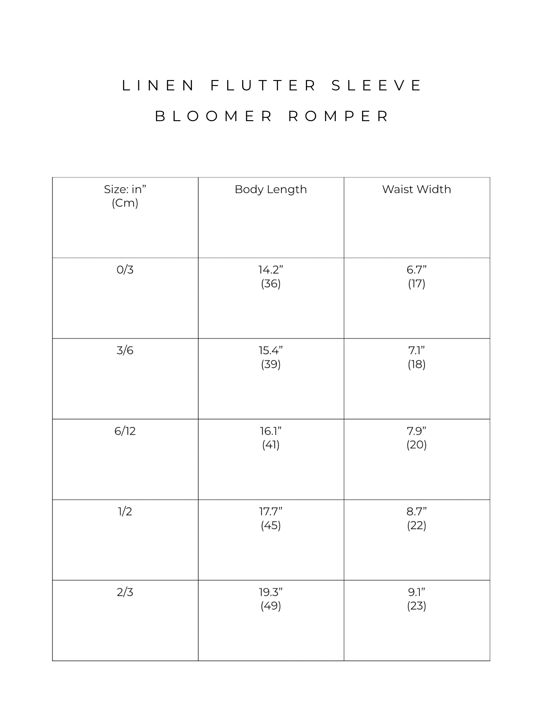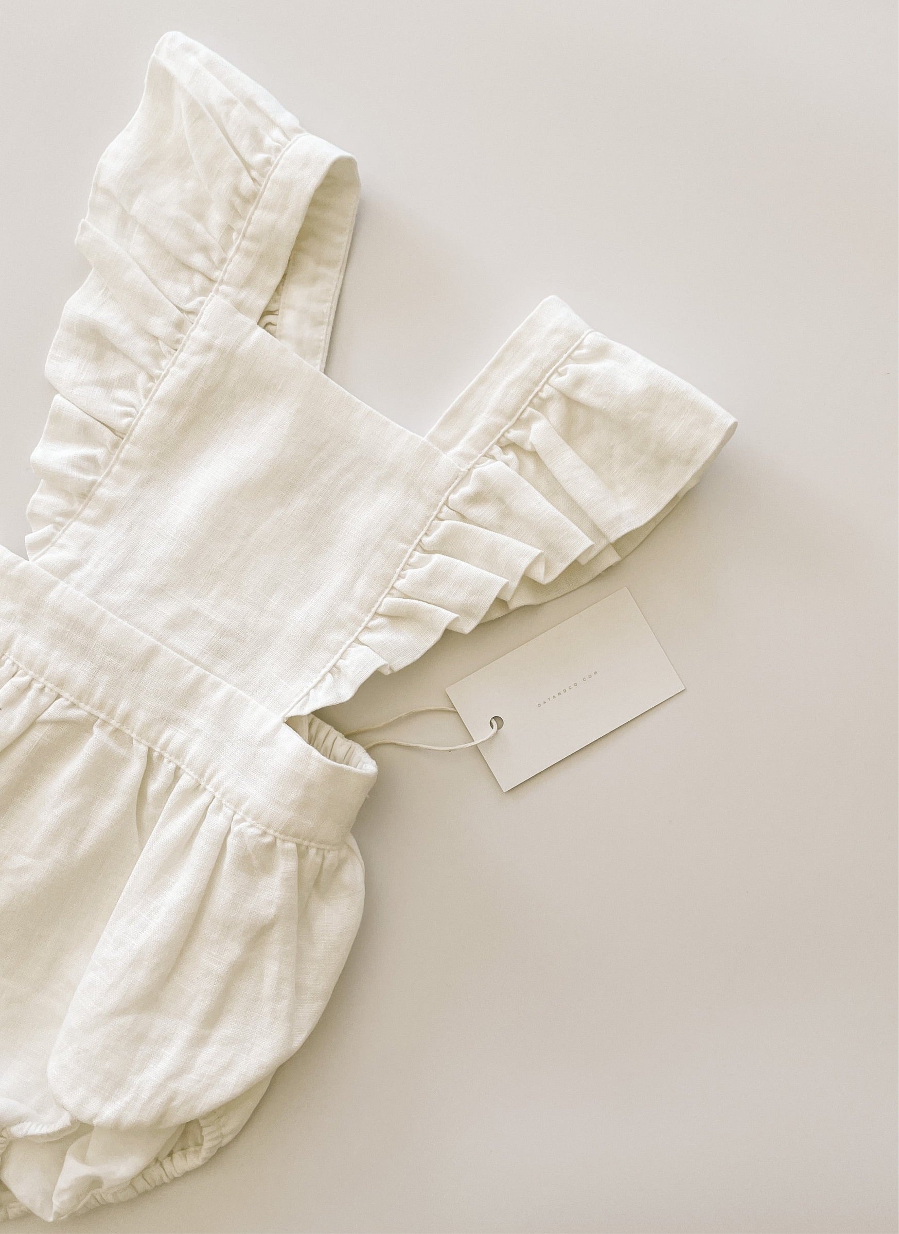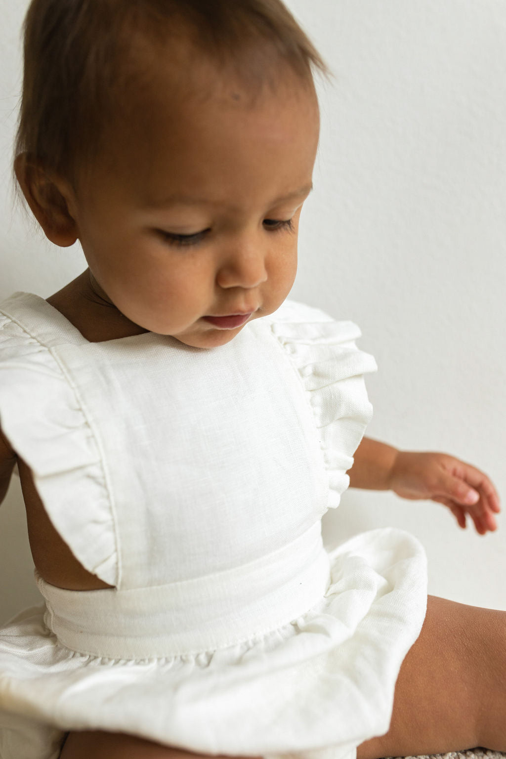 Our linen bloomer romper features beautifully fluttered sleeves, a square neckline, and adjustable cross-back straps with 4 adjustable buttonhole options. The elegant minimalistic look of this 100% linen piece is perfect for every warm weather occasion. This linen staple was designed to make your little one’s every milestone feel even sweeter.