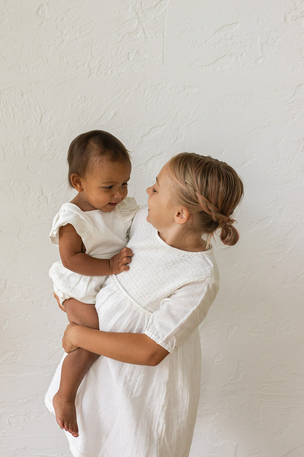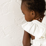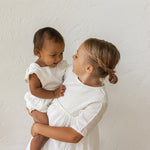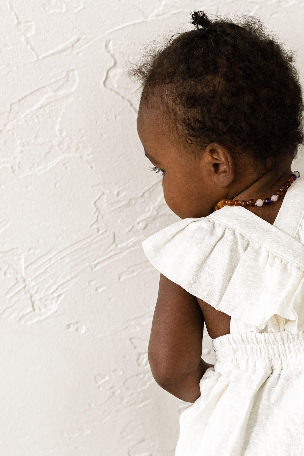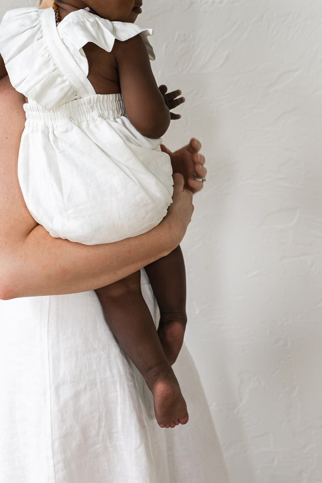 Our linen bloomer romper features beautifully fluttered sleeves, a square neckline, and adjustable cross-back straps with 4 adjustable buttonhole options. The elegant minimalistic look of this 100% linen piece is perfect for every warm weather occasion. This linen staple was designed to make your little one’s every milestone feel even sweeter.