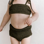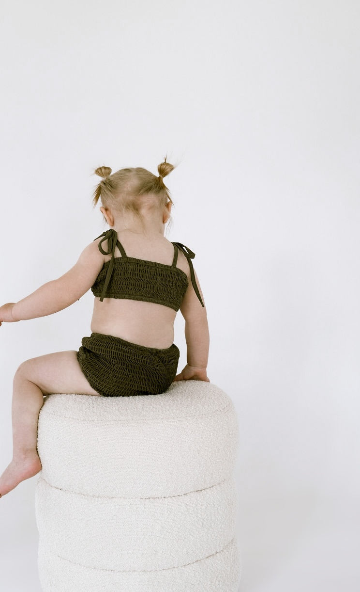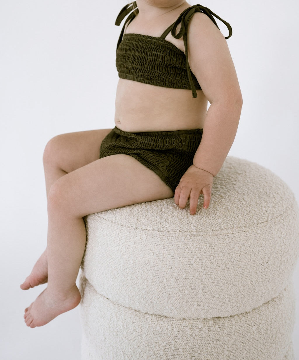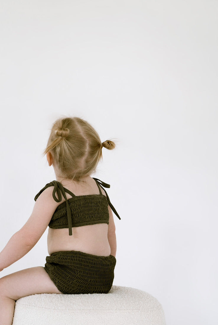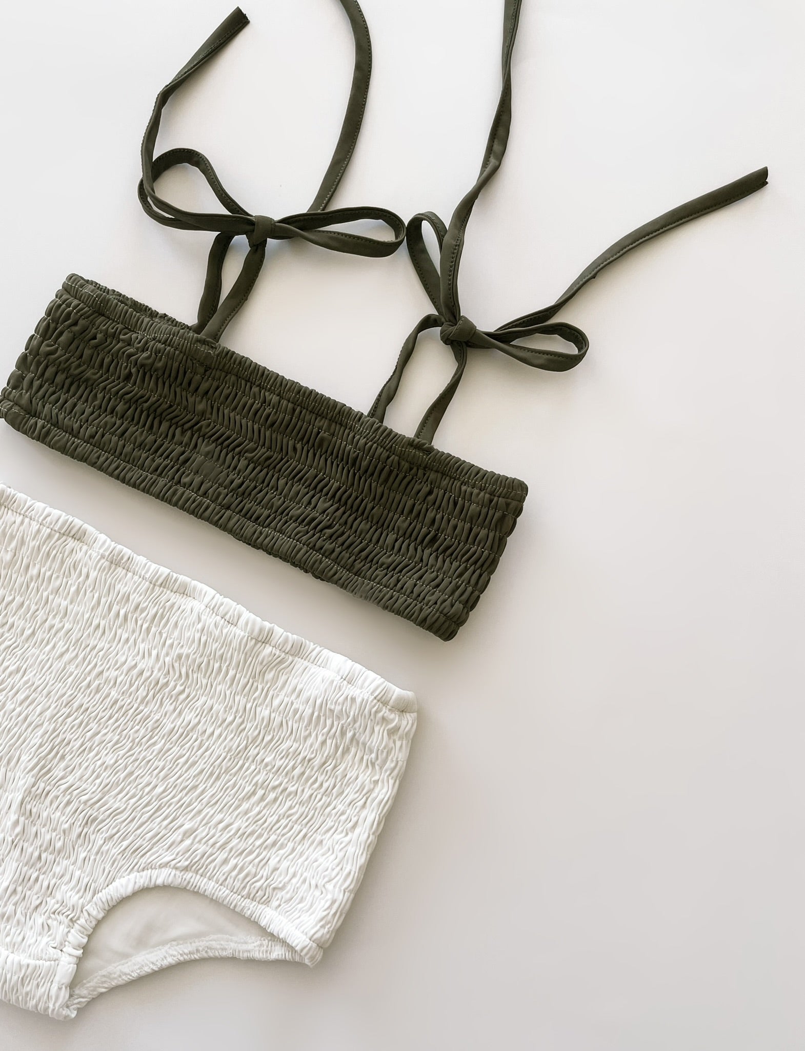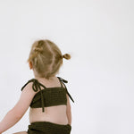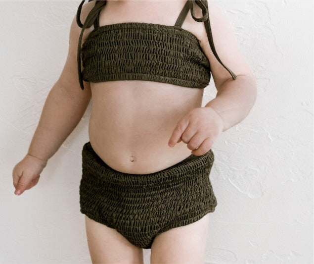 Summertime dreams! This smocked bikini top is the perfect swim piece for their summer wardrobe. It's an absolutely timeless capsule piece made for beach days and pool lounging. Made of soft material and fully lined for ultimate comfort and quality. The material gives both the tops and bottoms an amazing amount of stretch making them extremely versatile.