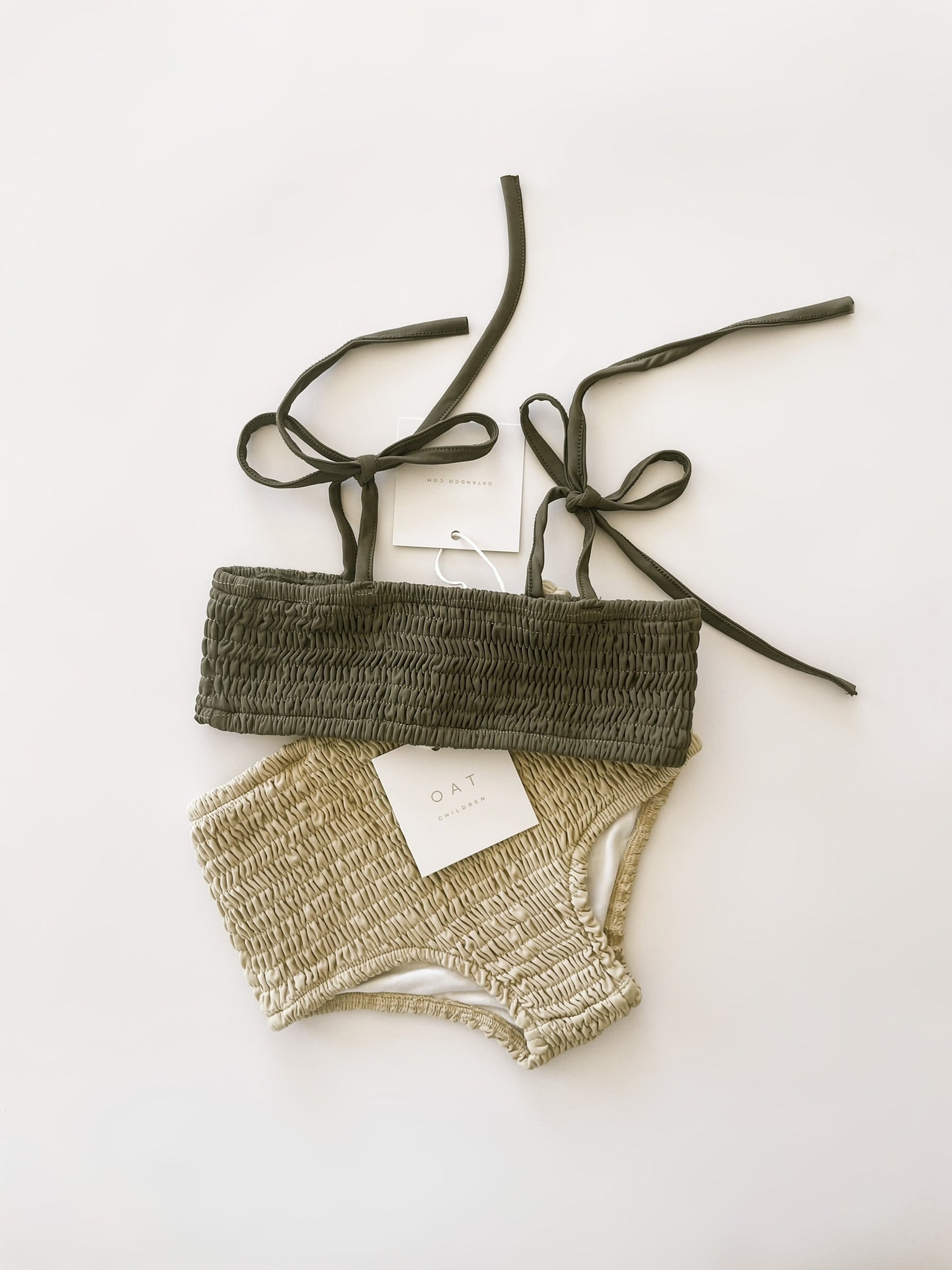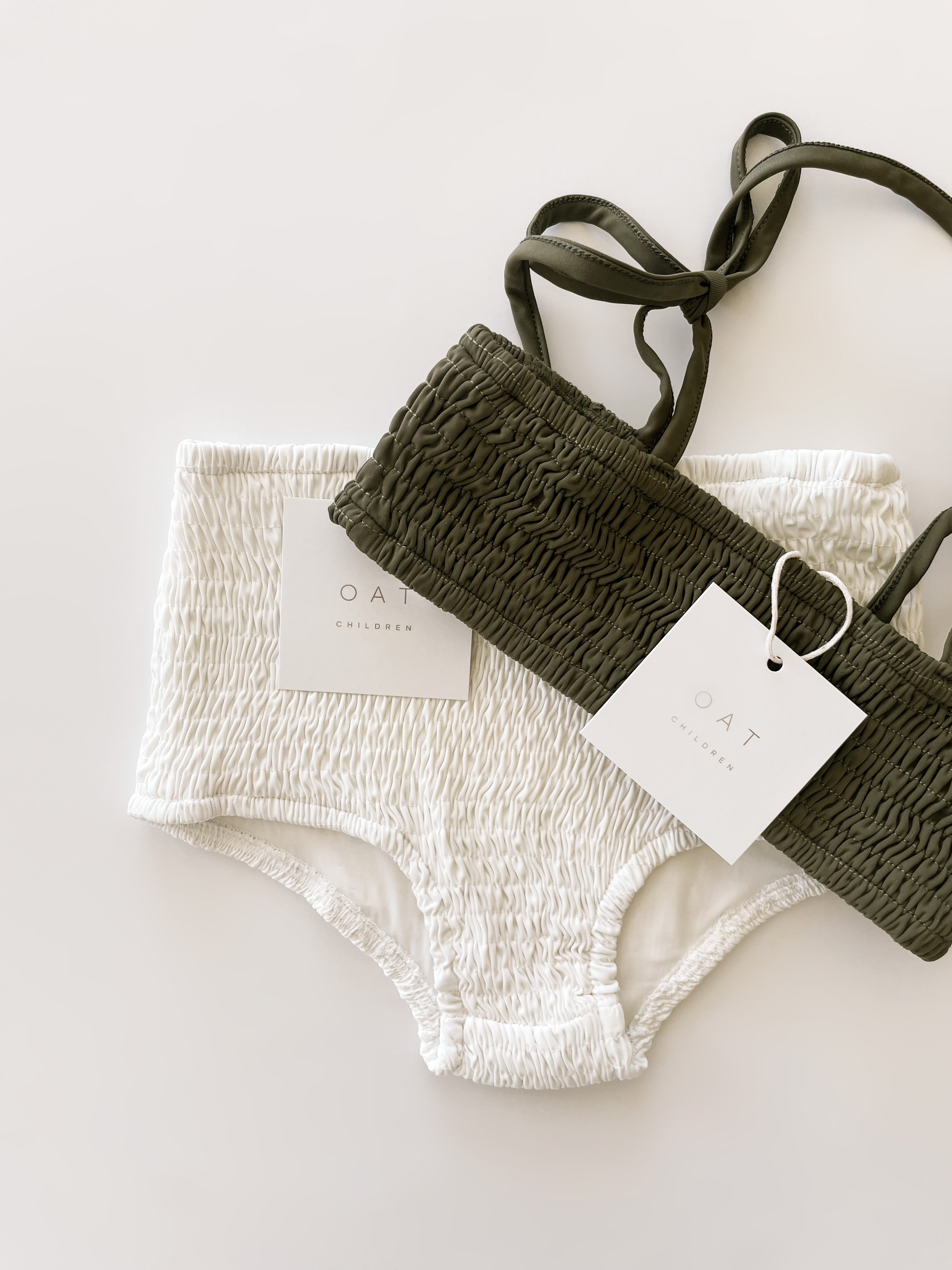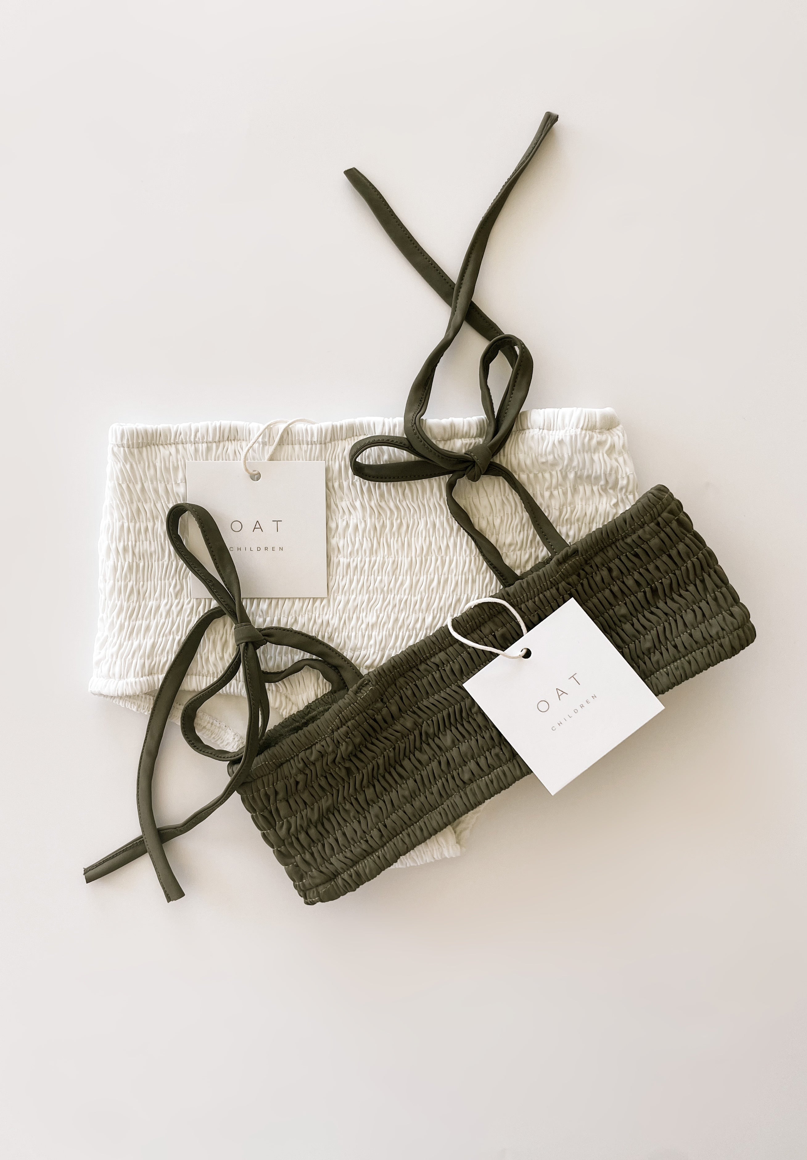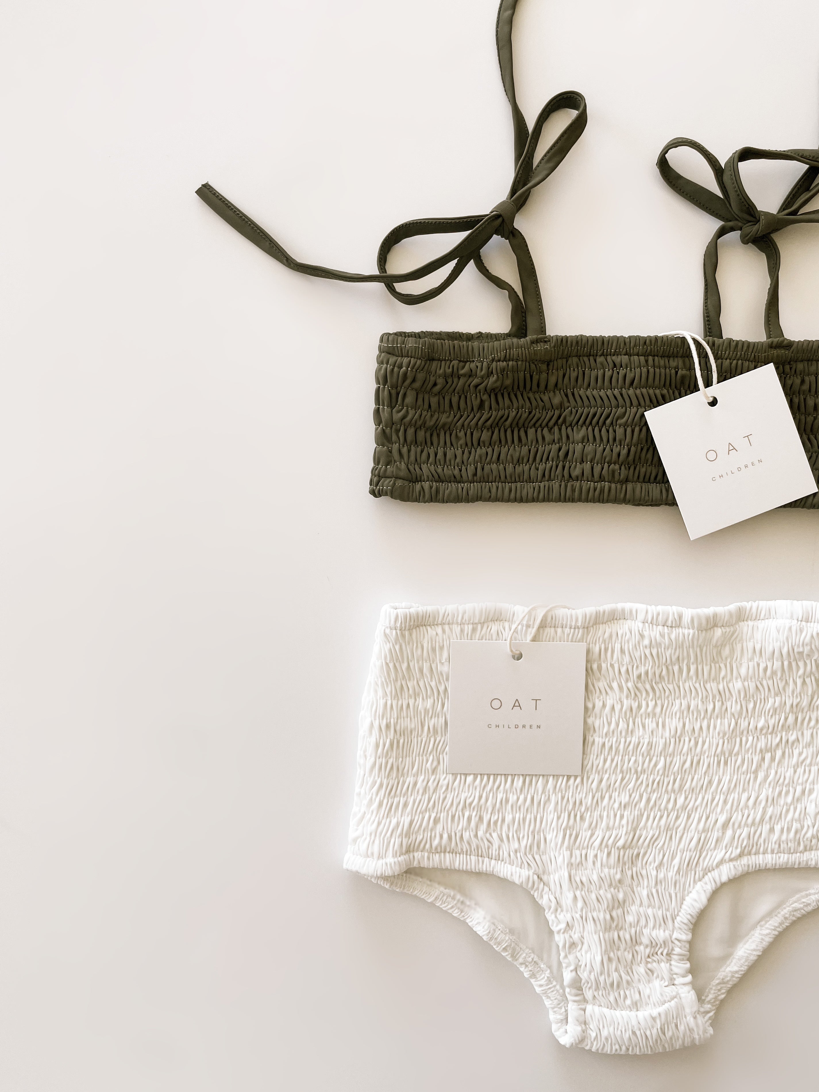 Summertime dreams! This smocked bikini top is the perfect swim piece for their summer wardrobe. It's an absolutely timeless capsule piece made for beach days and pool lounging. Made of soft material and fully lined for ultimate comfort and quality. The material gives both the tops and bottoms an amazing amount of stretch making them extremely versatile.