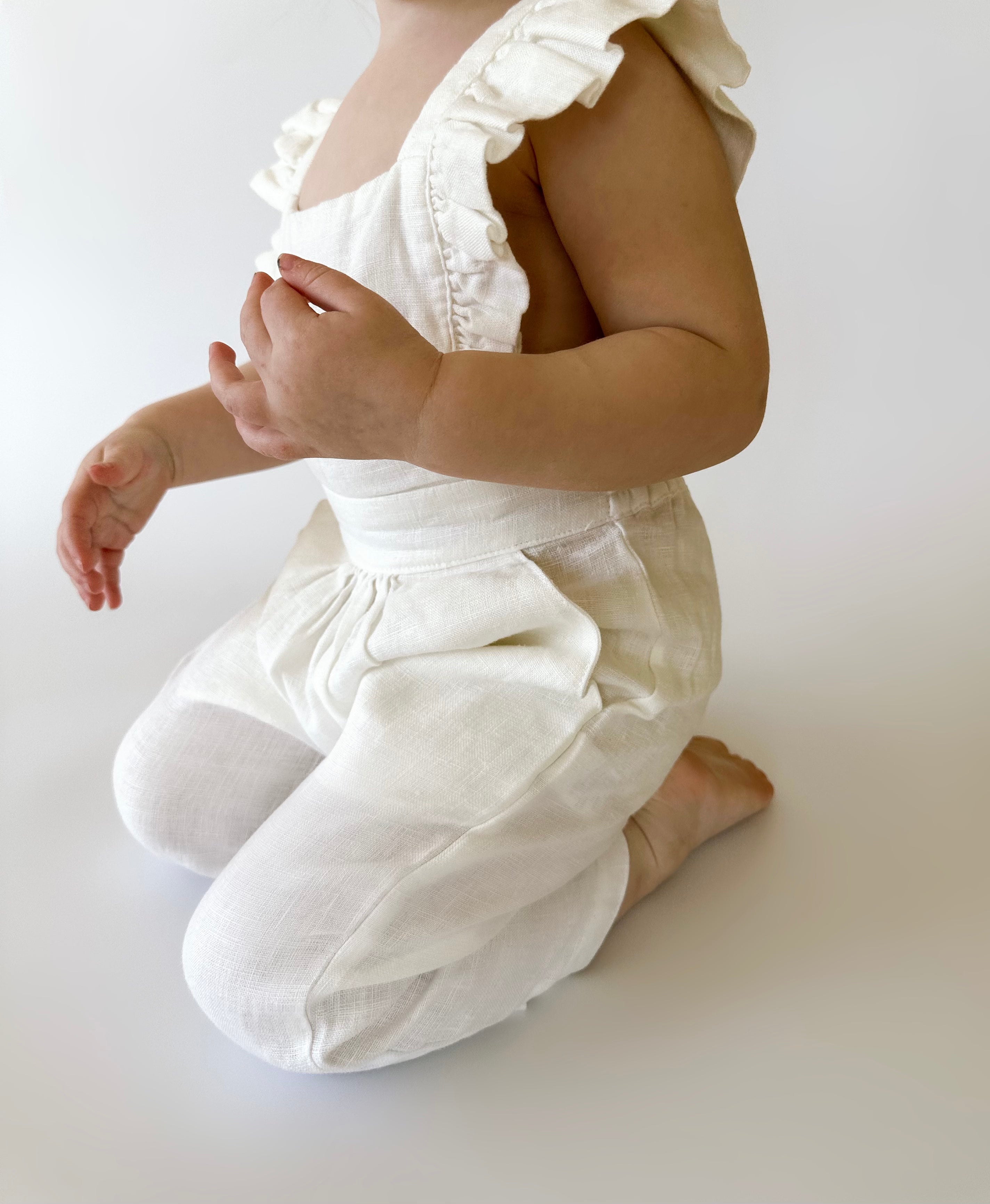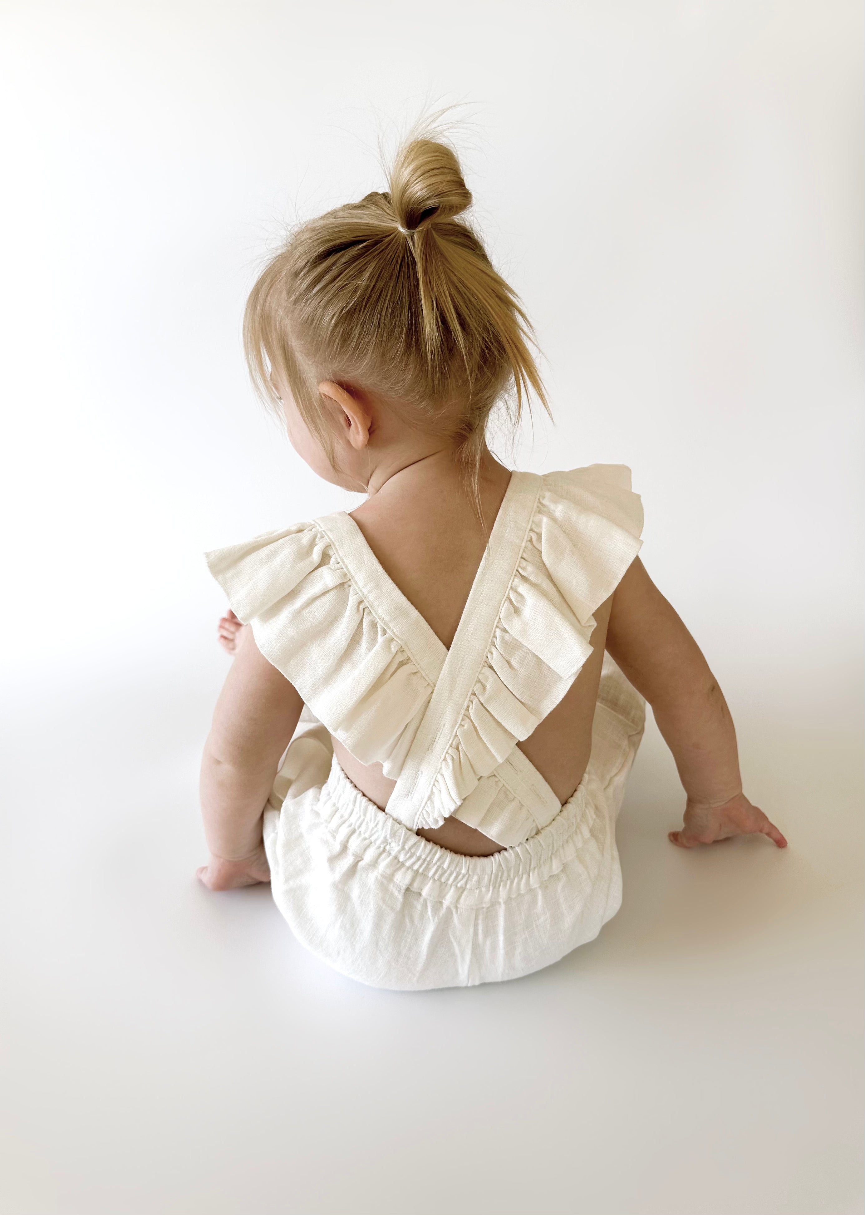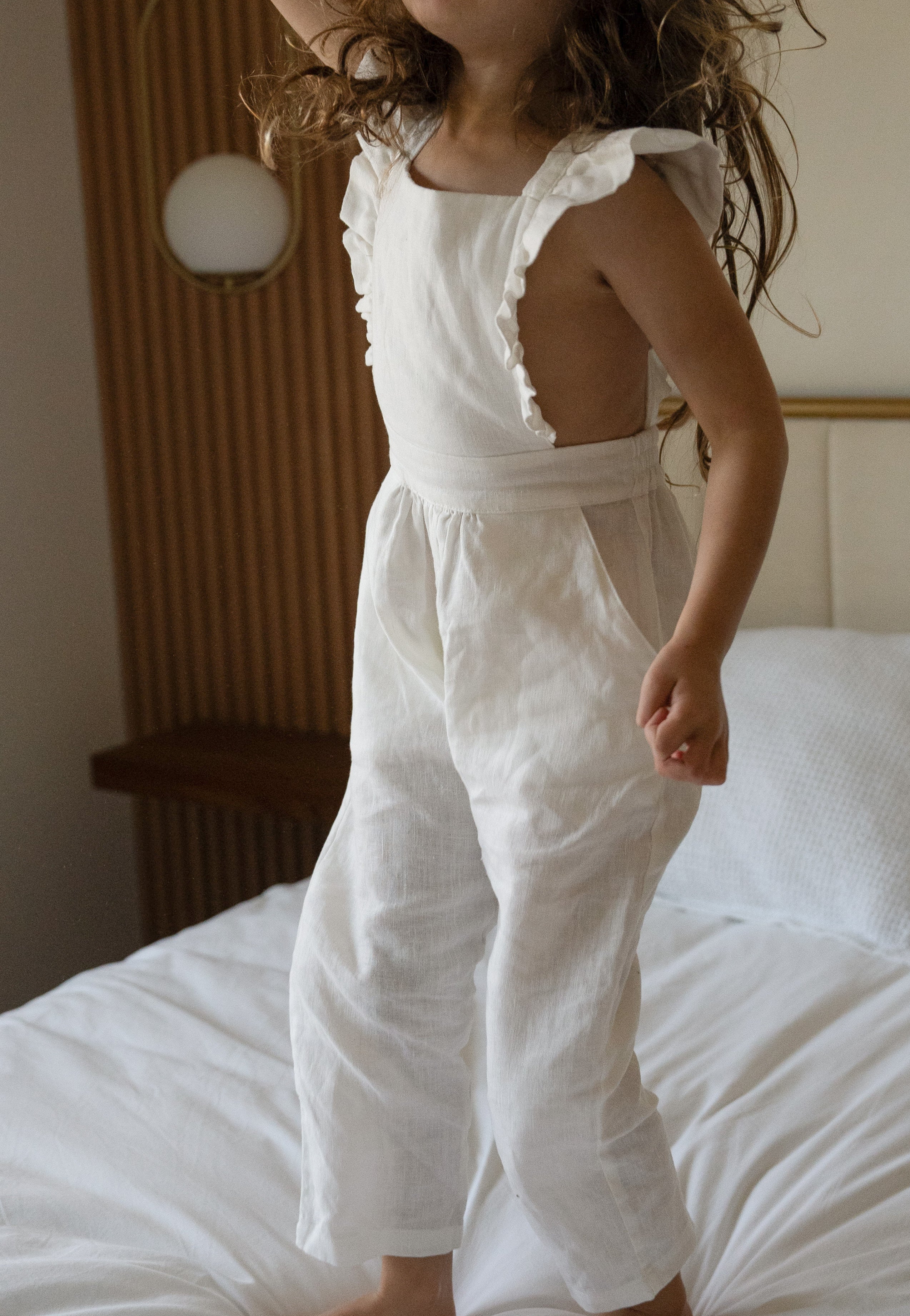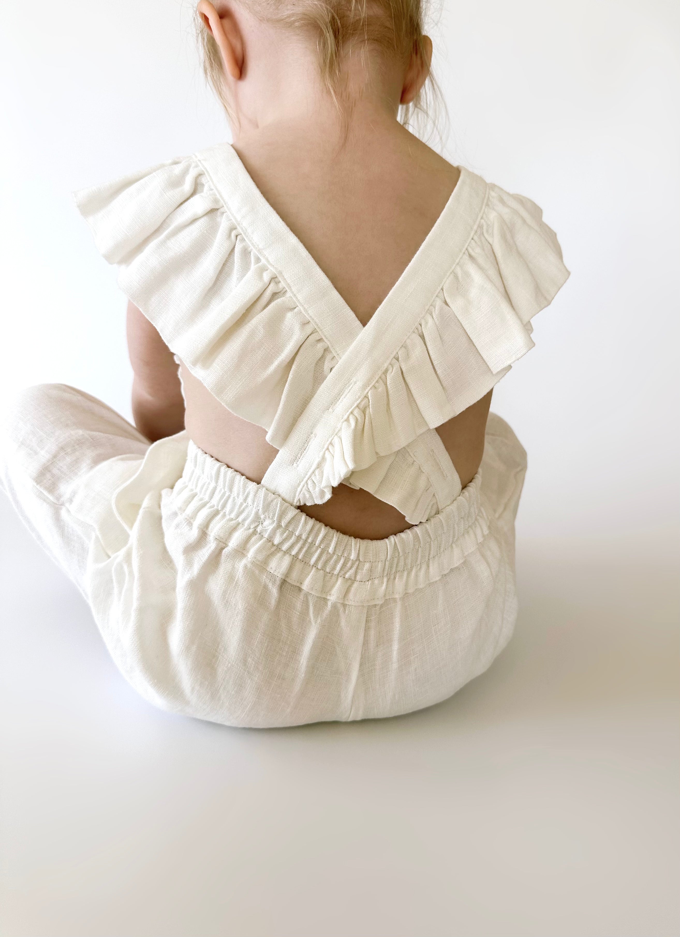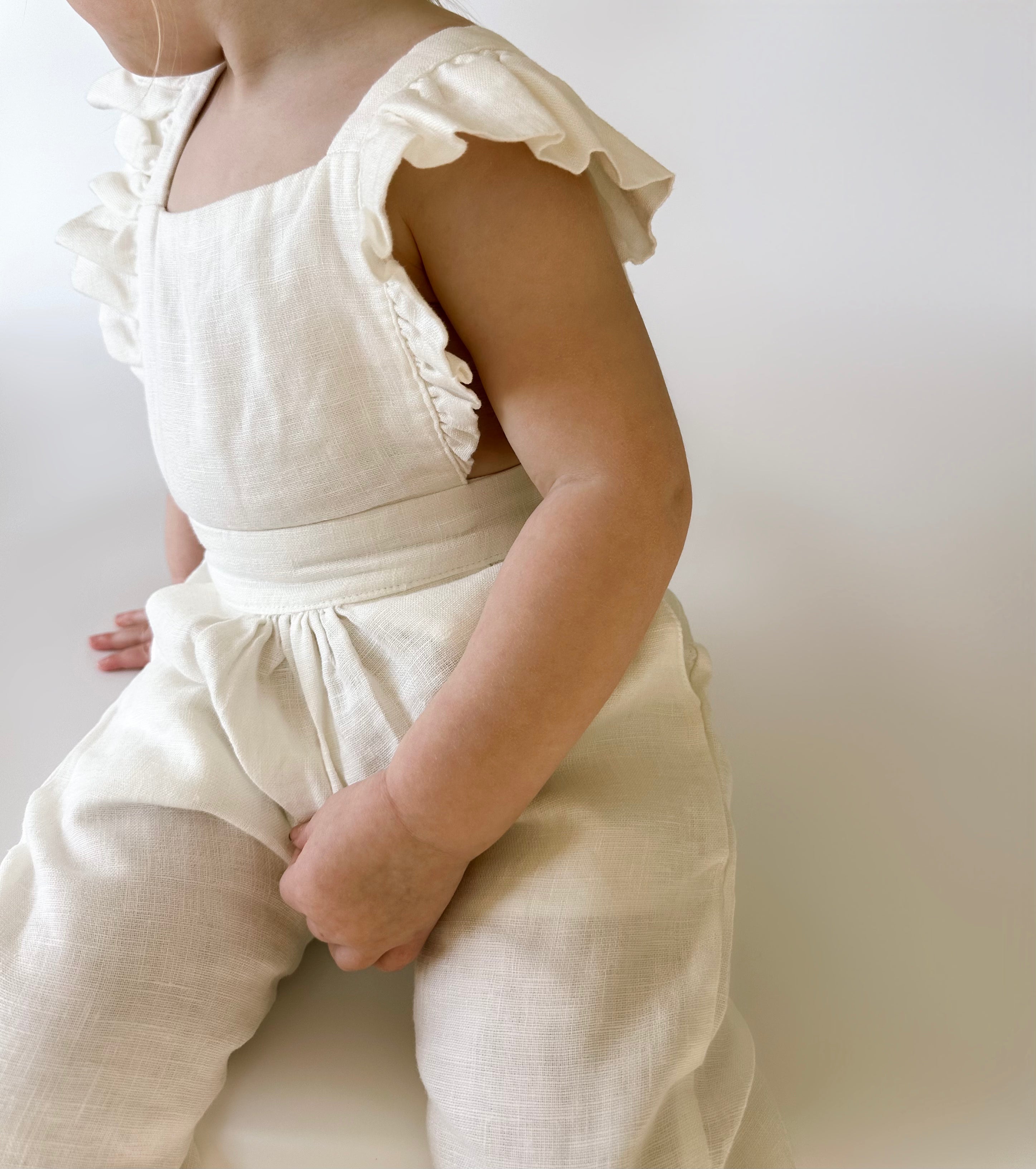 This high quality linen jumpsuit is as strong as it is beautiful. With 4-6 adjustable button straps for the perfect fit this flutter sleeve jumpsuit will leave your little one feeling beautiful and timeless. The embellished straps bring a sense of summer charm to this functional wardrobe staple. It’s an absolutely lovely classic that’s perfect through all warm weather months.