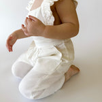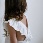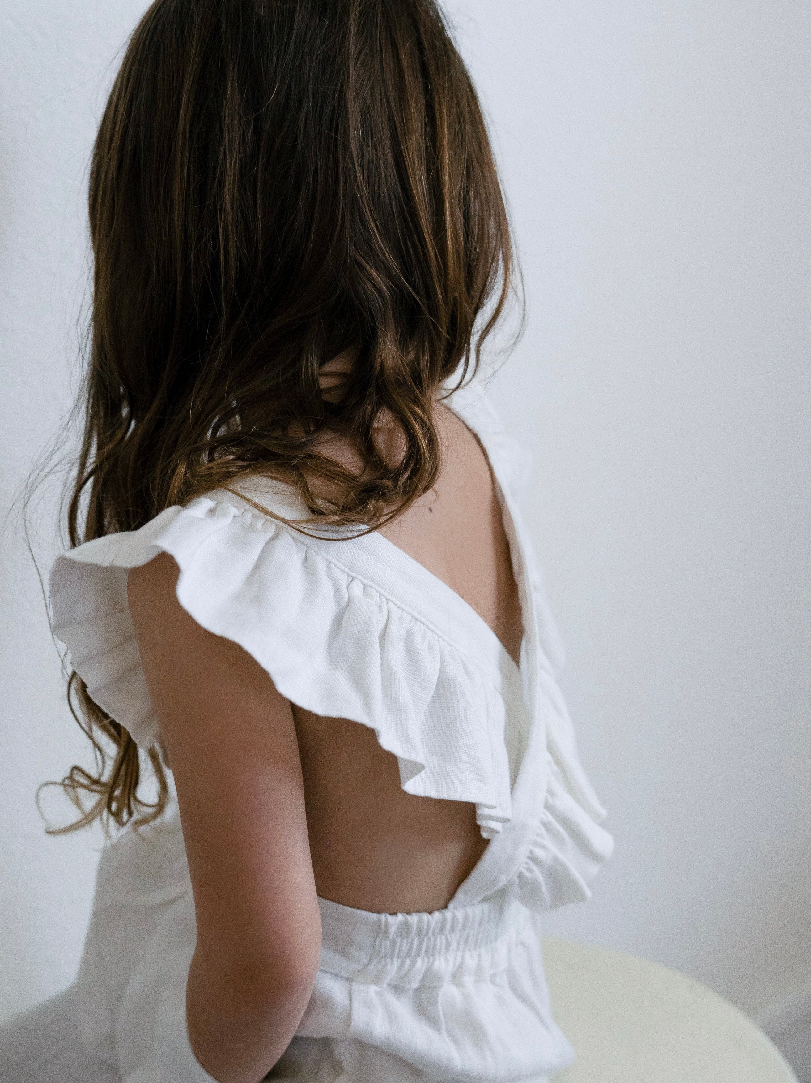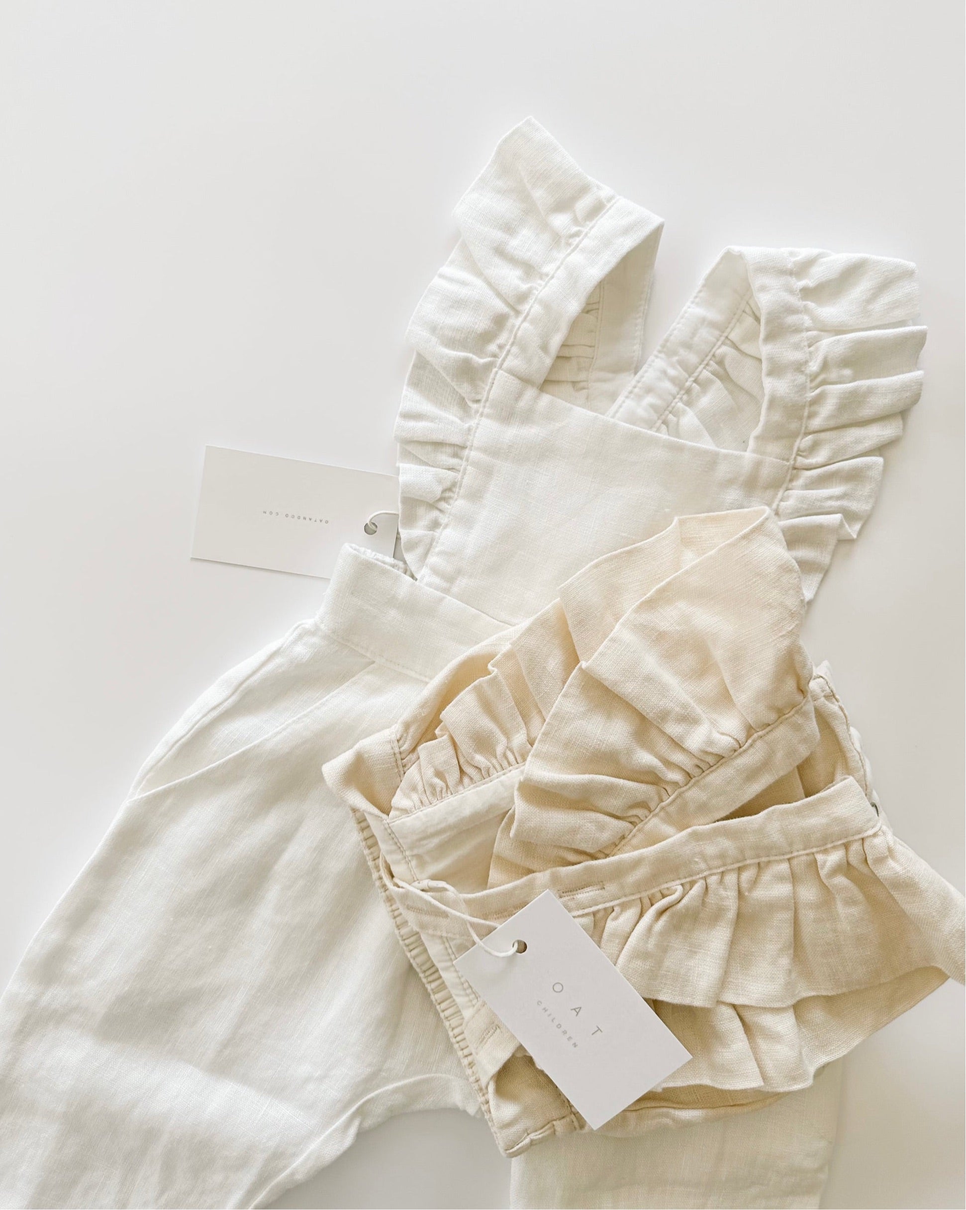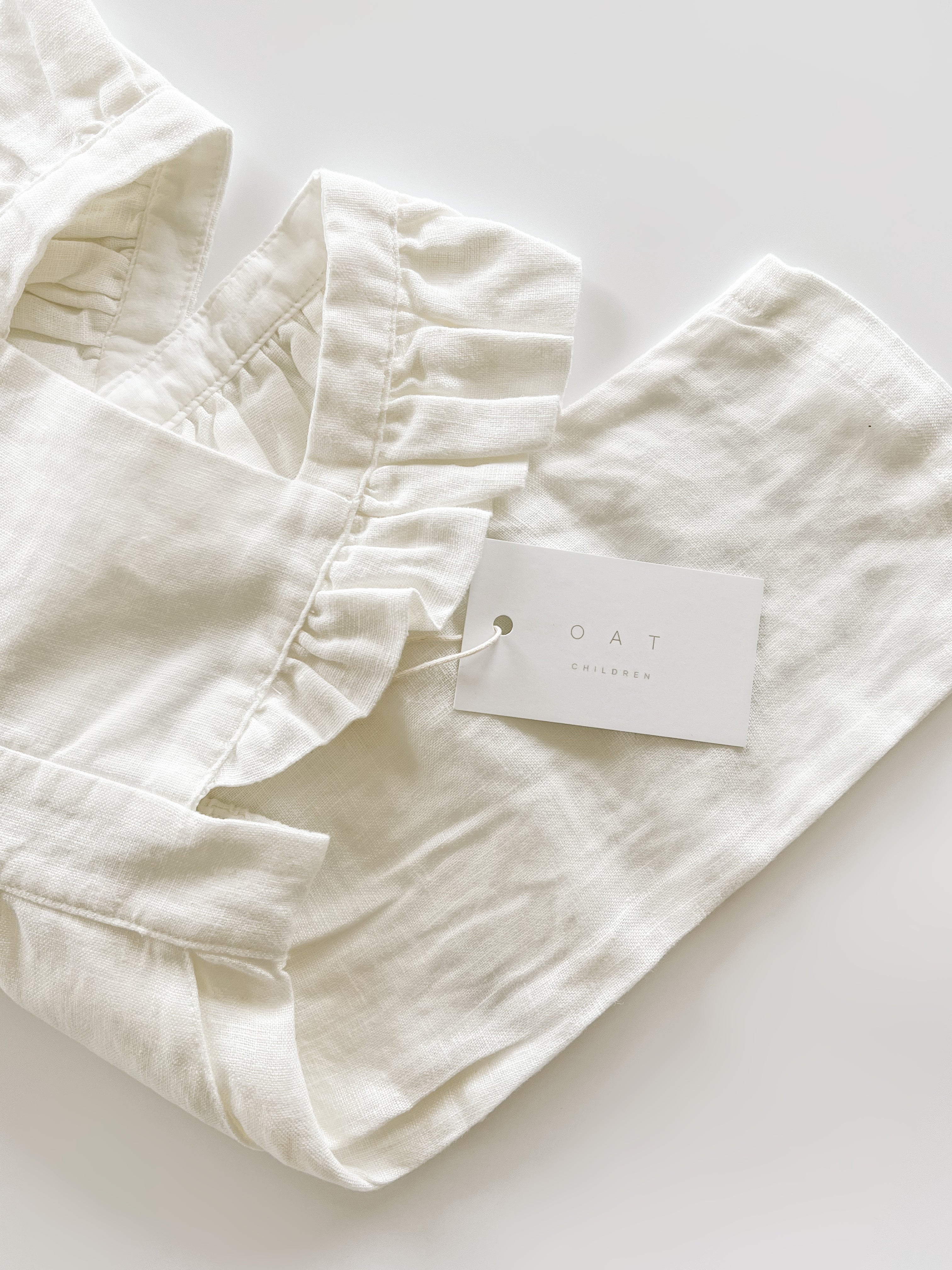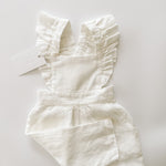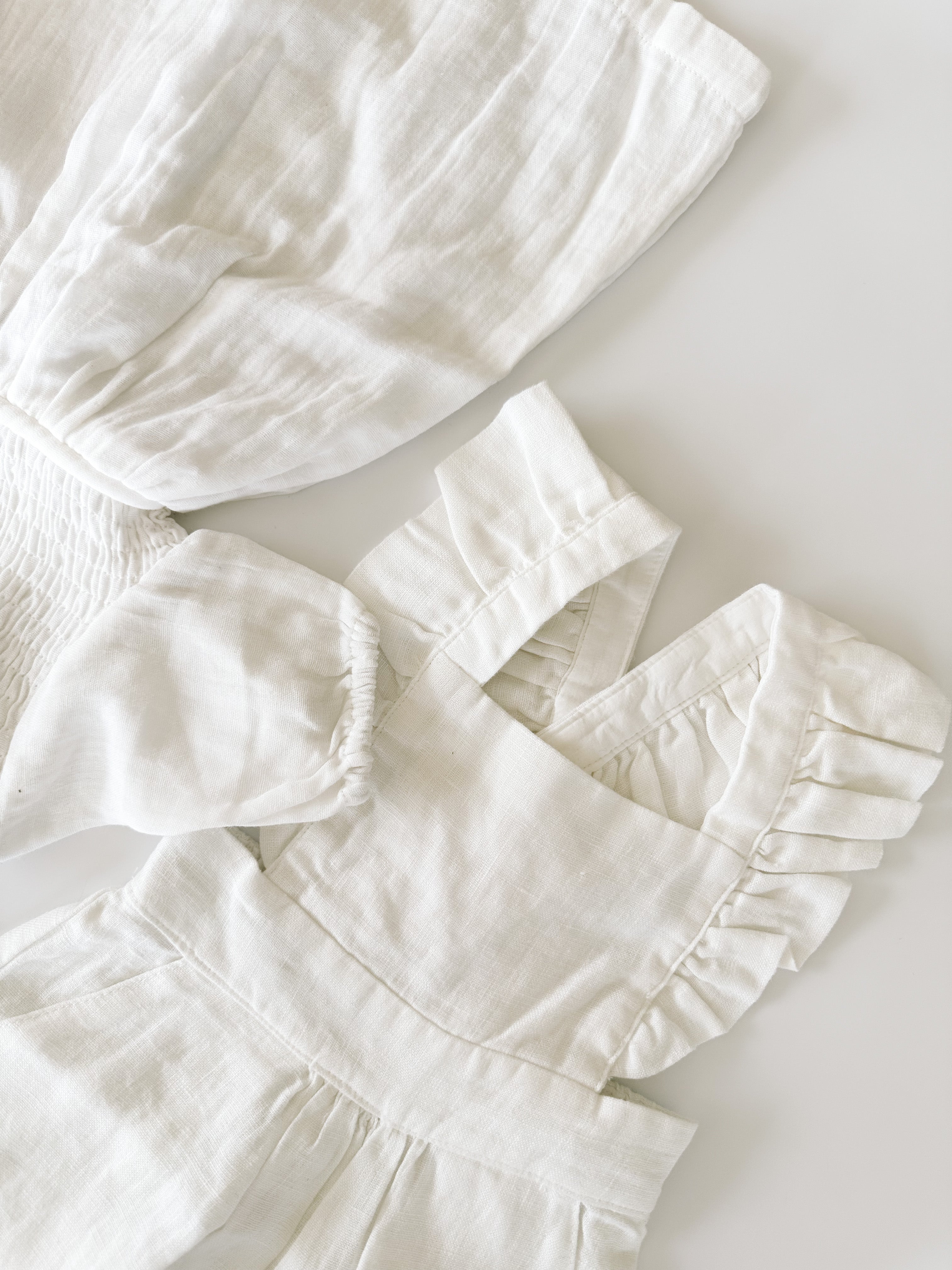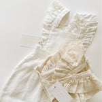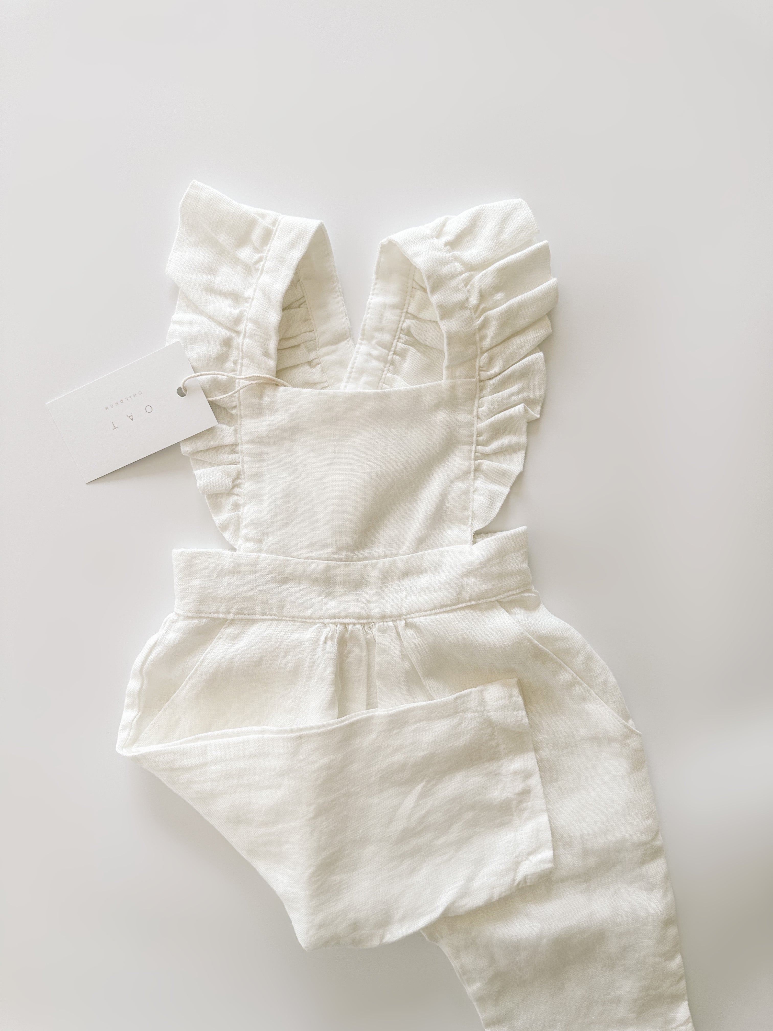 This high quality linen jumpsuit is as strong as it is beautiful. With 4-6 adjustable button straps for the perfect fit this flutter sleeve jumpsuit will leave your little one feeling beautiful and timeless. The embellished straps bring a sense of summer charm to this functional wardrobe staple. It’s an absolutely lovely classic that’s perfect through all warm weather months.