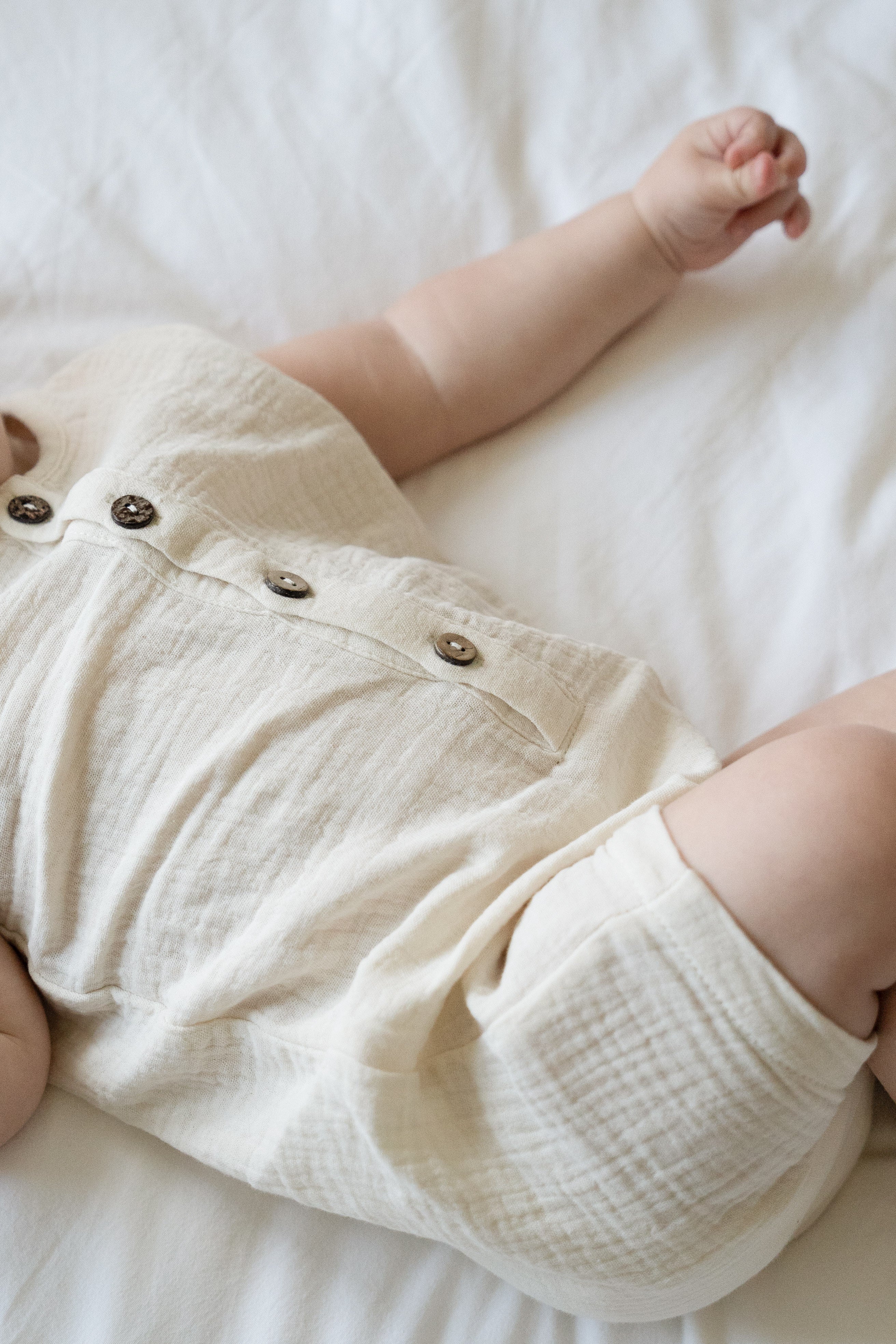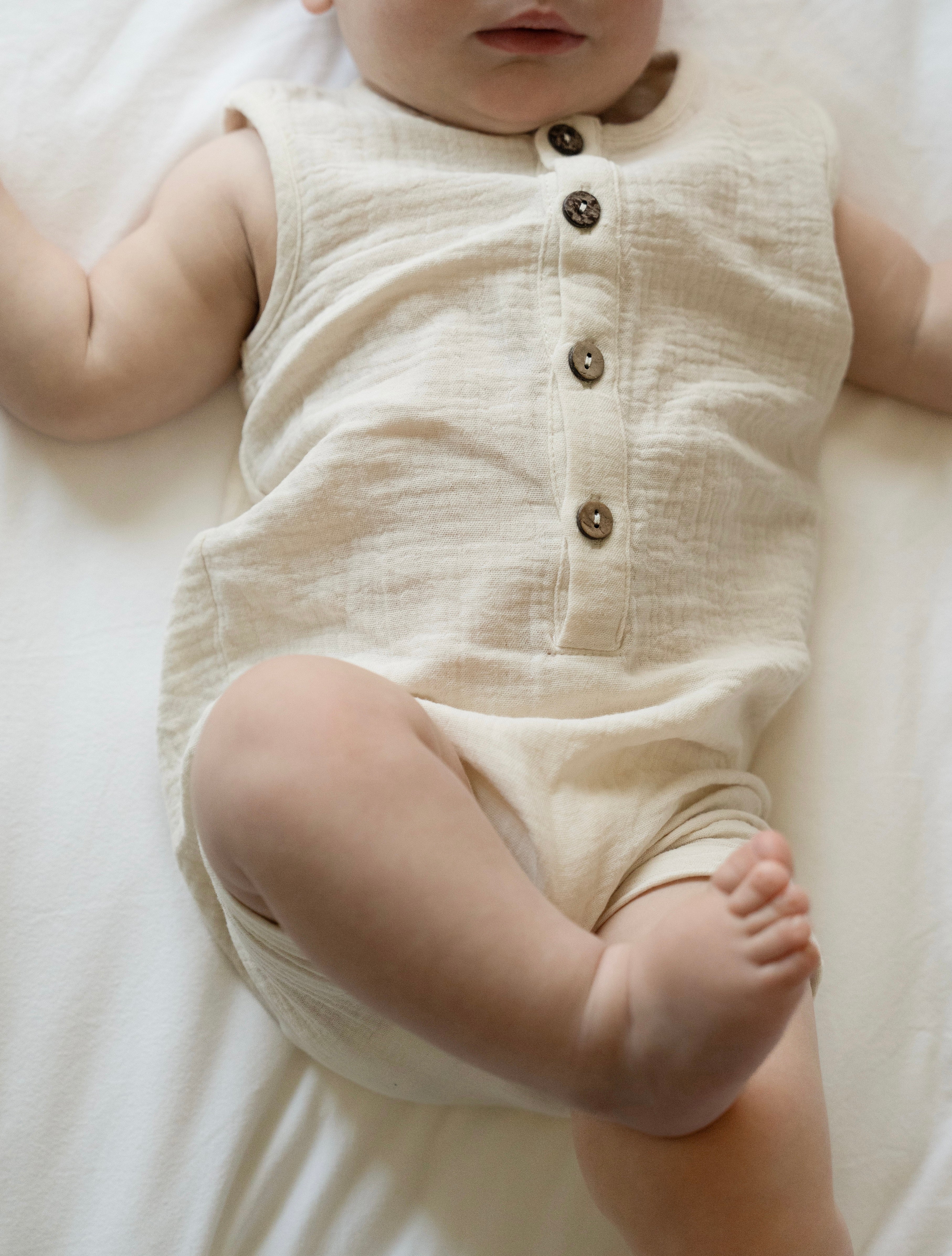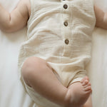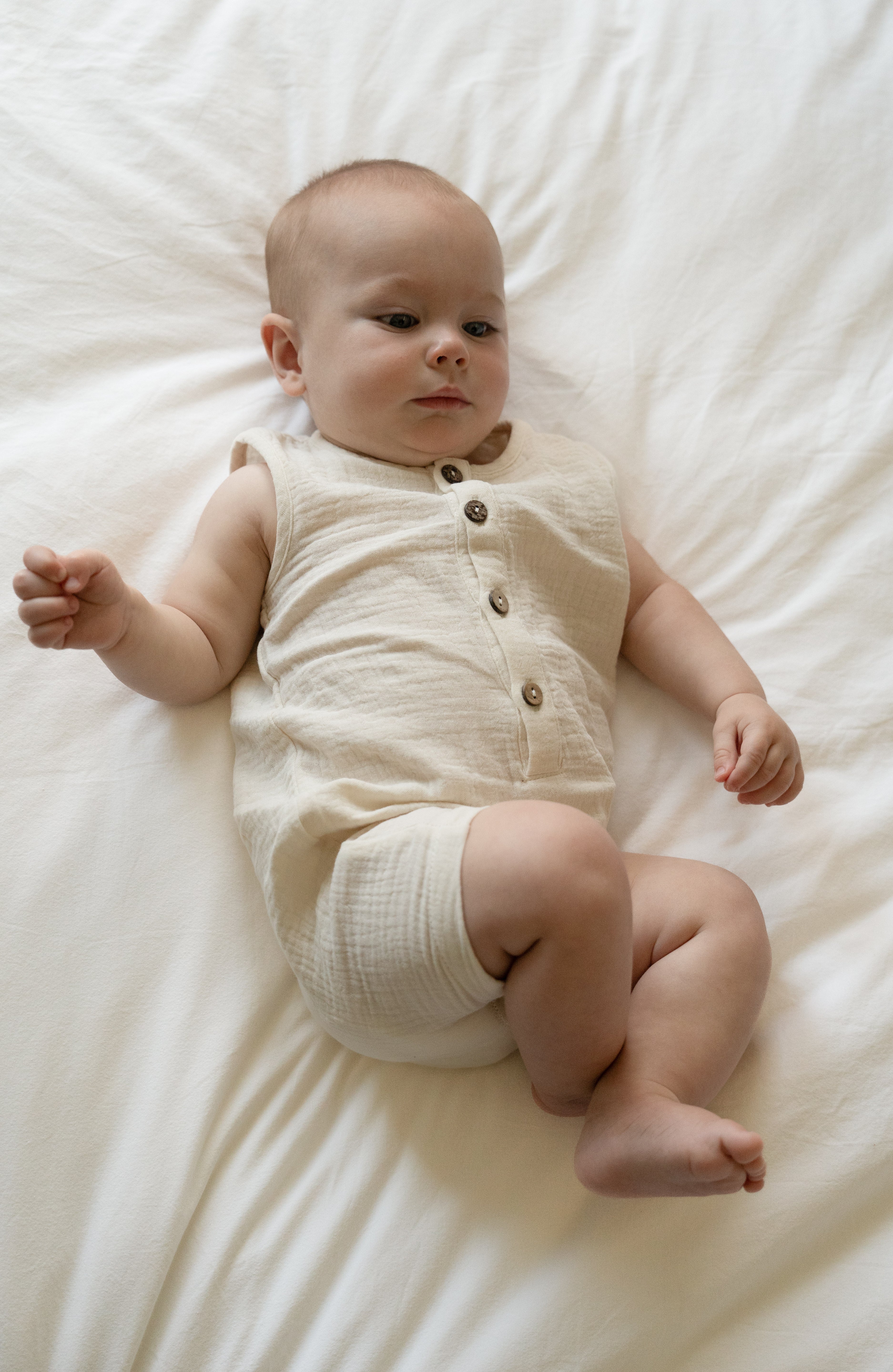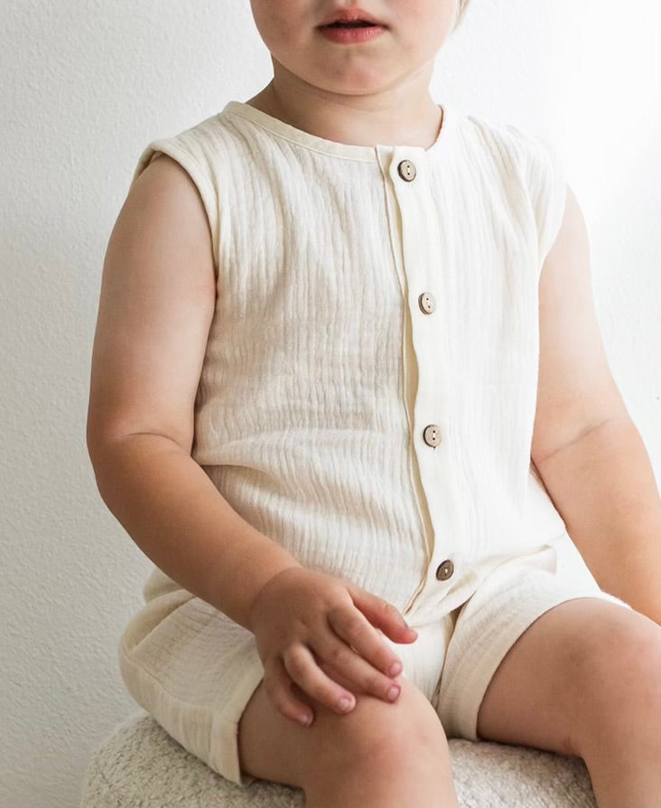 This muslin romper was made with your child’s comfort in mind. Whether running around in the warm sunshine or resting after a long day of play, this soft lightweight material will follow your child’s every move. Made of 100% muslin cotton, features wooden buttons down the front and provides truly effortless style.