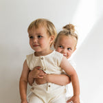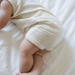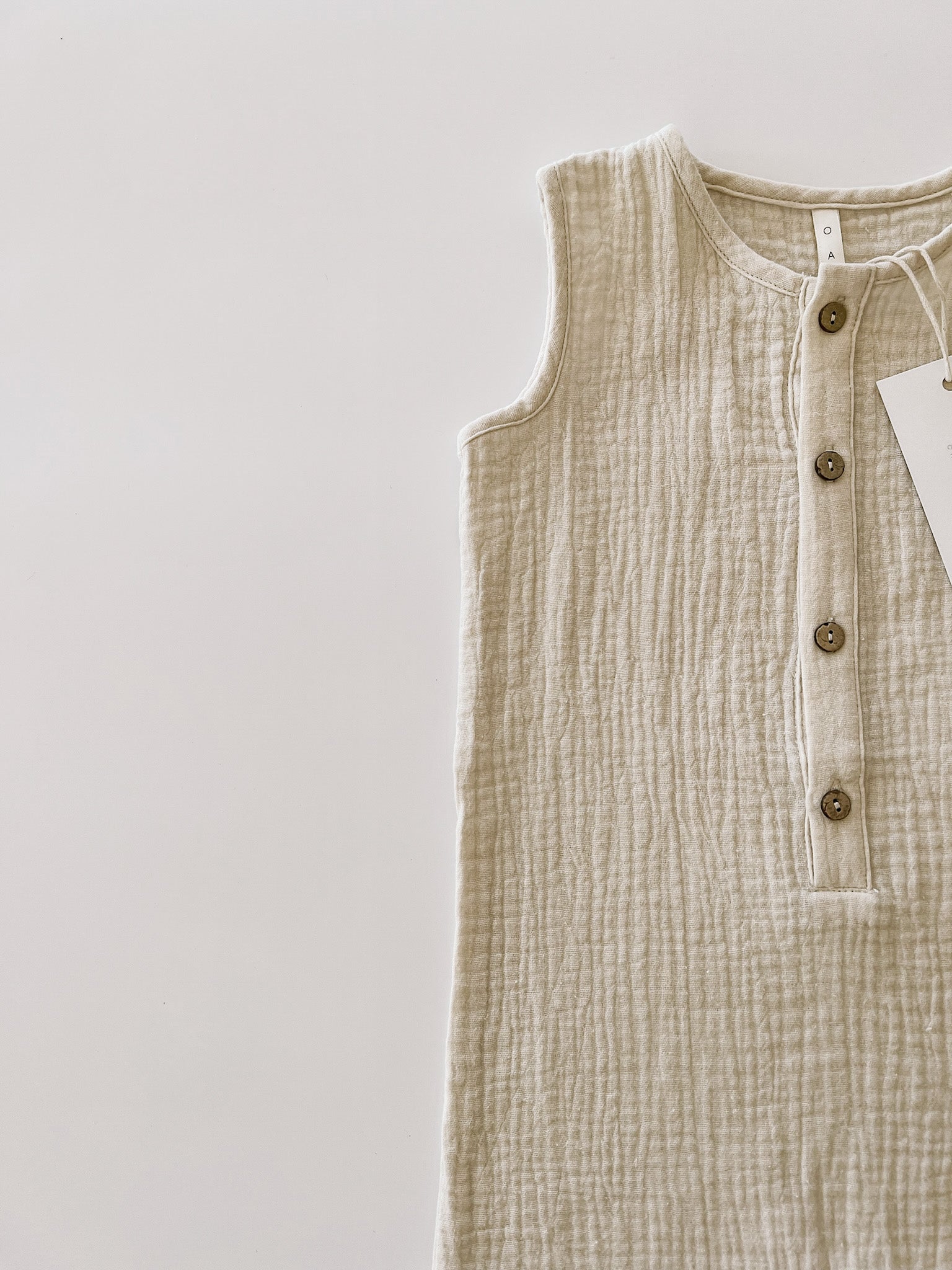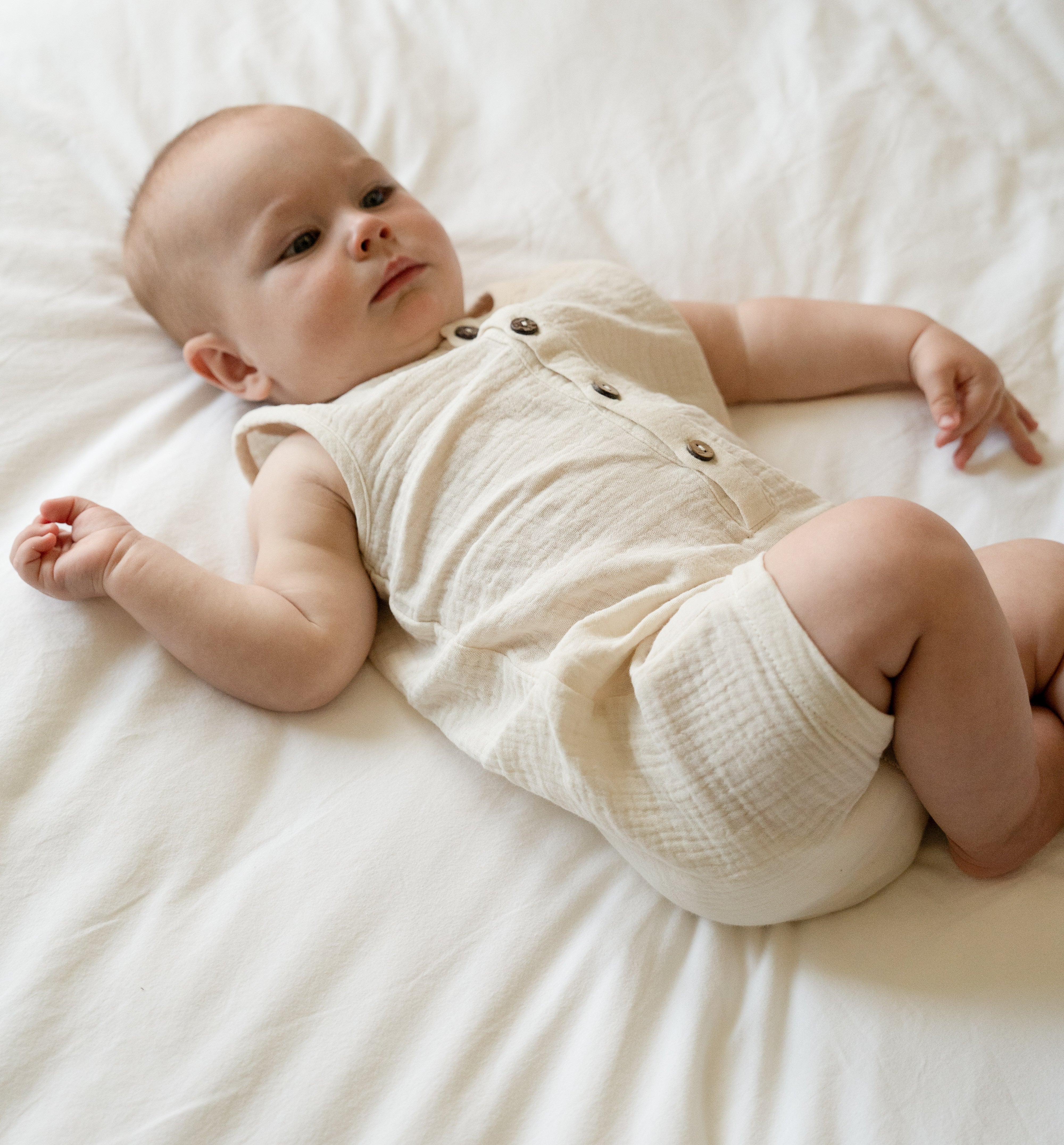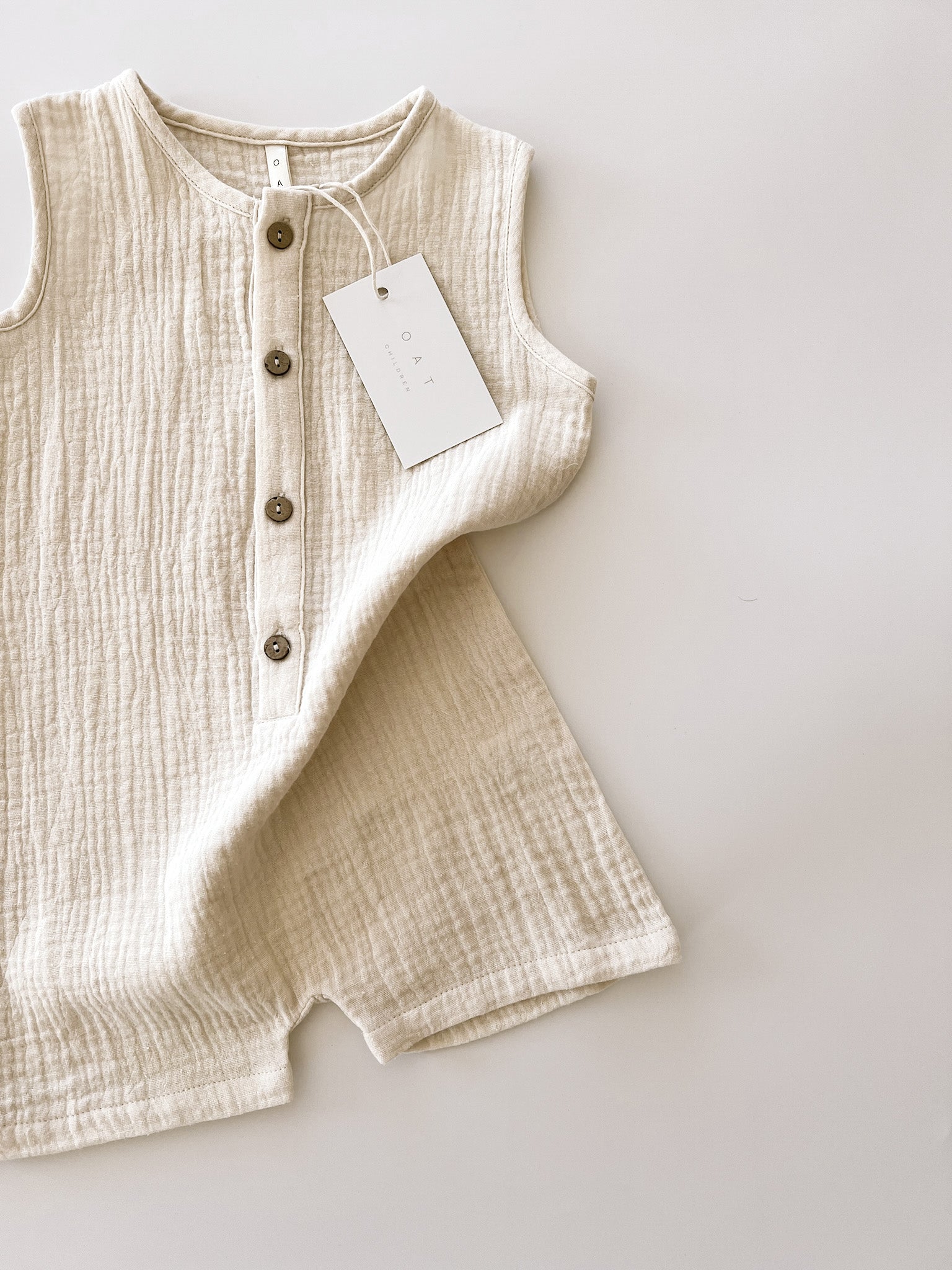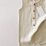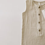 This muslin romper was made with your child’s comfort in mind. Whether running around in the warm sunshine or resting after a long day of play, this soft lightweight material will follow your child’s every move. Made of 100% muslin cotton, features wooden buttons down the front and provides truly effortless style.