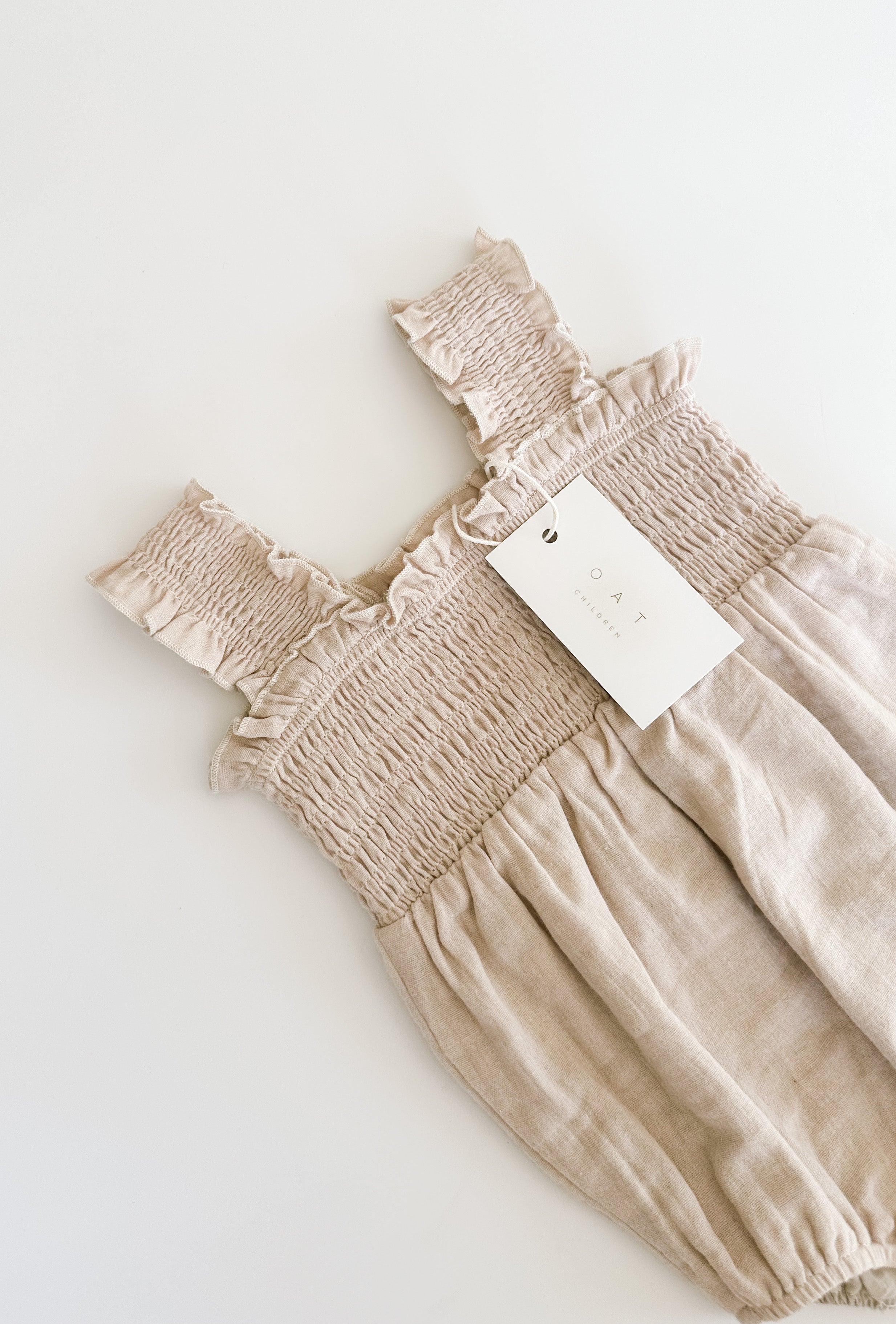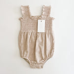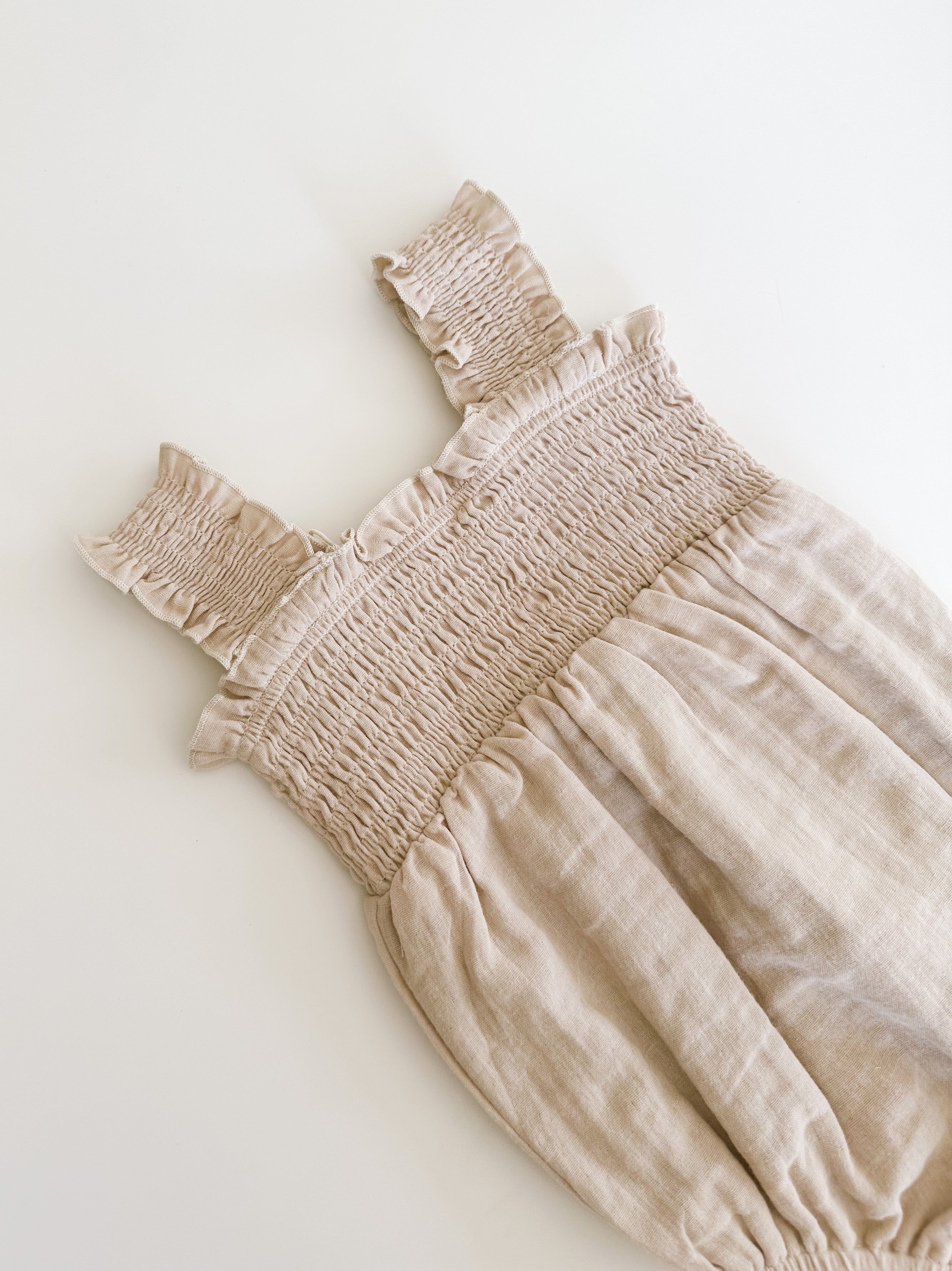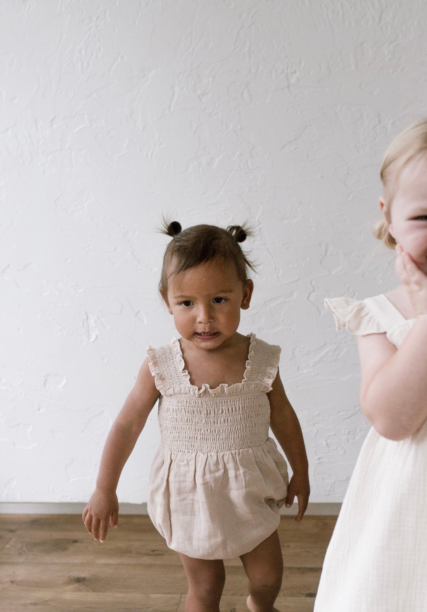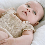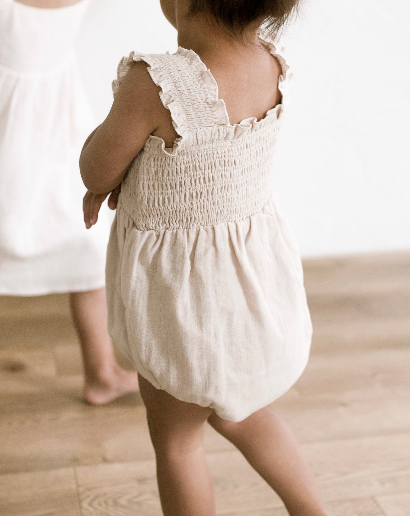 This vintage inspired smocked romper is the perfect staple piece to add to your little one’s wardrobe. Made with 100% muslin cotton and fully lined for your baby’s comfort, this romper is sure to become one of your favorites! Three snap buttons on the bottom ensure fast and easy changes to make your life that much easier. Enjoy watching your baby make countless memories in this beautiful piece!
