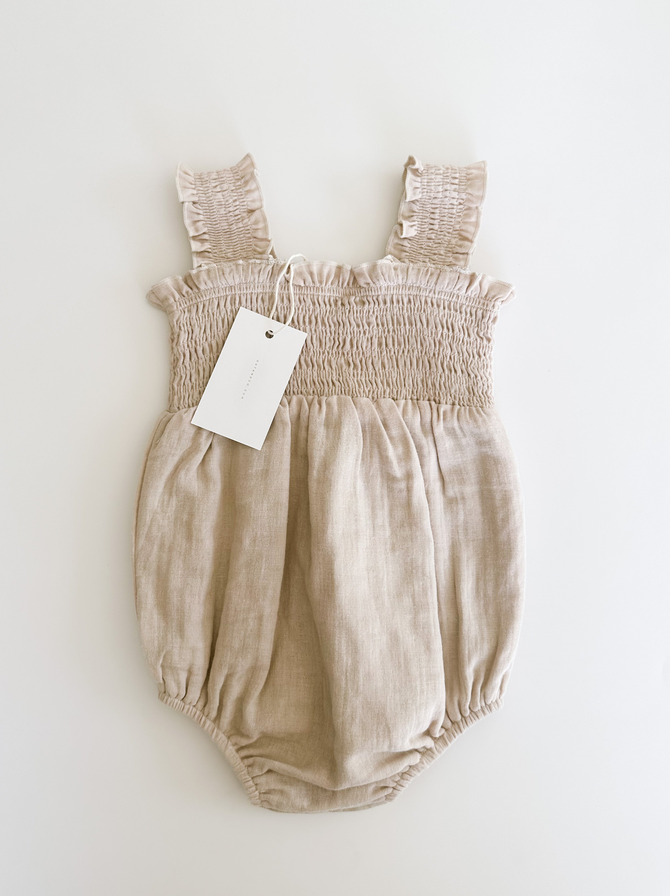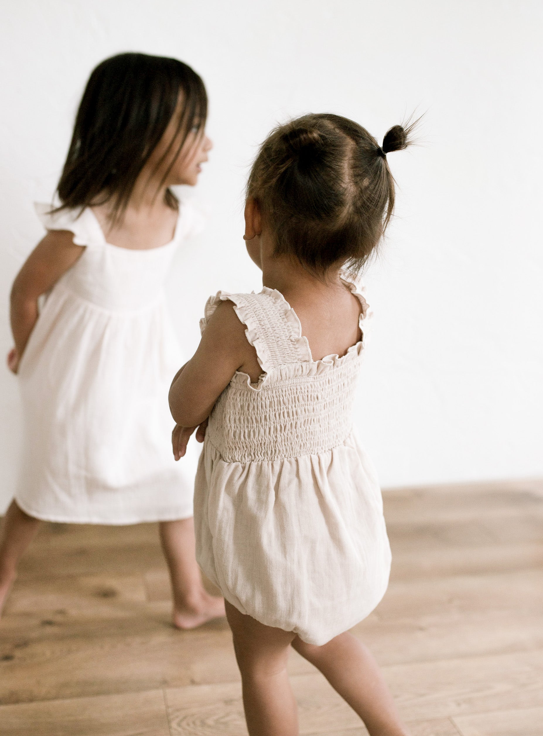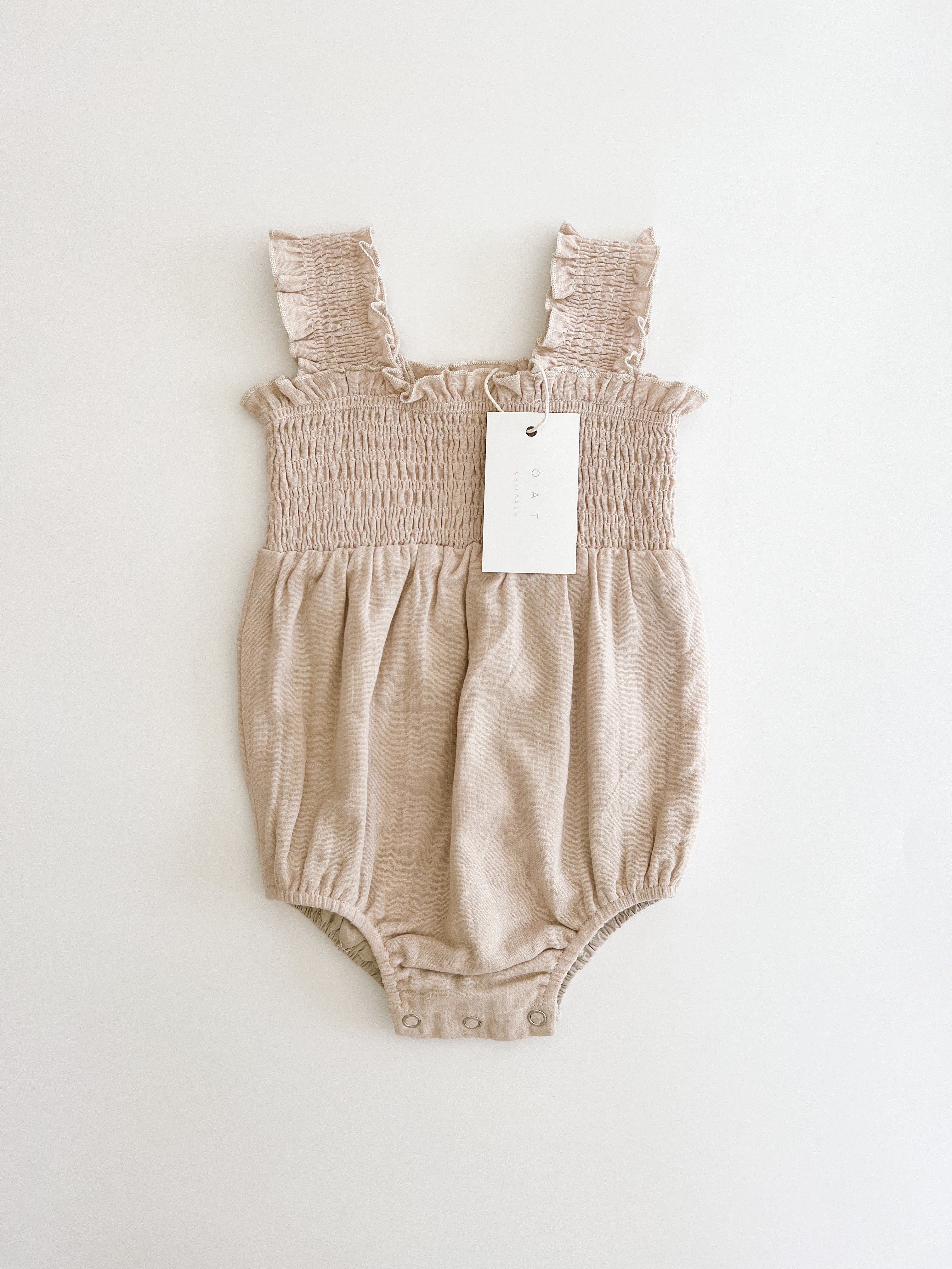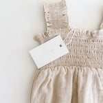 This vintage inspired smocked romper is the perfect staple piece to add to your little one’s wardrobe. Made with 100% muslin cotton and fully lined for your baby’s comfort, this romper is sure to become one of your favorites! Three snap buttons on the bottom ensure fast and easy changes to make your life that much easier. Enjoy watching your baby make countless memories in this beautiful piece!
