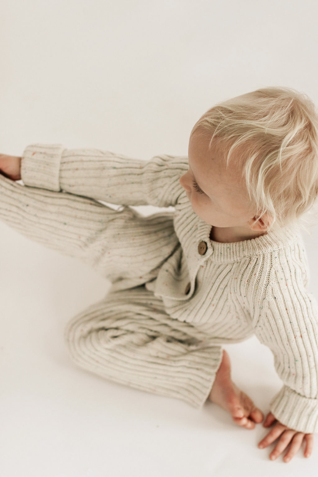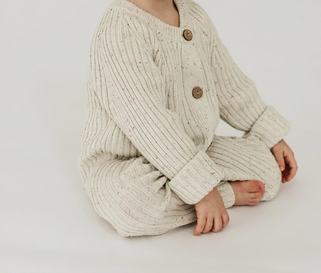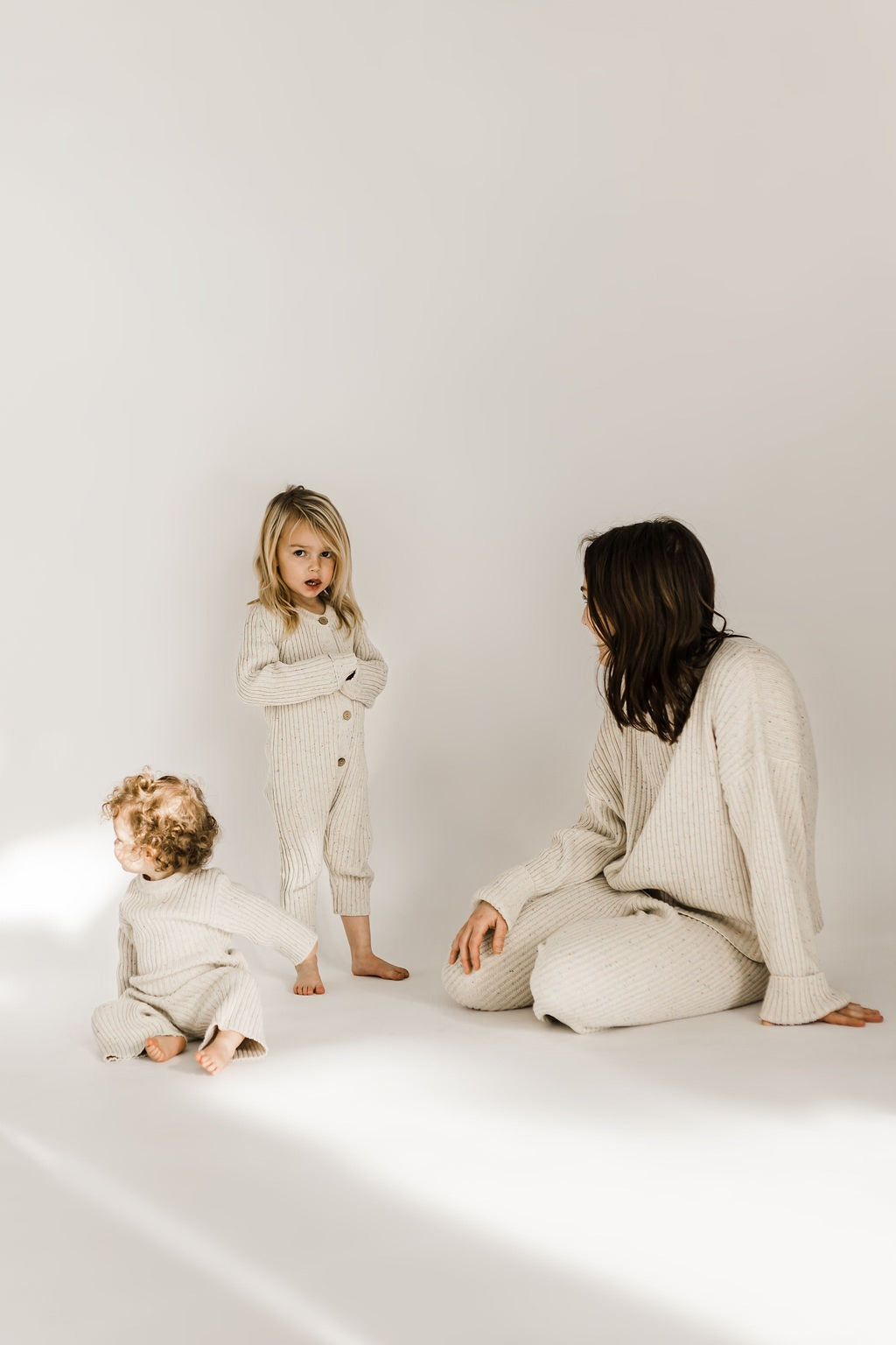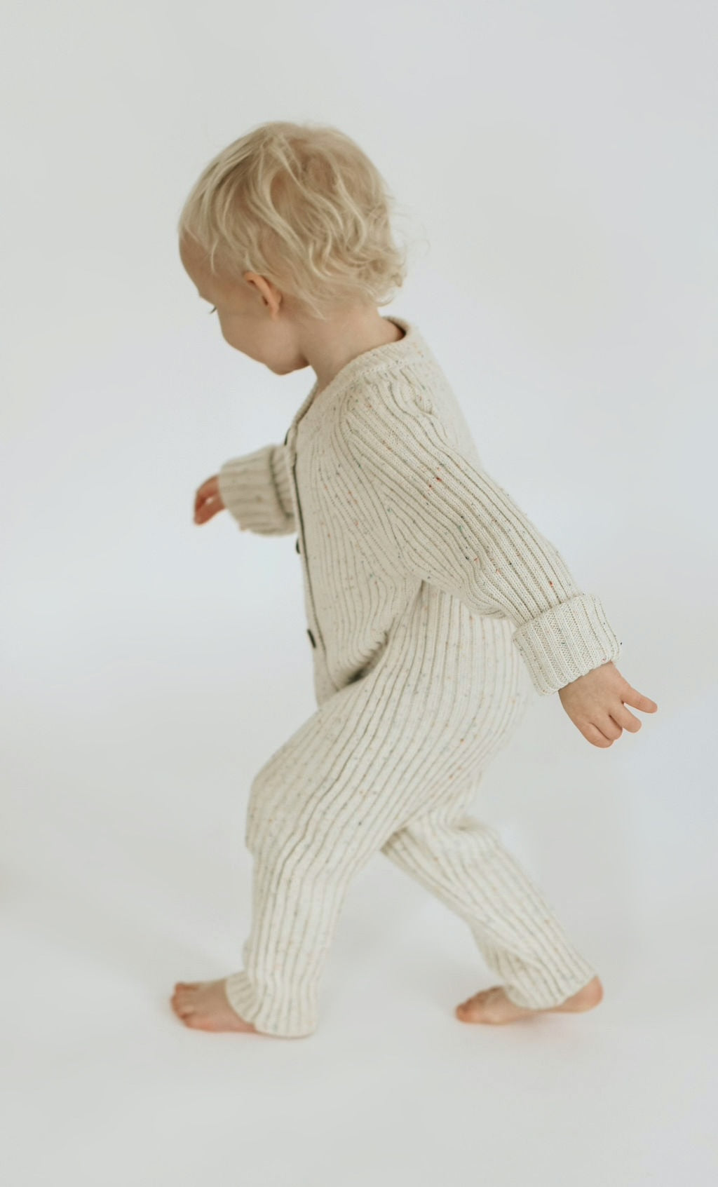 This ribbed knit playsuit is designed with chilly days in mind yet will easily transition as winter folds into spring. These premium cotton playsuits in Sprinkle Knit and Gray Marle are delightfully soft and superbly durable. They are sure to keep your kiddos warm and become the classic go to outfit in their wardrobe. Wear alone or bundled up.