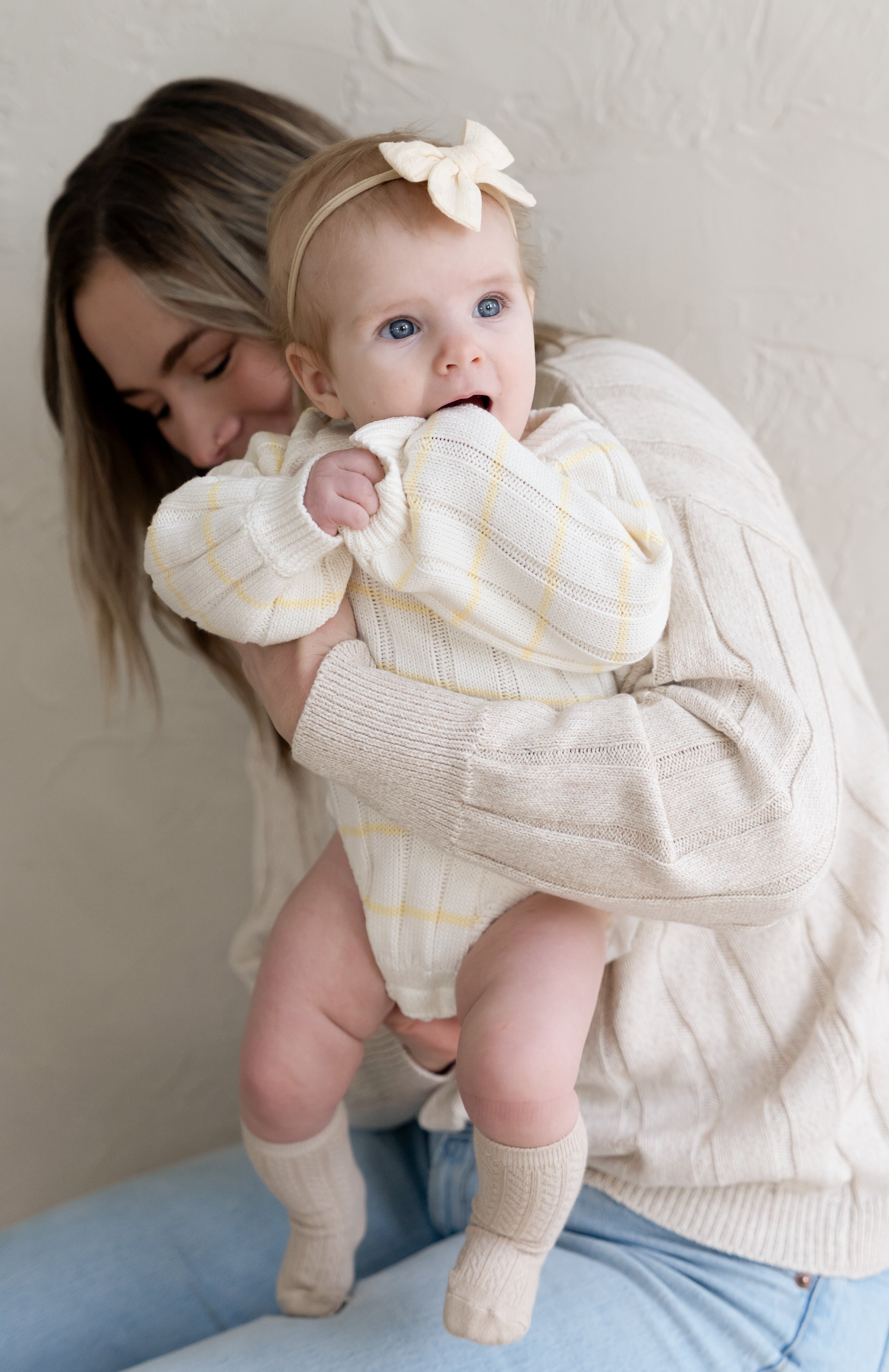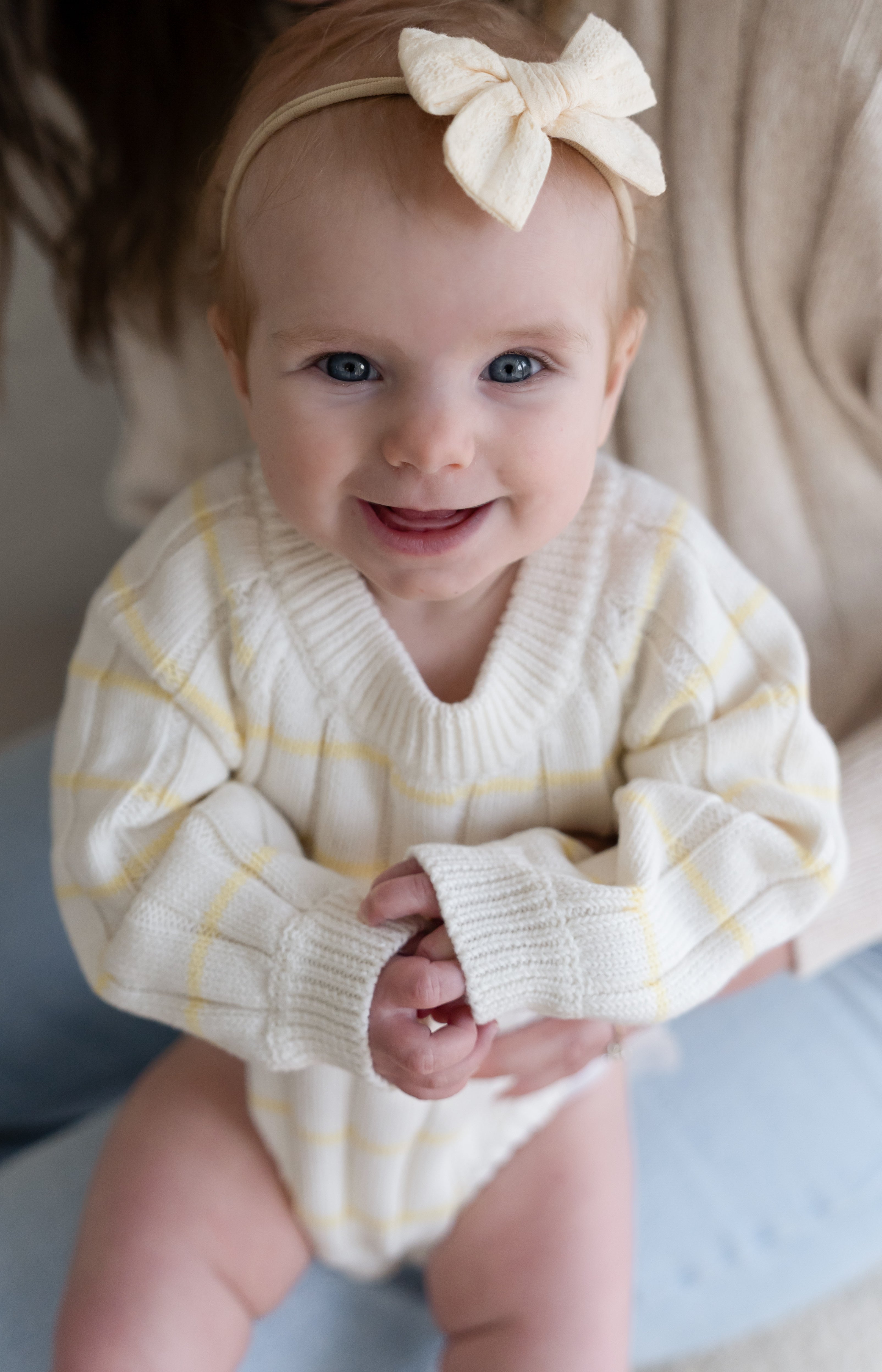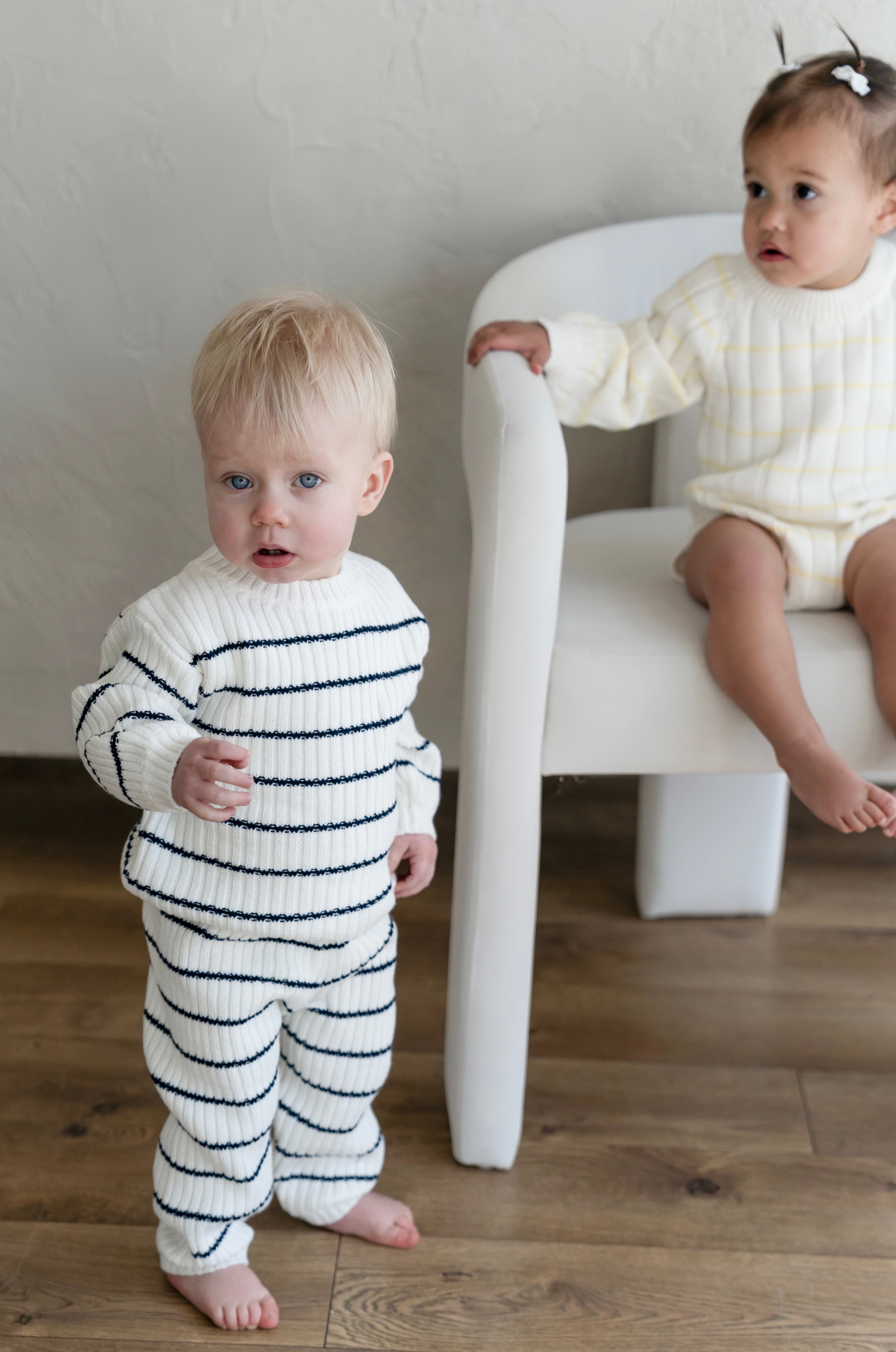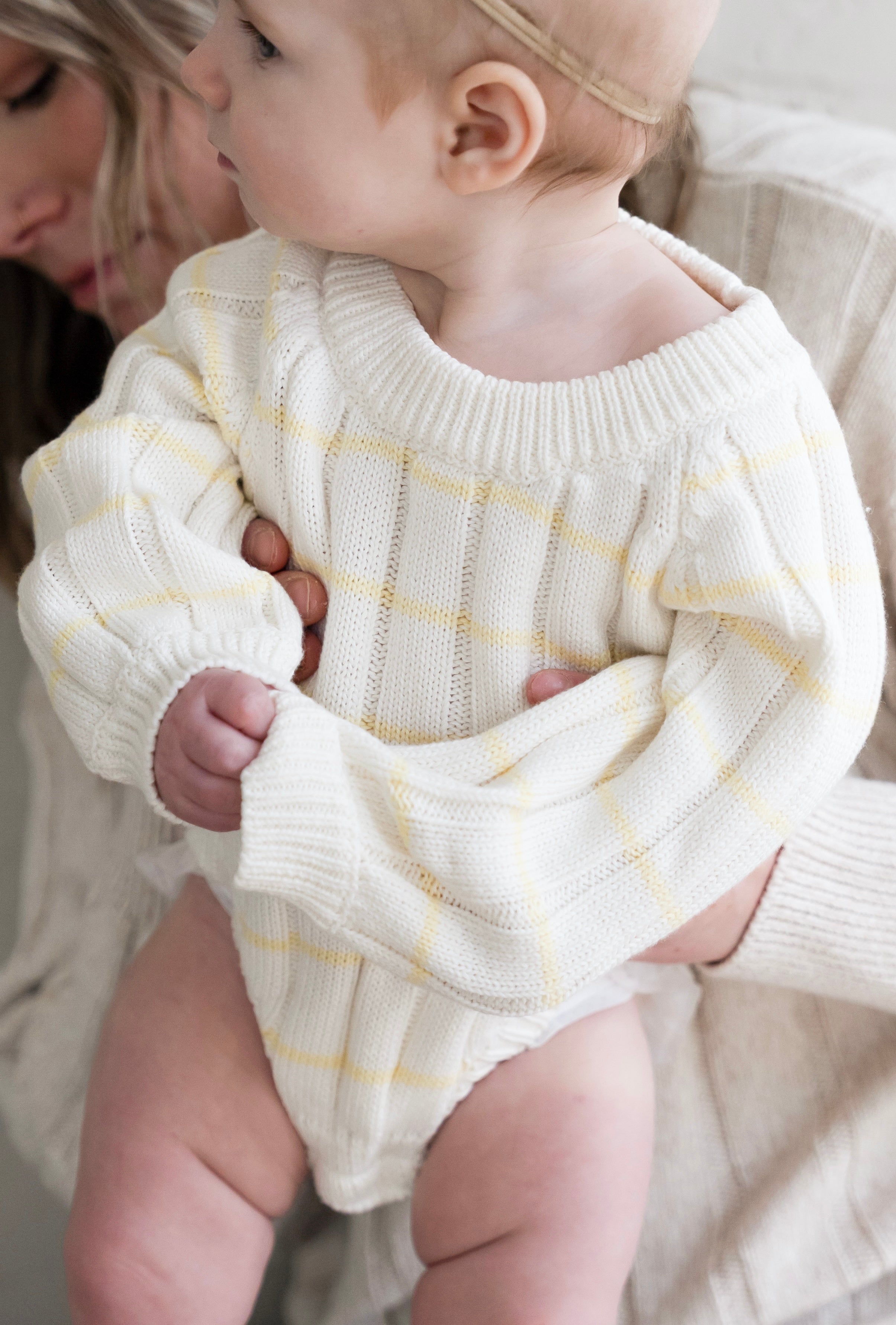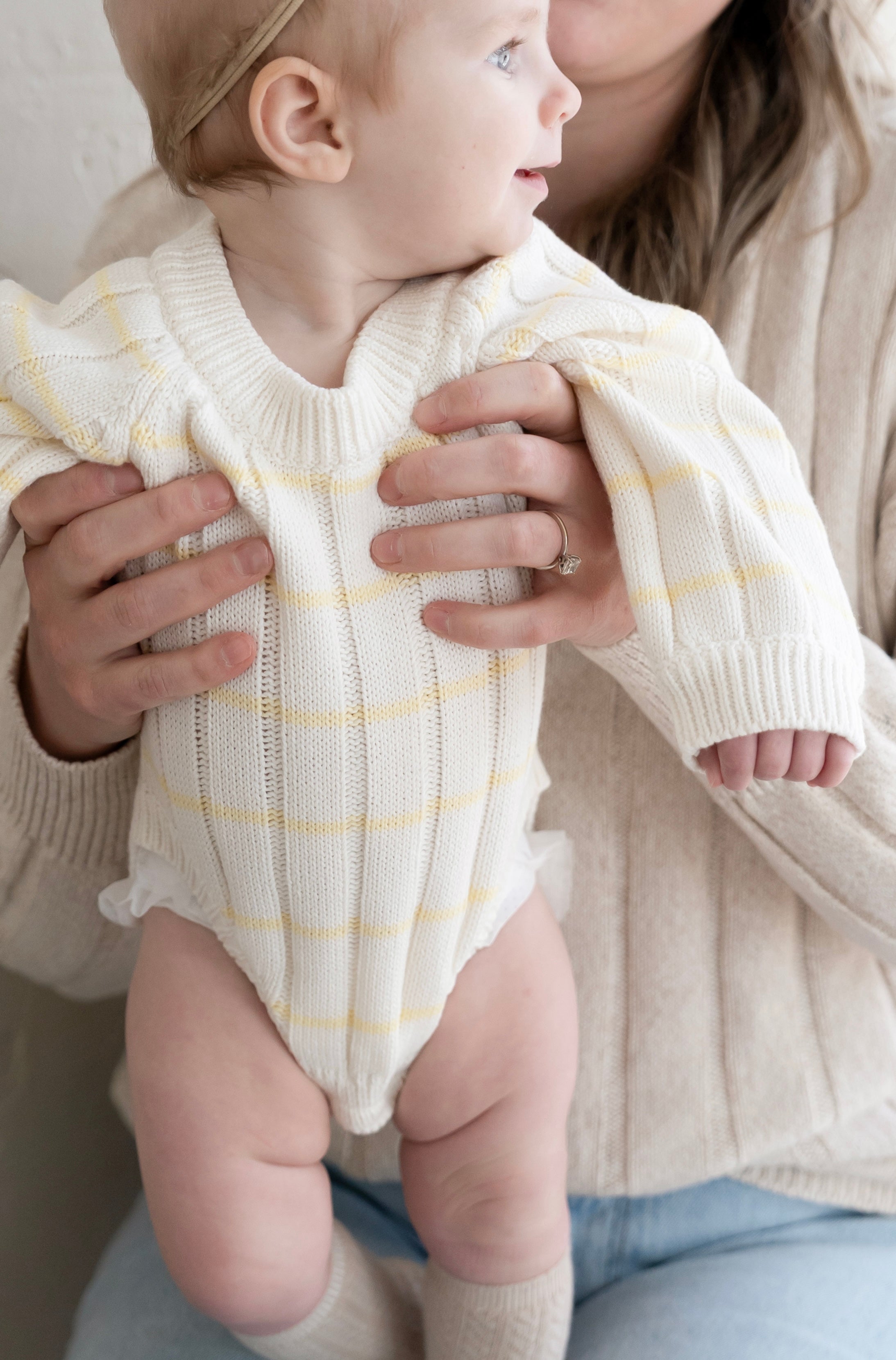 This Butter Yellow and Off White wide ribbed knit onesie is the perfect piece for your babies wardrobe. A timeless style and high quality pima knit cotton, this onesie will be with you for as long as you need it. This heirloom piece was designed with a thick knit collar and leg openings to ensure comfort and durability. Invisible snap buttons along the bottom provide for easy outfit and diaper changes.