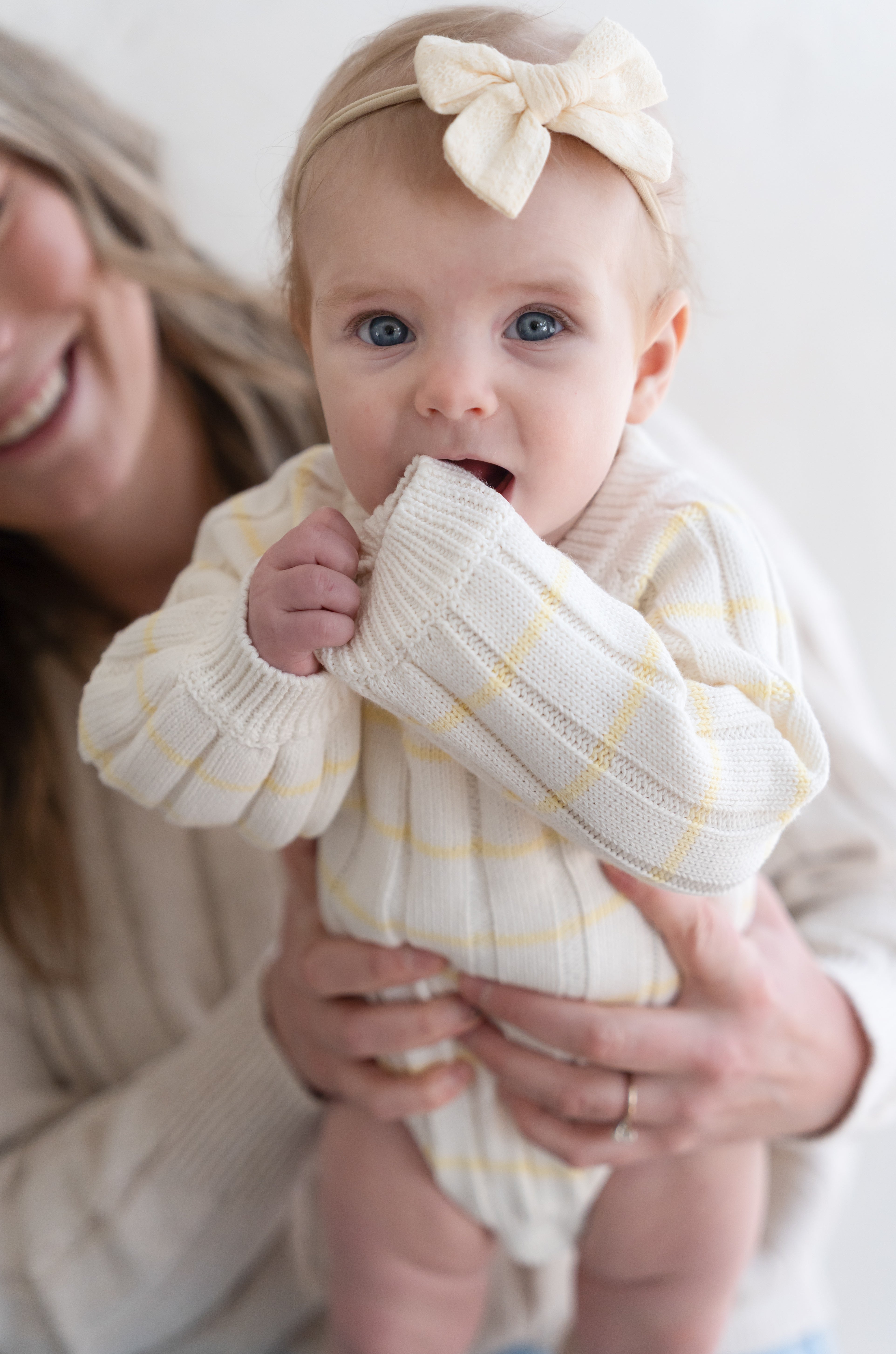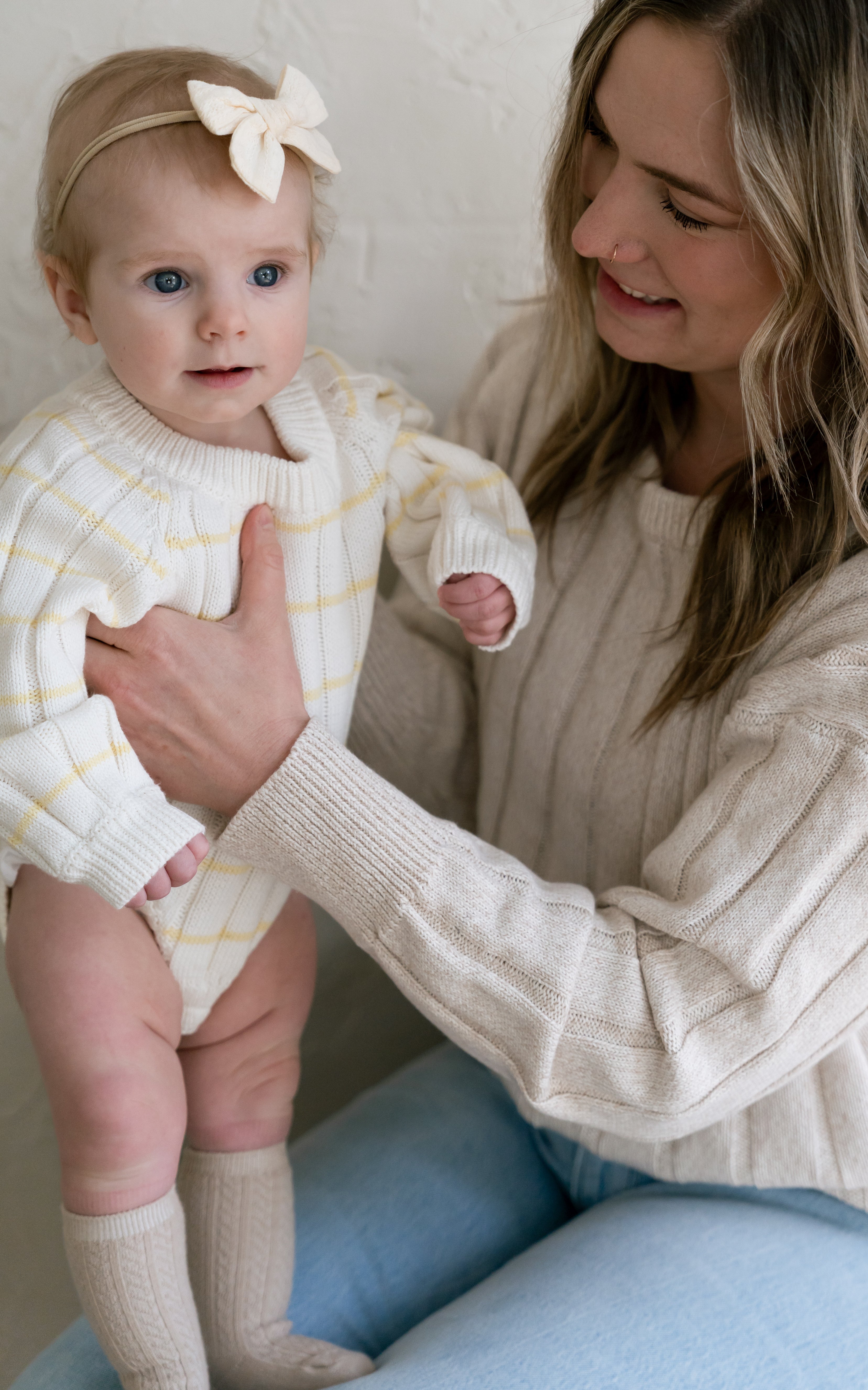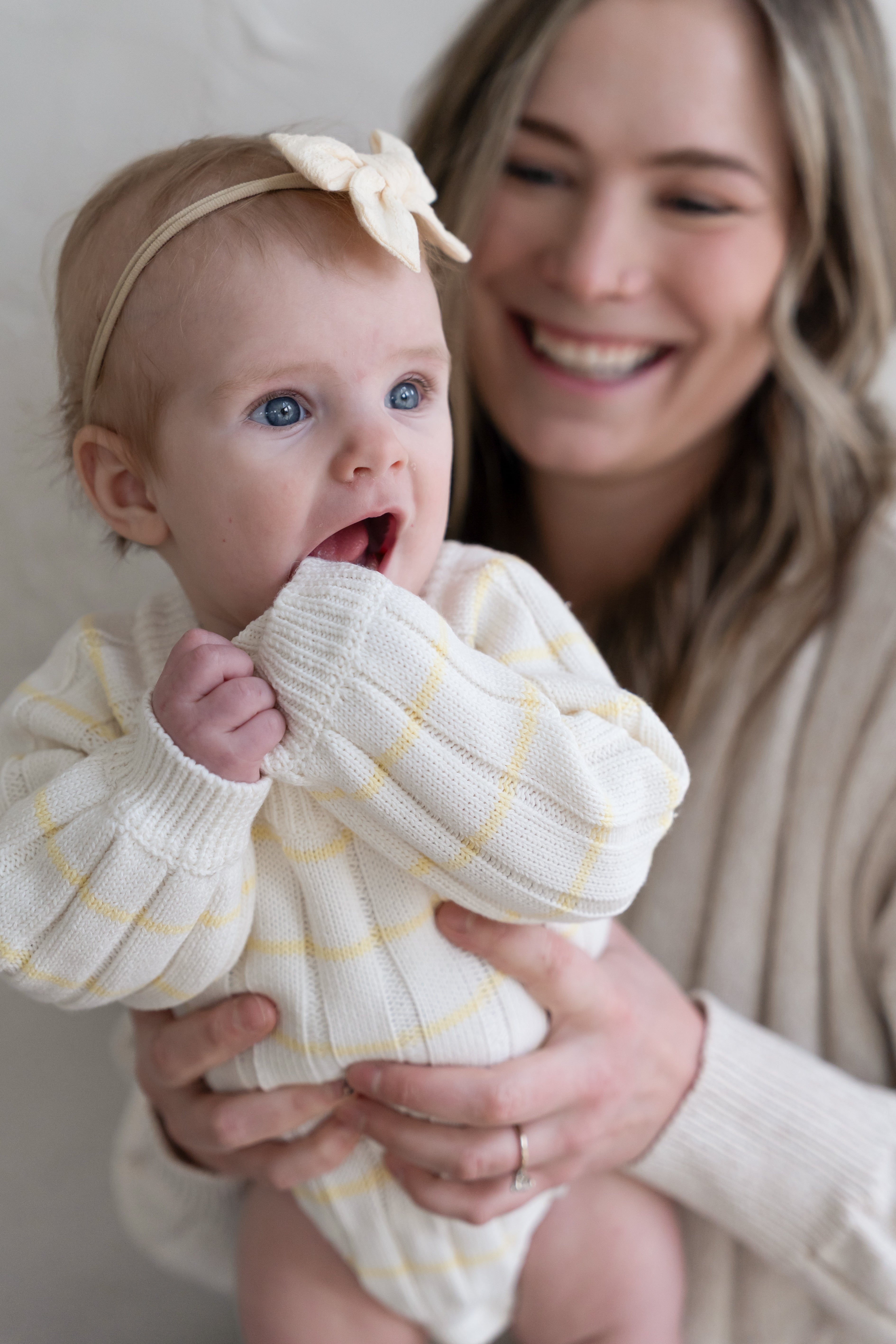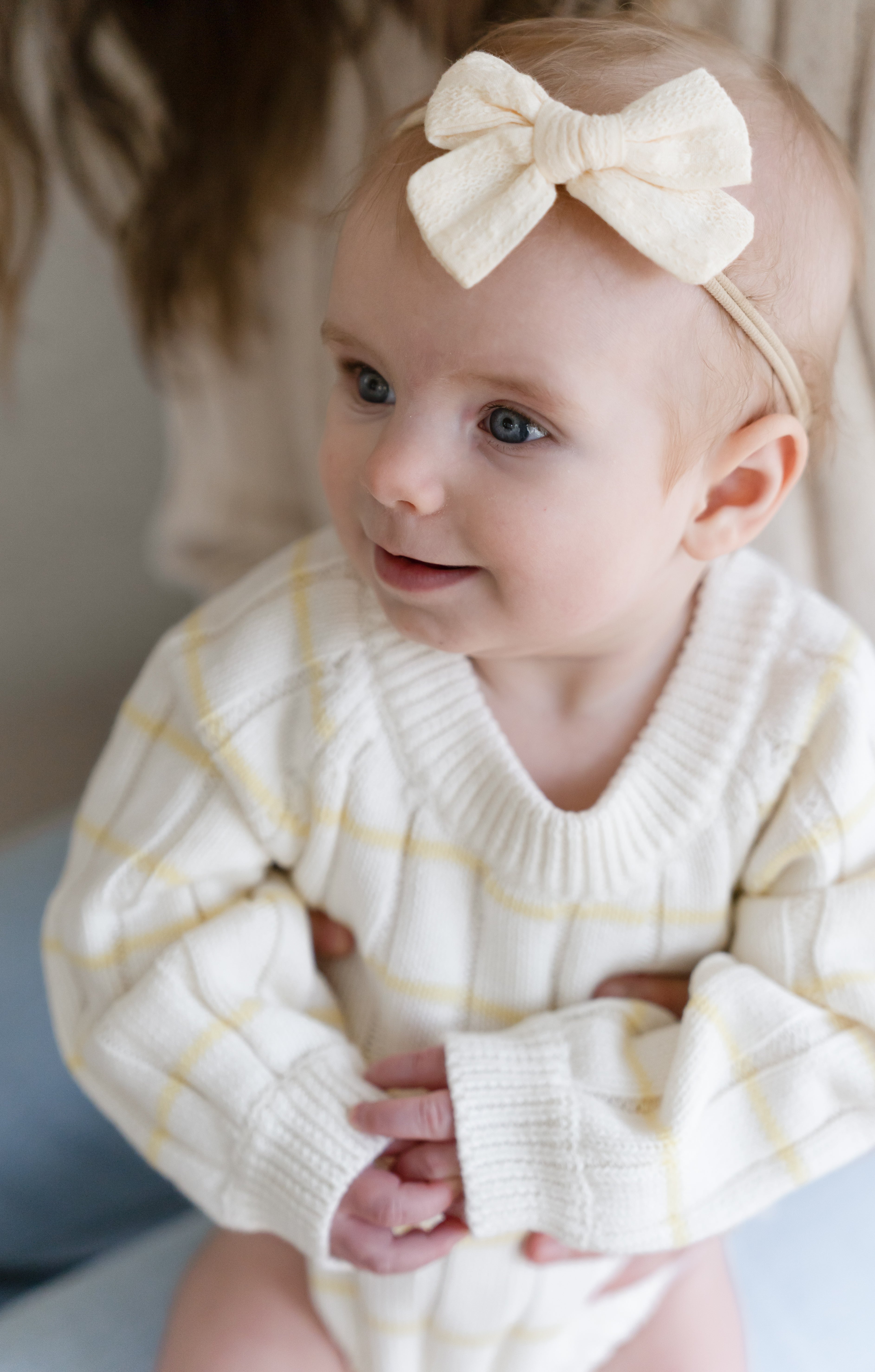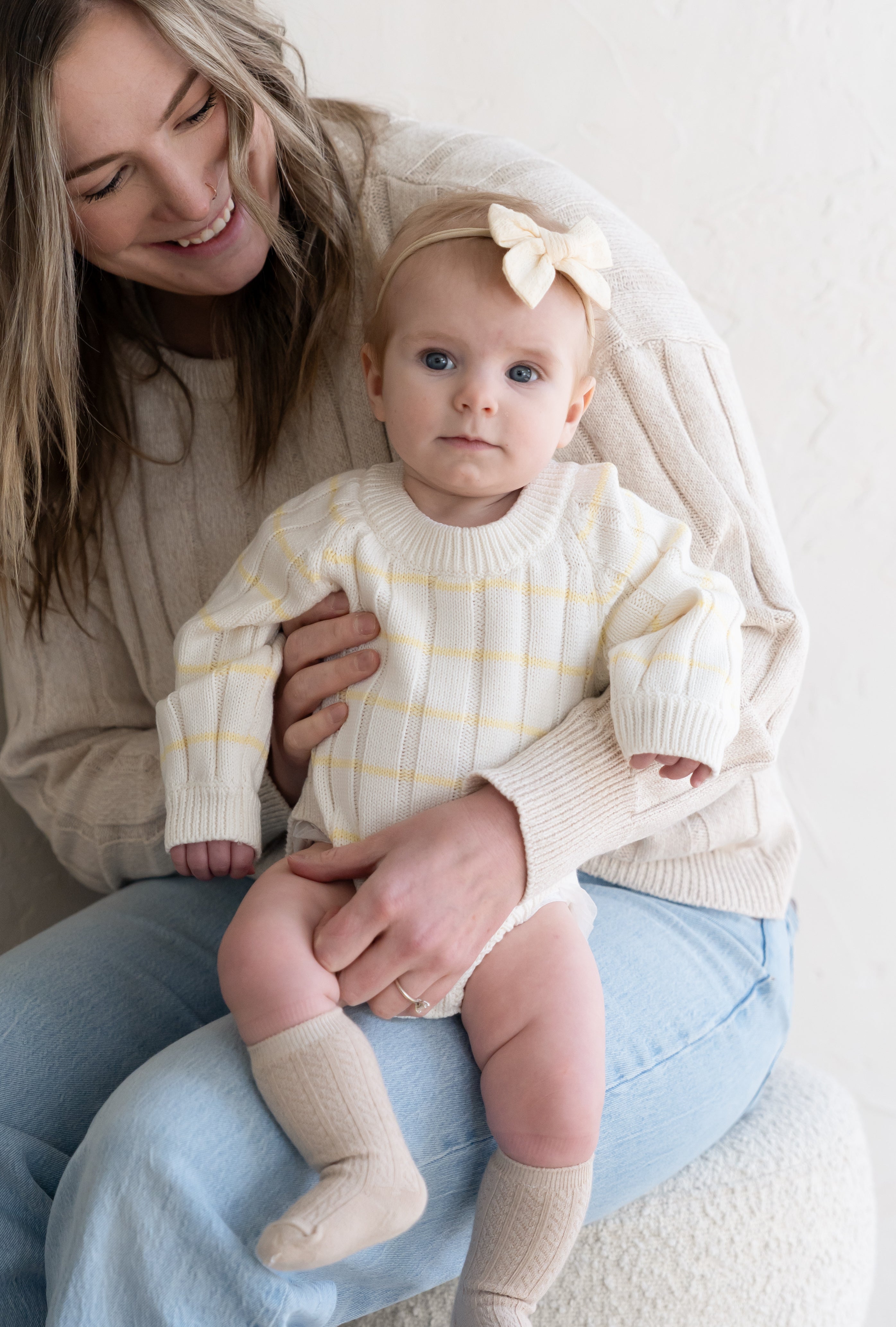 This Butter Yellow and Off White wide ribbed knit onesie is the perfect piece for your babies wardrobe. A timeless style and high quality pima knit cotton, this onesie will be with you for as long as you need it. This heirloom piece was designed with a thick knit collar and leg openings to ensure comfort and durability. Invisible snap buttons along the bottom provide for easy outfit and diaper changes.