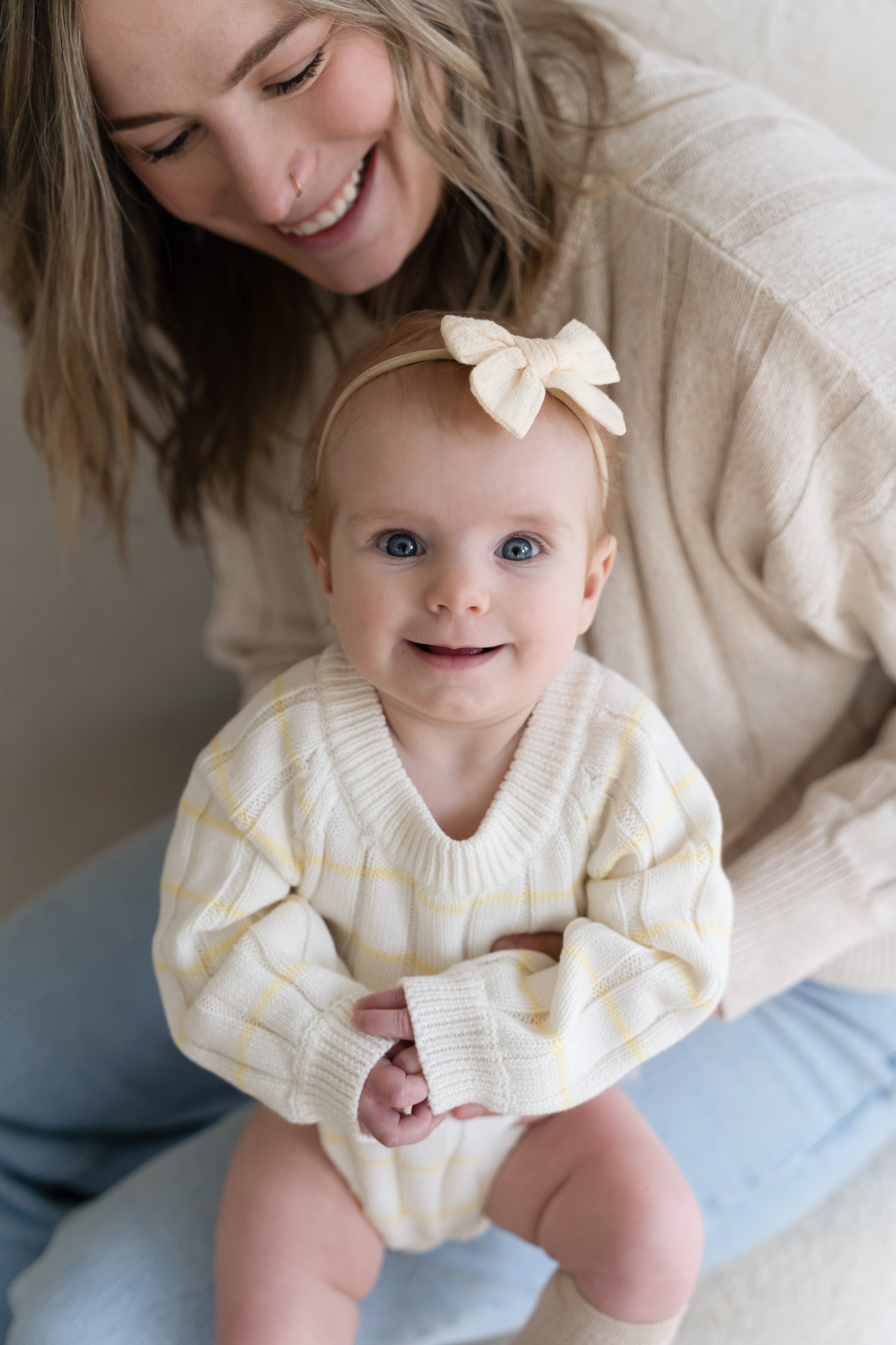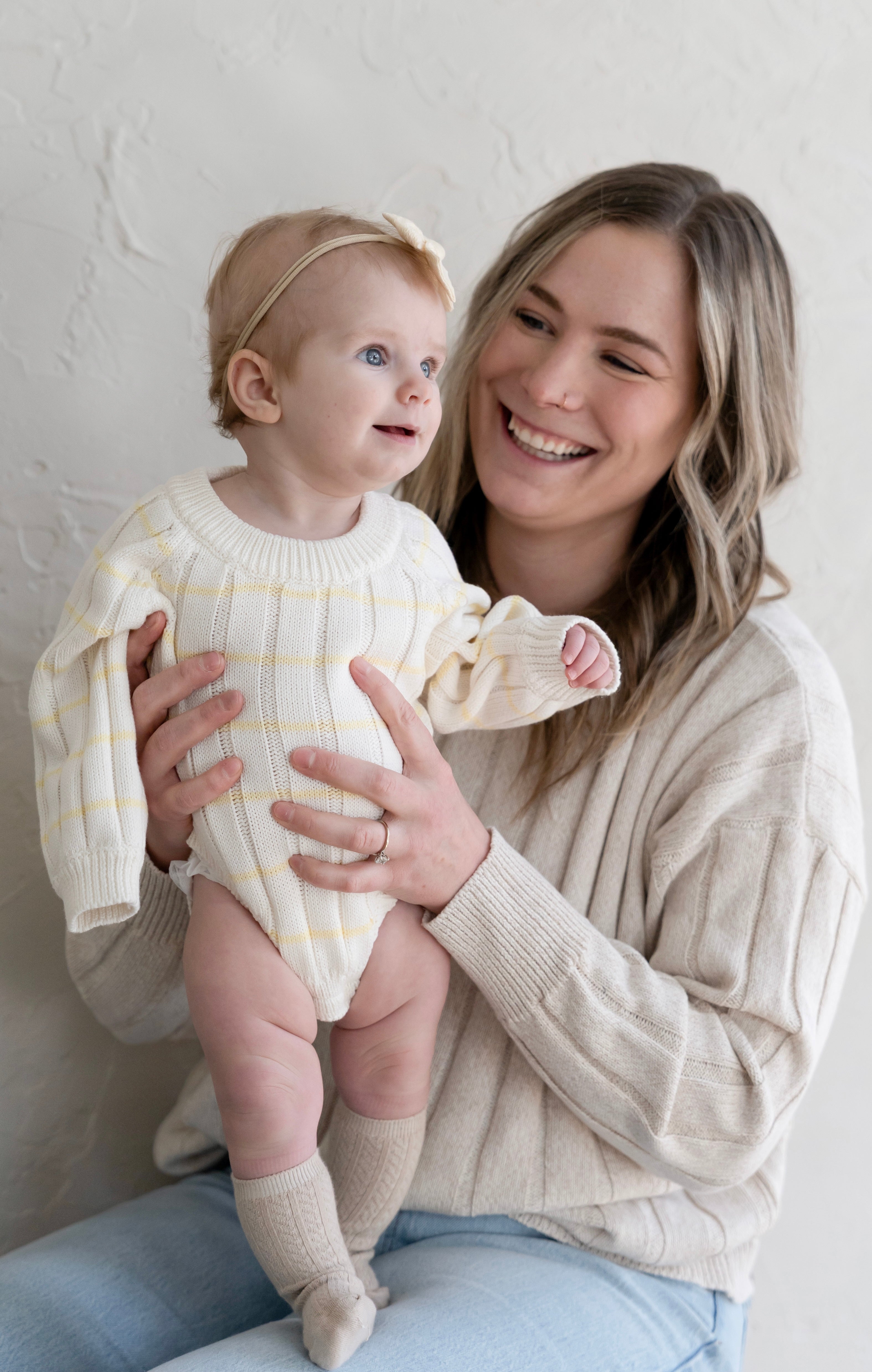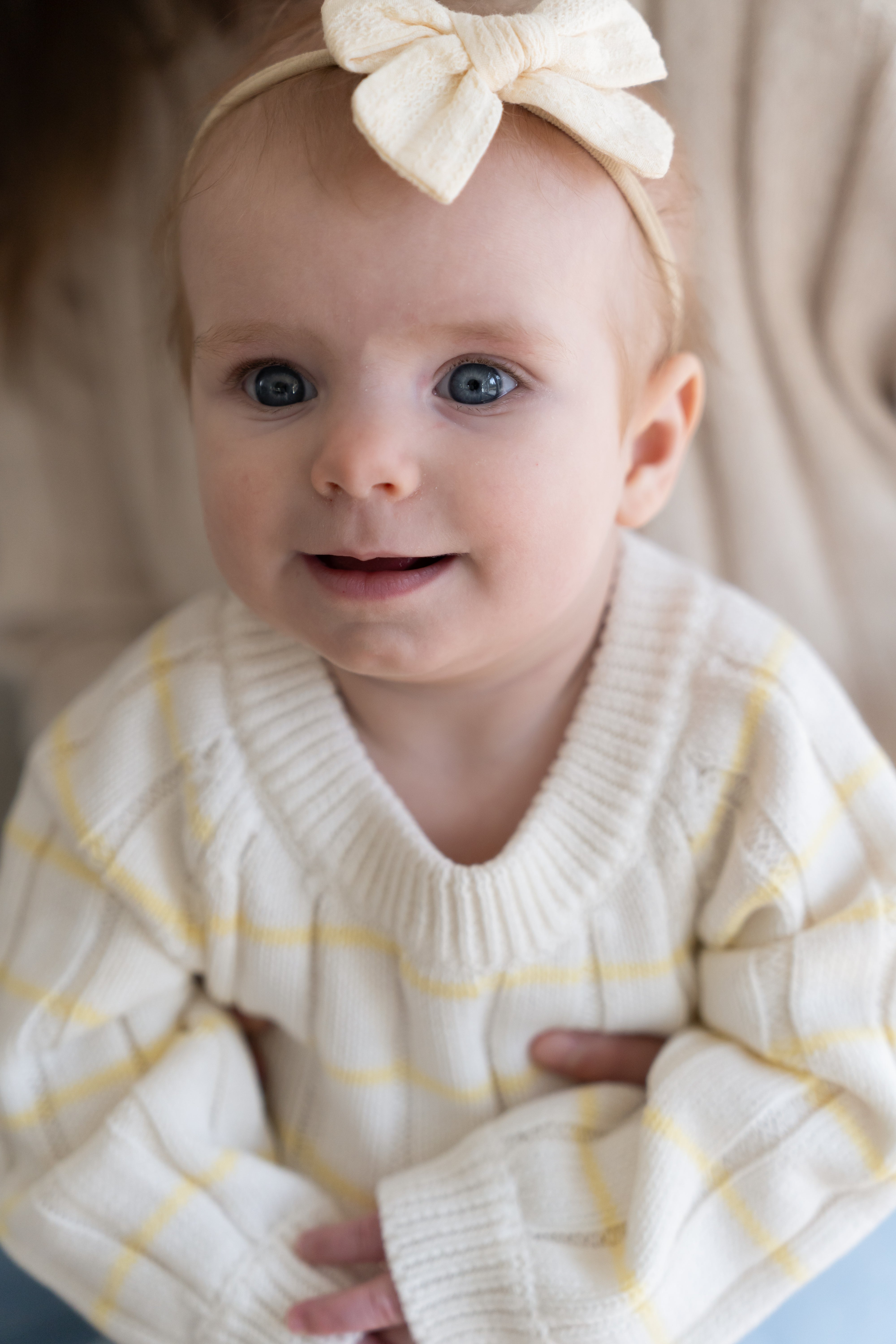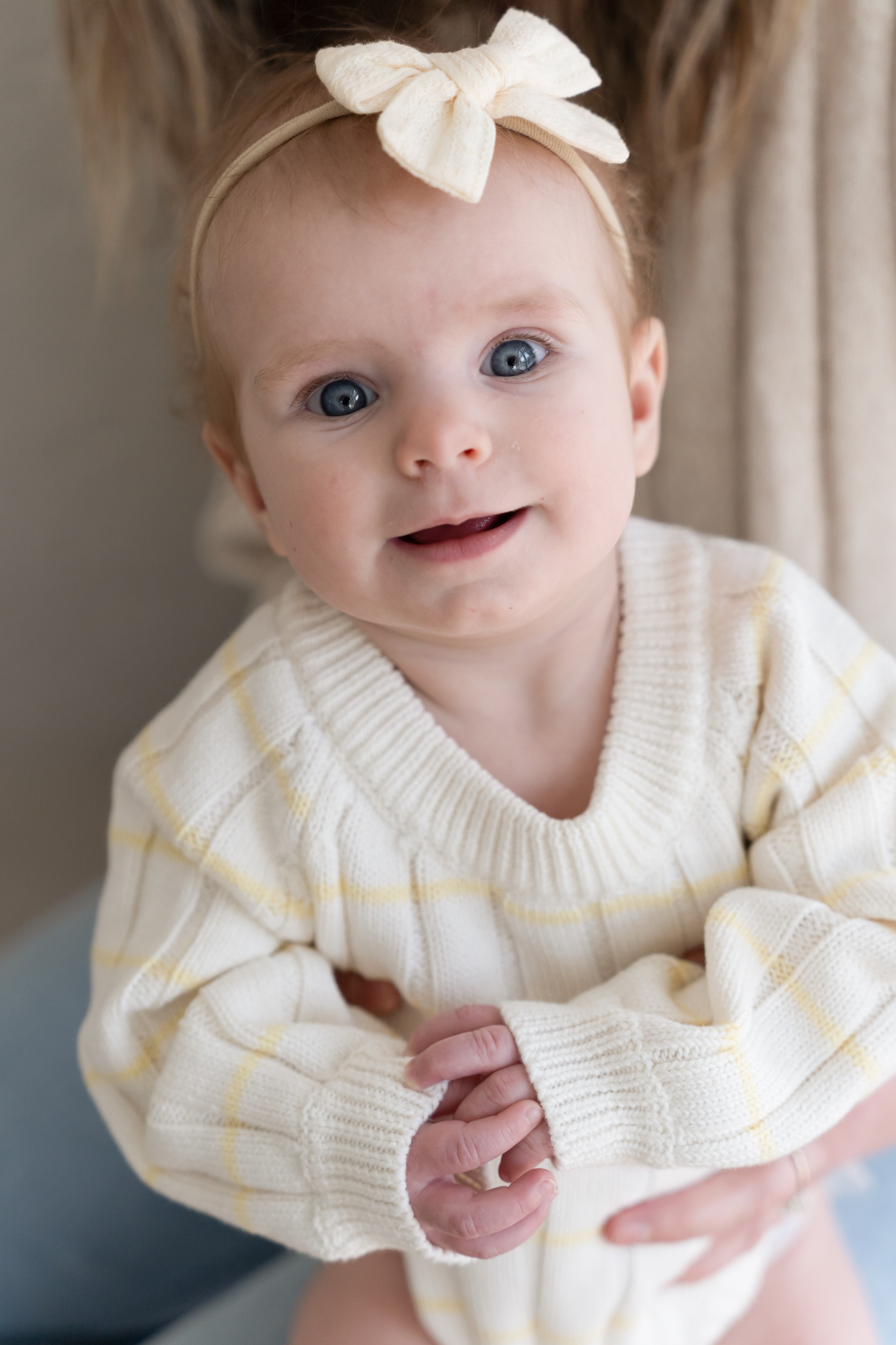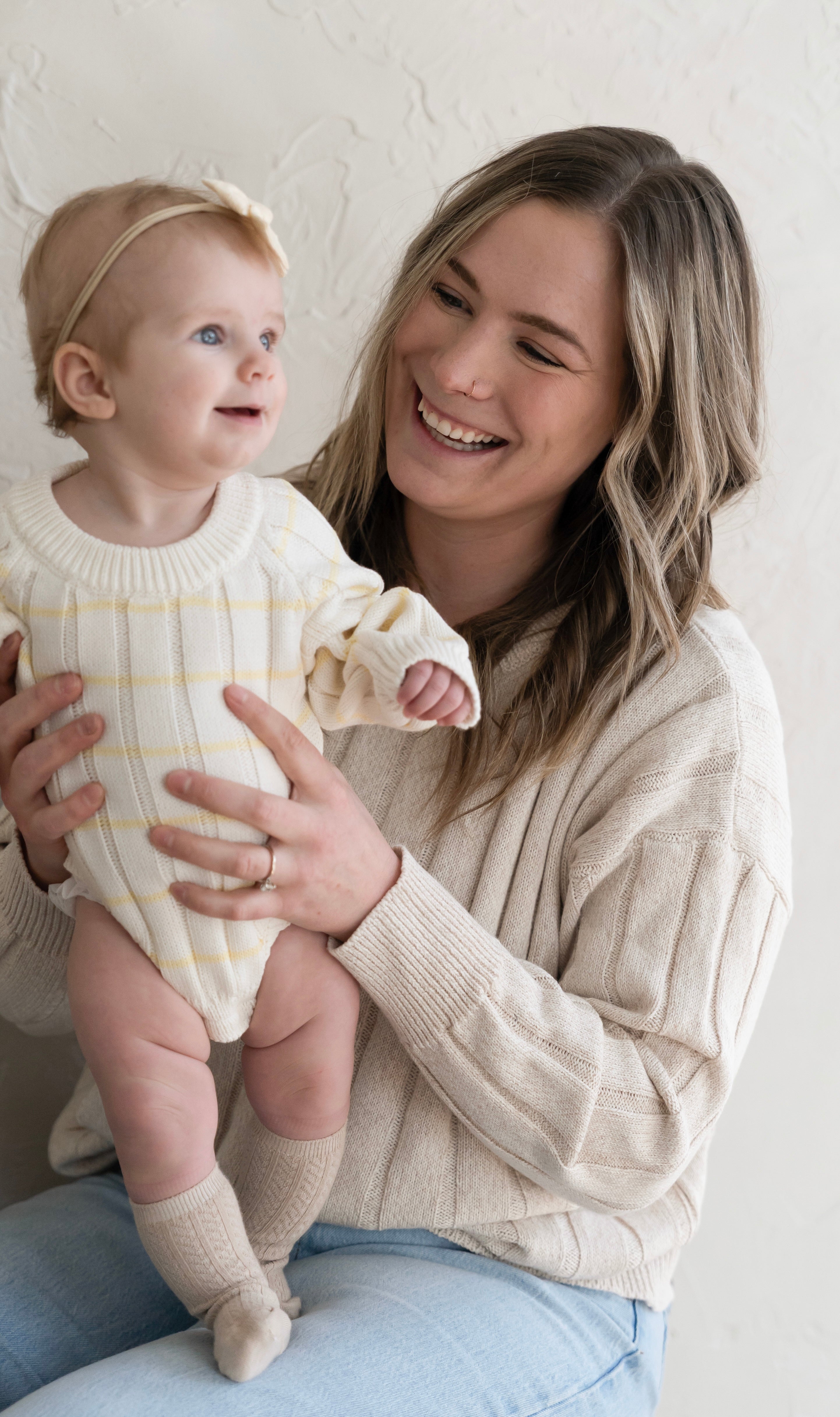 This Butter Yellow and Off White wide ribbed knit onesie is the perfect piece for your babies wardrobe. A timeless style and high quality pima knit cotton, this onesie will be with you for as long as you need it. This heirloom piece was designed with a thick knit collar and leg openings to ensure comfort and durability. Invisible snap buttons along the bottom provide for easy outfit and diaper changes.